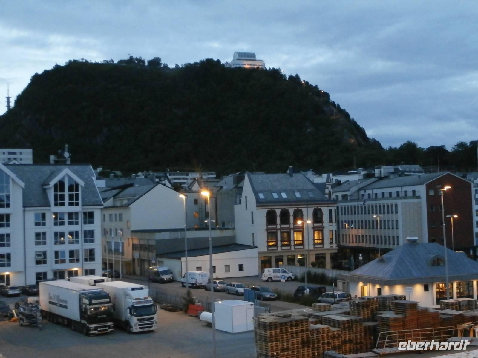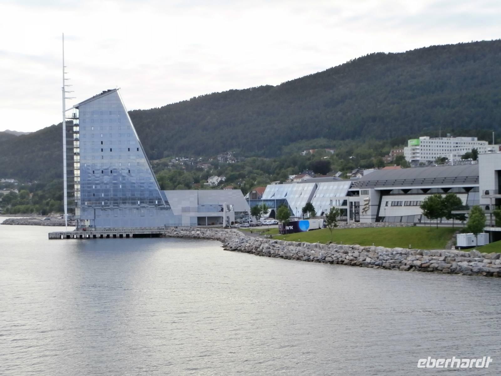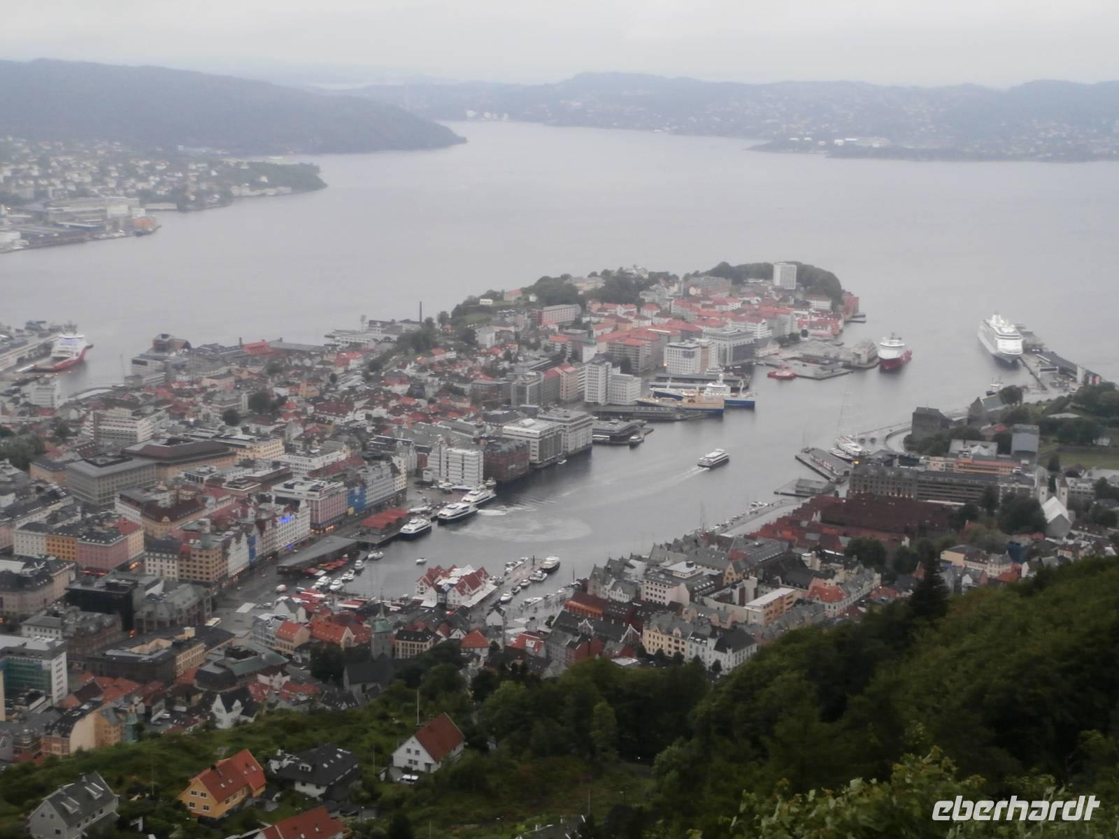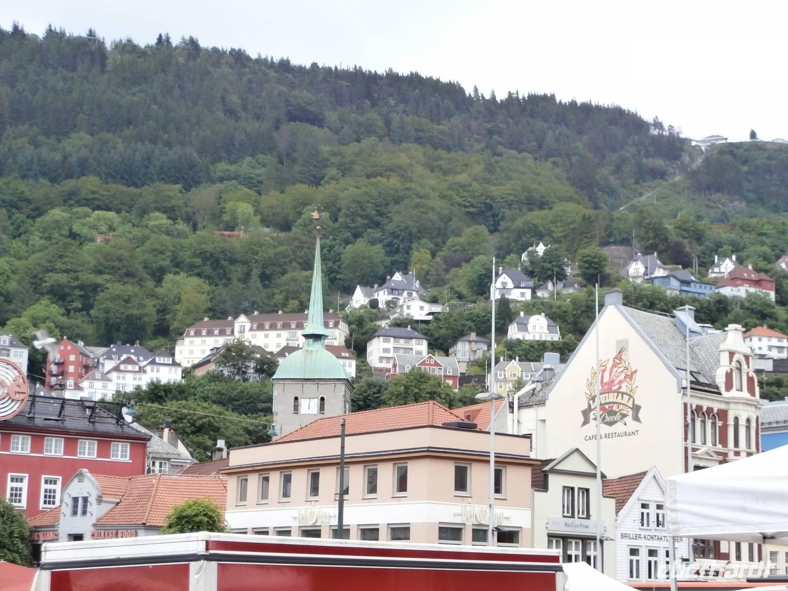 Nach einer etwas unruhigen Nacht mit bewegter See und Geräuschen aus dem Motorraum treffen wir uns zum ausgiebigen Frühstück an Bord. Nun haben wir bis zum Nachmittag Zeit zum Relaxen, genießen die Atmosphäre an Bord und lassen die beeindruckenden Küsten und das weite, offene Meer an uns vorüber ziehen. Die Sonne hat sich verkrochen, es regnet und ein kalter Wind weht uns um die Nase. Vom Bus mit Frank, unserem Buschauffeur, werden wir noch vor 15 Uhr in Bergen erwartet und auch die örtl. Reiseleitung, Frau Gudrun, steht für die Stadtbesichtigung bereit. Bergen, gelegen auf mehreren Inseln und gerahmt von 7 Bergen, glänzt mit Regen, was ja so typisch für diese Stadt ist. Im Hafen haben mehrere Kreuzfahrtschiffe angelegt und bieten uns ein schönes Bild bei der Einfahrt. Nach der Rundfahrt und Führung im Hanseatischen Viertel gehen die Gäste noch kurz auf den Fischmarkt. Für eine Entdeckungstour durch die Stadt bleibt uns wenig Zeit und auch der Regen macht nicht unbedingt Lust, aber viele Sehenswürdigkeiten dieser Hafenstadt sind bequem zu Fuß erreichbar. Zum Fløyen fahren wir nach dem Abendessen hinauf, er hüllt sich noch nicht in Wolken und bietet somit auch bei Regen einen schönen Blick hinunter auf die Stadt und in die Schärenwelt.