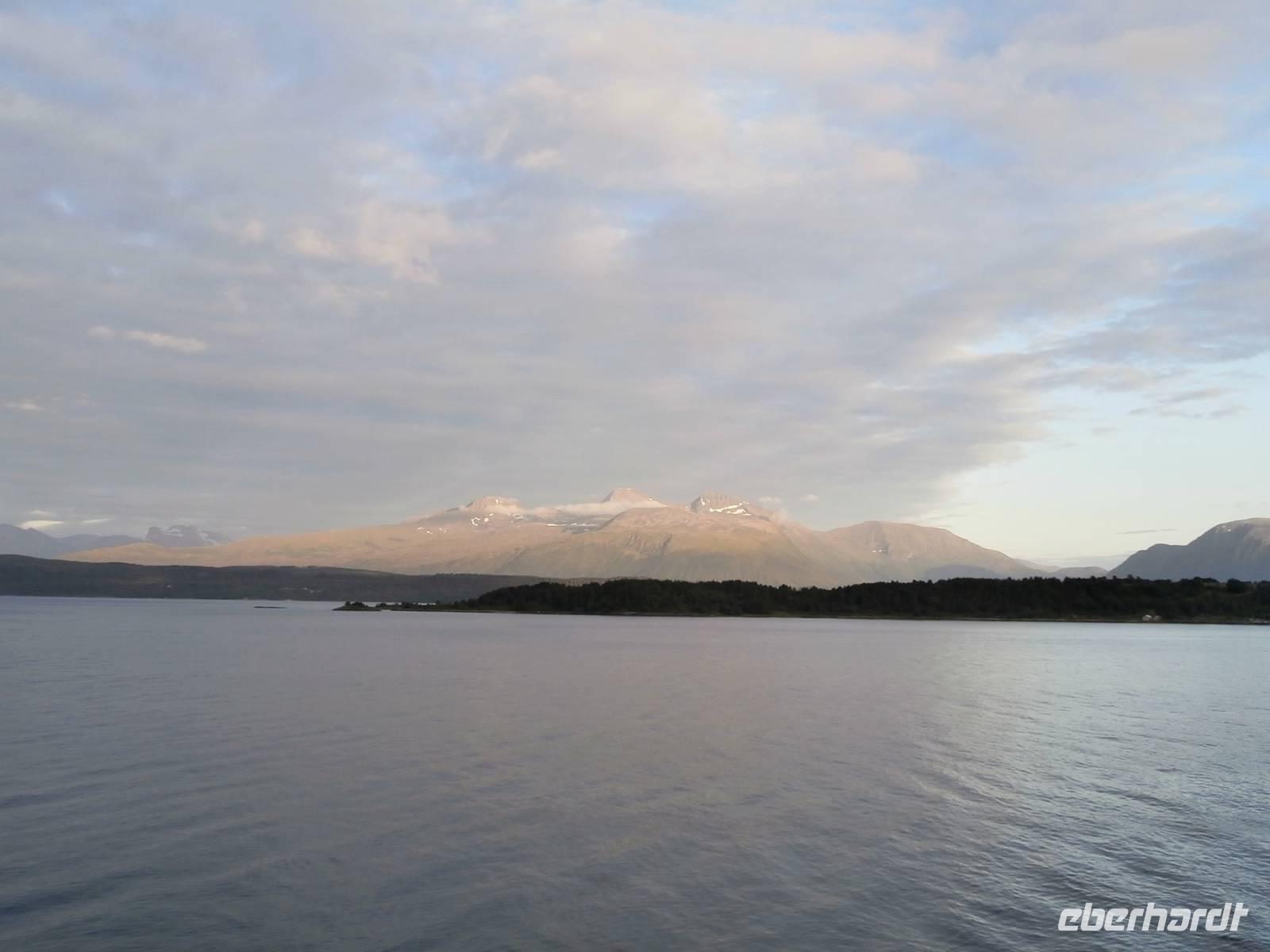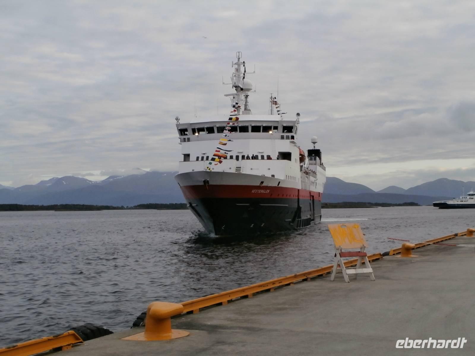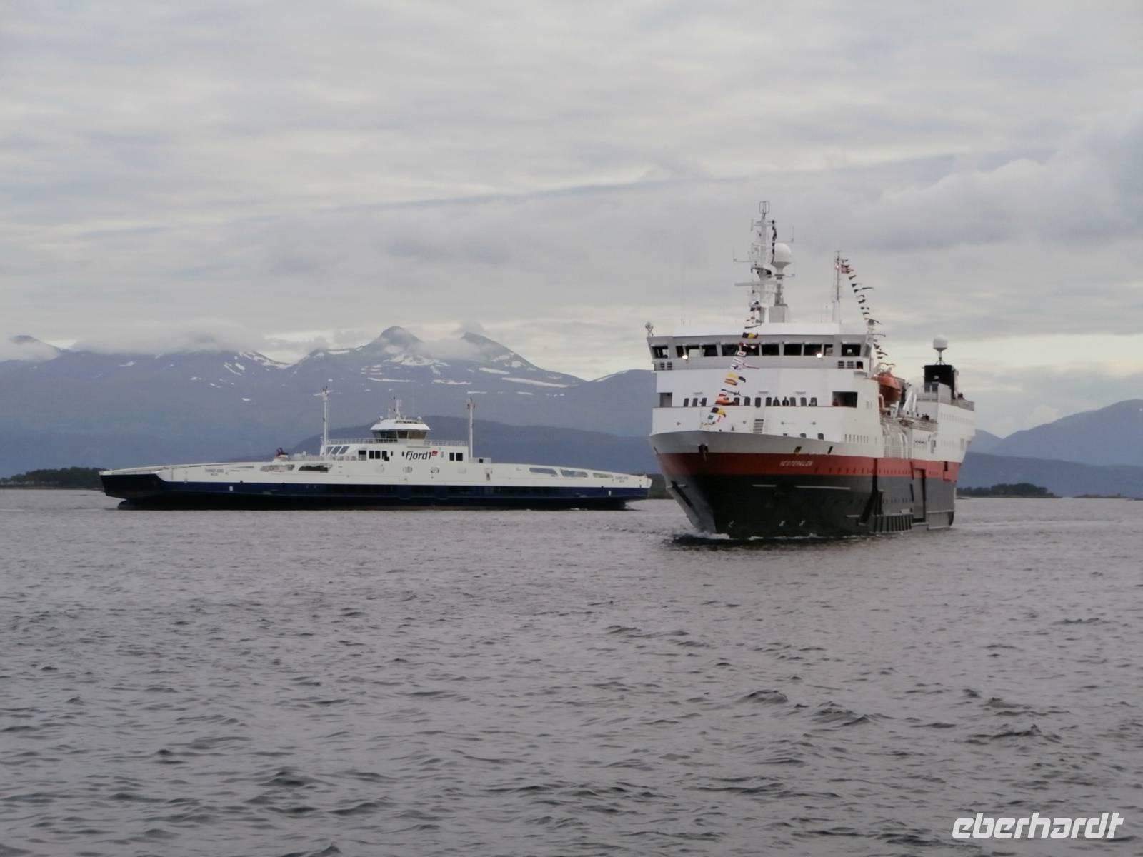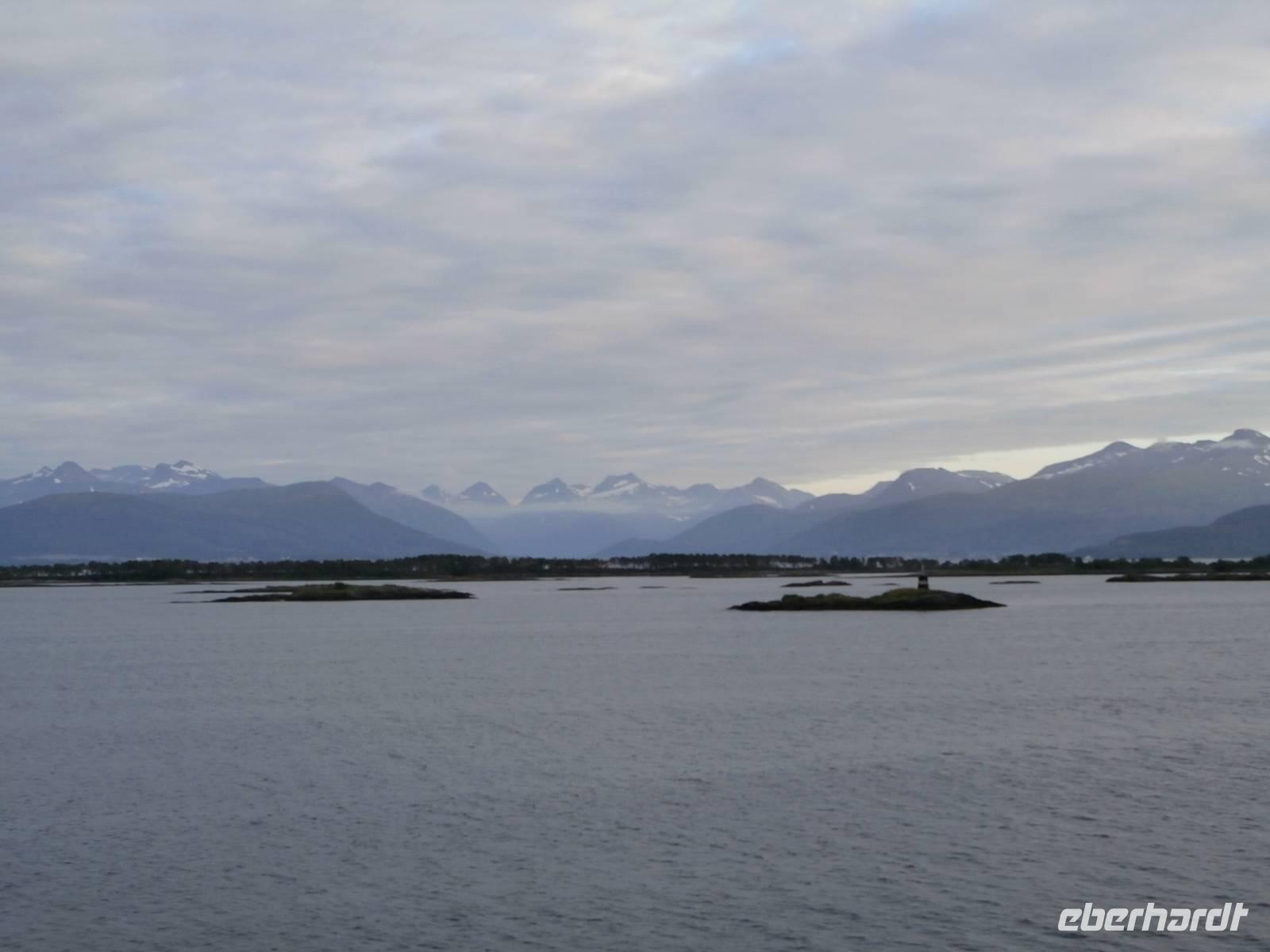 Unsere Reise geht weiter, heute Morgen scheint uns nicht die Sonne, aber die Fahrt weg von Orkanger geht durch herrliche Natur, viele Seen, kleinere Fjorde und herrliche Grundstücke sehen wir. Auch eine Fährüberfahrt von Halsa nach Kanestraum bewältigen wir mit unserem Bus. Im Hafen von Kristiansund parken wir und genießen eine schöne Freizeit in der Stadt des Klippfisches, ein Foto von der Klippfischfrau, die wir am Fjord auf dem Denkmal sehen, nehmen wir alle auf. Nach Mittag und Kaffee geht es zum nächsten Höhepunkt unserer Reise, die Fahrt auf der Atlantikstraße, mitten durch die offene See und die markante Schärenlandschaft. Die Straße führt zuerst in einen langen, neuen Tunnel unter dem Fjord entlang, dann die Atlantikstraße mit mehreren Brücken und Dämmen in einer tollen Form der Straße auf einer Länge von 8 km. Wir legen 1 Fotostopp ein und klettern dabei auch auf einen Hügel, um schöne Aussichten und Wollgras zu sehen und genießen. Wir haben für heute noch einen besonderen Stopp geplant, die Fahrt in das kleine Fischerdorf Bud, gelegen in der Hustadbucht. Hier sehen wir noch eine Geschützstellung aus dem 2. Weltkrieg und auch einen Gesteinspark. Am Bus gibt es für alle Gäste noch ein kleines Picknik mit Elch-und Rentiersalami, sowie Multebeermarmelade und Kaviar zum Kosten. In Molde müssen wir nun unseren Bus verlassen und Frank verabschieden, denn er wird heute noch bis Stranda fahren und im Hotel an Land nächtigen. Unser Abendessen nehmen wir im Restaurant Egon in Molde ein. In das Gebiet der Romsdalsalpen können wir sehen und das Einlaufen unseres Schiffes der „MS Vesteralen" schön mitverfolgen. Pünktlich beziehen wir an Bord unsere Kabinen und alle Gäste erleben das Auslaufen aus der "Stadt der Rosen" so der Beiname wegen des milden Klimas. Die "Schönsten Seereise der Welt" kann nun für eine Nacht bis zum nächsten Tag an Bord der Hurtigruten beginnen, die heute 120. Geburtstag feiert. Unser Schiff wurde 1983 gebaut und auf denselben Namen wie das erste Schiff getauft, das 1893 die Hurtigruten begründete (DS Vesteraalen). 23.00 Uhr ist es noch taghell, es wird wieder sehr spät mit dem Schlafengehen.