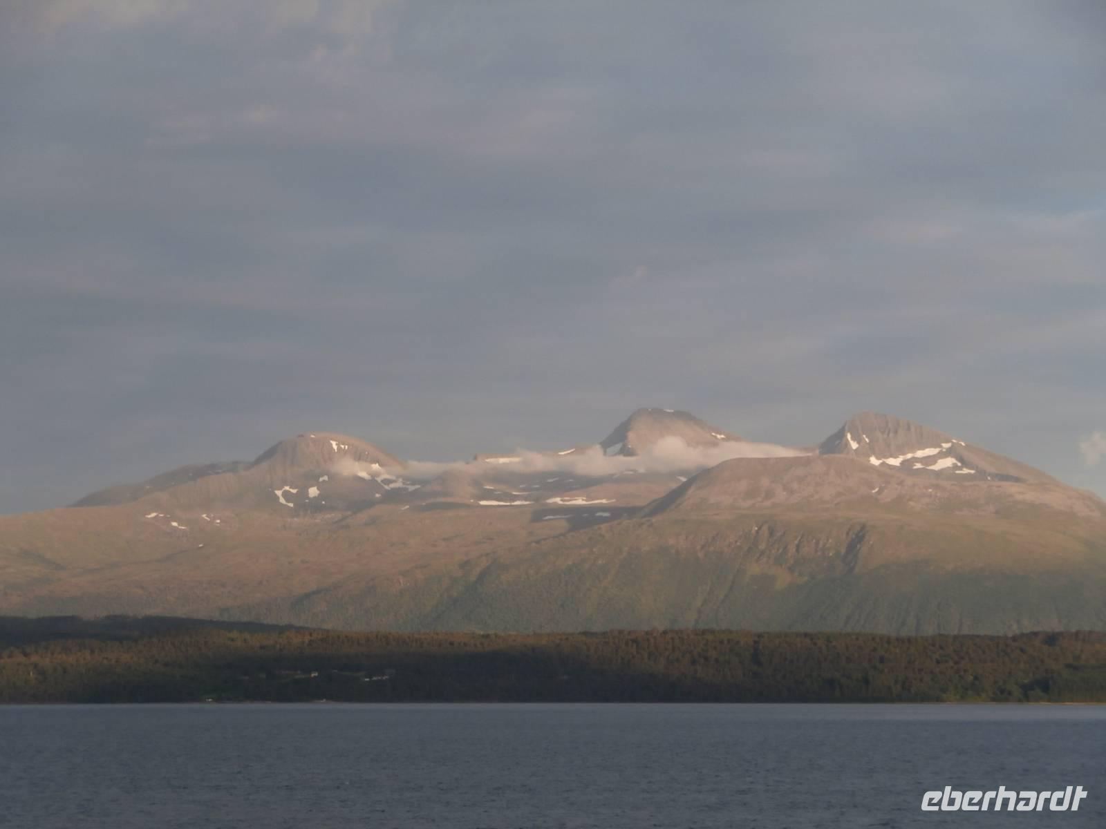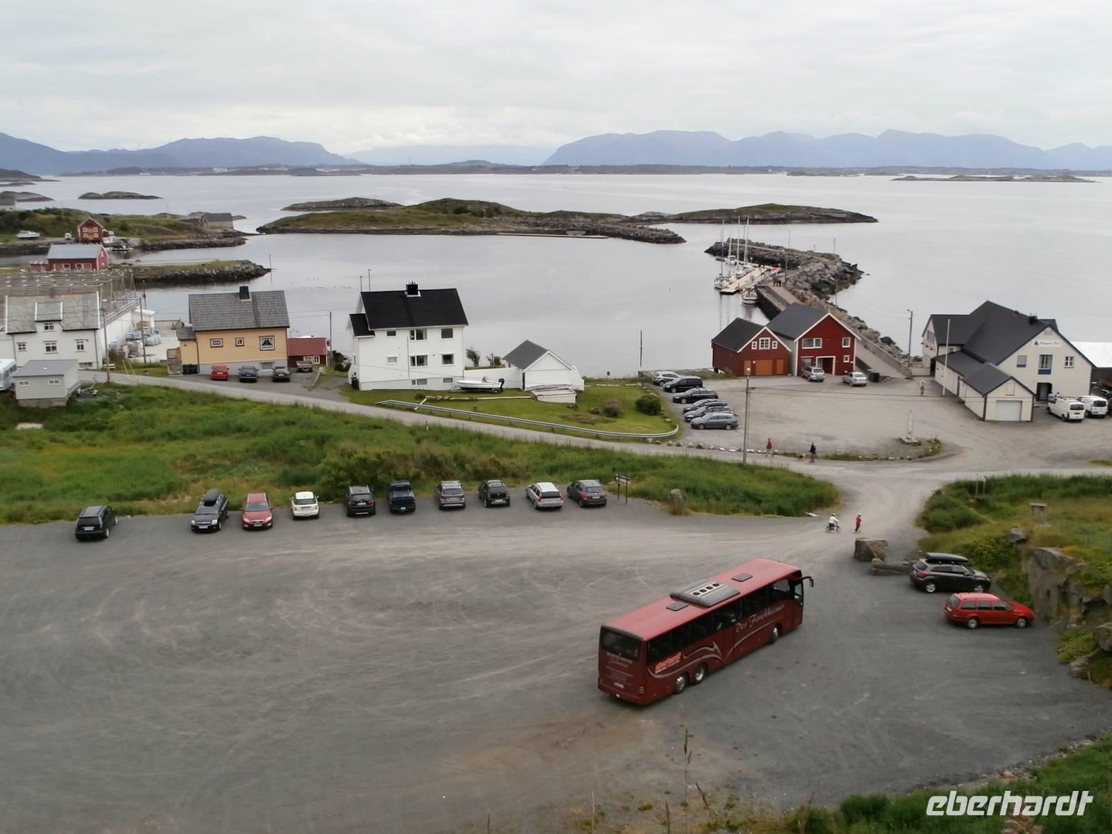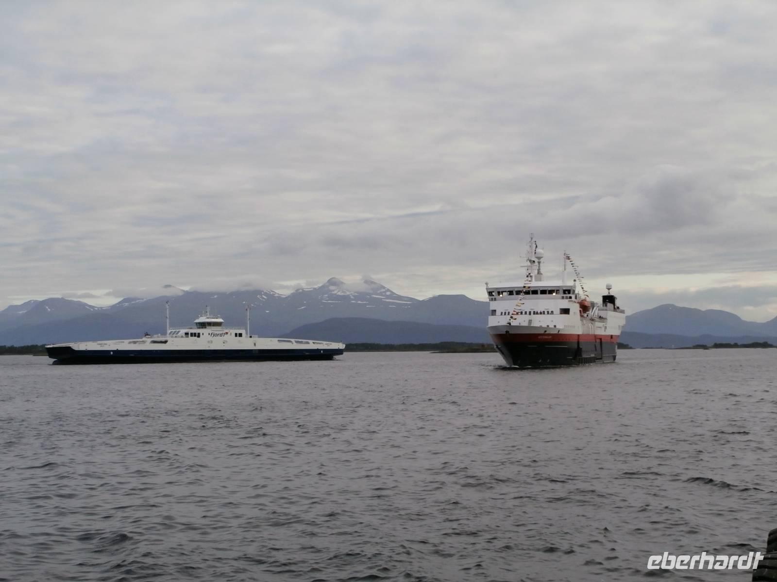 Unsere Reise geht weiter, heute Morgen scheint uns nicht die Sonne, aber die Fahrt weg von Orkanger geht durch herrliche Natur, viele Seen, kleinere Fjorde und herrliche Grundstücke sehen wir. Auch eine Fährüberfahrt von Halsa nach Kanestraum bewältigen wir mit unserem Bus. Im Hafen von Kristiansund parken wir und genießen eine schöne Freizeit in der Stadt des Klippfisches, ein Foto von der Klippfischfrau, die wir am Fjord auf dem Denkmal sehen, nehmen wir alle auf. Nach Mittag und Kaffee geht es zum nächsten Höhepunkt unserer Reise, die Fahrt auf der Atlantikstraße, mitten durch die offene See und die markante Schärenlandschaft. Die Straße führt zuerst in einen langen, neuen Tunnel unter dem Fjord entlang, dann die Atlantikstraße mit mehreren Brücken und Dämmen in einer tollen Form der Straße auf einer Länge von 8 km. Wir legen 1 Fotostopp ein und klettern dabei auch auf einen Hügel, um schöne Aussichten und Wollgras zu sehen und genießen. Wir haben für heute noch einen besonderen Stopp geplant, die Fahrt in das kleine Fischerdorf Bud, gelegen in der Hustadbucht. Hier sehen wir noch eine Geschützstellung aus dem 2. Weltkrieg und auch einen Gesteinspark. Am Bus gibt es für alle Gäste noch ein kleines Picknik mit Elch-und Rentiersalami, sowie Multebeermarmelade und Kaviar zum Kosten. In Molde müssen wir nun unseren Bus verlassen und Frank verabschieden, denn er wird heute noch bis Stranda fahren und im Hotel an Land nächtigen. Unser Abendessen nehmen wir im Restaurant Egon in Molde ein. In das Gebiet der Romsdalsalpen können wir sehen und das Einlaufen unseres Schiffes der „MS Vesteralen" schön mitverfolgen. Pünktlich beziehen wir an Bord unsere Kabinen und alle Gäste erleben das Auslaufen aus der "Stadt der Rosen" so der Beiname wegen des milden Klimas. Die "Schönsten Seereise der Welt" kann nun für eine Nacht bis zum nächsten Tag an Bord der Hurtigruten beginnen, die heute 120. Geburtstag feiert. Unser Schiff wurde 1983 gebaut und auf denselben Namen wie das erste Schiff getauft, das 1893 die Hurtigruten begründete (DS Vesteraalen). 23.00 Uhr ist es noch taghell, es wird wieder sehr spät mit dem Schlafengehen.