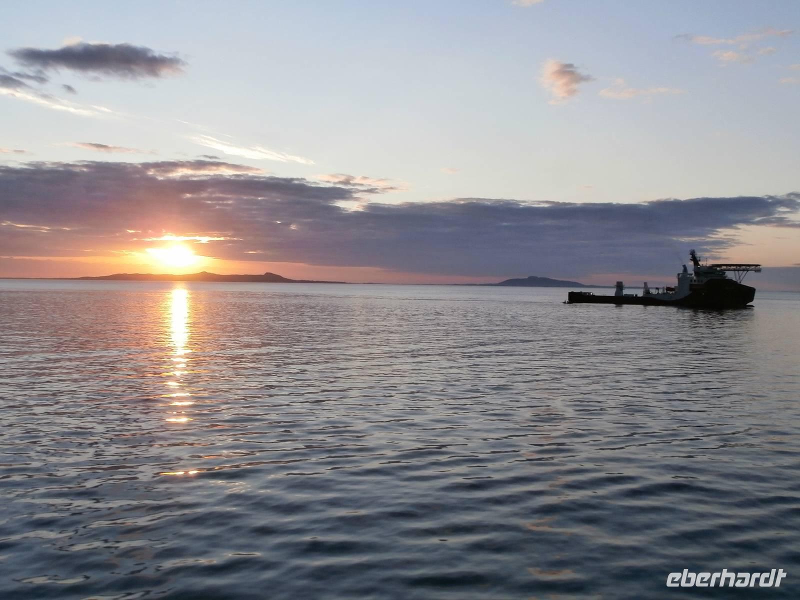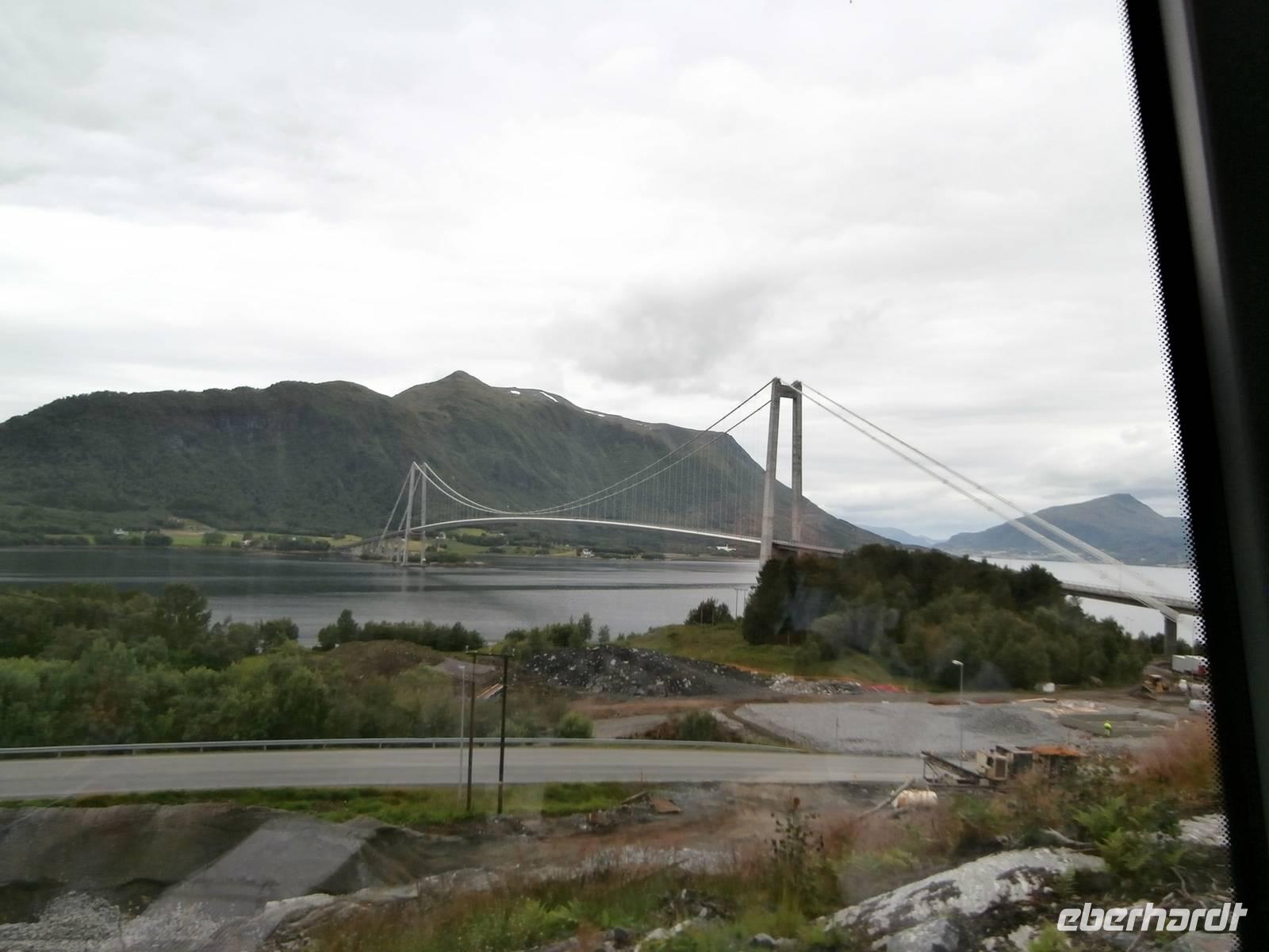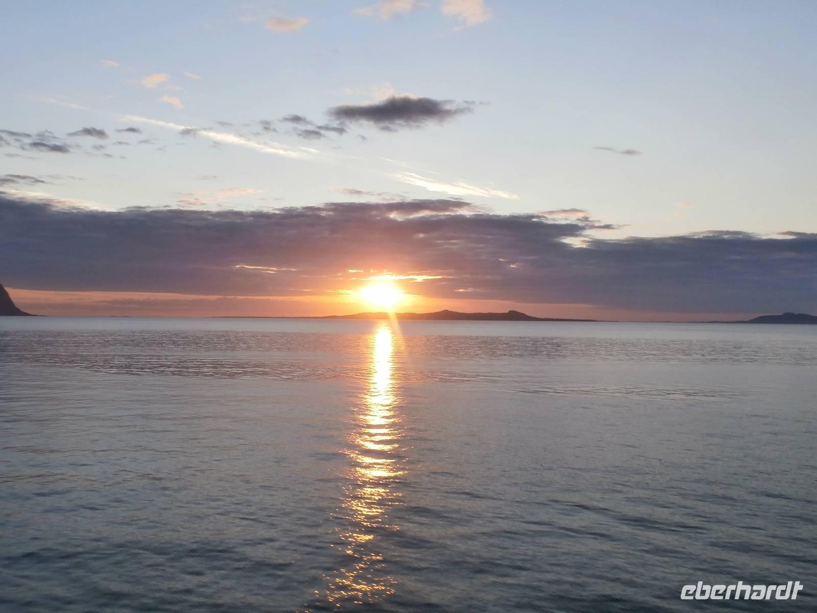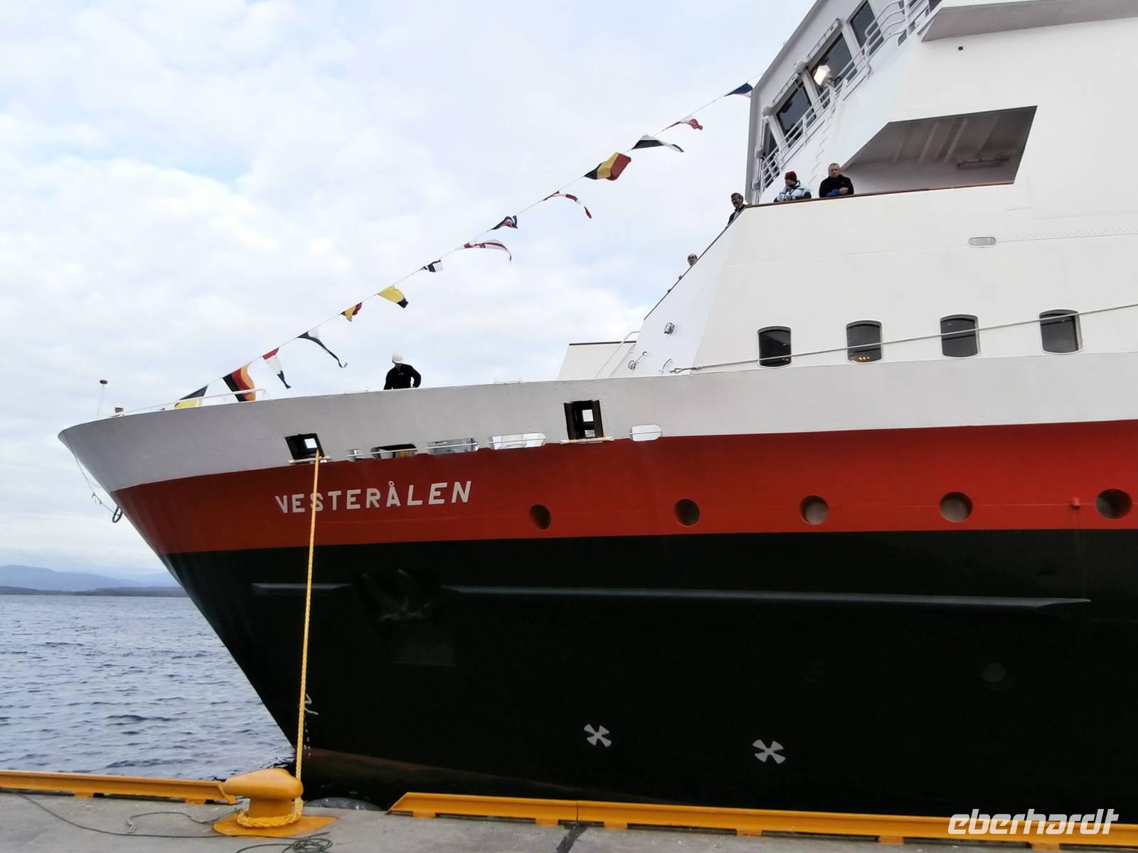 Unsere Reise geht weiter, heute Morgen scheint uns nicht die Sonne, aber die Fahrt weg von Orkanger geht durch herrliche Natur, viele Seen, kleinere Fjorde und herrliche Grundstücke sehen wir. Auch eine Fährüberfahrt von Halsa nach Kanestraum bewältigen wir mit unserem Bus. Im Hafen von Kristiansund parken wir und genießen eine schöne Freizeit in der Stadt des Klippfisches, ein Foto von der Klippfischfrau, die wir am Fjord auf dem Denkmal sehen, nehmen wir alle auf. Nach Mittag und Kaffee geht es zum nächsten Höhepunkt unserer Reise, die Fahrt auf der Atlantikstraße, mitten durch die offene See und die markante Schärenlandschaft. Die Straße führt zuerst in einen langen, neuen Tunnel unter dem Fjord entlang, dann die Atlantikstraße mit mehreren Brücken und Dämmen in einer tollen Form der Straße auf einer Länge von 8 km. Wir legen 1 Fotostopp ein und klettern dabei auch auf einen Hügel, um schöne Aussichten und Wollgras zu sehen und genießen. Wir haben für heute noch einen besonderen Stopp geplant, die Fahrt in das kleine Fischerdorf Bud, gelegen in der Hustadbucht. Hier sehen wir noch eine Geschützstellung aus dem 2. Weltkrieg und auch einen Gesteinspark. Am Bus gibt es für alle Gäste noch ein kleines Picknik mit Elch-und Rentiersalami, sowie Multebeermarmelade und Kaviar zum Kosten. In Molde müssen wir nun unseren Bus verlassen und Frank verabschieden, denn er wird heute noch bis Stranda fahren und im Hotel an Land nächtigen. Unser Abendessen nehmen wir im Restaurant Egon in Molde ein. In das Gebiet der Romsdalsalpen können wir sehen und das Einlaufen unseres Schiffes der „MS Vesteralen" schön mitverfolgen. Pünktlich beziehen wir an Bord unsere Kabinen und alle Gäste erleben das Auslaufen aus der "Stadt der Rosen" so der Beiname wegen des milden Klimas. Die "Schönsten Seereise der Welt" kann nun für eine Nacht bis zum nächsten Tag an Bord der Hurtigruten beginnen, die heute 120. Geburtstag feiert. Unser Schiff wurde 1983 gebaut und auf denselben Namen wie das erste Schiff getauft, das 1893 die Hurtigruten begründete (DS Vesteraalen). 23.00 Uhr ist es noch taghell, es wird wieder sehr spät mit dem Schlafengehen.