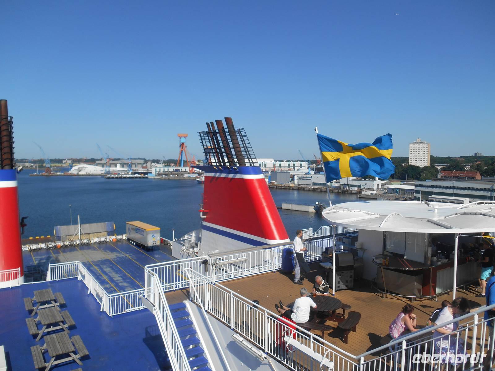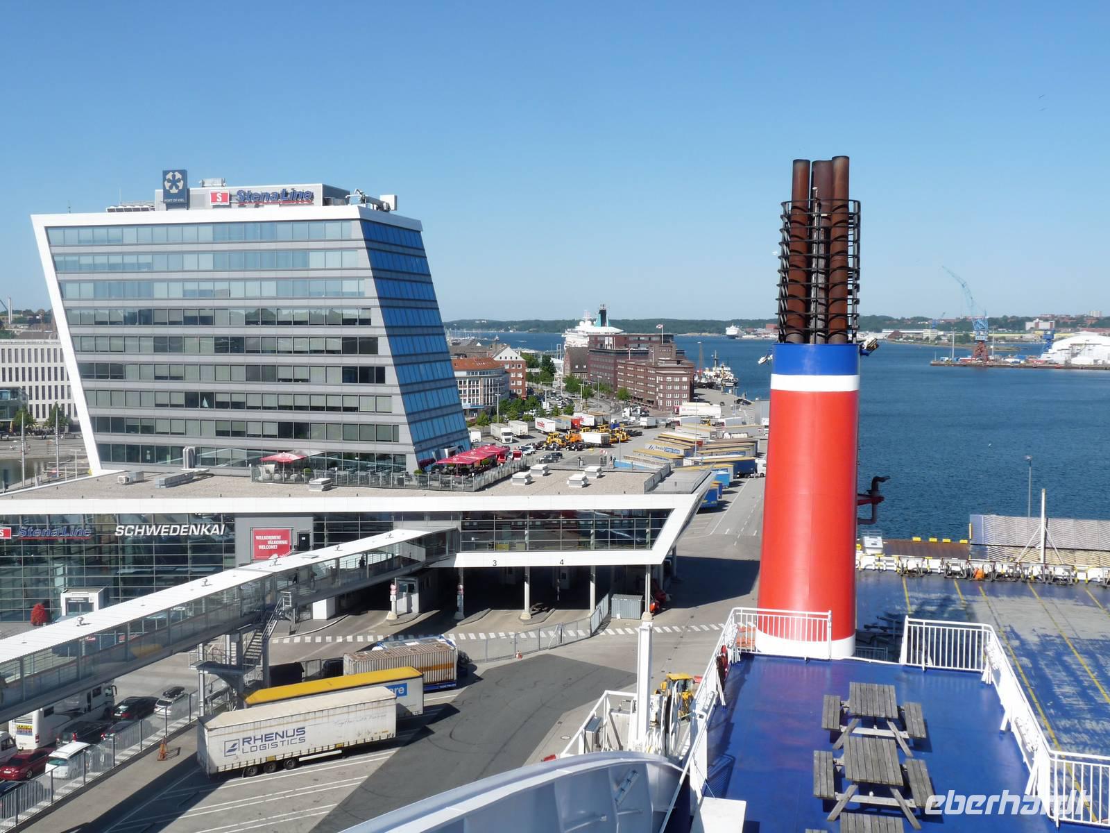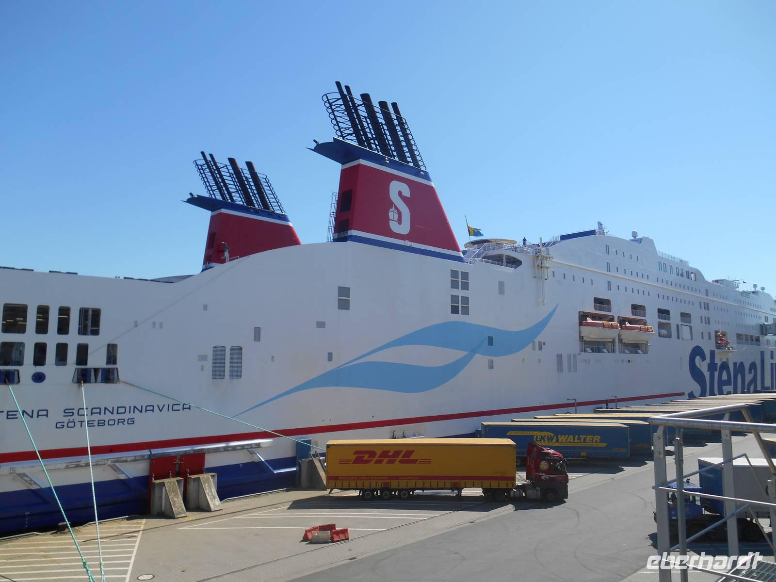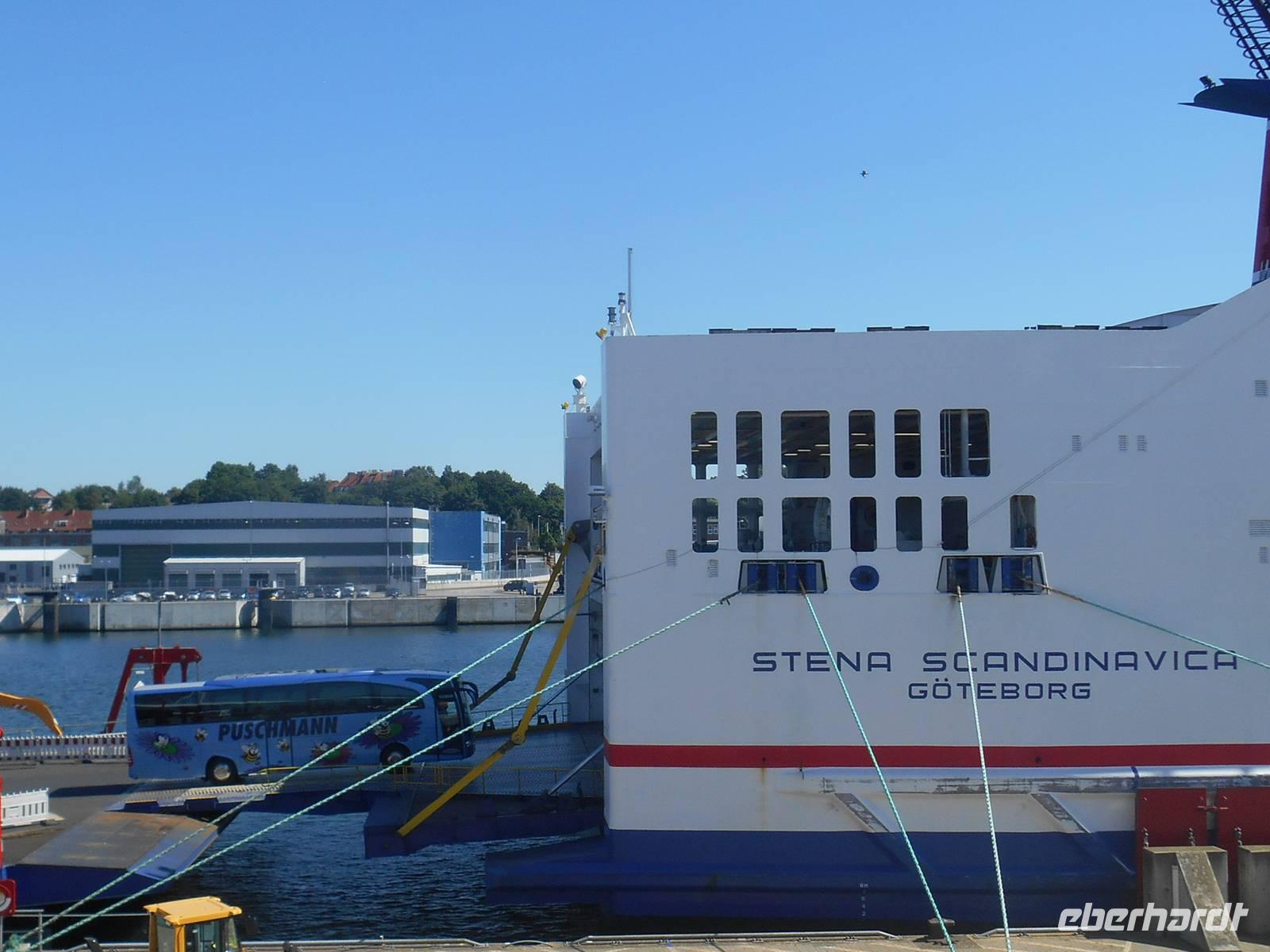 Voller Vorfreude auf Skandinavien starteten wir am frühen Morgen am Dresdner Flughafen - in Deutschland sollte es die nächsten Tage immerhin Temperaturen an die 40 Grad geben - also nichts wie fort! Nach Zustiegen in Siebenlehn ging es zum Leipziger Flughafen und in der Nähe von Berlin war unsere Gruppe vorerst mit 26 Gästen komplett. Die Route führte uns weiter in Richtung Hamburg und über die B404 bzw. die A21 erreichten wir letztendlich am frühen Nachmittag den Schwedenkai in Kiel. Nachdem wir weitere 2 Gäste direkt in Kiel begrüßt hatten, betraten wir pünktlich um kurz nach 15 Uhr die Fähre der „Stena Scandinavica", welche insgesamt ca. 1.300 Personen fasst. Bereits kurz nach 18 Uhr trafen wir uns alle, um das Abendessen als Skandinavisches Buffet zu genießen - sogar die Getränke waren hier inklusive! Danach fielen die meisten von uns müde ins Bett. Einige unserer munteren Gäste erlebten allerdings gegen Mitternacht die imposante Fahrt durch den Großen Belt - unsere Fähre fuhr hier schließlich durch eine insgesamt 18 km lange Brückenkonstruktion, die Ost- und Westdänemark miteinander verbindet; das wach bleiben lohnte sich also!