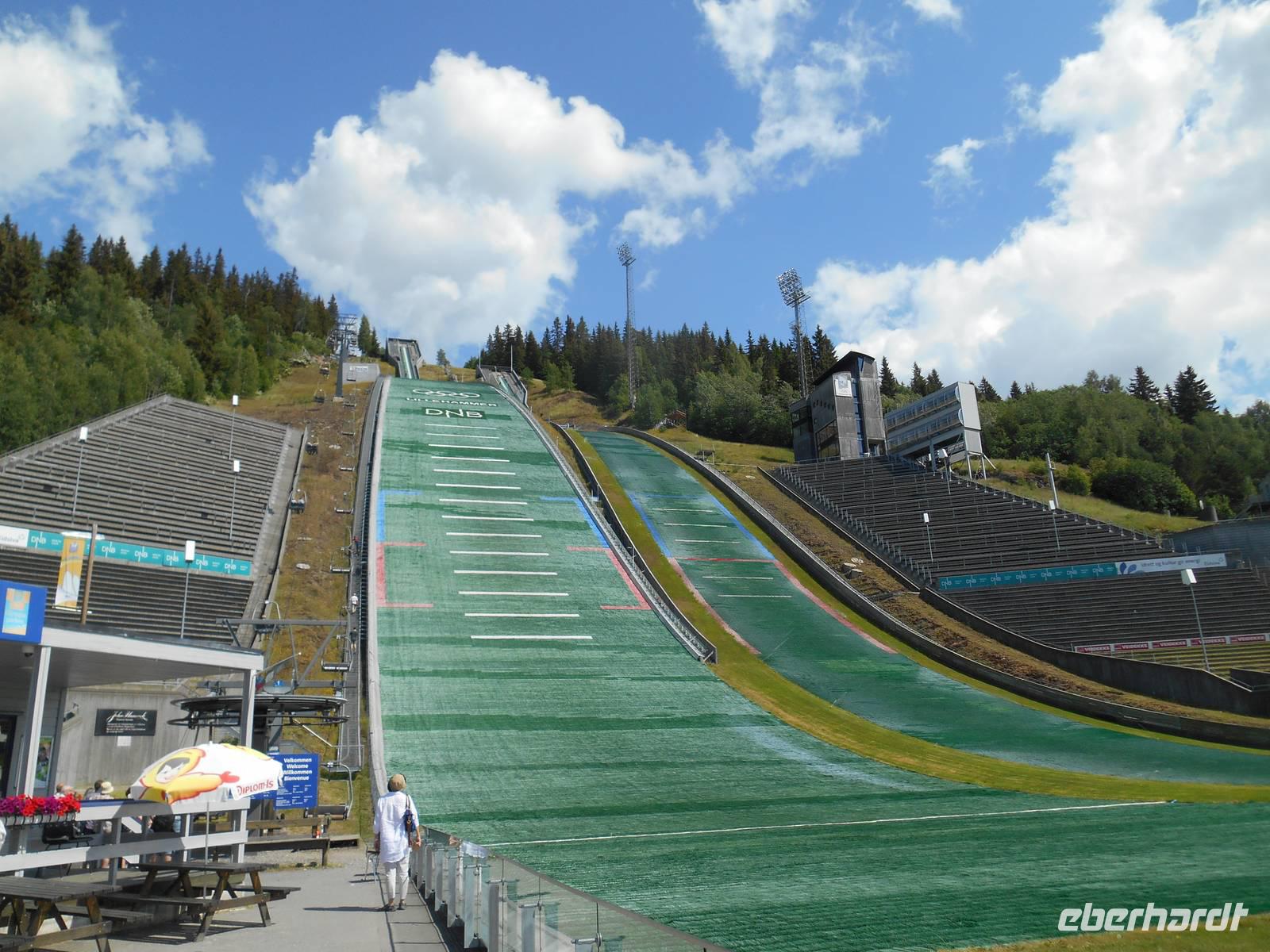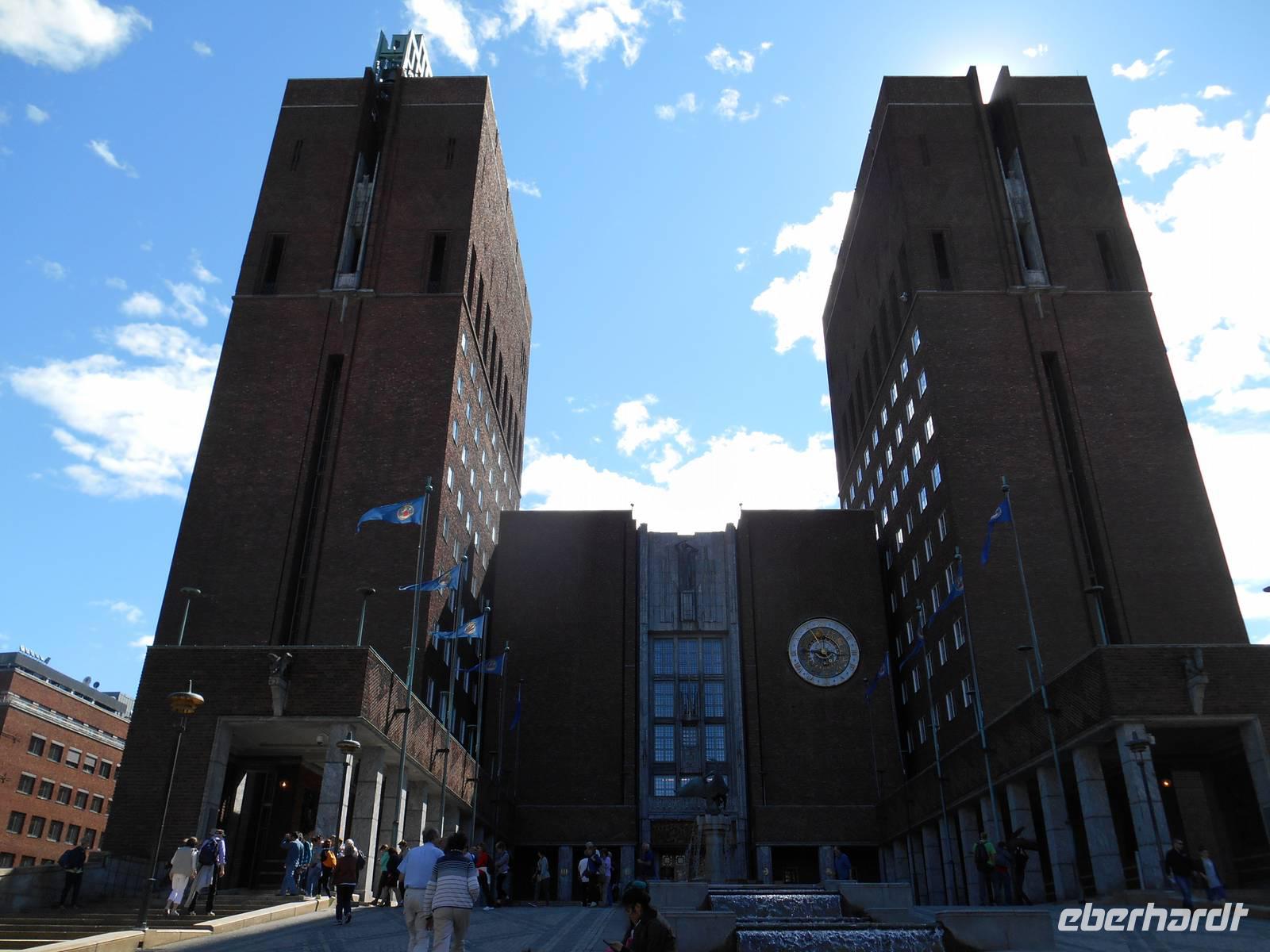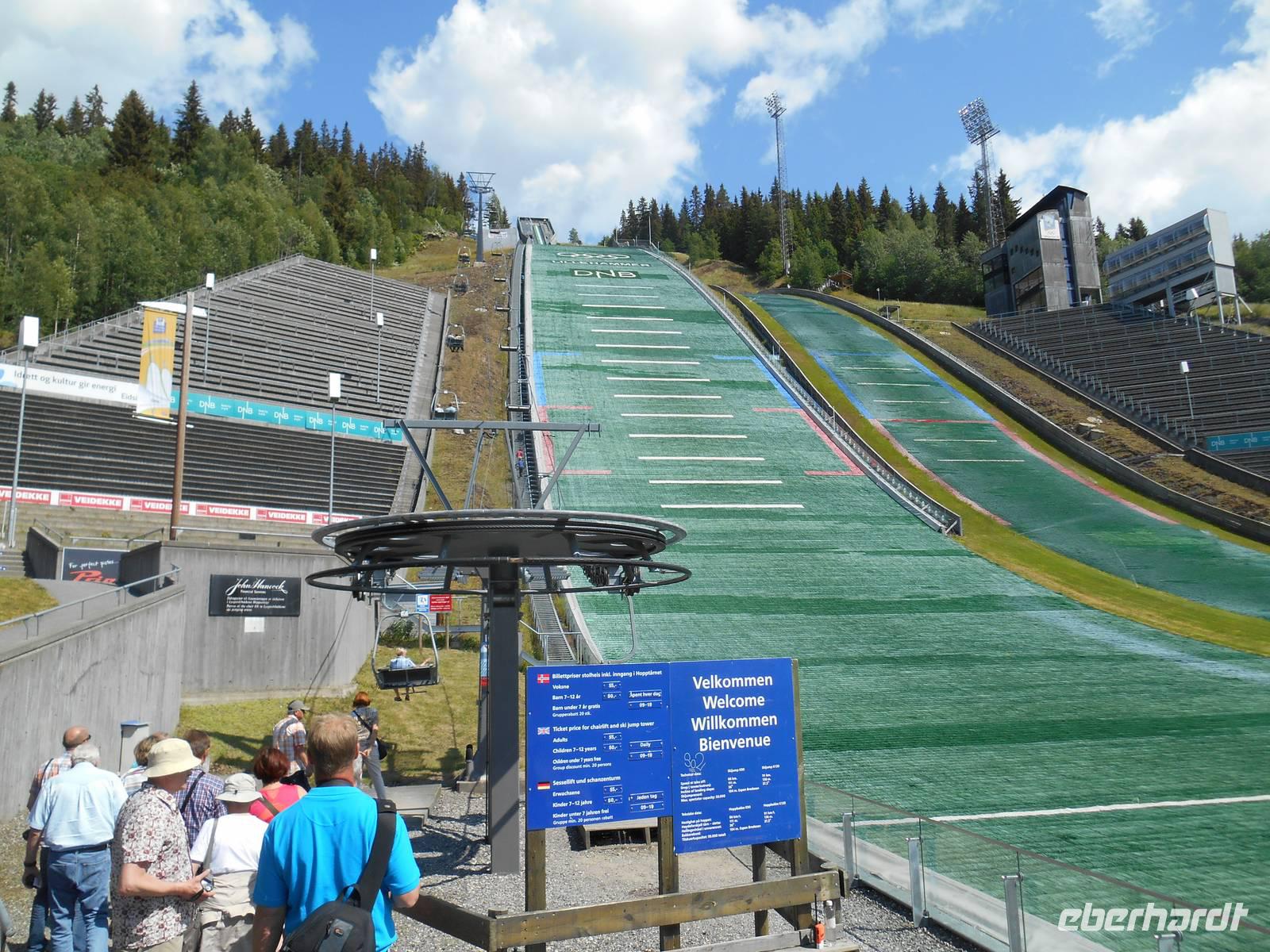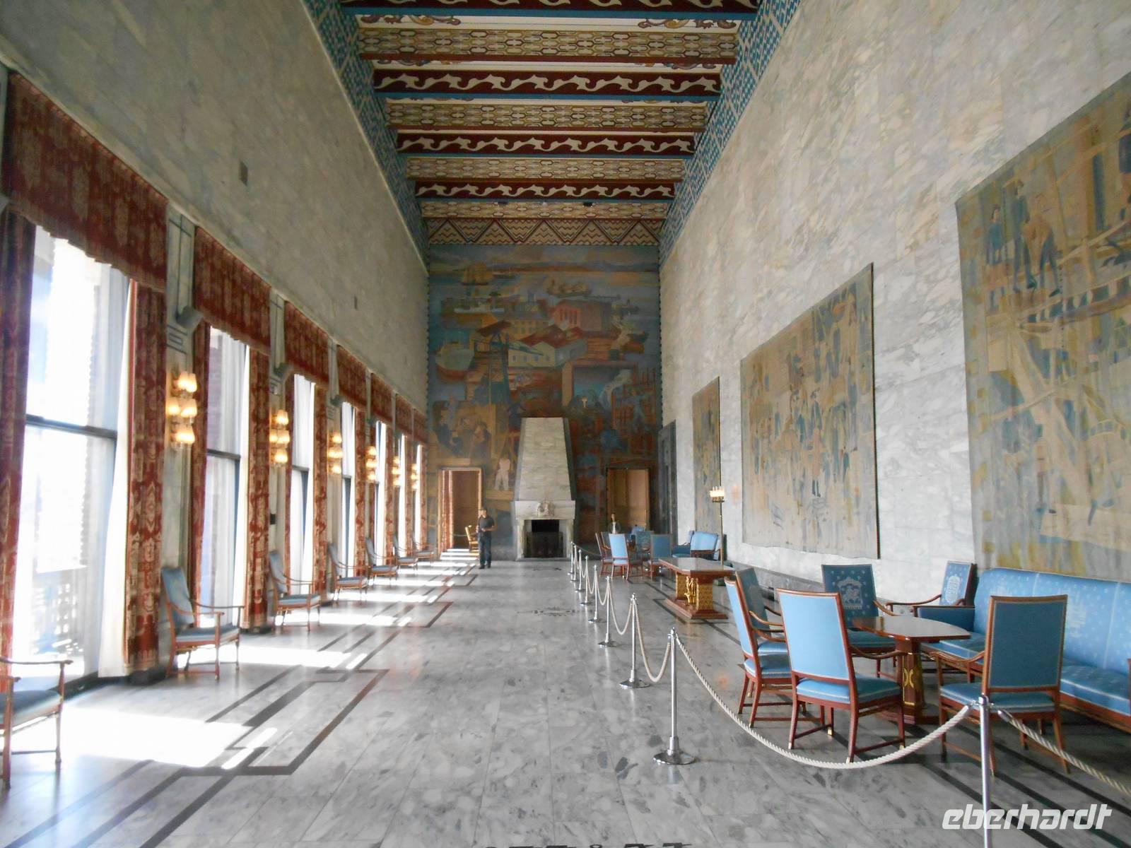 Am Morgen setzten wir unsere Reise durch das fruchtbare Hallingdal fort, welches uns bis zum Nordende des reichlich 40 km langen Krøderen-Sees führte. Vorbei an Hønefoss und entlang des Tyrifjordes erreichten wir am Mittag schließlich Oslo, der Hauptstadt Norwegens. Während einer Führung lernten wir die wichtigsten Sehenswürdigkeiten der Stadt kennen. Wir sahen unter anderem das Neue Opernhaus, das seit April 2008 die Spielstätte der Norwegischen Oper ist. Des Weiteren fuhren wir am Königlichen Palast vorbei und besuchten den berühmten Vigeland-Park. Der norwegische Künstler Gustav Vigeland hat hier Beeindruckendes geschaffen. Wer in Oslo den Skulpturenpark betritt, ist für einen Moment atemlos vor Staunen! Mit dem 32 Hektar großen Areal hat Vigeland sich den Traum vieler Künstler erfüllt - er hat ein Gesamtkunstwerk geschaffen. Die dargestellten Menschen und Tiere sind so lebensecht, so voller Bewegung und Emotion, dass man meint, sie atmen zu sehen! Im Anschluss an die Stadtrundfahrt hatten wir noch etwas Freizeit in der Innenstadt - die meisten Gäste besuchte (wie ich übrigens auch) das Osloer Rathaus. Das Osloer Rathaus habe ich zunächst immer nur vom Bus aus betrachtet und dachte mir, was ist das doch für ein scheußlicher Klotz... Tritt man dann allerdings durch die reich verzierte Eingangstür, vorbei am Empfang, findet man sich in einer riesigen Halle, einem großen Festsaal wieder. Der leere Saal ist sehr imposant, vor allem weil jede Wand mit einem riesigen Gemälde geschmückt ist. So etwas habe ich noch nirgends gesehen! Künstler wie Edvard Munch, Henrik Sørensen oder auch Axel Revold haben sich hier verewigt. Und das Beste - den Saal kennt bestimmt ein jeder (zumindest aus dem Fernsehen), denn hier wird alljährlich am 10. Dezember der Friedensnobelpreis verliehen. Fotos zeigen, wie es hier ausschaut, wenn die Prominenz aus aller Herren Länder plus Medienvertreter zusammen kommen. Hat man sich unten satt gesehen, gibt es ein Stockwerk höher noch weitere Räume zu bewundern, alle ebenfalls reich bemalt. Das Rathaus kann übrigens kostenfrei besichtigt werden - ein echter Geheimtipp! Zum Abschluss des Tages ging es den ca. 400 m über der Stadt gelegenen Holmenkollen hinauf. Hoch über der Stadt Oslo ragt die neue Holmenkollen Skisprunganlage, die modernste Sprungschanze der Welt. Ein imposantes Bauwerk aus Stahl und Beton! Leider hatten wir heute etwas Pech, denn der Schrägaufzug war defekt, der uns eigentlich auf den Schanzenturm bringen sollte! Von dessen höchster Stelle man nämlich einen spektakulären Ausblick auf Oslo und den Oslofjord hat - schade, ließ sich allerdings nicht ändern! In unmittelbarer Nachbarschaft, im „Scandic Holmenkollen Park Hotel", verbrachten wir unsere letzte Nacht auf norwegischen Boden. Zum Abendessen wurde uns auch hier ein skandinavisches Buffet gereicht und danach konnten wir von den Aussichtsterrassen des Hotels nochmals den einzigartigen Blick auf die Stadt und den Oslofjord genießen.
