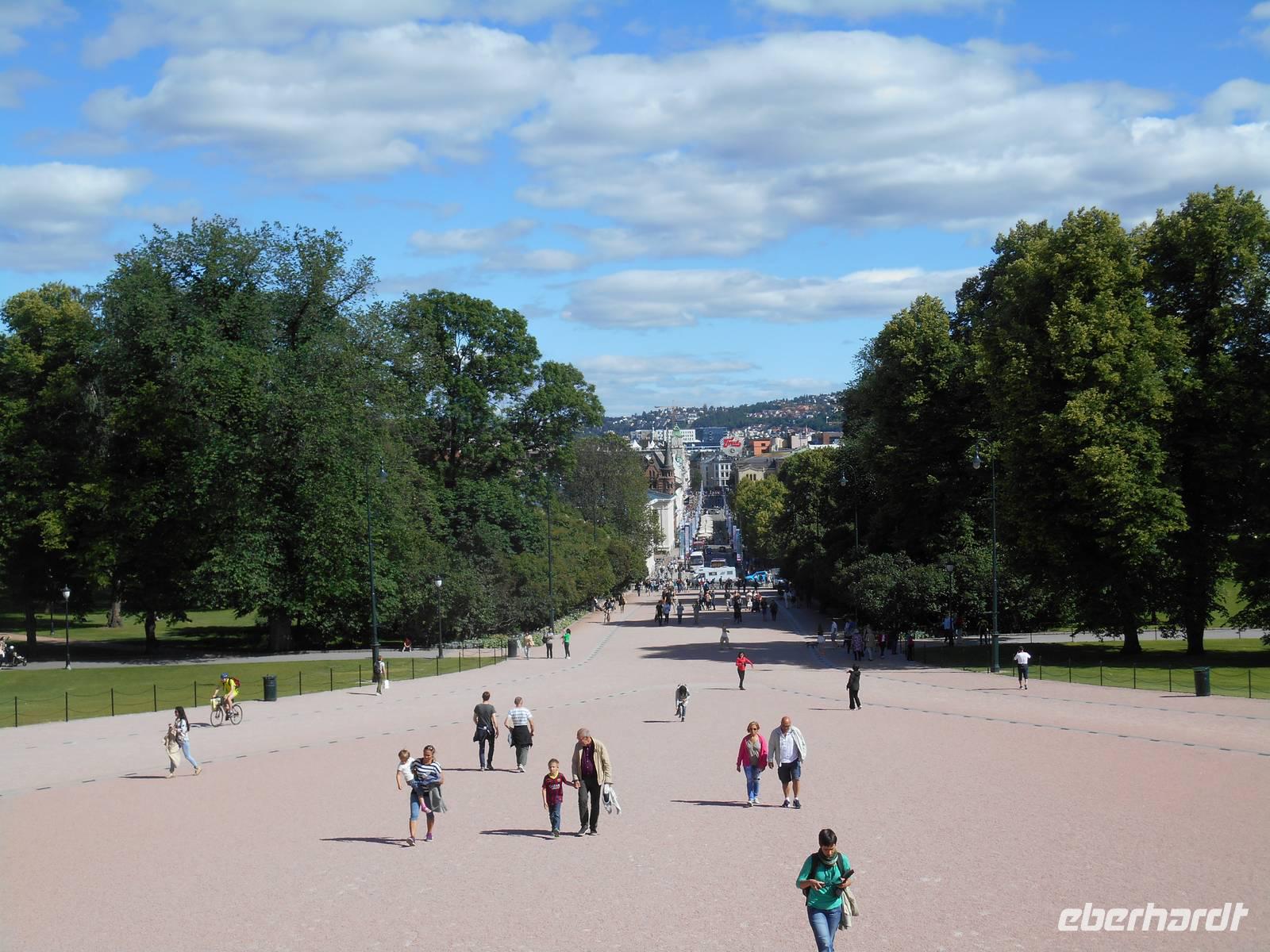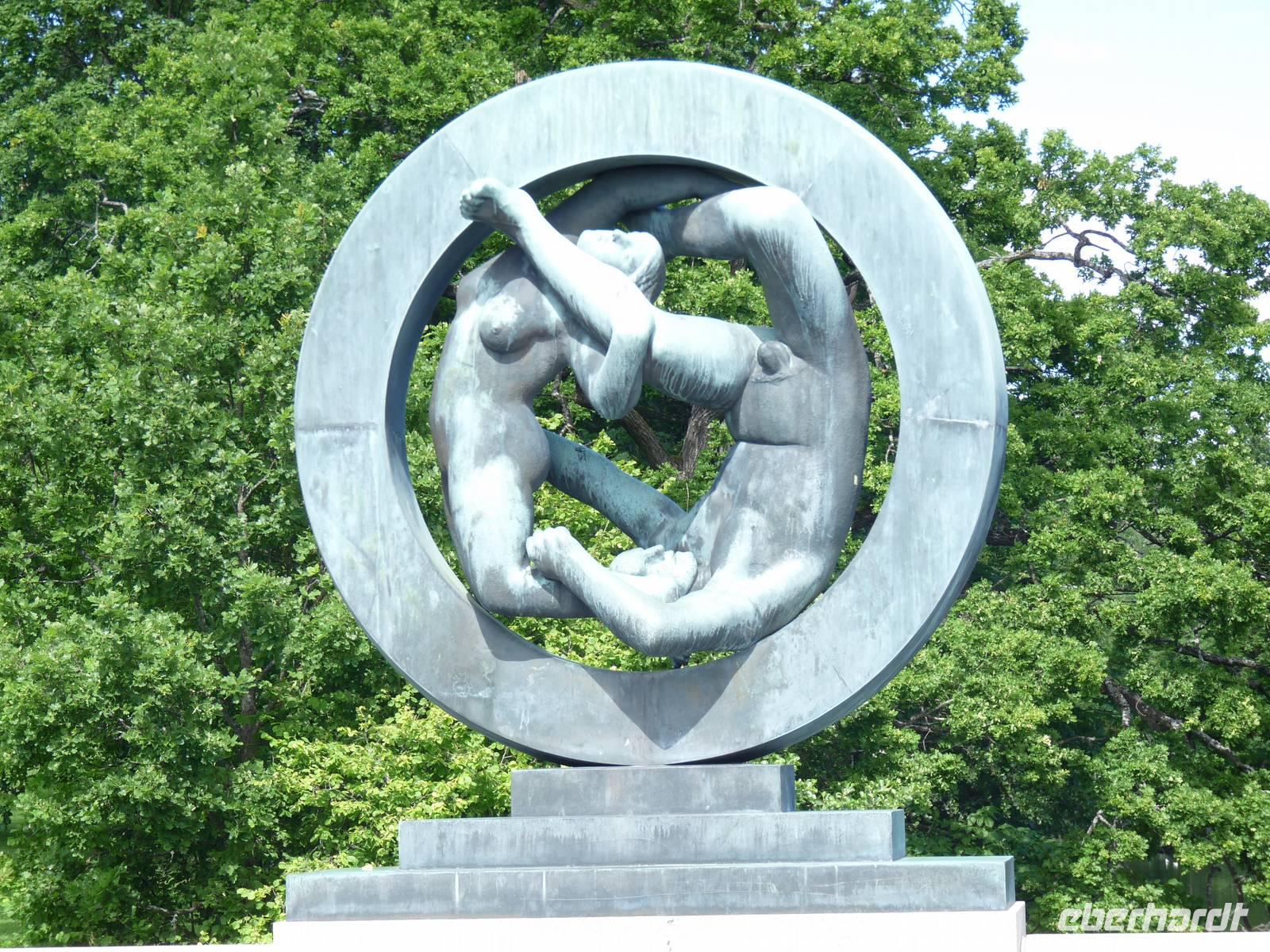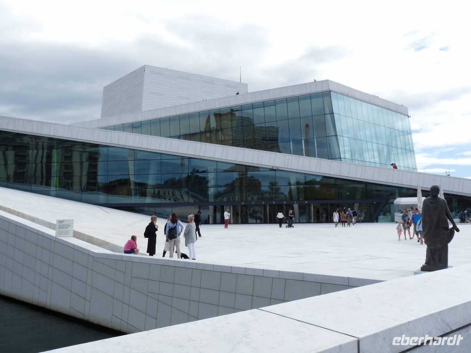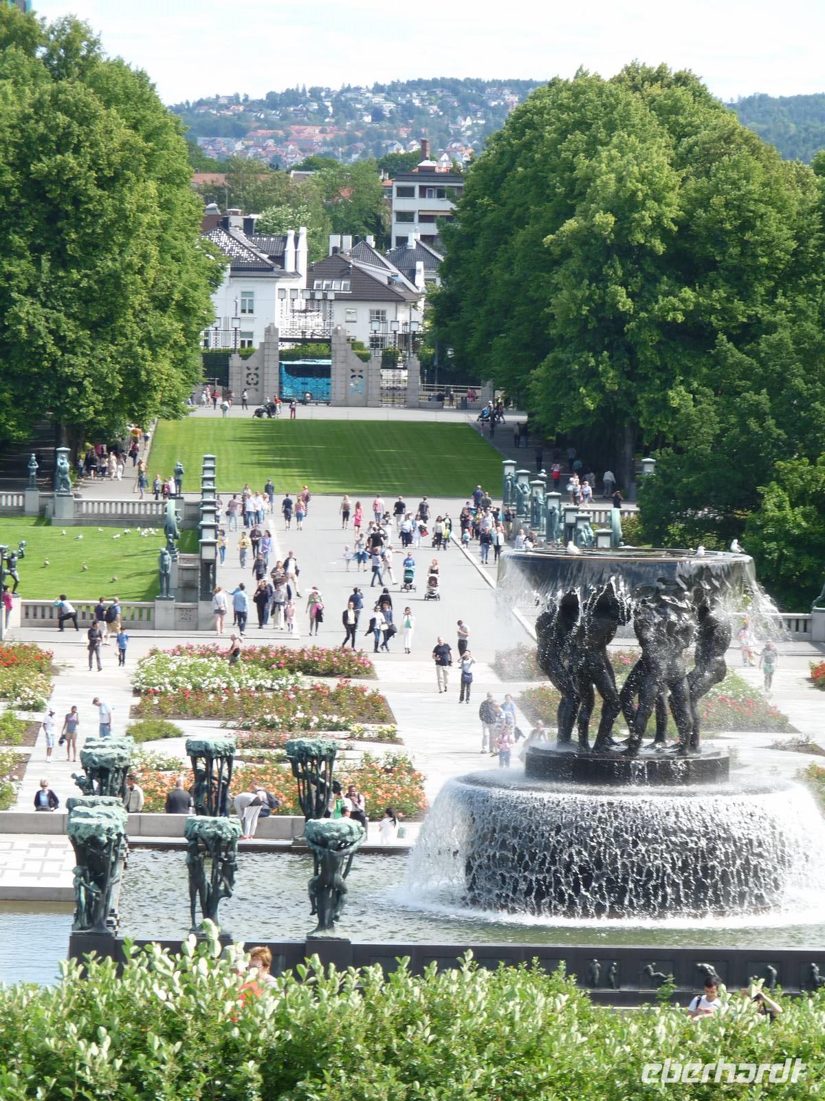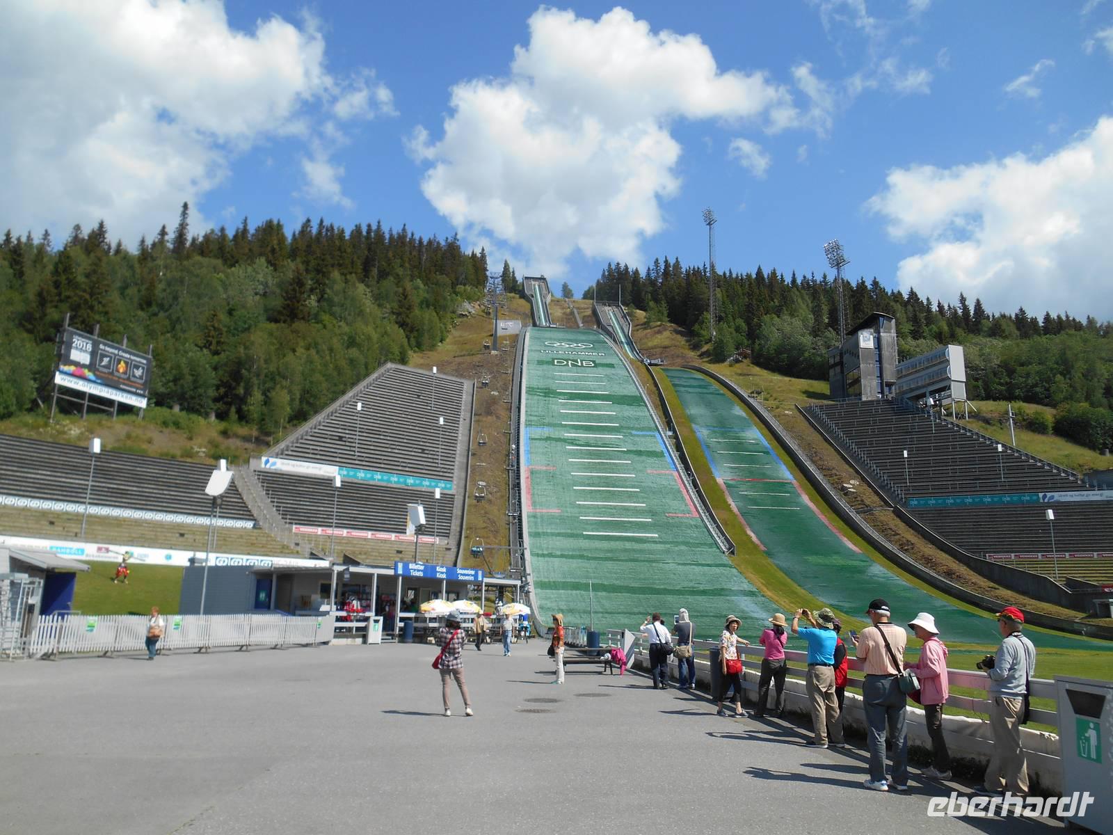 Am Morgen setzten wir unsere Reise durch das fruchtbare Hallingdal fort, welches uns bis zum Nordende des reichlich 40 km langen Krøderen-Sees führte. Vorbei an Hønefoss und entlang des Tyrifjordes erreichten wir am Mittag schließlich Oslo, der Hauptstadt Norwegens. Während einer Führung lernten wir die wichtigsten Sehenswürdigkeiten der Stadt kennen. Wir sahen unter anderem das Neue Opernhaus, das seit April 2008 die Spielstätte der Norwegischen Oper ist. Des Weiteren fuhren wir am Königlichen Palast vorbei und besuchten den berühmten Vigeland-Park. Der norwegische Künstler Gustav Vigeland hat hier Beeindruckendes geschaffen. Wer in Oslo den Skulpturenpark betritt, ist für einen Moment atemlos vor Staunen! Mit dem 32 Hektar großen Areal hat Vigeland sich den Traum vieler Künstler erfüllt - er hat ein Gesamtkunstwerk geschaffen. Die dargestellten Menschen und Tiere sind so lebensecht, so voller Bewegung und Emotion, dass man meint, sie atmen zu sehen! Im Anschluss an die Stadtrundfahrt hatten wir noch etwas Freizeit in der Innenstadt - die meisten Gäste besuchte (wie ich übrigens auch) das Osloer Rathaus. Das Osloer Rathaus habe ich zunächst immer nur vom Bus aus betrachtet und dachte mir, was ist das doch für ein scheußlicher Klotz... Tritt man dann allerdings durch die reich verzierte Eingangstür, vorbei am Empfang, findet man sich in einer riesigen Halle, einem großen Festsaal wieder. Der leere Saal ist sehr imposant, vor allem weil jede Wand mit einem riesigen Gemälde geschmückt ist. So etwas habe ich noch nirgends gesehen! Künstler wie Edvard Munch, Henrik Sørensen oder auch Axel Revold haben sich hier verewigt. Und das Beste - den Saal kennt bestimmt ein jeder (zumindest aus dem Fernsehen), denn hier wird alljährlich am 10. Dezember der Friedensnobelpreis verliehen. Fotos zeigen, wie es hier ausschaut, wenn die Prominenz aus aller Herren Länder plus Medienvertreter zusammen kommen. Hat man sich unten satt gesehen, gibt es ein Stockwerk höher noch weitere Räume zu bewundern, alle ebenfalls reich bemalt. Das Rathaus kann übrigens kostenfrei besichtigt werden - ein echter Geheimtipp! Zum Abschluss des Tages ging es den ca. 400 m über der Stadt gelegenen Holmenkollen hinauf. Hoch über der Stadt Oslo ragt die neue Holmenkollen Skisprunganlage, die modernste Sprungschanze der Welt. Ein imposantes Bauwerk aus Stahl und Beton! Leider hatten wir heute etwas Pech, denn der Schrägaufzug war defekt, der uns eigentlich auf den Schanzenturm bringen sollte! Von dessen höchster Stelle man nämlich einen spektakulären Ausblick auf Oslo und den Oslofjord hat - schade, ließ sich allerdings nicht ändern! In unmittelbarer Nachbarschaft, im „Scandic Holmenkollen Park Hotel", verbrachten wir unsere letzte Nacht auf norwegischen Boden. Zum Abendessen wurde uns auch hier ein skandinavisches Buffet gereicht und danach konnten wir von den Aussichtsterrassen des Hotels nochmals den einzigartigen Blick auf die Stadt und den Oslofjord genießen.