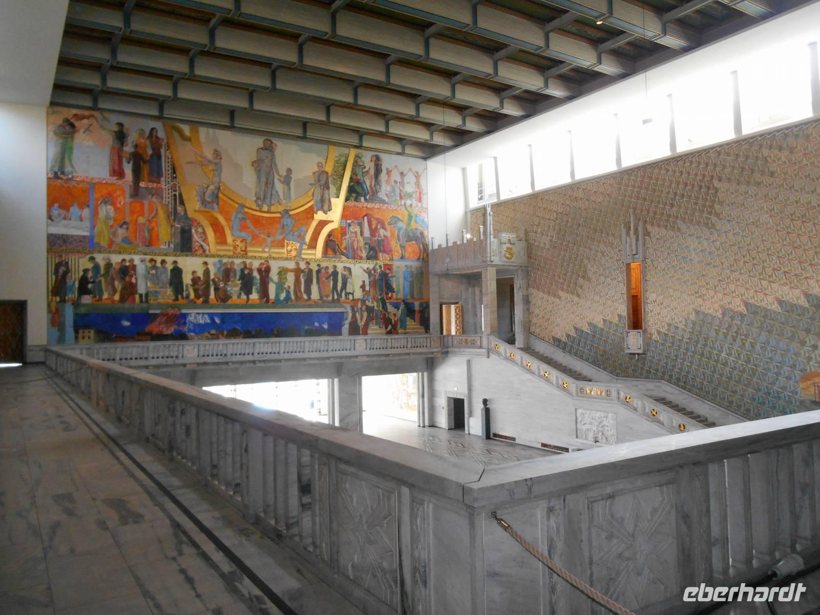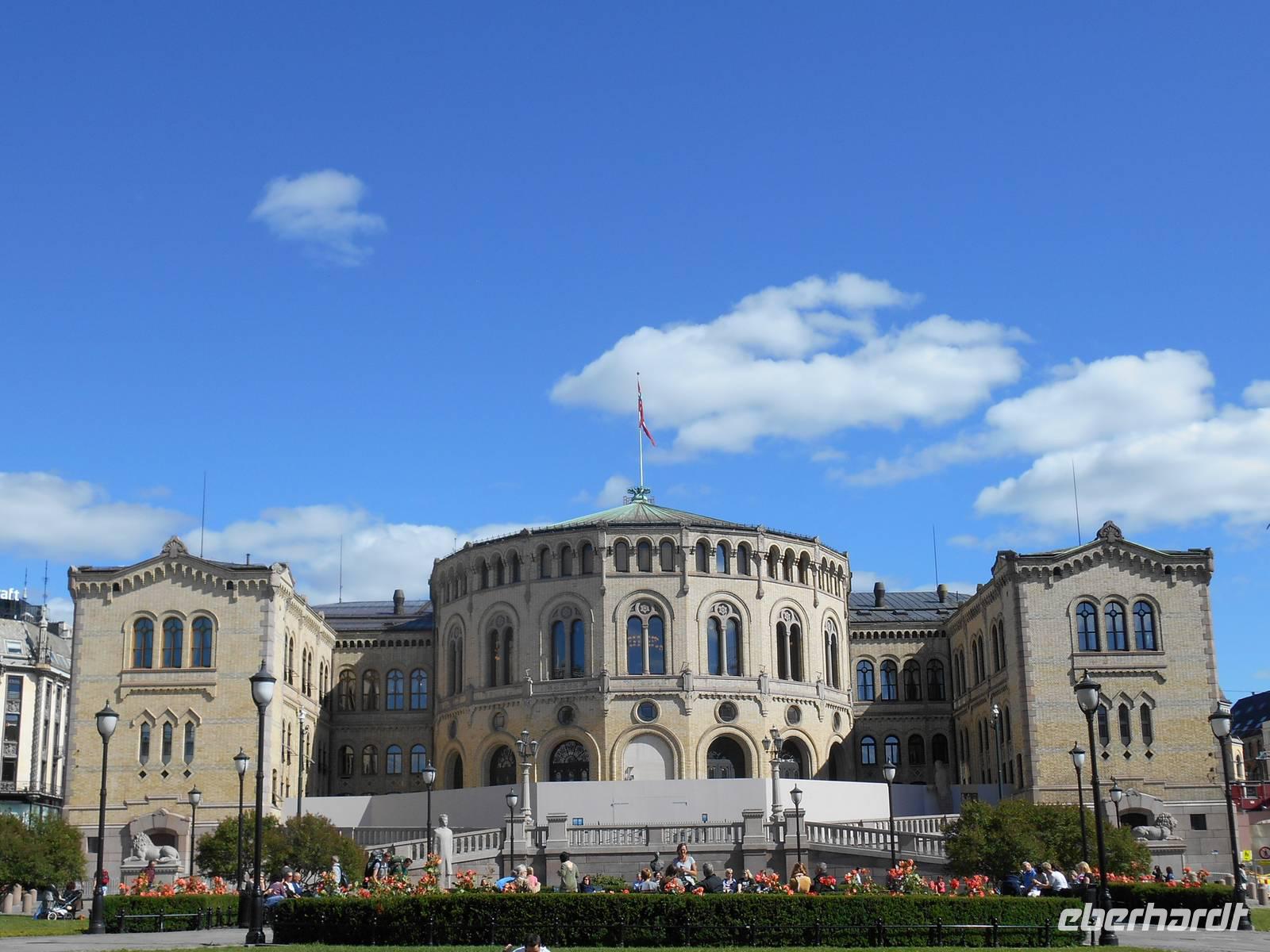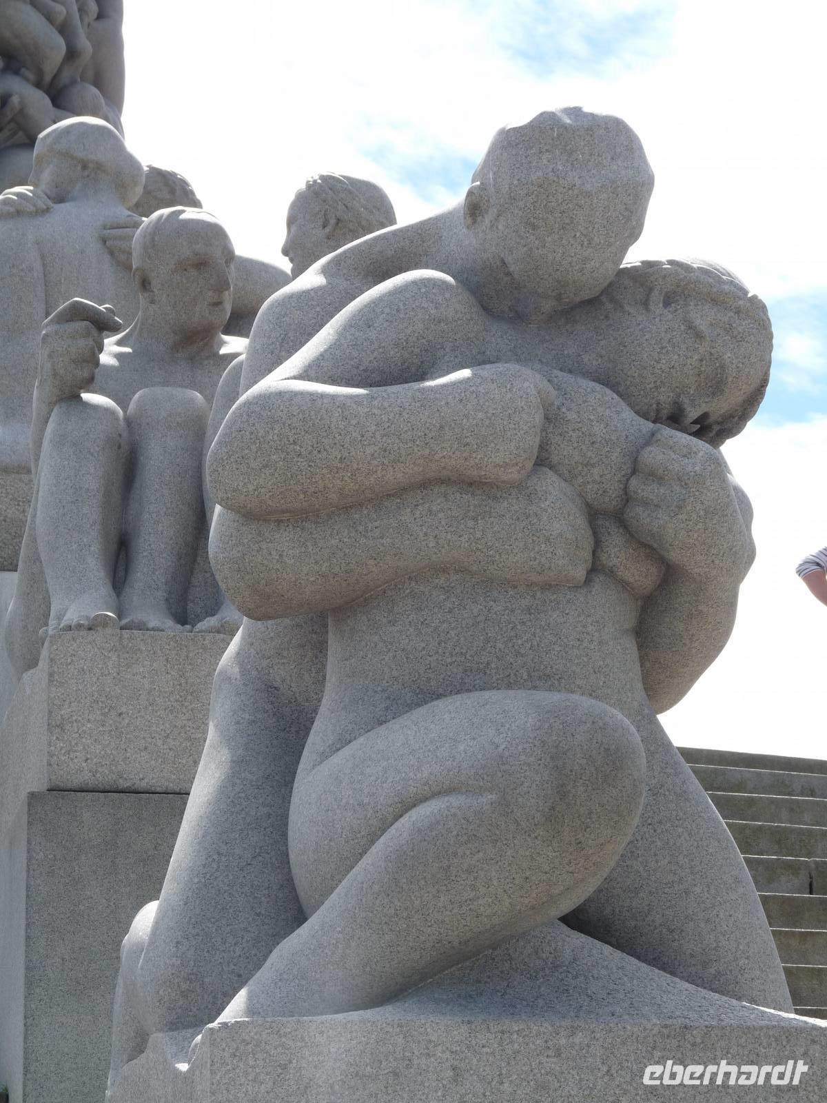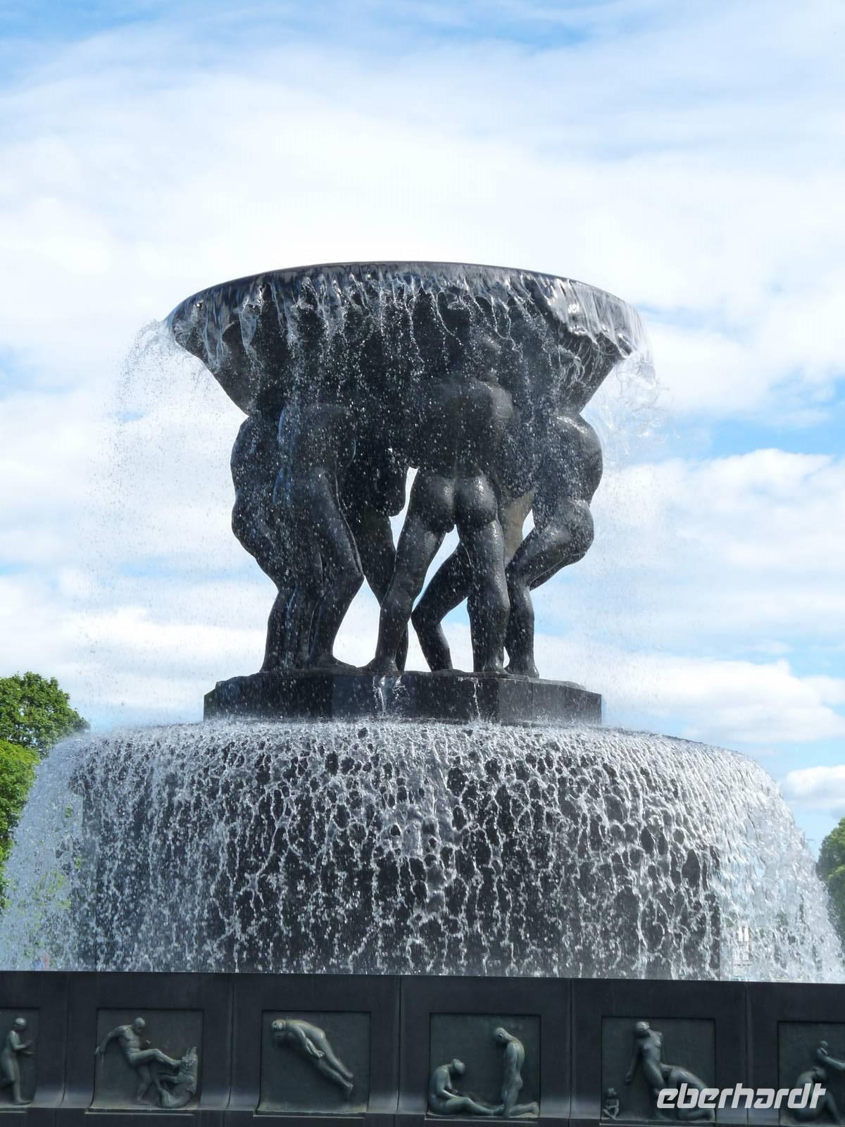 Am Morgen setzten wir unsere Reise durch das fruchtbare Hallingdal fort, welches uns bis zum Nordende des reichlich 40 km langen Krøderen-Sees führte. Vorbei an Hønefoss und entlang des Tyrifjordes erreichten wir am Mittag schließlich Oslo, der Hauptstadt Norwegens. Während einer Führung lernten wir die wichtigsten Sehenswürdigkeiten der Stadt kennen. Wir sahen unter anderem das Neue Opernhaus, das seit April 2008 die Spielstätte der Norwegischen Oper ist. Des Weiteren fuhren wir am Königlichen Palast vorbei und besuchten den berühmten Vigeland-Park. Der norwegische Künstler Gustav Vigeland hat hier Beeindruckendes geschaffen. Wer in Oslo den Skulpturenpark betritt, ist für einen Moment atemlos vor Staunen! Mit dem 32 Hektar großen Areal hat Vigeland sich den Traum vieler Künstler erfüllt - er hat ein Gesamtkunstwerk geschaffen. Die dargestellten Menschen und Tiere sind so lebensecht, so voller Bewegung und Emotion, dass man meint, sie atmen zu sehen! Im Anschluss an die Stadtrundfahrt hatten wir noch etwas Freizeit in der Innenstadt - die meisten Gäste besuchte (wie ich übrigens auch) das Osloer Rathaus. Das Osloer Rathaus habe ich zunächst immer nur vom Bus aus betrachtet und dachte mir, was ist das doch für ein scheußlicher Klotz... Tritt man dann allerdings durch die reich verzierte Eingangstür, vorbei am Empfang, findet man sich in einer riesigen Halle, einem großen Festsaal wieder. Der leere Saal ist sehr imposant, vor allem weil jede Wand mit einem riesigen Gemälde geschmückt ist. So etwas habe ich noch nirgends gesehen! Künstler wie Edvard Munch, Henrik Sørensen oder auch Axel Revold haben sich hier verewigt. Und das Beste - den Saal kennt bestimmt ein jeder (zumindest aus dem Fernsehen), denn hier wird alljährlich am 10. Dezember der Friedensnobelpreis verliehen. Fotos zeigen, wie es hier ausschaut, wenn die Prominenz aus aller Herren Länder plus Medienvertreter zusammen kommen. Hat man sich unten satt gesehen, gibt es ein Stockwerk höher noch weitere Räume zu bewundern, alle ebenfalls reich bemalt. Das Rathaus kann übrigens kostenfrei besichtigt werden - ein echter Geheimtipp! Zum Abschluss des Tages ging es den ca. 400 m über der Stadt gelegenen Holmenkollen hinauf. Hoch über der Stadt Oslo ragt die neue Holmenkollen Skisprunganlage, die modernste Sprungschanze der Welt. Ein imposantes Bauwerk aus Stahl und Beton! Leider hatten wir heute etwas Pech, denn der Schrägaufzug war defekt, der uns eigentlich auf den Schanzenturm bringen sollte! Von dessen höchster Stelle man nämlich einen spektakulären Ausblick auf Oslo und den Oslofjord hat - schade, ließ sich allerdings nicht ändern! In unmittelbarer Nachbarschaft, im „Scandic Holmenkollen Park Hotel", verbrachten wir unsere letzte Nacht auf norwegischen Boden. Zum Abendessen wurde uns auch hier ein skandinavisches Buffet gereicht und danach konnten wir von den Aussichtsterrassen des Hotels nochmals den einzigartigen Blick auf die Stadt und den Oslofjord genießen.