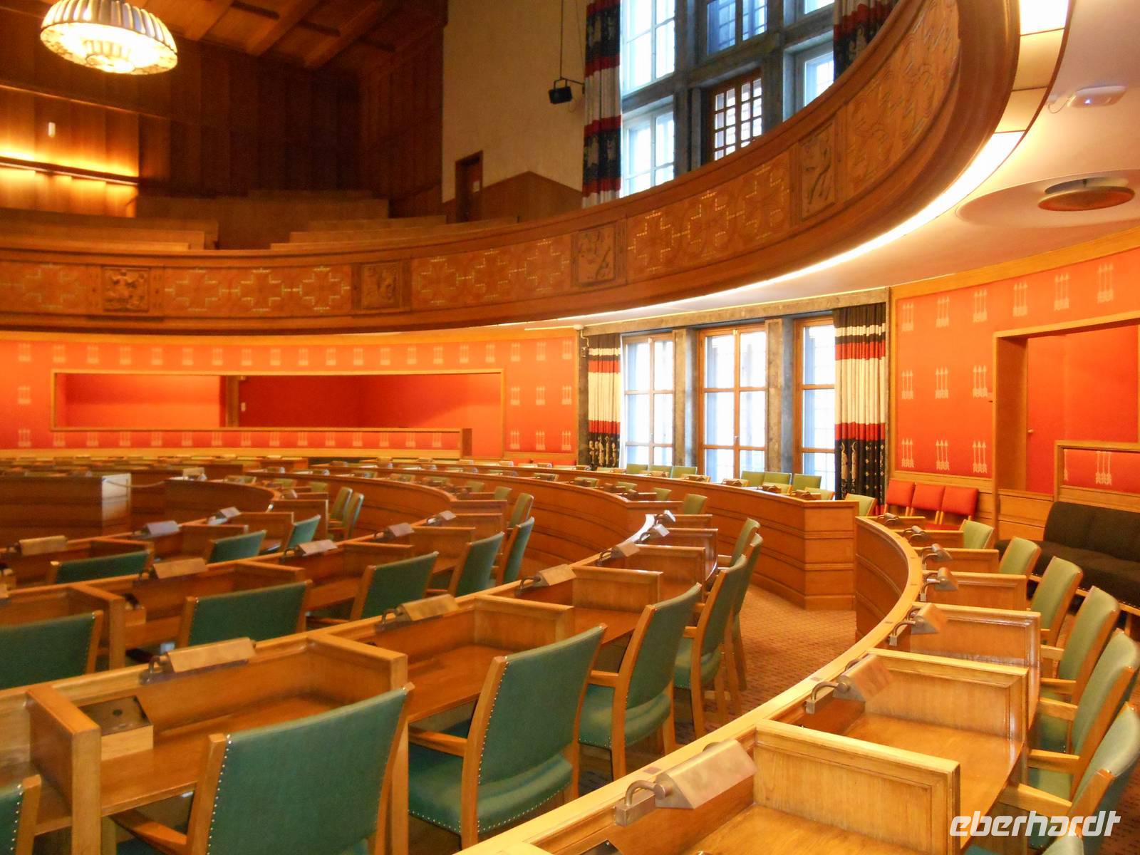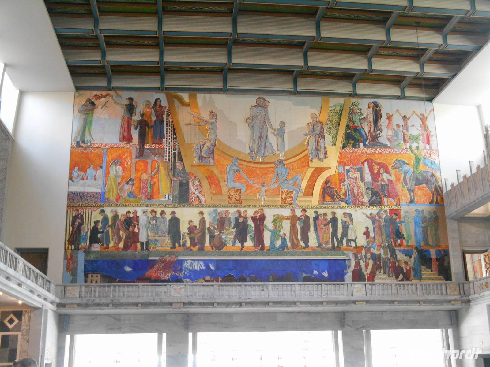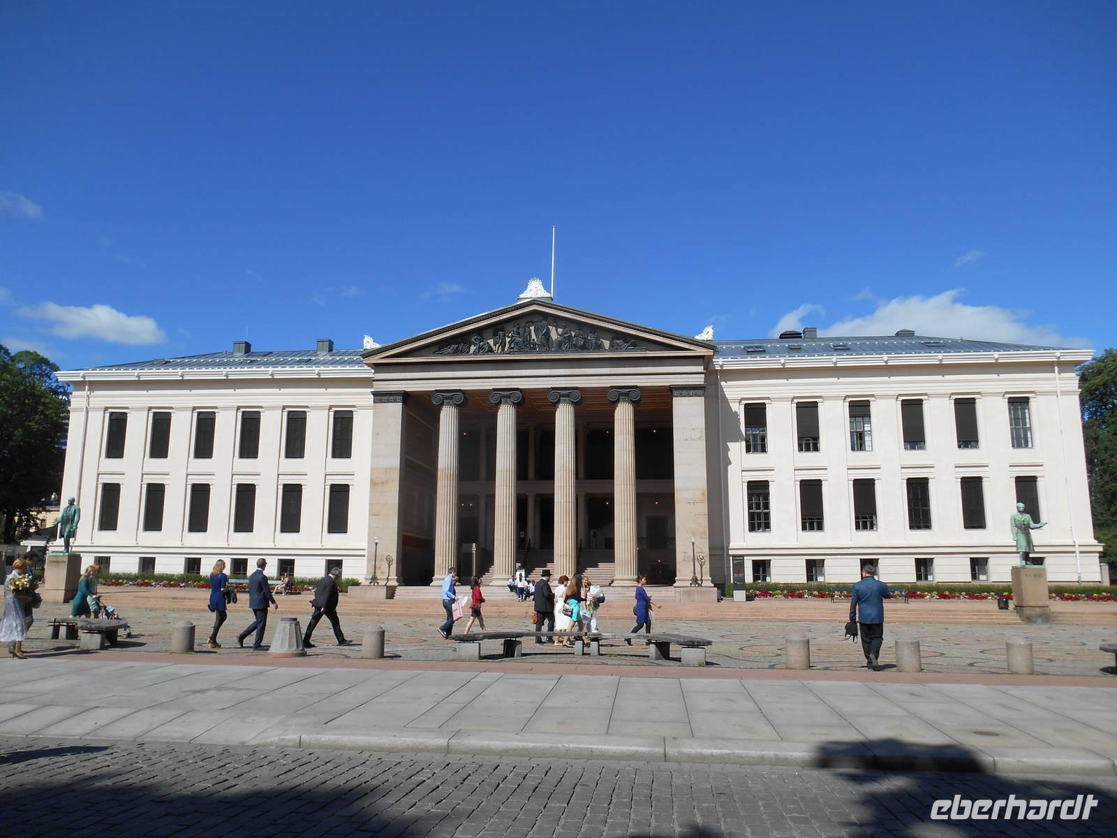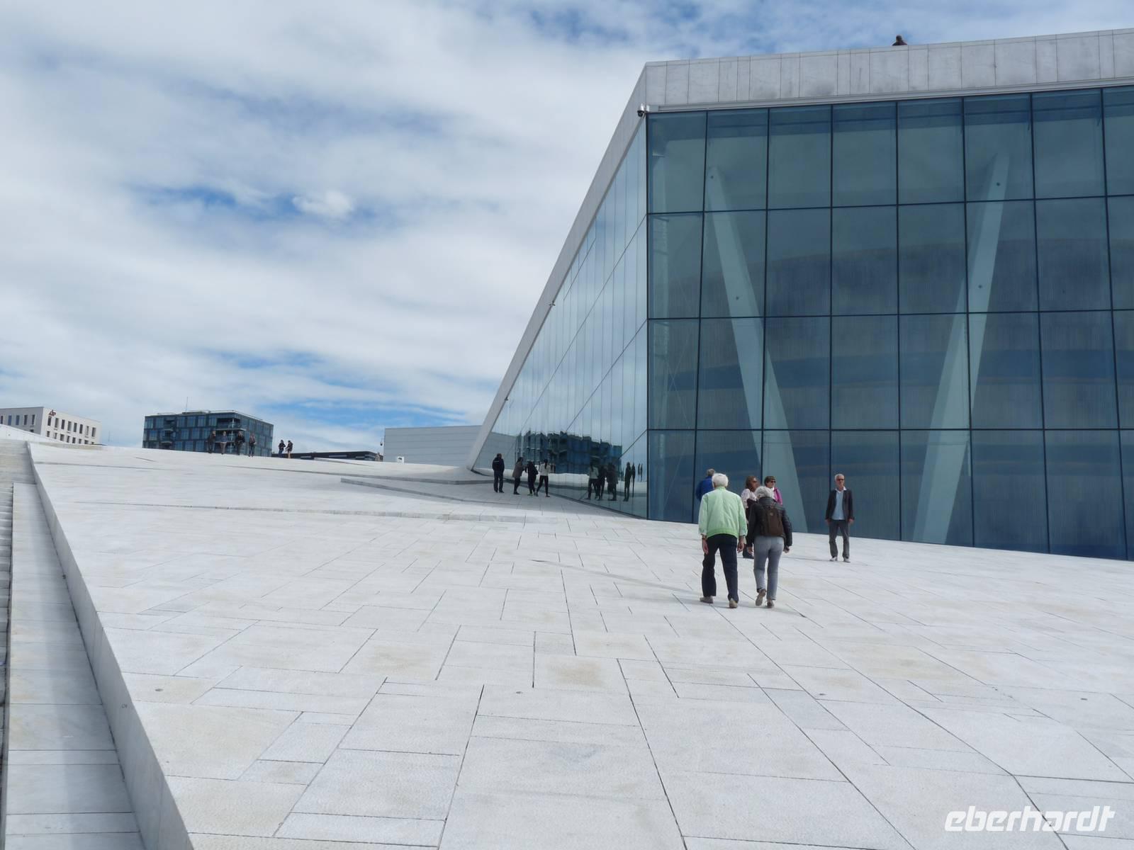 Am Morgen setzten wir unsere Reise durch das fruchtbare Hallingdal fort, welches uns bis zum Nordende des reichlich 40 km langen Krøderen-Sees führte. Vorbei an Hønefoss und entlang des Tyrifjordes erreichten wir am Mittag schließlich Oslo, der Hauptstadt Norwegens. Während einer Führung lernten wir die wichtigsten Sehenswürdigkeiten der Stadt kennen. Wir sahen unter anderem das Neue Opernhaus, das seit April 2008 die Spielstätte der Norwegischen Oper ist. Des Weiteren fuhren wir am Königlichen Palast vorbei und besuchten den berühmten Vigeland-Park. Der norwegische Künstler Gustav Vigeland hat hier Beeindruckendes geschaffen. Wer in Oslo den Skulpturenpark betritt, ist für einen Moment atemlos vor Staunen! Mit dem 32 Hektar großen Areal hat Vigeland sich den Traum vieler Künstler erfüllt - er hat ein Gesamtkunstwerk geschaffen. Die dargestellten Menschen und Tiere sind so lebensecht, so voller Bewegung und Emotion, dass man meint, sie atmen zu sehen! Im Anschluss an die Stadtrundfahrt hatten wir noch etwas Freizeit in der Innenstadt - die meisten Gäste besuchte (wie ich übrigens auch) das Osloer Rathaus. Das Osloer Rathaus habe ich zunächst immer nur vom Bus aus betrachtet und dachte mir, was ist das doch für ein scheußlicher Klotz... Tritt man dann allerdings durch die reich verzierte Eingangstür, vorbei am Empfang, findet man sich in einer riesigen Halle, einem großen Festsaal wieder. Der leere Saal ist sehr imposant, vor allem weil jede Wand mit einem riesigen Gemälde geschmückt ist. So etwas habe ich noch nirgends gesehen! Künstler wie Edvard Munch, Henrik Sørensen oder auch Axel Revold haben sich hier verewigt. Und das Beste - den Saal kennt bestimmt ein jeder (zumindest aus dem Fernsehen), denn hier wird alljährlich am 10. Dezember der Friedensnobelpreis verliehen. Fotos zeigen, wie es hier ausschaut, wenn die Prominenz aus aller Herren Länder plus Medienvertreter zusammen kommen. Hat man sich unten satt gesehen, gibt es ein Stockwerk höher noch weitere Räume zu bewundern, alle ebenfalls reich bemalt. Das Rathaus kann übrigens kostenfrei besichtigt werden - ein echter Geheimtipp! Zum Abschluss des Tages ging es den ca. 400 m über der Stadt gelegenen Holmenkollen hinauf. Hoch über der Stadt Oslo ragt die neue Holmenkollen Skisprunganlage, die modernste Sprungschanze der Welt. Ein imposantes Bauwerk aus Stahl und Beton! Leider hatten wir heute etwas Pech, denn der Schrägaufzug war defekt, der uns eigentlich auf den Schanzenturm bringen sollte! Von dessen höchster Stelle man nämlich einen spektakulären Ausblick auf Oslo und den Oslofjord hat - schade, ließ sich allerdings nicht ändern! In unmittelbarer Nachbarschaft, im „Scandic Holmenkollen Park Hotel", verbrachten wir unsere letzte Nacht auf norwegischen Boden. Zum Abendessen wurde uns auch hier ein skandinavisches Buffet gereicht und danach konnten wir von den Aussichtsterrassen des Hotels nochmals den einzigartigen Blick auf die Stadt und den Oslofjord genießen.