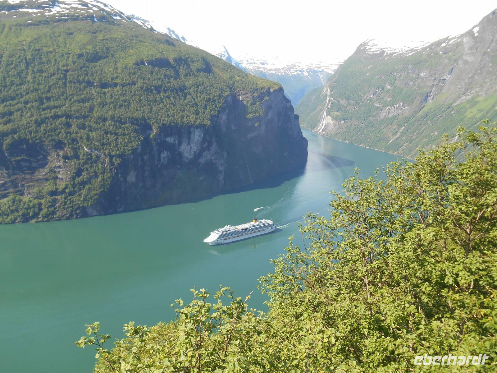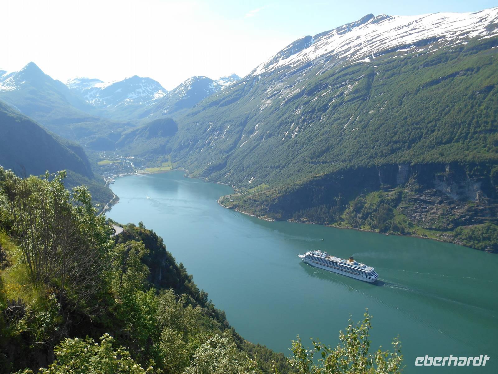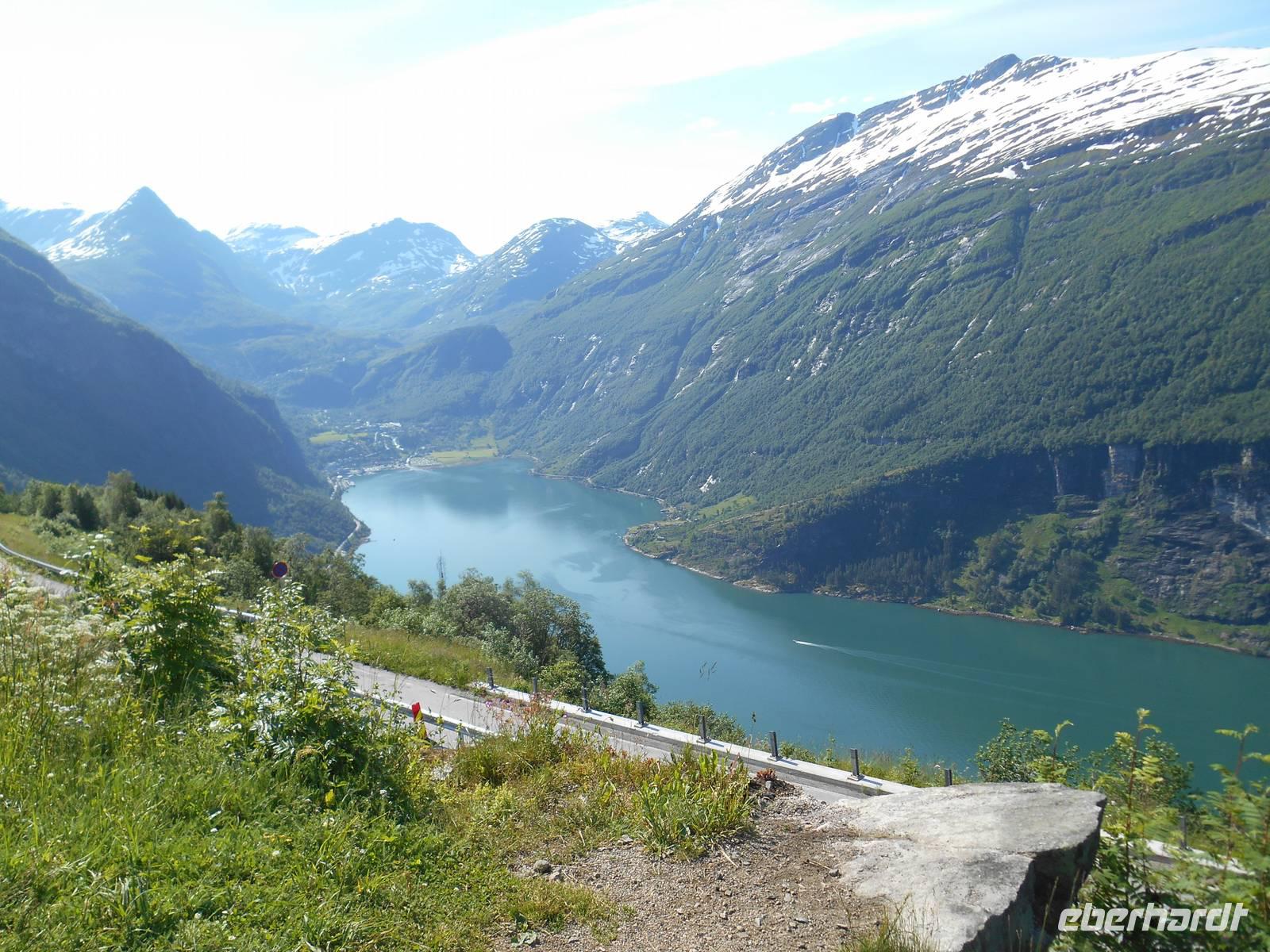 Am Vormittag besuchten wir das hiesige Eisenbahnmuseum, es ist übrigens das einzige Museum dieser Art in ganz Norwegen! Zuerst beschäftigten wir uns mit der Hauptausstellung und begaben uns dort gemeinsam mit dem Museumsführer Roar auf eine kurze Reise durch die norwegische Eisenbahngeschichte. Anschließend wurden wir auf eine Fahrt auf Norwegens kürzeste Eisenbahnstrecke eingeladen - diese ist nur wenige hundert Meter lang, und die Fahrt mit der mit Holzpellets befeuerten Dampflok war ein absoluter Höhepunkt! Auch die prächtigen Bahnhofsgebäude im Museumspark sorgten für eine geschichtsträchtige Eisenbahn-Atmosphäre. Gegen Mittag ging es weiter vorbei am Mjøsa-See, dem mit einer Fläche von 362 km² und einer Länge von 117 km größten See Norwegens, nach Lillehammer. Hier besuchten wir die Schanzenanlagen. Das Wetter war sonnig und damit nutzten einige Gäste unserer Gruppe die Gelegenheit, um mit dem Sessellift zum Schanzenturm hinauf zu fahren. Die Stadt war 1994 Austragungsort der Olympischen Winterspiele und dafür wurden damals zahlreiche neue Sportanlagen errichtet. Am frühen Nachmittag fuhren wir bereits weiter, denn schließlich lag noch ein weiter Weg bis Geiranger vor uns! Wir erlebten nun eine landschaftlich beschauliche Fahrt durch das Gudbrandsdal, das sogenannte „Tal der Täler", das vom Fluss Lågen bestimmt wird. Die Route führte uns ab Otta westwärts durch das Ottatal bis Lom. Hier besuchten wir am späten Nachmittag eine der bedeutendsten noch existierenden Stabkirchen Norwegens. Wer ist nicht fasziniert, wenn er vor einer alten, völlig aus Holz gebauten Stabkirche steht, deren Giebeldächer steil übereinander geschichtet sind. Aus den Giebeln weisen oft stilisierte Drachenköpfe, die eher an Asien erinnern, in alle Himmelsrichtungen. Von den einst angeblich fast 1.000 Stabkirchen sind keine dreißig mehr erhalten. Noch Mitte des 19. Jahrhunderts fehlte den Gemeinden in Norwegen jedes Verständnis über den Wert der alten Gebäude, die in großer Zahl abgerissen wurden, zumal sie auch zu klein geworden waren. Nach einer weiteren landschaftlich sehr reizvollen Fahrt kamen wir am Abend im Hotel „Geiranger" in Geiranger an - der Blick von hier auf den Fjord ist absolut phantastisch! Der Geirangerfjord ist immerhin etwa 16 Kilometer lang und das Aushängeschild des norwegischen Tourismus schlechthin. Ein langer, aber sehr erlebnisreicher Tag ging hier zu Ende.