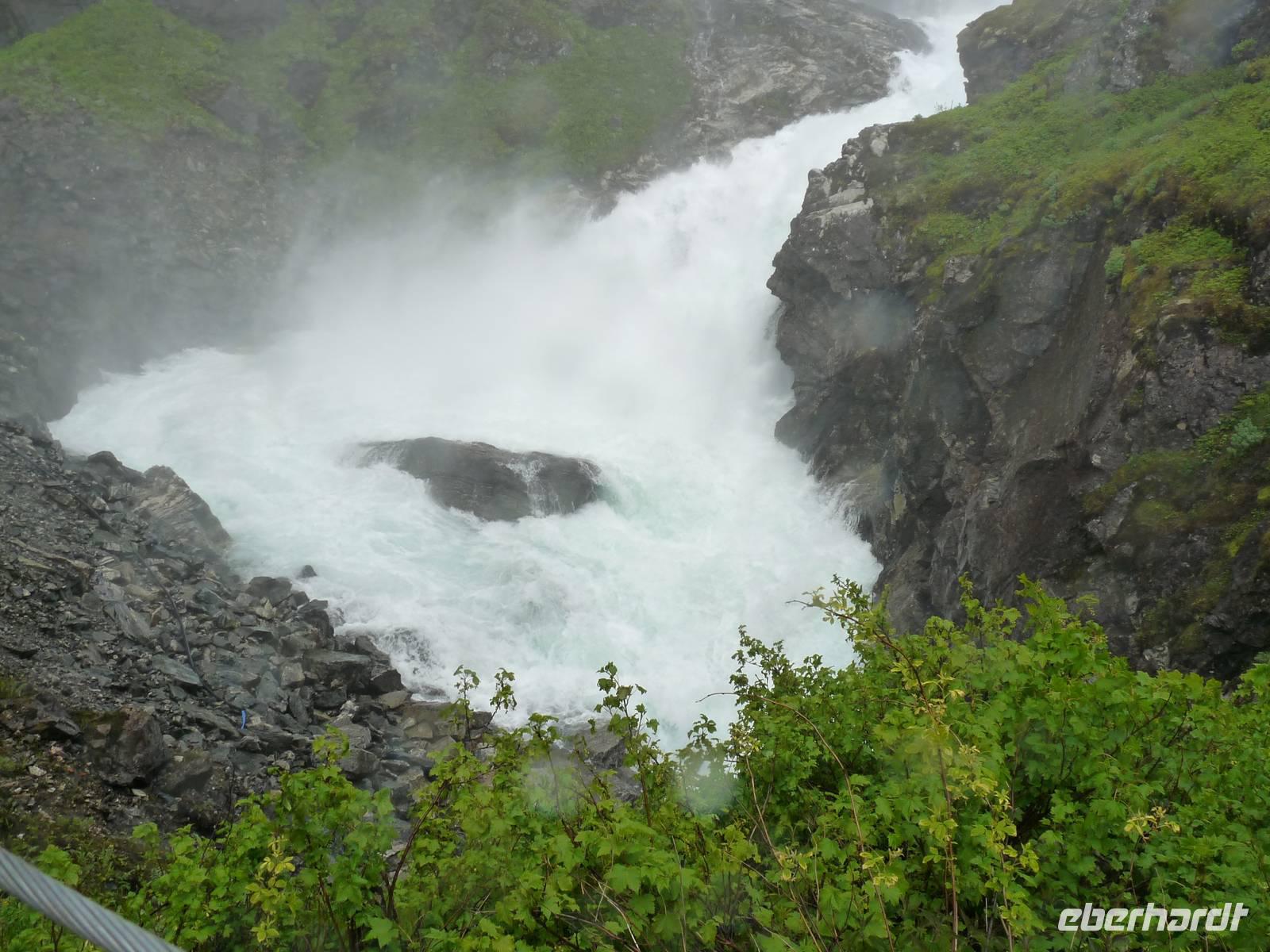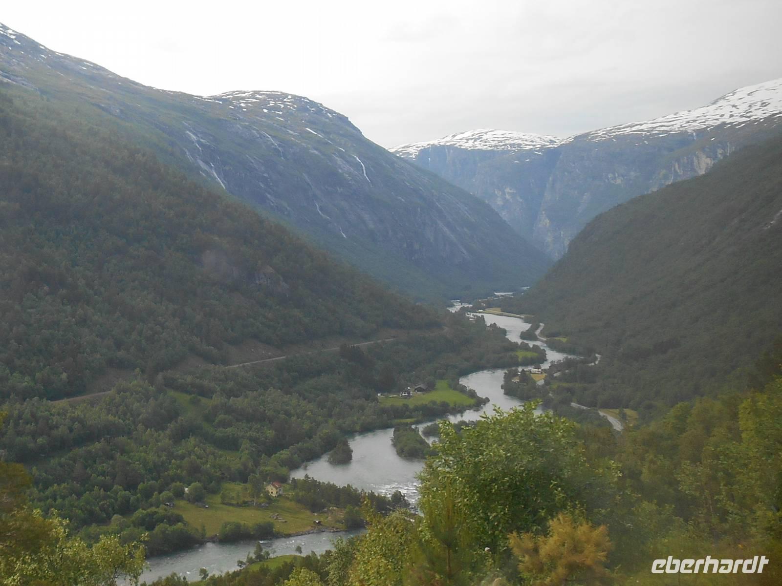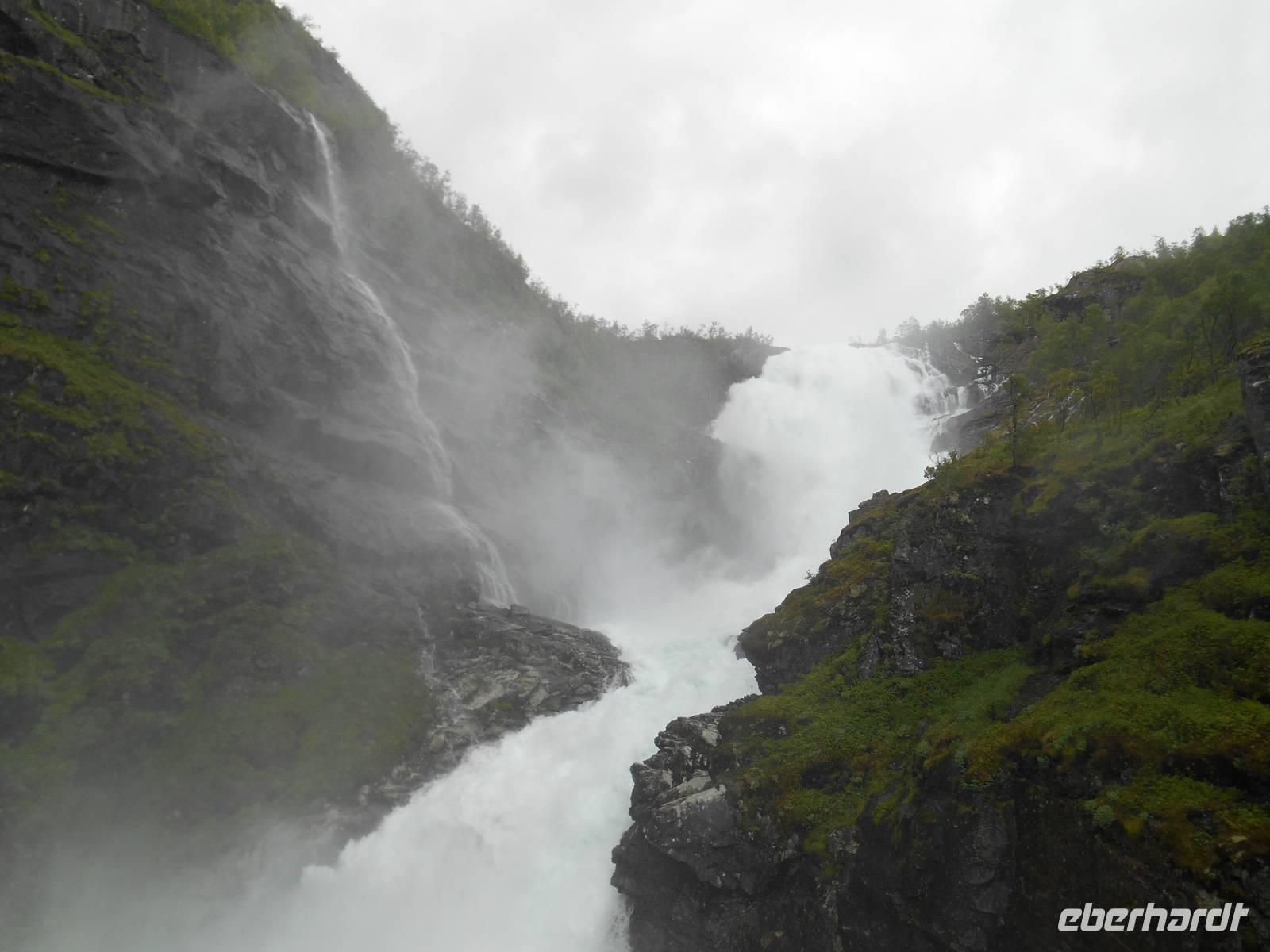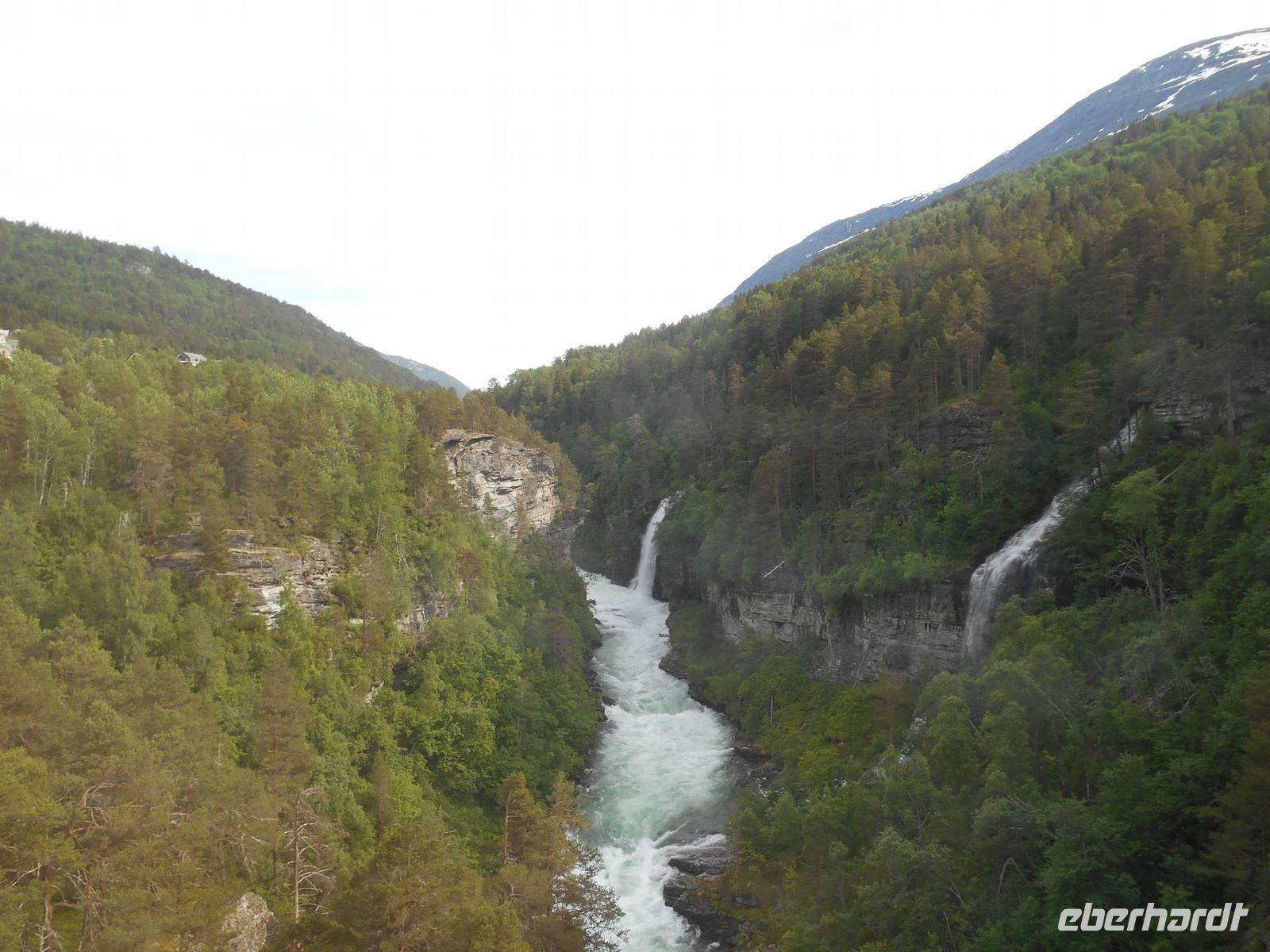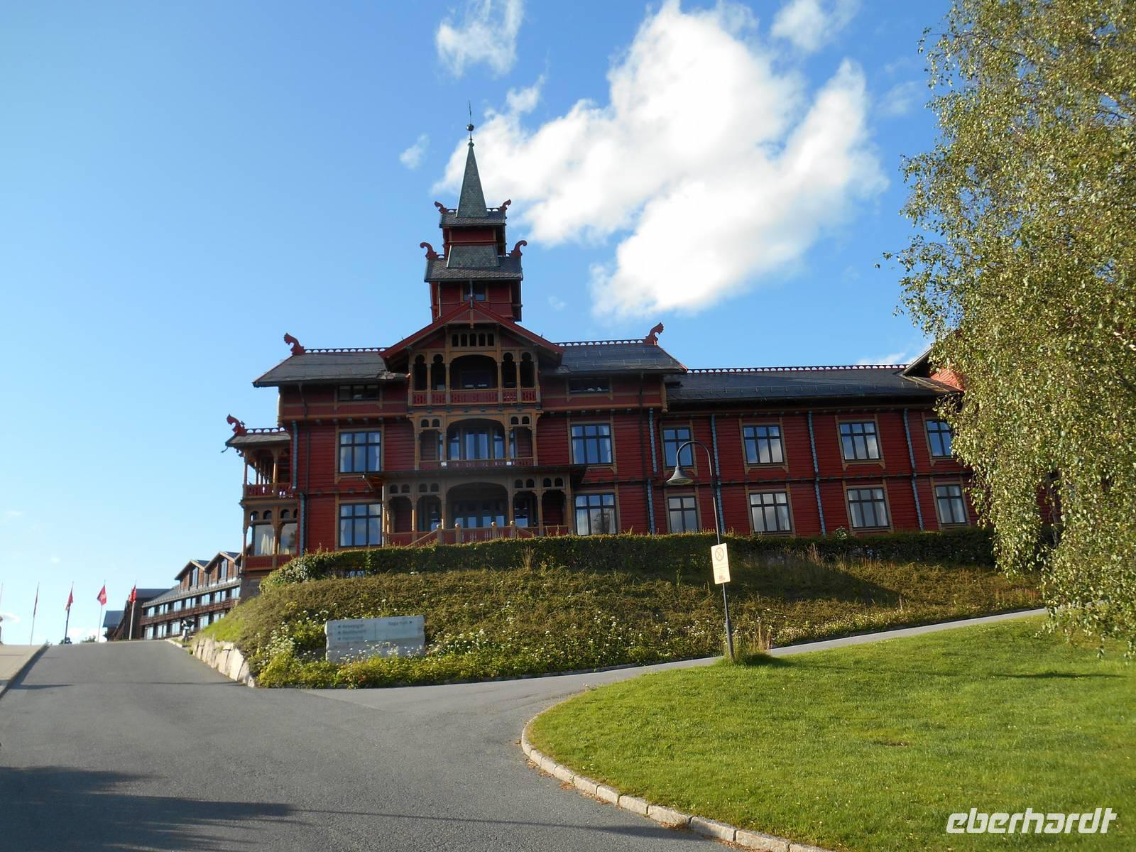 Nach einer schönen Zeit in Bergen ging es für uns auch schon wieder weiter. Eine erste kleine Pause legten wir heute kurz hinter Voss am Wasserfall Twindefossen ein, einem prächtigen Kaskaden-Wasserfall direkt am Wegesrand! Wir setzten unsere Fahrt mit dem Bus durch das bizarre Næroytal fort und erreichten schließlich Gudvangen - hier verabschiedeten wir uns von unserem Bus mitsamt Buschauffeur Ingo, denn den restlichen Tag stiegen wir komplett auf Schiff und Bahn um! Ingo fuhr allein auf dem Landweg nach Geilo und würde uns später am dortigen Bahnhof erwarten. Von Gudvangen aus unternahmen wir eine ca. 2-stündige eindrucksvolle Schifffahrt durch den von steilen Felswänden umgebenen Næroy- und Aurlandsfjord. Wir erreichten Flåm, um dort unsere Mittagspause zu verbringen. Ein Besuch im Flåmsbahn-Museum im alten Bahnhof von Flåm rundete unseren hiesigen Aufenthalt ab. Hier erfuhren wir noch einiges mehr über die Geschichte der Flåmbahn und die technologische Entwicklung, das Alltagsleben in Flåm und Grundsätzliches über den norwegischen Eisenbahnbetrieb. Anschießend bestiegen wir in Flåm die Flåmbahn, die als Meisterwerk des Eisenbahnbaus zu den schönsten und abwechslungsreichsten Bahnstrecken Europas zählt. Die Flåmbahn muss man ganz einfach erleben! Es ist eine unvergleichliche Eisenbahnfahrt zwischen dem Bahnhof Flåm tief unten am äußersten Zipfel des Aurlandsfjords und Myrdal hoch oben im Gebirge an der Bahnlinie Oslo-Bergen. Nirgendwo auf der Welt gibt es eine so steile normalspurige Reibungsbahn wie die Flåmbahn. Der Höhenunterschied beträgt 865 m. Die Bauarbeiten für die Flåmbahn begannen im Jahr 1923 und 1940 wurde die Strecke - vorläufig für dampfbetriebene Züge - freigegeben. Mit der Elektrifizierung im Jahr 1944 wurde die lange Bauzeit schließlich zu Ende gebracht. Die Gleise mussten in starkem Gefälle und in scharfen Kurven verlegt werden, damit sich die Züge die steilen Abhänge hoch- und niederschlängeln können. Fast 80% der Bahngleise haben einen Neigungsgrad von 55 Promille. Der Zug benötigte für die insgesamt ca. 20 Kilometer lange Strecke von Flåm nach Myrdal ungefähr eine Stunde. Besonders überwältigend ist der sagenumwogene Wasserfall Kjosfossen direkt an der Bahnstrecke, wo wir einen Fotostopp einlegten - hier rauscht das Wasser nämlich 93 Meter im freien Fall hinunter und wir konnten ganz dicht heran; man sollte allerdings aufpassen, dass die Kamera nicht zu nass wird! Hier erschienen sogar Feengestalten, die während des Haltes einen Tanz am Wasserfall aufführten. Die Darstellerinnen sind Studentinnen der norwegischen Ballettschule - sehr beeindruckend! Ab Myrdal ging es dann weiter mit der berühmten Bergenbahn. In diversen internationalen Bewertungen wird die Zugfahrt auf der Strecke zwischen Bergen und Oslo als das spannendste und schönste Eisenbahnerlebnis der Welt beschrieben. In ganz Europa gibt es keine höher gelegene städteverbindende Bahnstrecke als die Bergenbahn. Auf ihrem Weg zwischen den beiden größten norwegischen Städten schlängelt sich die Strecke durch atemberaubende Landschaften. Am eindrucksvollsten ist der Abschnitt, der über die Hardangervidda, Europas höchst gelegene Hochebene, führt. Der Bahnhof Finse ist mit 1.222 Metern über dem Meeresspiegel der höchste Punkt der gesamten Strecke. Die Bergenbahn ist bei Touristen und Pendlern gleichermaßen beliebt. Da sie unterwegs in mehreren Skiorten hält, sind ihre Züge nicht nur im Sommer, sondern auch im Winter immer sehr gut ausgelastet. Die gesamte Fahrt zwischen Bergen und Oslo dauert ungefähr sieben Stunden, wir erlebten immerhin eine der schönsten Strecken dieser imposanten Bahnreise - nämlich die Fahrt über die Hardangervidda von Myrdal nach Geilo! Die Bauarbeiten an der Strecke begannen im Jahr 1875 und dauerten 34 Jahre. Über 15.000 Arbeiter waren mit dem Bau der Eisenbahnstrecke beschäftigt. Sie mussten jeden der 182 Tunnel mühsam von Hand durch das Felsgestein meißeln. Im Jahr 2009 feierte die Bergenbahn ihr hundertjähriges Betriebsjubiläum. In Geilo angekommen, erwartete uns unser Buschauffeur Ingo, um gemeinsam mit uns zum nahe von hier gelegenen Hotel zu fahren. Geilo ist ein sowohl im Sommer als auch insbesondere im Winter beliebter Urlaubsort im Hallingdal. Durch sein großes Loipennetz und zahlreiche Pistenanlagen auf einer Höhe von etwa 800 m bis auf 1175 m, aber auch aufgrund der langen Schneesicherheit (in der Regel von Ende November bis Ende April), gilt er als eines der wichtigsten Wintersportzentren in ganz Skandinavien.