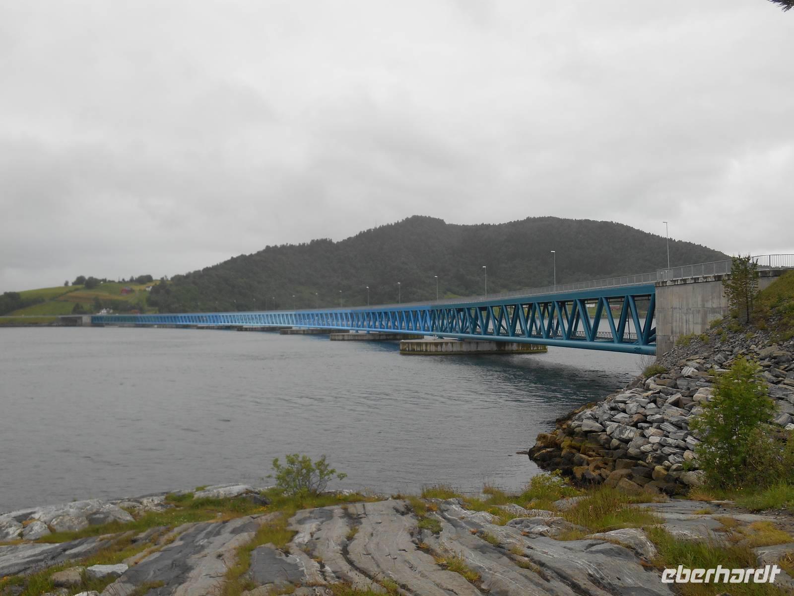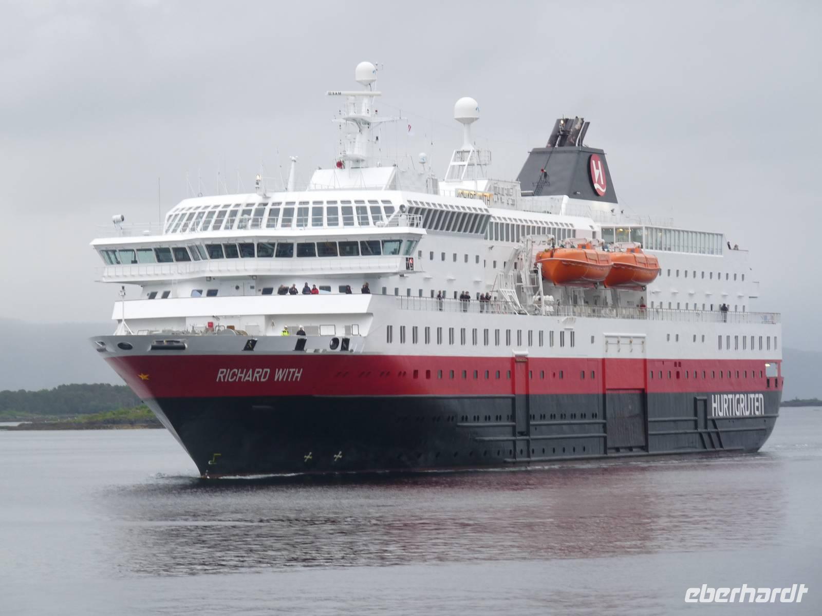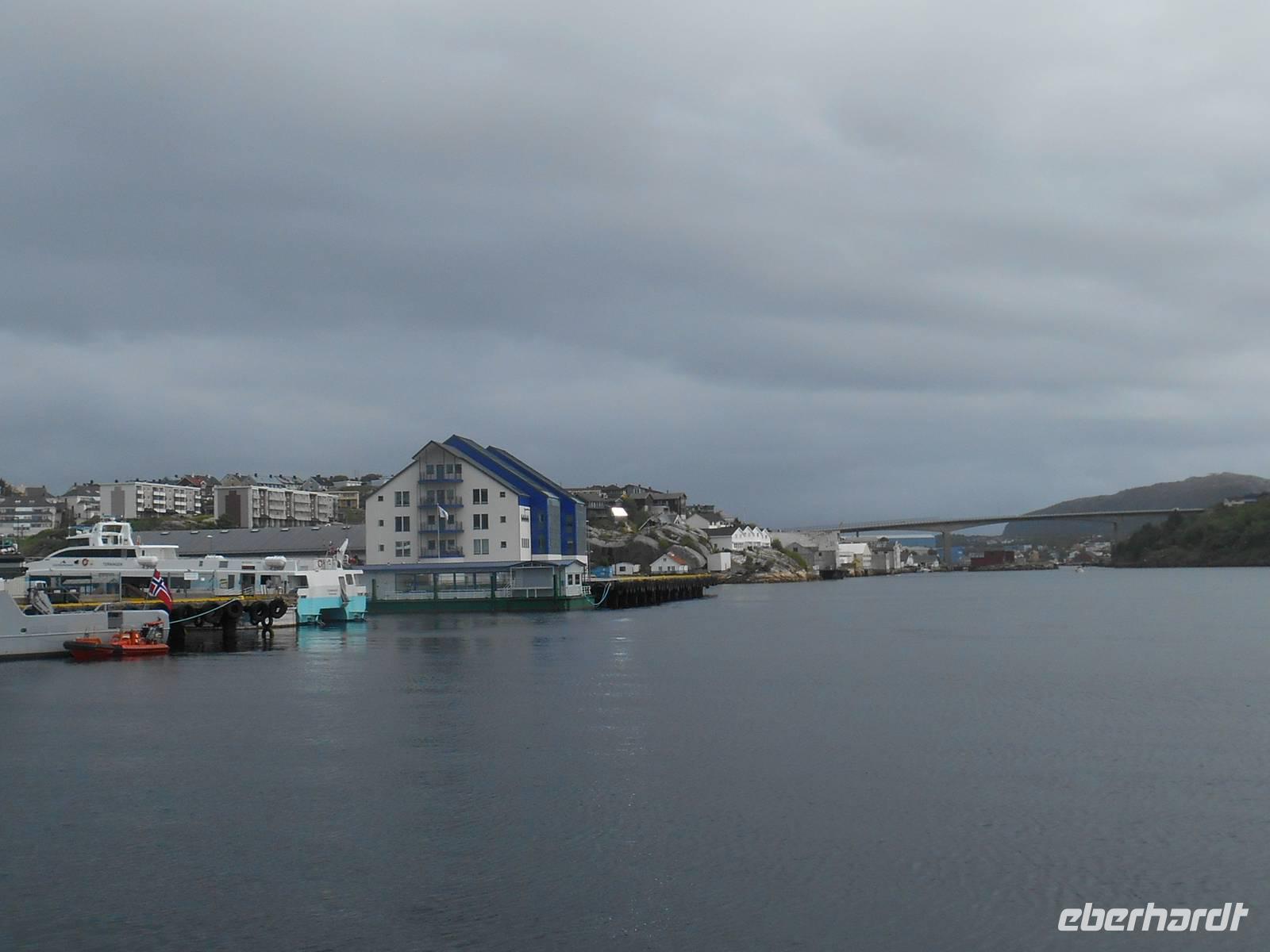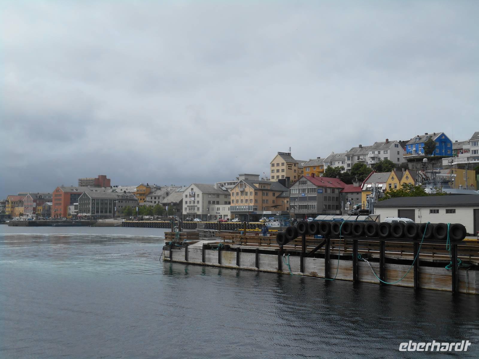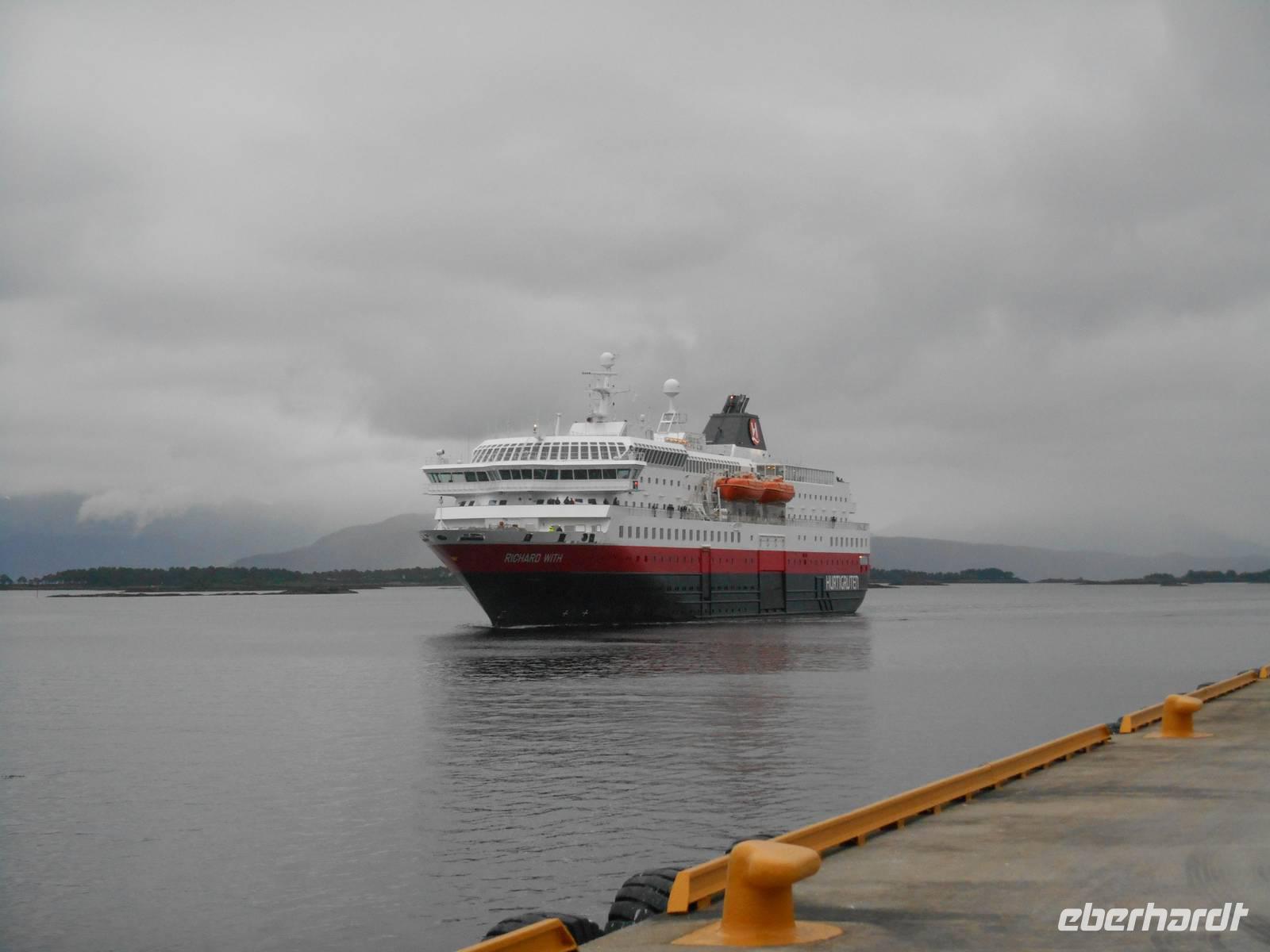 Heute starteten wir wieder gegen 8 Uhr, denn wir hatten volles Programm! Leider regnete es wieder ununterbrochen - es konnte nur besser werden! Am Vormittag stand eine kurze Fährüberfahrt von Halsa nach Kanestraum und damit die Überquerung des Halsafjordes an. Weiter ging es in Richtung Kristiansund und damit natürlich auch über mehrere interessante Brücken, so u. a. der Bergsøysundbrücke. Sie ist eine der wenigen permanenten Pontonbrücken Europas und schwimmt auf sieben Pontons aus Leichtbeton mit einem Tiefgang von vier Metern. Die Brücke ist 845 m lang und wurde 1992 eröffnet. Nach einem weiteren Fotostopp mit Blick auf die imposante Gjemnesund-Hängebrücke kamen wir am Mittag in Kristiansund an, wo wir einen kleinen Spaziergang durch die Stadt unternahmen. Terrassenförmig steigt die auf mehreren Inseln errichte Stadt mit ca. 17.000 Einwohnern vom namensgebenden Sund in die Höhe. Man sagt, Kristiansund sei „auf Klippfisch gebaut". Die „Klippfisch-Metropole" war nämlich lange Zeit der Hauptausfuhrhafen für gesalzenen und getrockneten Kabeljau, der früher auf den Klippen getrocknet wurde - daher der Name. Die bekannteste Skulptur der Stadt, das sog. „Klippfischweib", ist eine Homage an alle Klippfischarbeiter. Das Denkmal war ein Geschenk zum 250. Stadtgeburtstag (1992) und wurde von Ihrer Majestät Königin Sonja enthüllt. Von Kristiansund aus setzten wir unsere Fahrt durch den Atlantiktunnel, einem im Dezember 2009 eröffneten und 5.469 Meter langen unterseeischen Straßentunnel (größte Tiefe 243 Meter!), fort. Plötzlich waren wir auf der Insel Averøy, einer der größten Fischereigemeinden Norwegens in einer traumhaft schönen Lage am Meer. Die Küste ist von unzähligen Inseln, Holmen und Schären geprägt. Nun erwartete uns ein weiterer Höhepunkt unserer Reise - die Fahrt auf der Atlantikstraße! Die Strecke wurde 2005 zum Bauwerk des Jahrhunderts in Norwegen gekürt. Dies ist eine einzigartige Straße, die uns bis ans offene Meer führte. Die etwa 8 Kilometer lange Strecke mit gigantischen Brücken und zahlreichen Dämmen wurde 1989 eröffnet und verbindet die Insel Averøy mit dem Festland. Am späten Nachmittag erreichten wir Molde, unser heutiges Etappenziel. Dort angekommen, führte uns der Weg vorerst zum Varden, dem 407 Meter hohen Hausberg von Molde. Hier oben konnten wir das bekannte „Moldepanorama" genießen, denn man hat einen herrlichen Blick über den Fjord und im „Normalfall" auch auf die schneebedeckten Gipfel der Romsdaler Alpen - wir hatten übrigens leider kein großes Glück mit der Sicht, denn die Berge waren kaum auszumachen! Echt schade! Bevor wir unser heutiges Abendessen im hiesigen „EGON-Restaurant" einnahmen, unternahmen einige Gäste noch einen ausgiebigen Spaziergang durch die sogenannte „Stadt der Rosen". Aufgrund des günstigen Lokalklimas können hier nämlich etliche Arten von Rosen besonders üppig wachsen. Der Hurtigruten-Kai von Molde war um 21 Uhr auch der Ausgangspunkt unserer Mini-Kreuzfahrt auf einem der Postschiffe! Unser Schiff, die MS „Richard With", wurde nach dem berühmten norwegischen Kapitän und Hurtigruten-Gründer benannt. Ihm ist es zu verdanken, dass die legendäre Postschifflinie zu einem wesentlichen Bestandteil des norwegischen Küstenlebens geworden ist. Die „Richard With" nahm ihren Dienst 1993 auf, genau ein Jahrhundert nach der ersten Hurtigruten Fahrt. Nachdem wir alle unsere Kabinen bezogen hatten, verbrachten wir die Nacht auf See! Wer Norwegen hautnah erleben will, der sollte unbedingt die Hurtigruten kennenlernen. Es handelt sich dabei um die traditionelle norwegische Postschifflinie, über die seit Ende des 19. Jahrhunderts die Ortschaften der westlichen Küste Norwegens, die etwa 2.700 Kilometer umfasst, miteinander verbunden werden. Zwischen Bergen und Kirkenes kreuzen hier Passagier-, Fracht- und Kreuzfahrtschiffe. Diese Strecke bietet somit eine einmalige Gelegenheit, die gesamte Westküste Norwegens mit all ihren Naturschönheiten kennenzulernen. Fjorde, raue und liebliche Landschaften und die Gastfreundschaft der Menschen machen Hurtigruten heute zu einer echten Touristenattraktion und was einst aus der Not heraus geboren wurde, nämlich auch abgelegene nördliche Landesteile mit dem klimatisch begünstigten Süden zu verbinden, ist inzwischen eine Sehenswürdigkeit. Natürlich erlebten wir auf unserer ca. 17-stündigen Fahrt nur eine kleine Etappe dieser eigentlich 12-tägigen Reise, aber immerhin hat man dadurch einen Eindruck von der sogenannten „Schönsten Seereise der Welt".