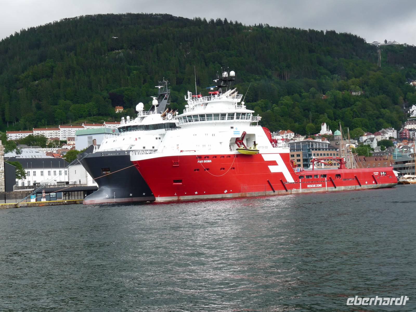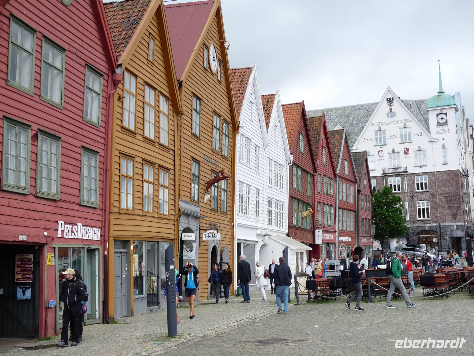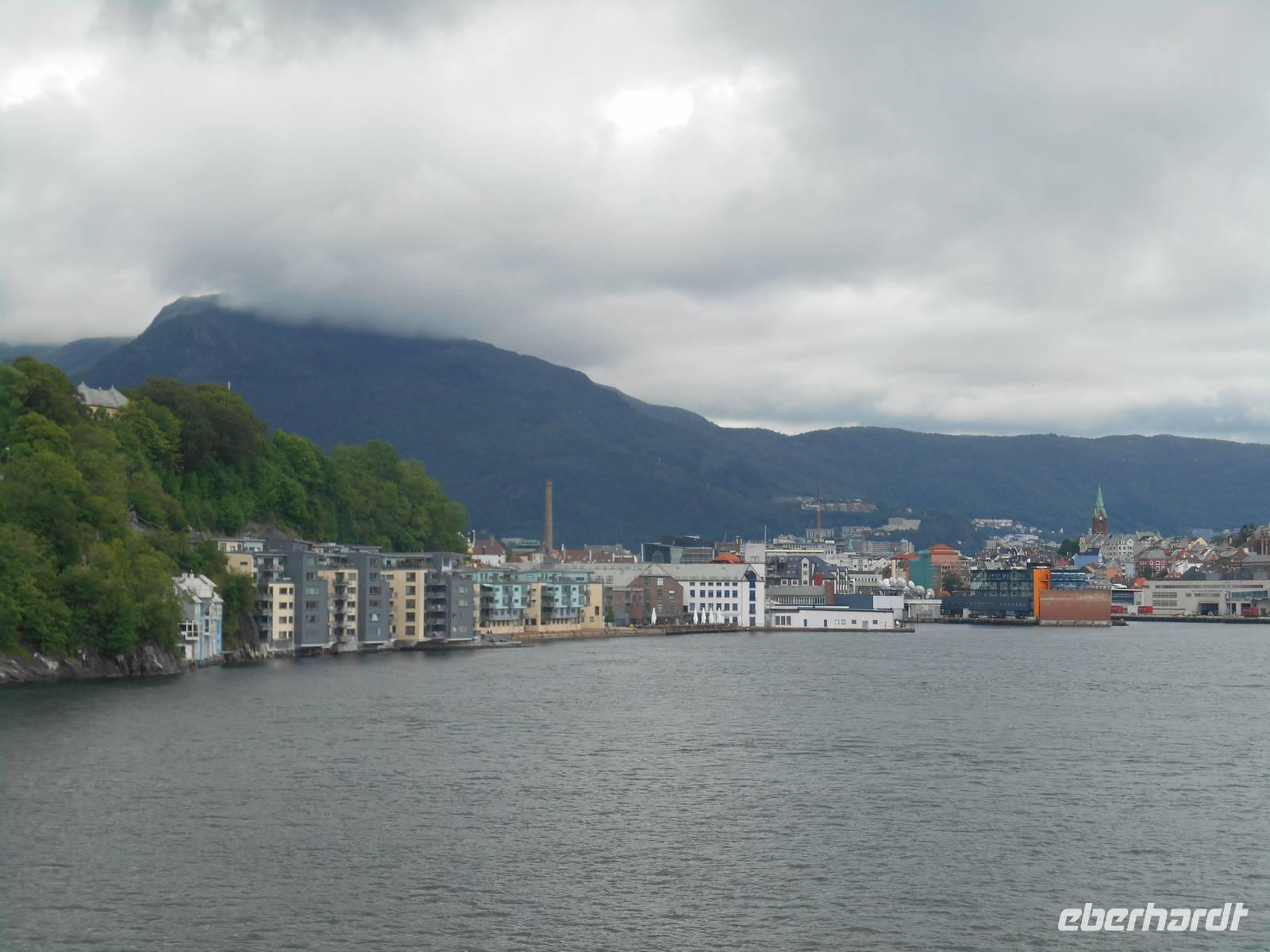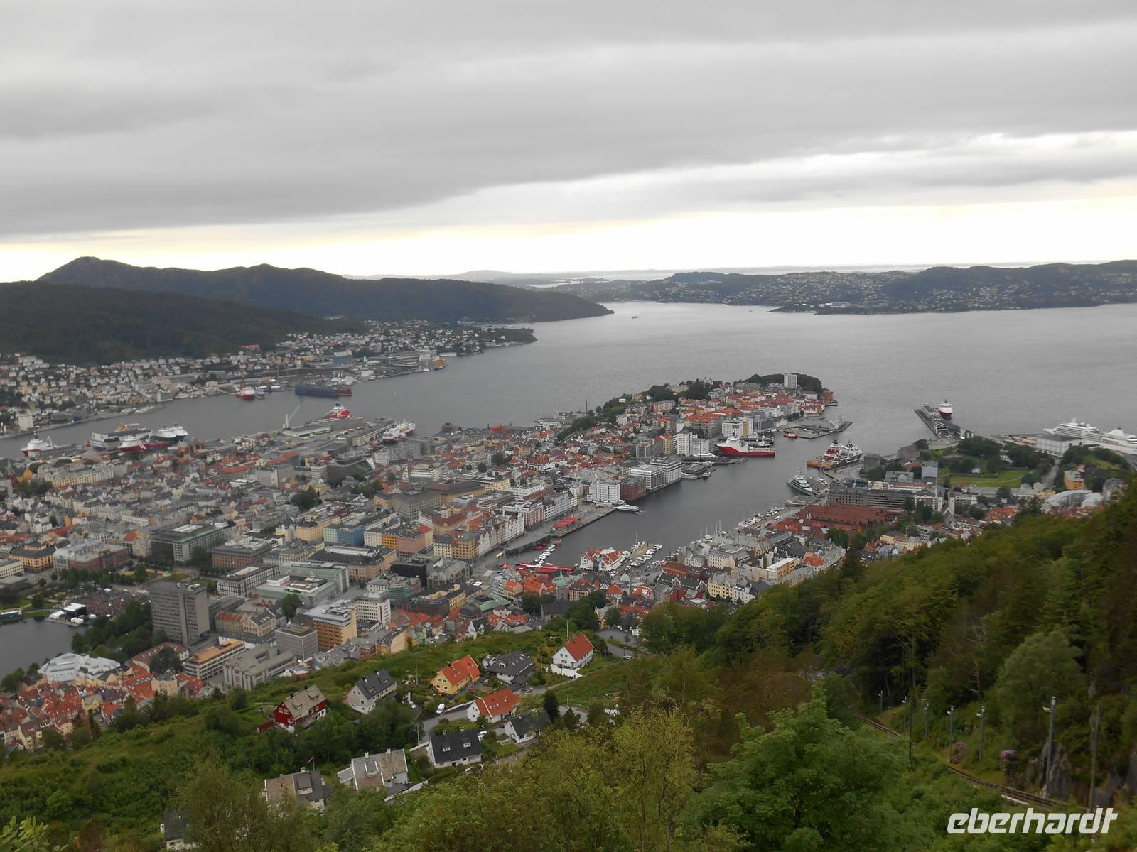 Nach einem reichhaltigen Frühstücksbuffet und einigen erholsamen Stunden an Bord der MS „Richard With", erwartete uns unser Buschauffeur Ingo am Hurtigruten-Terminal in Bergen und sogleich begannen wir am Nachmittag mit unserer etwa 2-stündigen Stadtführung durch Bergen. Seit König Olaf Kyrre im 11. Jahrhundert mit seinen Wikingerschiffen in der Hafenbucht Vågen anlegte und Bergen dort gründete, zieht die Stadt Menschen aus aller Welt an. Viele Besucher kamen und gingen, andere ließen sich in der norwegischen Hafenstadt nieder. Viele Einheimische verließen ihre traute Umgebung und lernten während ihrer Wanderjahre andere Länder, Leute und Sitten kennen, ehe sie zurückkamen. So konnte sich Bergen zu einem Schmelztiegel verschiedener Kulturen und zu „Norwegens internationalster Stadt" entwickeln. Bergen wuchs um den Hafen herum nach und nach zu einer Stadt heran. Handel, Schifffahrt und Handwerk waren ihre Existenzgrundlage. Schon früh wurde Bergen die größte Stadt des Nordens und Norwegens erste Haupt- und Residenzstadt des Königs. Bereits im 14. Jahrhundert war die Stadt so bedeutend geworden, dass die Hanseaten auf Bryggen ein Kontor gründeten, das noch heute zu sehen ist. Nachdem wir interessante Informationen über diese Stadt erhalten hatten, konnten wir anschließend nach individuellen Bedürfnissen bummeln und etwas Freizeit genießen. Alle unsere Gäste nutzten auch die Gelegenheit, mit der einzigen Standseilbahn Skandinaviens zum Berg Fløyen hinauf zu fahren. Vom sogenannten „Dach von Bergen" hat man eine fantastische Aussicht über die Stadt, den Schiffsverkehr, die Fjorde und nicht zuletzt die umliegenden Inseln. Eine Aussicht, die einen beeindruckenden Überblick über die Vielfalt der Stadt und der näheren Umgebung gewährt. Eine Aussicht, die den Blick auf das offene Meer, auf die 50 km nördlich gelegene Insel Fedje sowie auf die südlich gelegenen Inseln der Region Sunnhordaland erlaubt. Bergen machte übrigens heute seinem Ruf als regenreichste Großstadt keine Ehre, denn hier soll es an etwa 250 Tagen im Jahr regnen - denn wir durften hier übrigens einen regenfreien Tag verbringen!