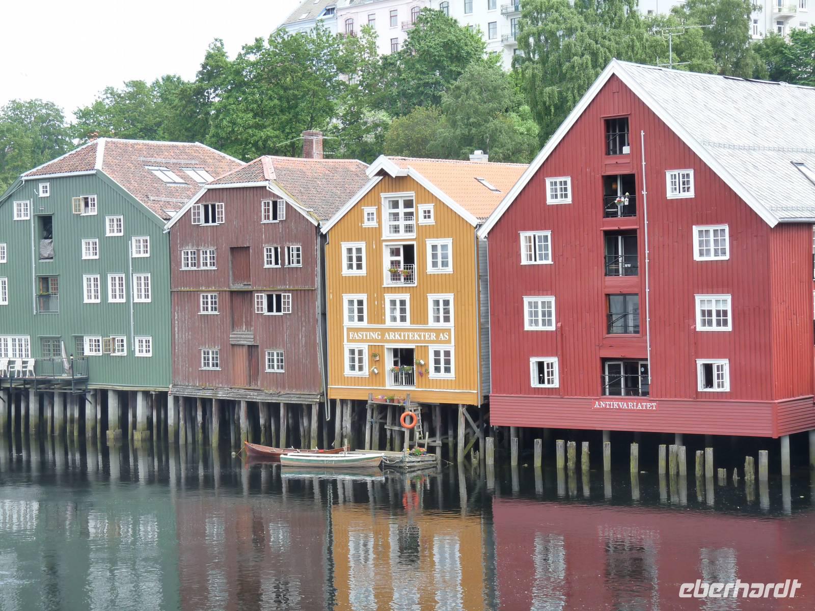Die Landschaft änderte sich heute gleich auf den ersten Kilometern vollständig - jetzt ging es nämlich weiter über das Dovrefjell! Es gilt als eines der unberührtesten Gebiete Norwegens und ist vor allem dafür bekannt, dass es hier noch eine größere Anzahl an Moschusochsen gibt. Der heutige Nationalpark besteht aus zwei Teilen, die durch das tiefe Tal der Driva getrennt werden. Entlang des Tales verläuft die E6, unsere Hauptverkehrsachse zwischen Nord- und Südnorwegen. Früher verlief hier bereits der alte Königsweg, auf dem die norwegischen Könige von Oslo zur Krönung nach Trondheim reisten, und dem auch viele Pilger folgten. Teile des alten Königsweges sind heute restauriert und für Wanderer erschlossen. Am späten Vormittag erreichten wir schließlich Trondheim, die drittgrößte Stadt Norwegens. Zuerst besichtigten wir das Wahrzeichen Trondheims, den über dem Grab von St. Olav errichteten Nidarosdom! Er ist das Nationalheiligtum Norwegens. Mit dem Bau wurde 1070 begonnen, die ältesten noch erhaltenen Teile stammen aber aus der Mitte des 12. Jahrhunderts. Im Anschluss an eine durchaus interessante Führung im Dom unternahmen wir eine knapp 2-stündige Stadtrundfahrt in Trondheim. Norwegens erste Hauptstadt wurde schon um 997 vom Wikinger-König Olav Tryggvason gegründet. Obwohl Trondheim eine große Stadt ist, hat sie nichts von ihrem Charme und der Vertrautheit einer kleinen Gemeinde eingebüßt. Trondheim steht für eine Stadt voller Gegensätze - Klosterruinen, beeindruckende Holzbauten, farbenfrohe Kais und eine einzigartige rote Stadtbrücke von 1861. Am Nachmittag erreichten wir das südwestlich von Trondheim gelegene Orkanger. Hier mussten wir uns erst einmal bis zum hiesigen Bahnhof durchfragen - niemand von den Einheimischen wusste etwas vom Bahnhof!!! Ein rettender Anruf im heutigen Hotel war schließlich die Lösung und pünktlich um 16 Uhr konnte somit unsere Fahrt mit der Thamshavnbahn, einer elektrisch betriebenen Schmalspurbahn, beginnen. Auf der ca. 25 km langen Strecke von Bårdshaug nach Løkkken durchfuhren wir kleine, idyllisch gelegene Ortschaften im Orkatal - leider regnete es mittlerweile in Strömen! Der Bau der Thamshavnbahn diente übrigens ursprünglich vorwiegend dem Transport des kupferhaltigen Schwefelkieses aus der Grube in Løkken Verk zum Hafen in Orkanger am Orkangerfjord. Da sie ein praktisches Beförderungsmittel war, wurde sie auch bis 1963 für den Personenverkehr eingesetzt. 1975 wurde die Grube geschlossen, der Bahnverkehr ruhte ganz und 1984 begann auf einem Teilstück der Verkehr als Museumszug. In Løkken Verk besuchten wir nach unserer Ankunft noch kurz das Orkla Industriemuseum, bevor wir zurück nach Bårdshaug fuhren, wo wir heute im Hotel „Bårdshaug Herregård", einem traditionellen ehemaligen Herrenhaus aus dem Jahr 1902, übernachteten.