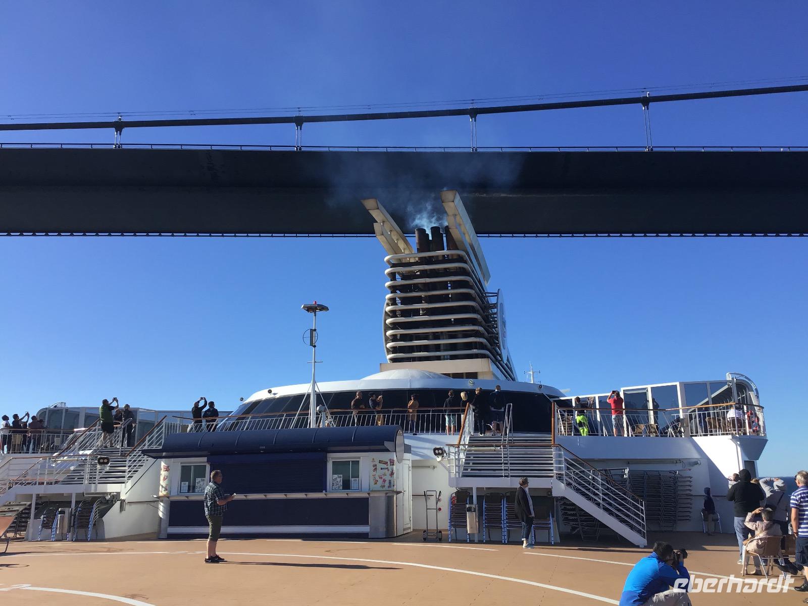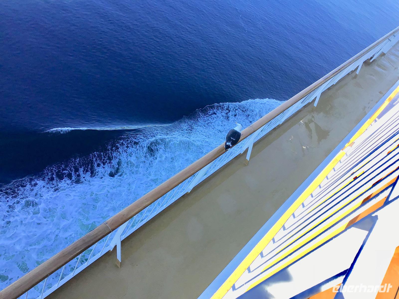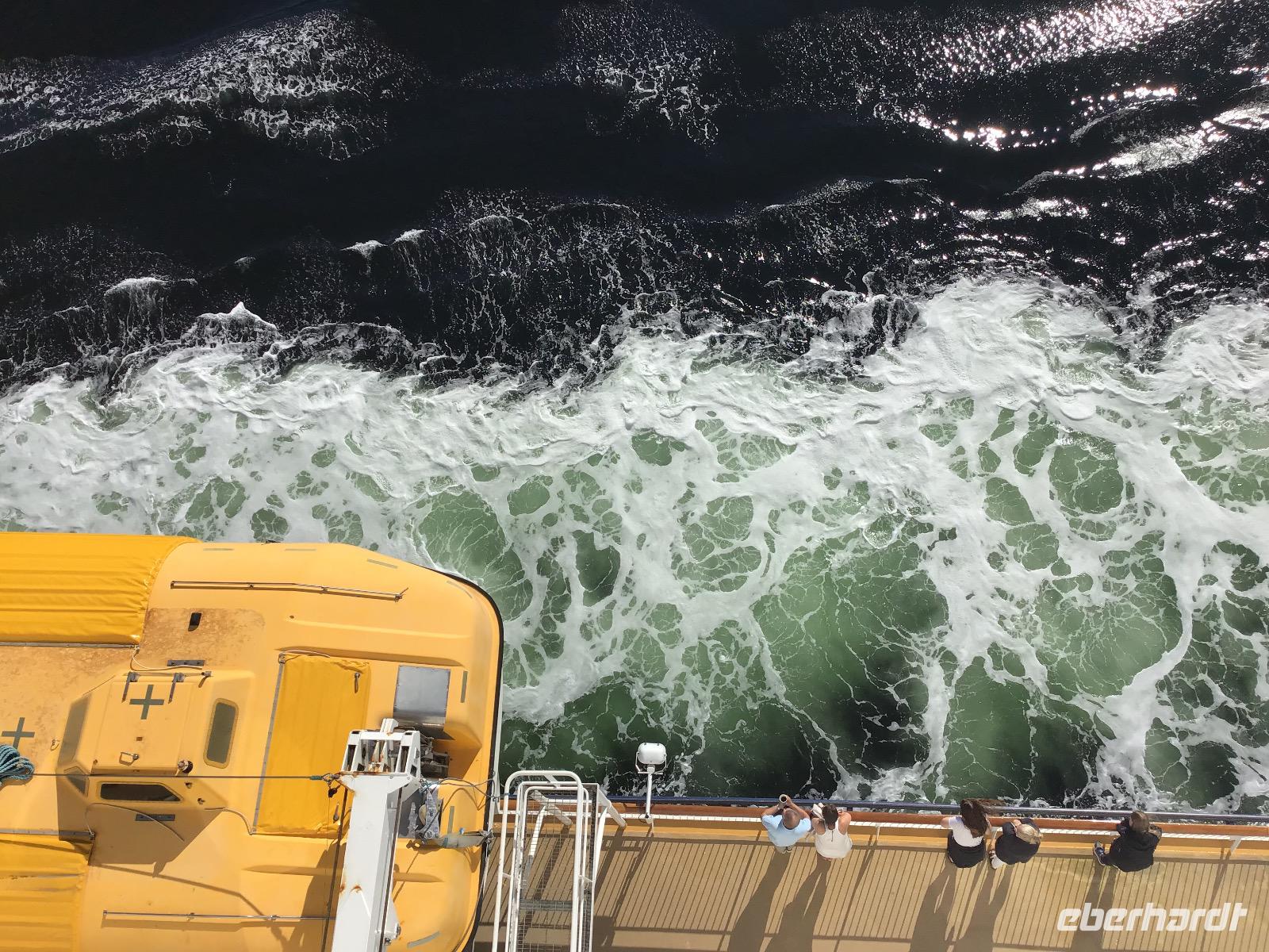 unsere Kabinen beziehen. Pünktlich um 14 Uhr läuft die Fähre aus. Als Fähre kann man die Color Magic eigentlich nicht bezeichnen, obwohl sie es defacto ist. Prunkvoll erwartet uns Deck 7 mit diversen Restaurants und Einkaufsmöglichkeiten. Ganz oben, auf Deck 15, kann man