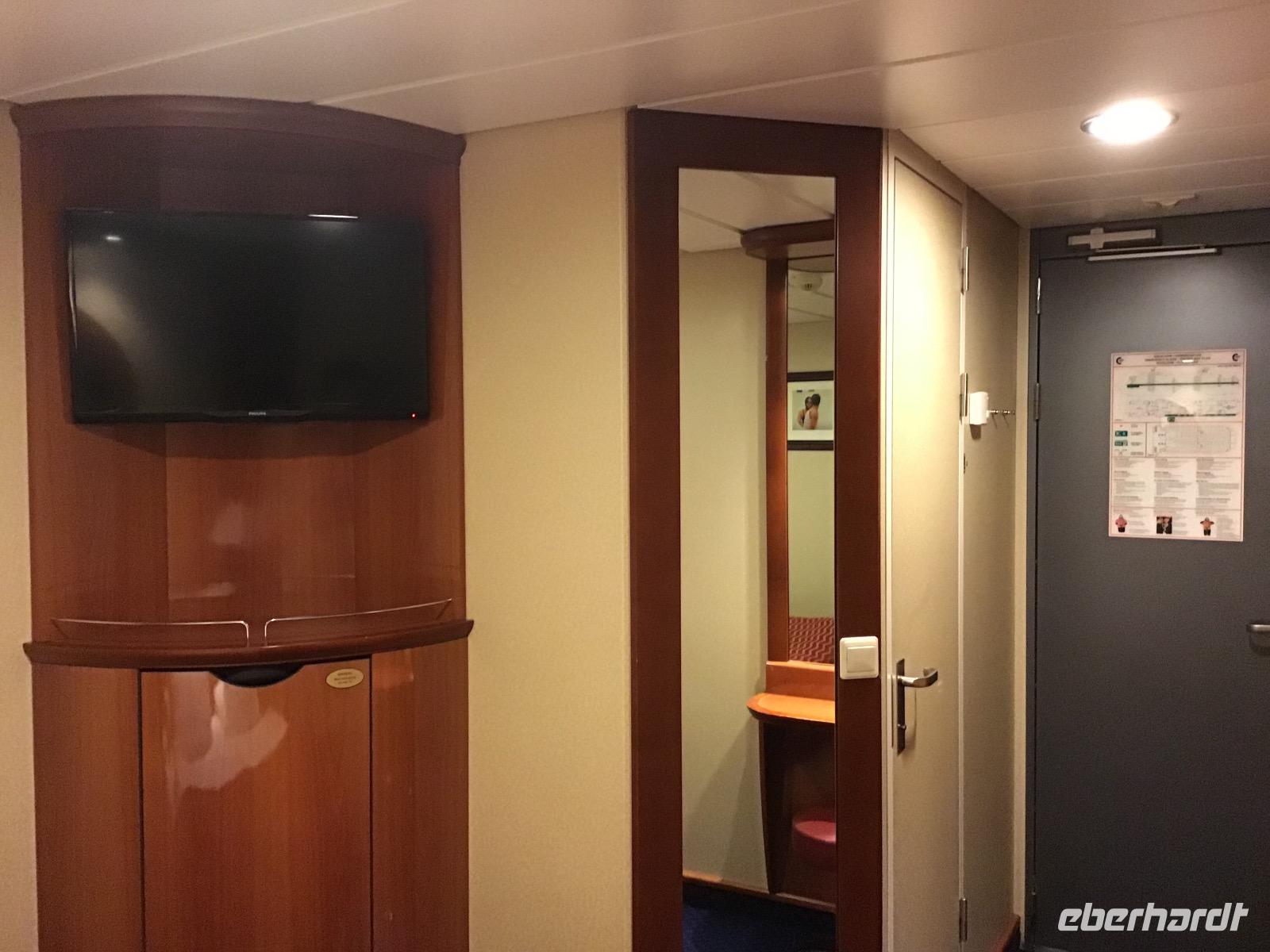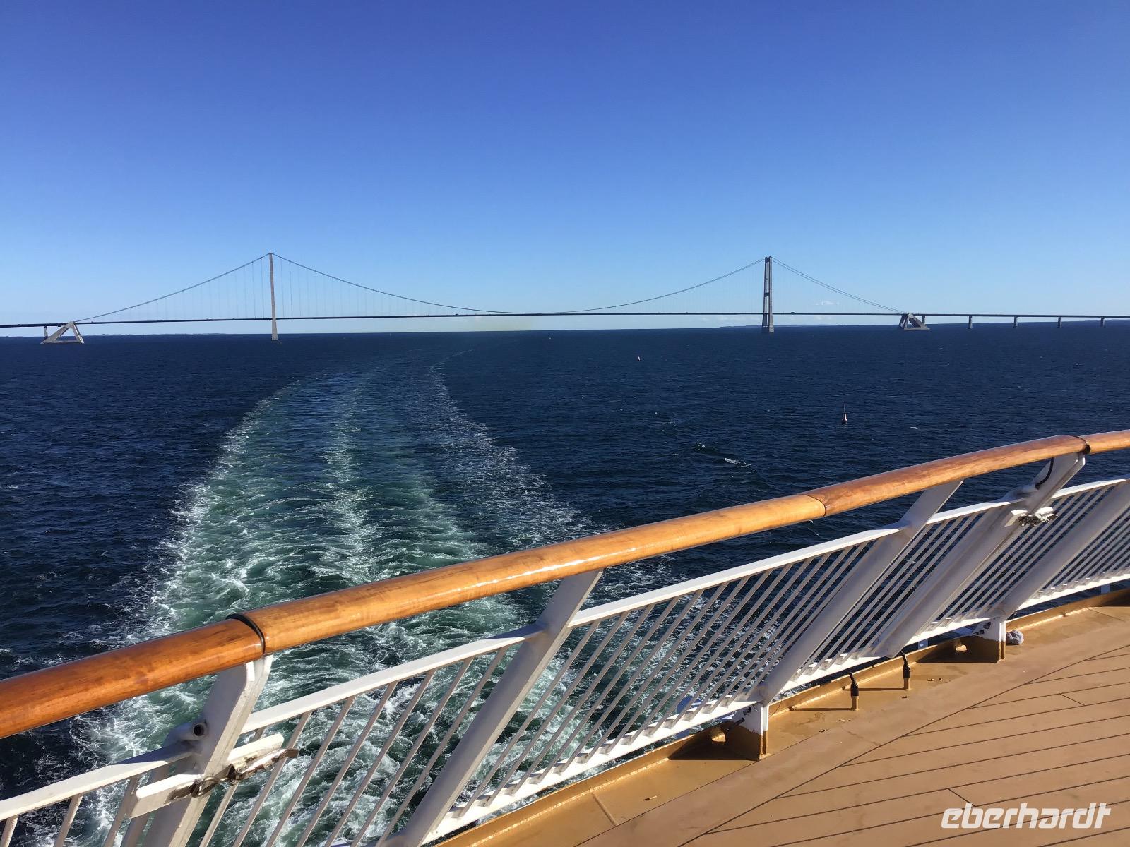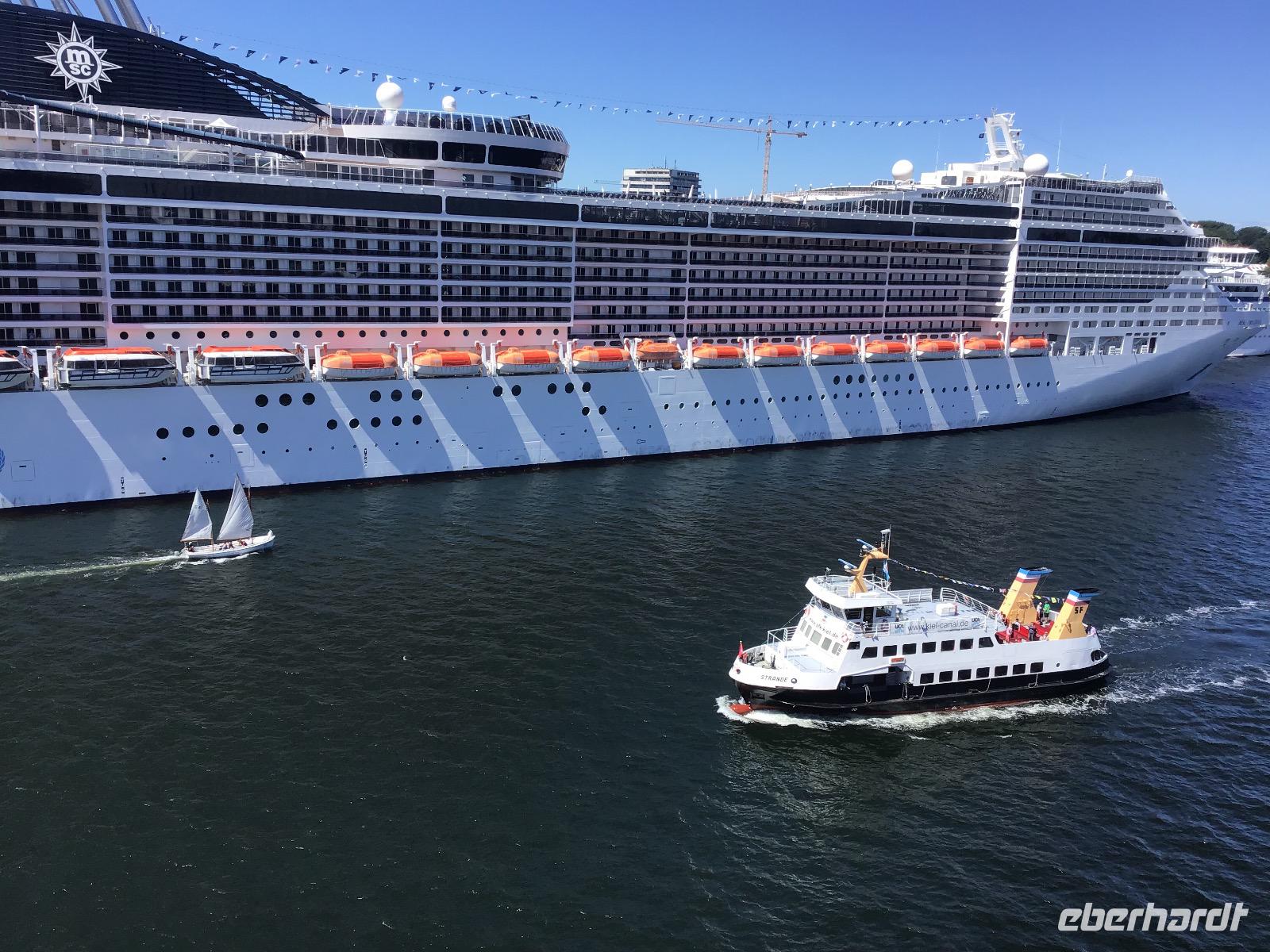 unsere Kabinen beziehen. Pünktlich um 14 Uhr läuft die Fähre aus. Als Fähre kann man die Color Magic eigentlich nicht bezeichnen, obwohl sie es defacto ist. Prunkvoll erwartet uns Deck 7 mit diversen Restaurants und Einkaufsmöglichkeiten. Ganz oben, auf Deck 15, kann man