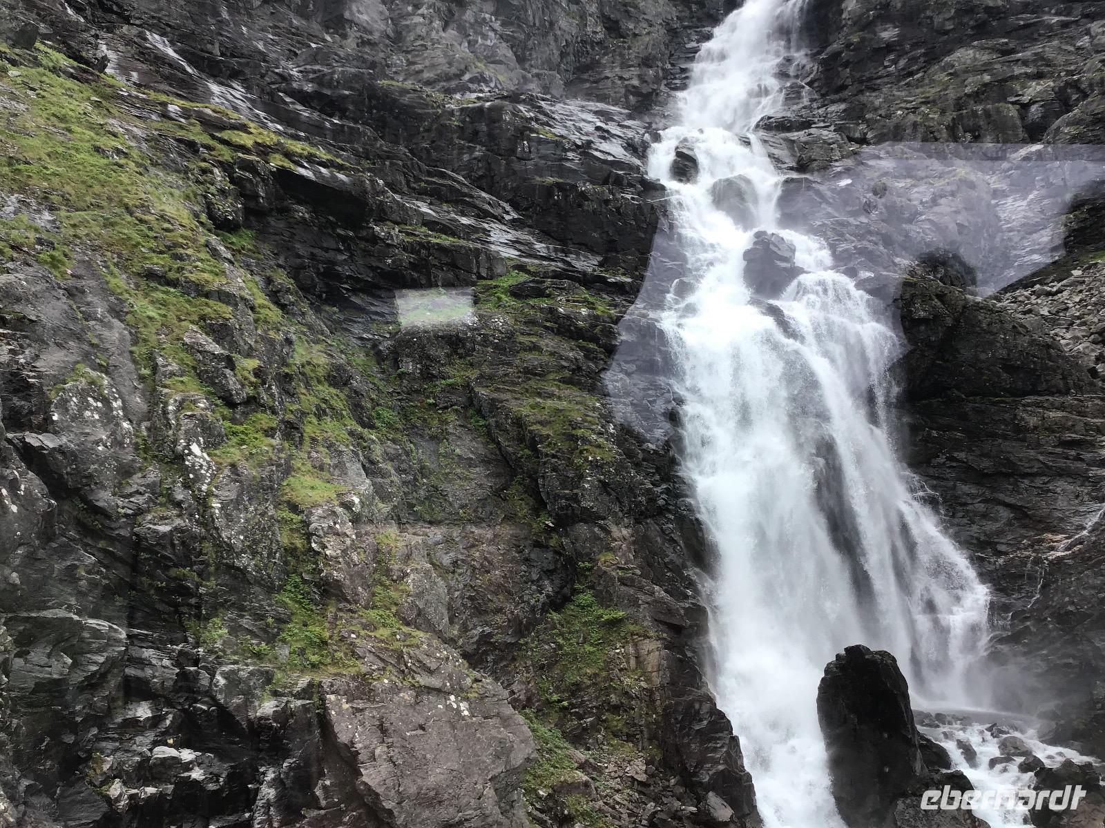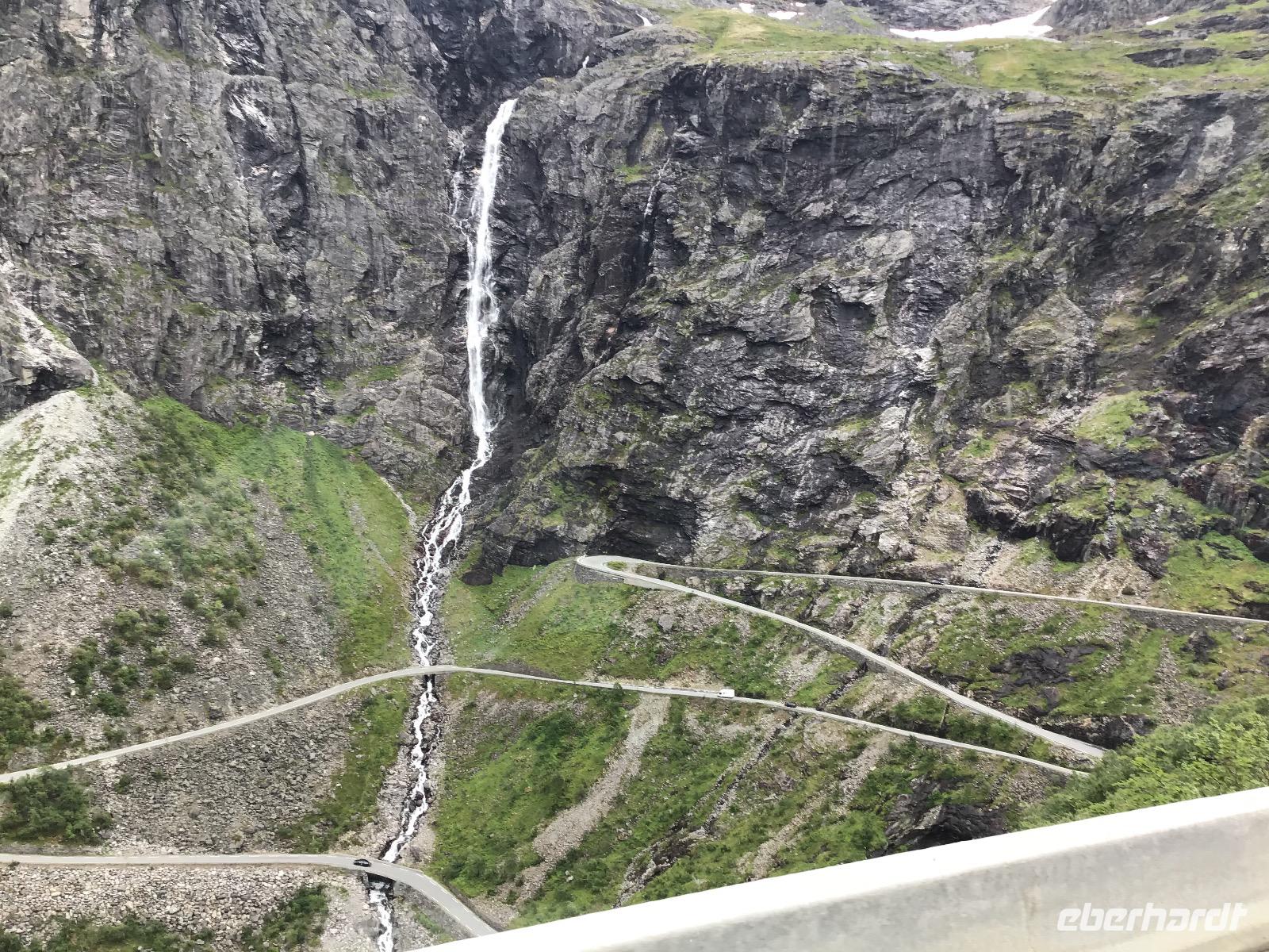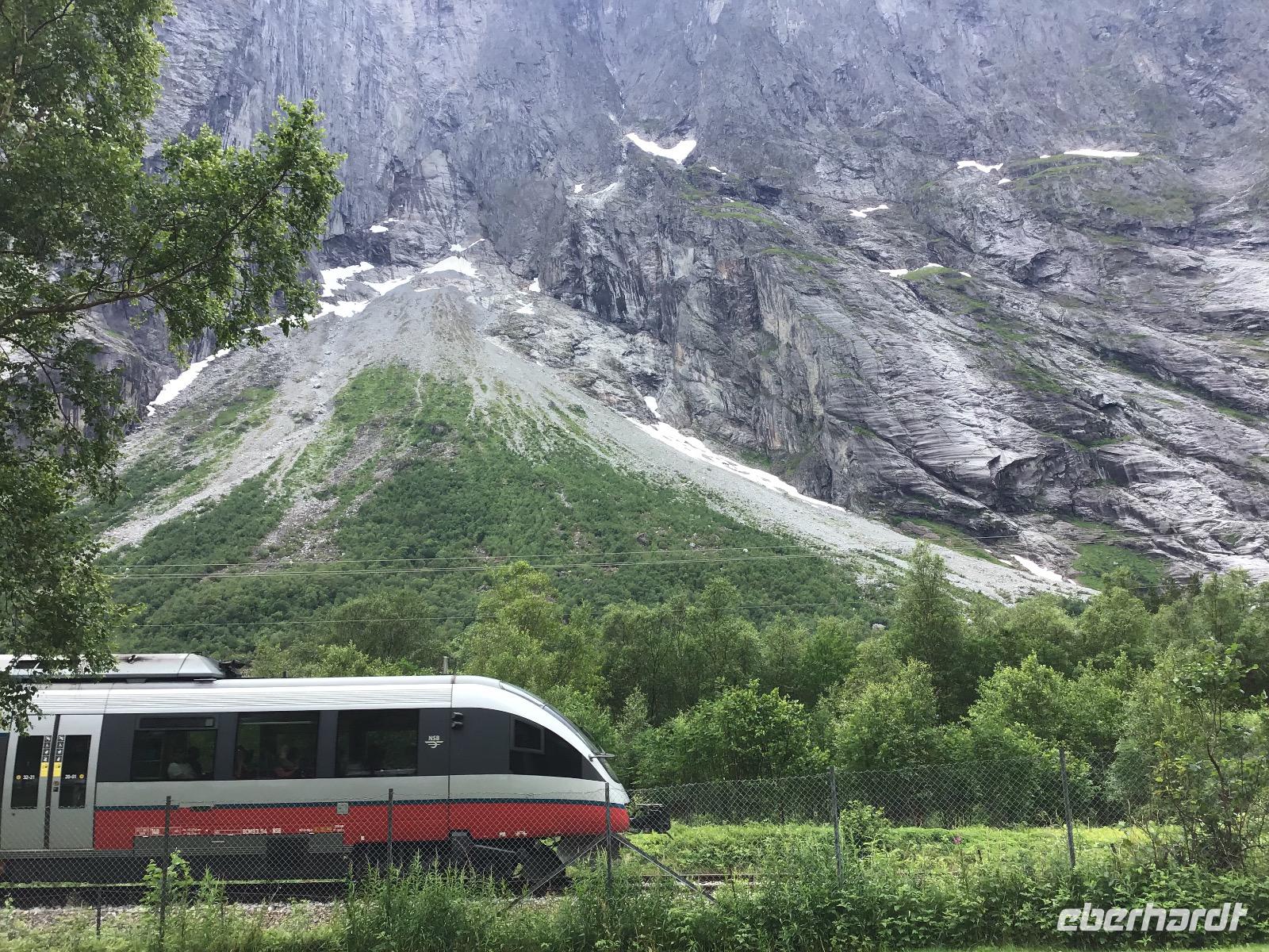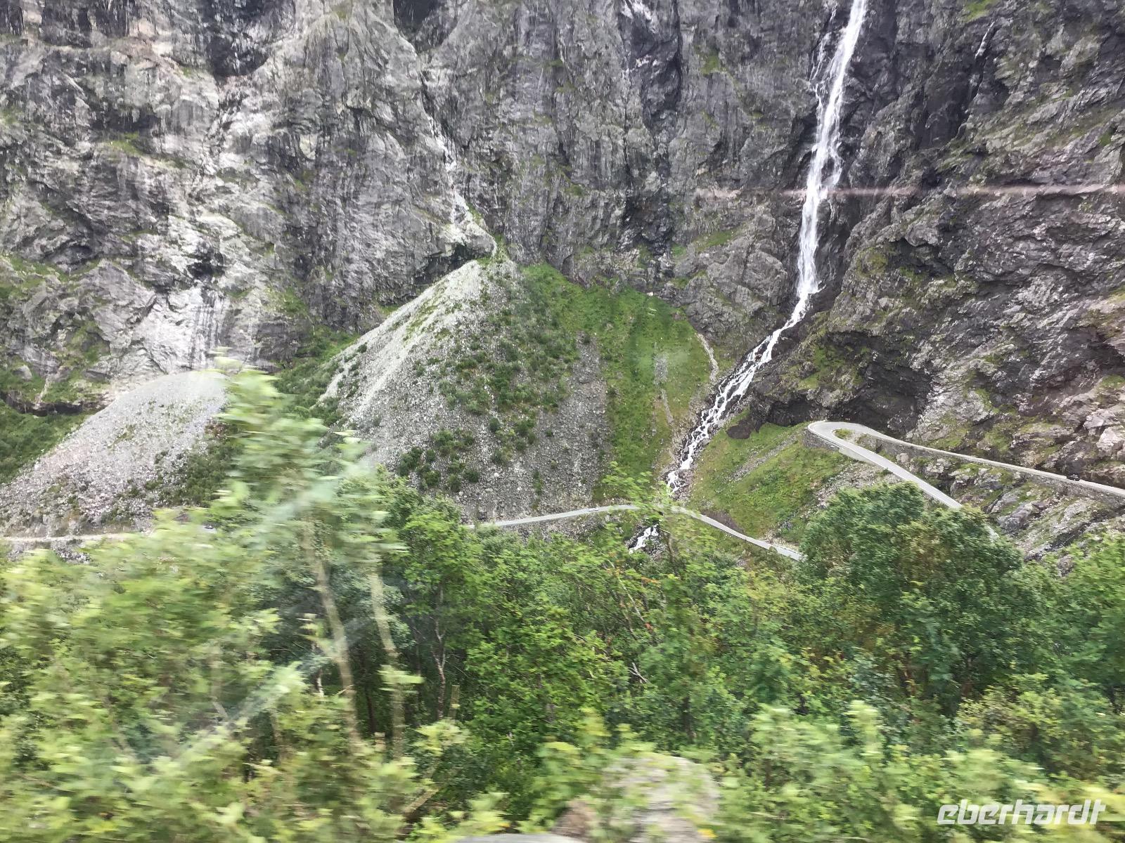 Wir fahren weiter und erreichen gegen Mittag die Gudbrandsbru. Das Wasser sprudelt hier aus den Felsen und stürzt sich mit lautem Getöse auf der anderen Seite wieder hinab. Für staunende Touristen sind Wege darüber angelegt, so dass wir mit fasziniertem Blick den Naturgewalten folgen können ohne uns jeglicher Gefahr auszusetzen. Weiter und weiter fahren wir durch ein Wunderland. Nach jeder Kurve öffnet sich ein neuer fantastischer Blick. Bevor wir die Trollstigen hinab fahren, legen wir einen Stopp ein. Auf einer speziell für Touristen angelegten Aussichtsplattform, die sich über mehrere Ebenen erstreckt, können wir uns schon einen Eindruck verschaffen, was uns gleich erwartet. Doch auch diese Herausforderung meistert unser Frank (scheinbar) mühelos. Wir haben noch etwas Zeit und so entschließen wir uns, bevor wir zum Bahnhof fahren, die Trolltintende in Augenschein zu nehmen. Die Trolltintende sind die Bergzacken, die die Trollwand krönen. Die Wand ist 1800 Meter hoch und die höchste Felswand Europas. Es ist unmöglich diesen atemberaubenden Anblick auf einem Foto festzuhalten. In Angesicht dieser Dimension wird der Mensch zu einer kleinen Ameise.