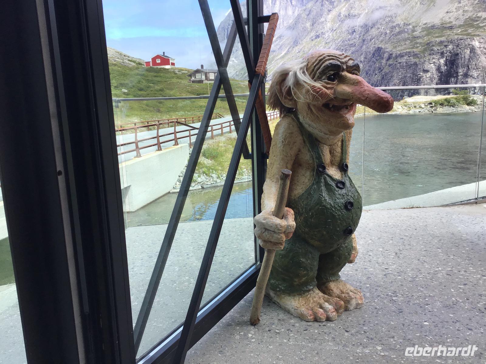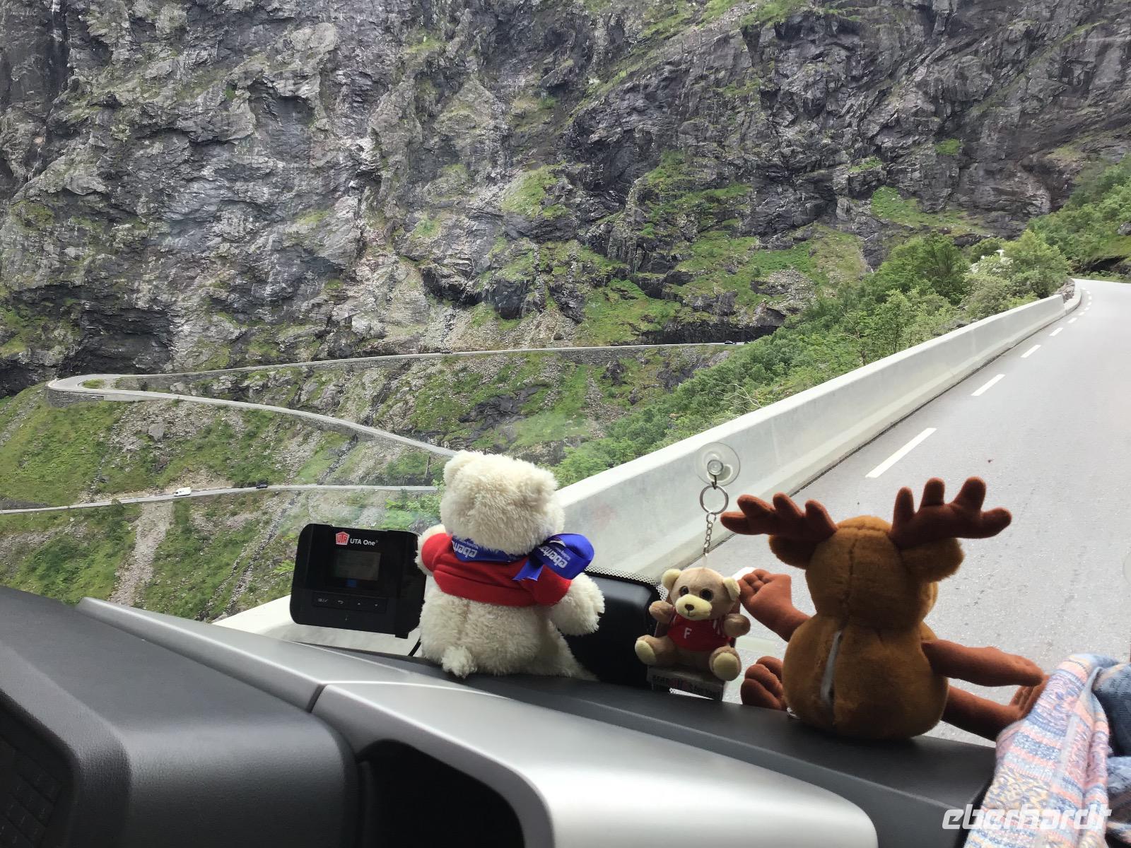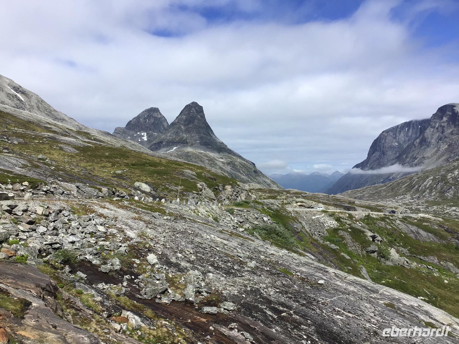 Wir fahren weiter und erreichen gegen Mittag die Gudbrandsbru. Das Wasser sprudelt hier aus den Felsen und stürzt sich mit lautem Getöse auf der anderen Seite wieder hinab. Für staunende Touristen sind Wege darüber angelegt, so dass wir mit fasziniertem Blick den Naturgewalten folgen können ohne uns jeglicher Gefahr auszusetzen. Weiter und weiter fahren wir durch ein Wunderland. Nach jeder Kurve öffnet sich ein neuer fantastischer Blick. Bevor wir die Trollstigen hinab fahren, legen wir einen Stopp ein. Auf einer speziell für Touristen angelegten Aussichtsplattform, die sich über mehrere Ebenen erstreckt, können wir uns schon einen Eindruck verschaffen, was uns gleich erwartet. Doch auch diese Herausforderung meistert unser Frank (scheinbar) mühelos. Wir haben noch etwas Zeit und so entschließen wir uns, bevor wir zum Bahnhof fahren, die Trolltintende in Augenschein zu nehmen. Die Trolltintende sind die Bergzacken, die die Trollwand krönen. Die Wand ist 1800 Meter hoch und die höchste Felswand Europas. Es ist unmöglich diesen atemberaubenden Anblick auf einem Foto festzuhalten. In Angesicht dieser Dimension wird der Mensch zu einer kleinen Ameise.