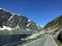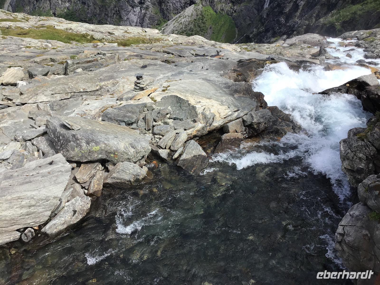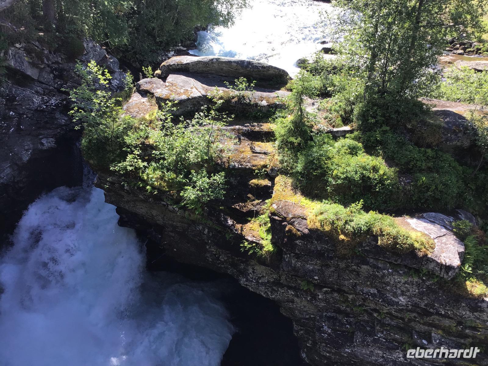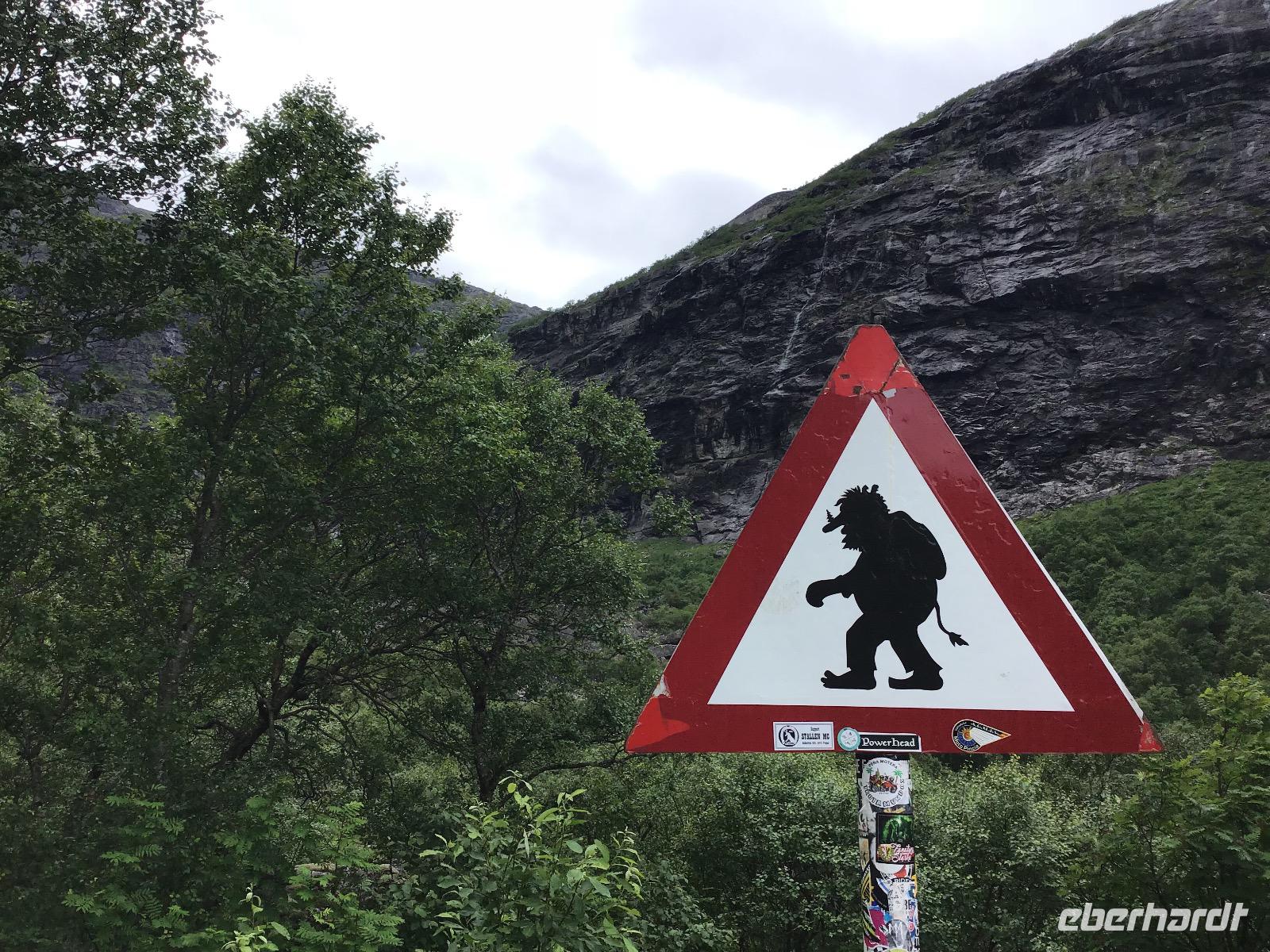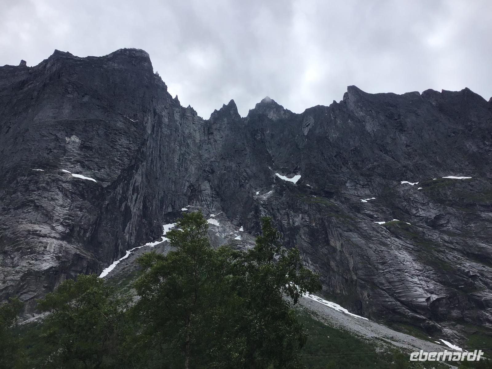 Wir fahren weiter und erreichen gegen Mittag die Gudbrandsbru. Das Wasser sprudelt hier aus den Felsen und stürzt sich mit lautem Getöse auf der anderen Seite wieder hinab. Für staunende Touristen sind Wege darüber angelegt, so dass wir mit fasziniertem Blick den Naturgewalten folgen können ohne uns jeglicher Gefahr auszusetzen. Weiter und weiter fahren wir durch ein Wunderland. Nach jeder Kurve öffnet sich ein neuer fantastischer Blick. Bevor wir die Trollstigen hinab fahren, legen wir einen Stopp ein. Auf einer speziell für Touristen angelegten Aussichtsplattform, die sich über mehrere Ebenen erstreckt, können wir uns schon einen Eindruck verschaffen, was uns gleich erwartet. Doch auch diese Herausforderung meistert unser Frank (scheinbar) mühelos. Wir haben noch etwas Zeit und so entschließen wir uns, bevor wir zum Bahnhof fahren, die Trolltintende in Augenschein zu nehmen. Die Trolltintende sind die Bergzacken, die die Trollwand krönen. Die Wand ist 1800 Meter hoch und die höchste Felswand Europas. Es ist unmöglich diesen atemberaubenden Anblick auf einem Foto festzuhalten. In Angesicht dieser Dimension wird der Mensch zu einer kleinen Ameise.