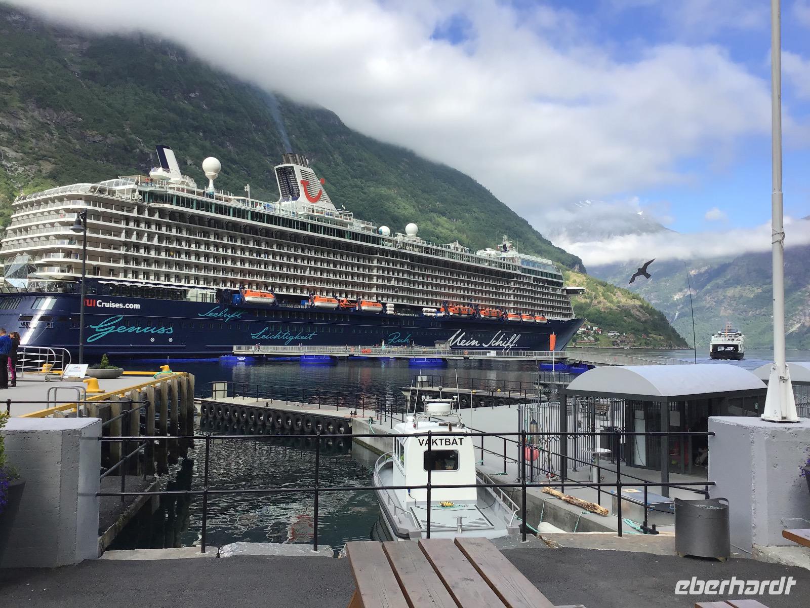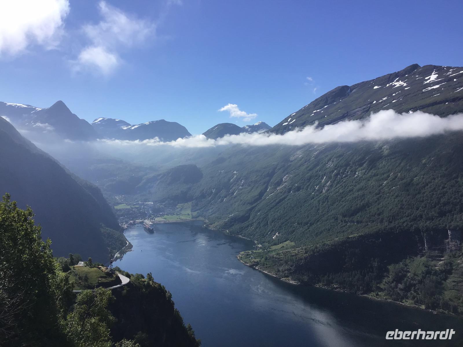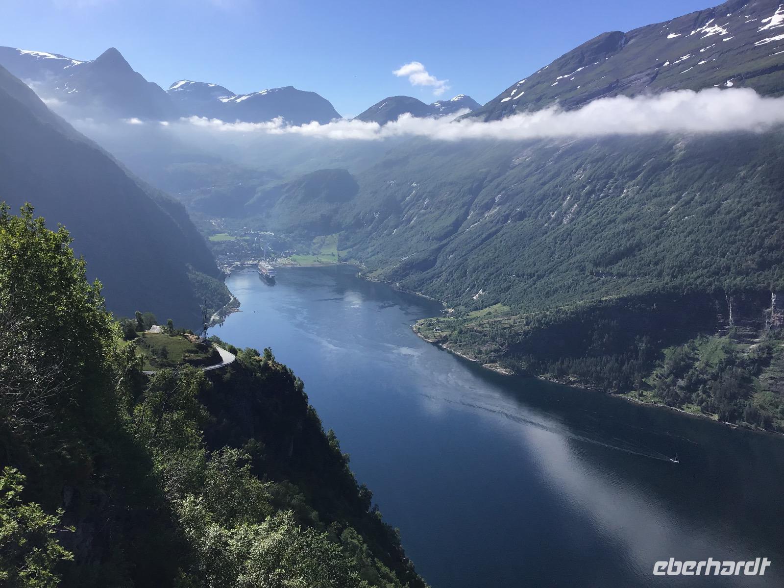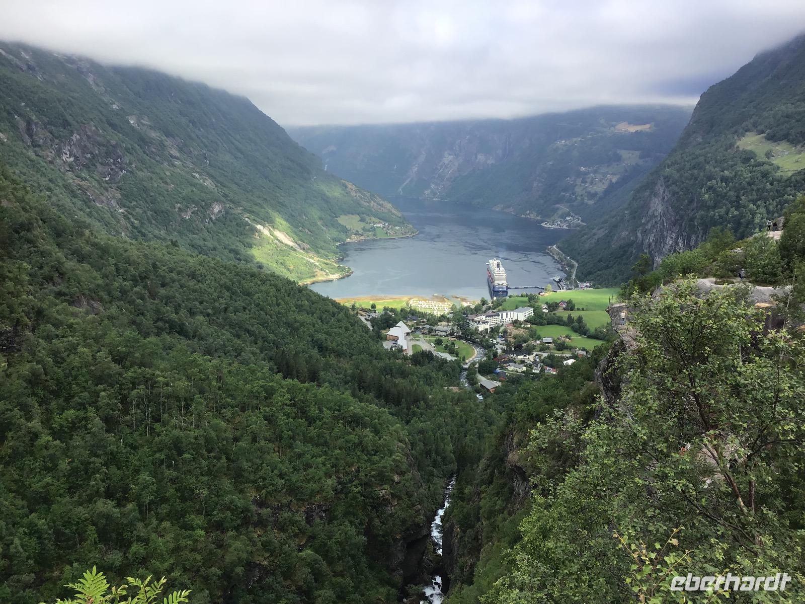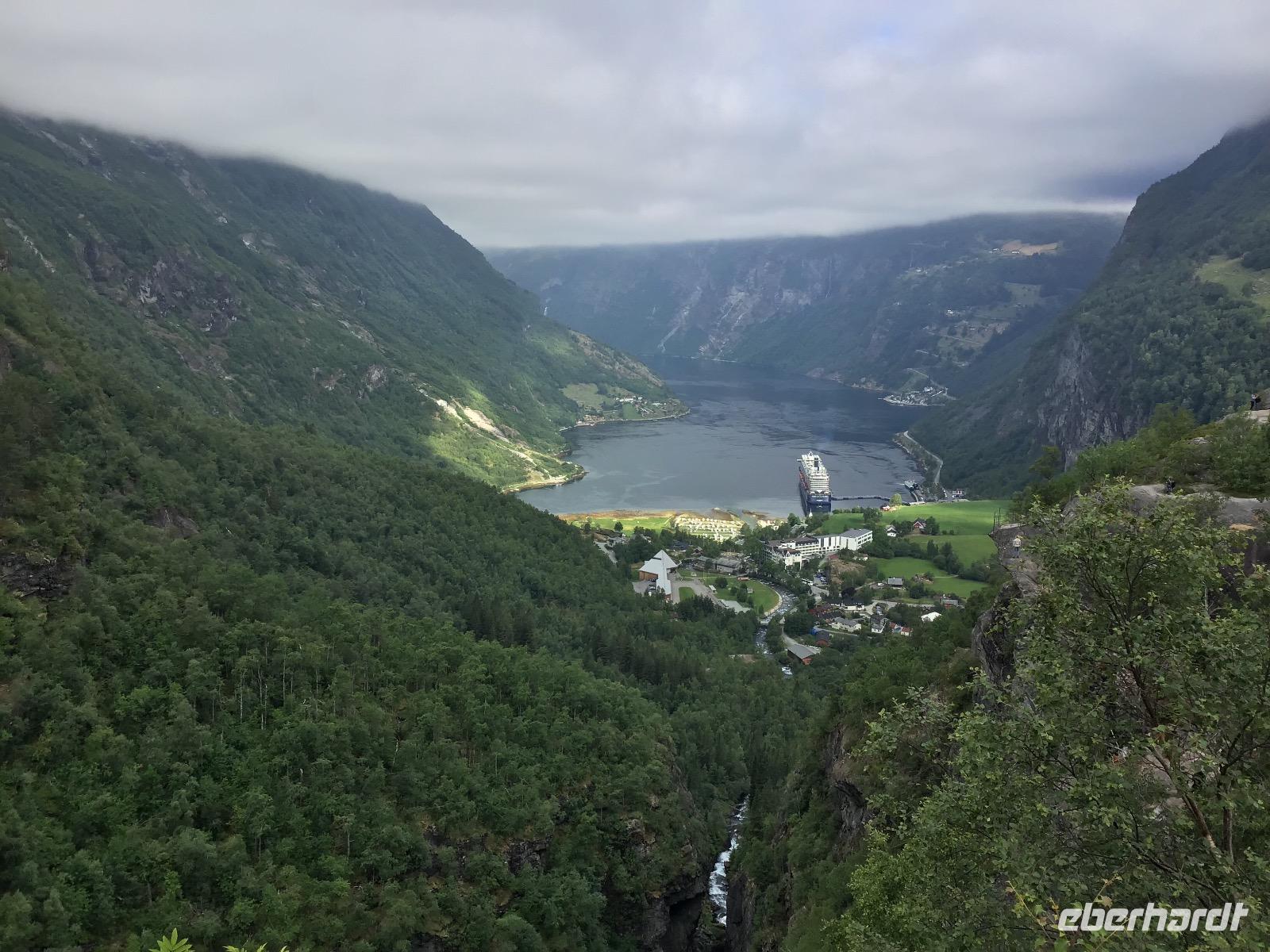 Wir haben in Grotli übernachtet, einem ganz kleinen Ort mit einer interessanten Geschichte. Der Name Grotli stammt von einem alten norwegischen Wort ab, das STEIN bedeutete. Denn hier stand jahrzehntelang ein steinerner Unterstand, der Reisenden Schutz bot. Als später, im 19. Jahrhundert, der Straßenbau begann, wurde die der Unterstand zunächst zu einer Hütte und später zu einem Gasthof ausgebaut. Da alle Straßen durch Grotli führten, entwickelte sich hier ein Verkehrsknotenpunkt und in dem Gasthof hielten sich auch berühmte Persönlichkeiten auf. Seit über einhundert Jahren steht hier nun das Hotel, in dem wir zu Gast waren. Unser Ziel ist jetzt Geiranger, der Hauptort am berühmten Geirangerfjord. Schon der Weg dorthin führt durch die typisch norwegische Landschaft, rechts und links der Straßen ragen hohe Felsen auf, das Wasser im Fjord ist tiefblau. Je näher wir Geiranger kommen, umso tiefer liegen die Wolken. Langsam befürchten wir Schlimmes. Sollte uns diesmal der Wettergott einen Streich spielen und die Aussicht verderben? Doch wir haben weiterhin Glück. Schon am ersten Aussichtspunkt ist die Sicht auf Geiranger und den Fjord frei. Nach einem kurzen Fotostopp fahren wir hinab ins Tal. In Geiranger liegt ein Schiff der Flotte MEIN SCHIFF. Unterwegs sind uns bereits Fahrradfahrer begegnet, die den Berg hinauffuhren und durch ihre Fahrräder eindeutig dem Schiff zuzuordnen waren. Wir schlendern ein wenig am Hafen entlang, hier gibt es ein Souvenirgeschäft, einen Bäcker und zum Glück auch eine saubere, kostenfreie Toilette. Nun geht es für uns wieder bergauf. Zum Glück nicht mit dem Fahrrad, sondern mit dem Bus, den unser Busfahrer Frank sicher die elf Kehren der Adlerstraße hoch bugsiert. In der letzten Kurve, die Örnesvingen heißt, ist eine Aussichtsplattform angelegt, von der wir noch einmal einen traumhaften Blick auf Geiranger und den Geirangerfjord haben.