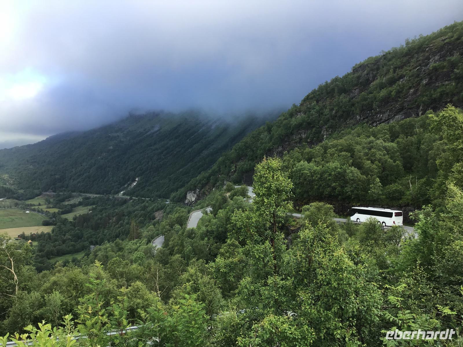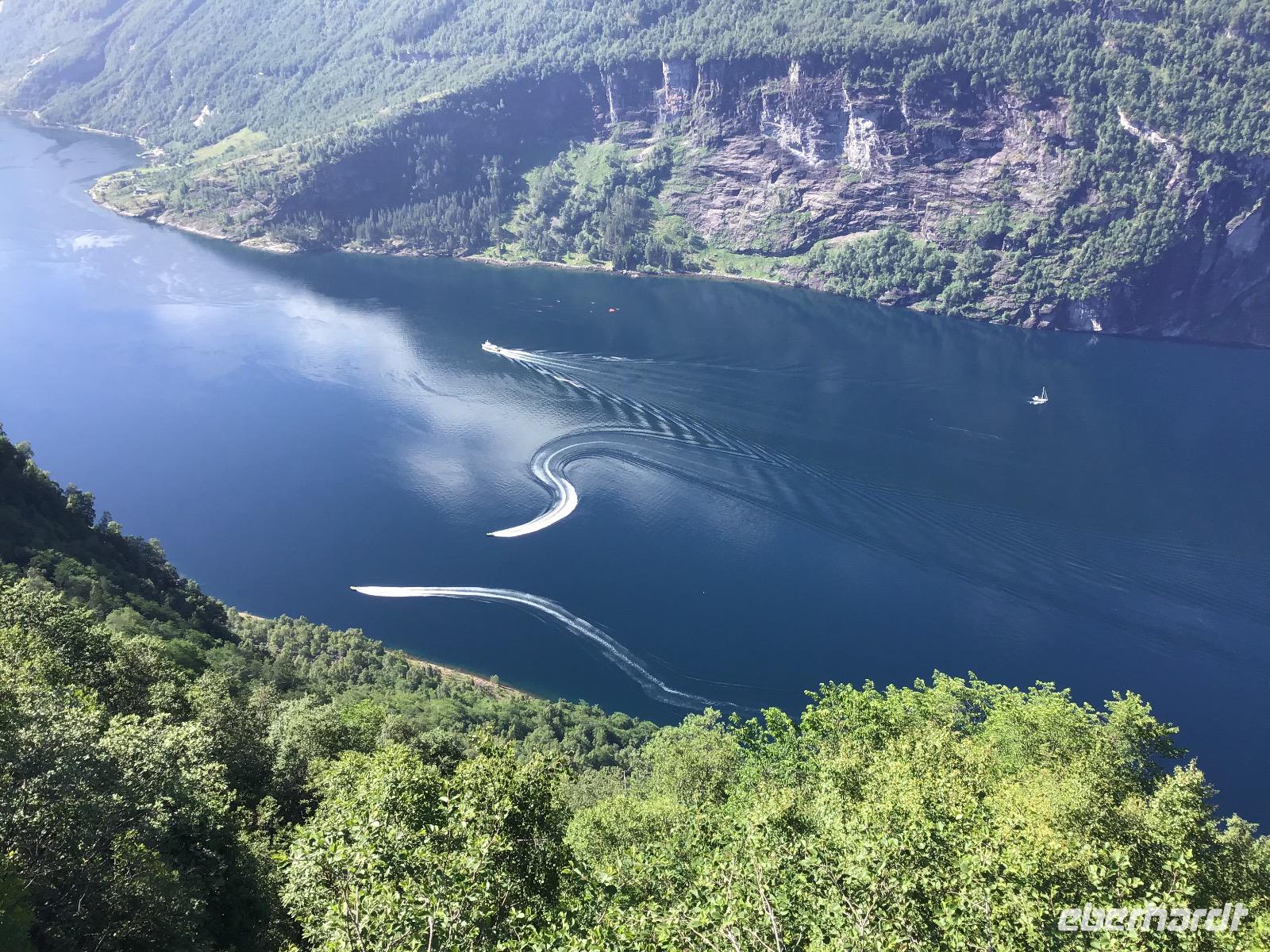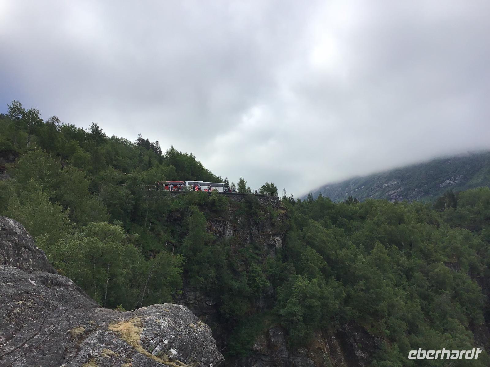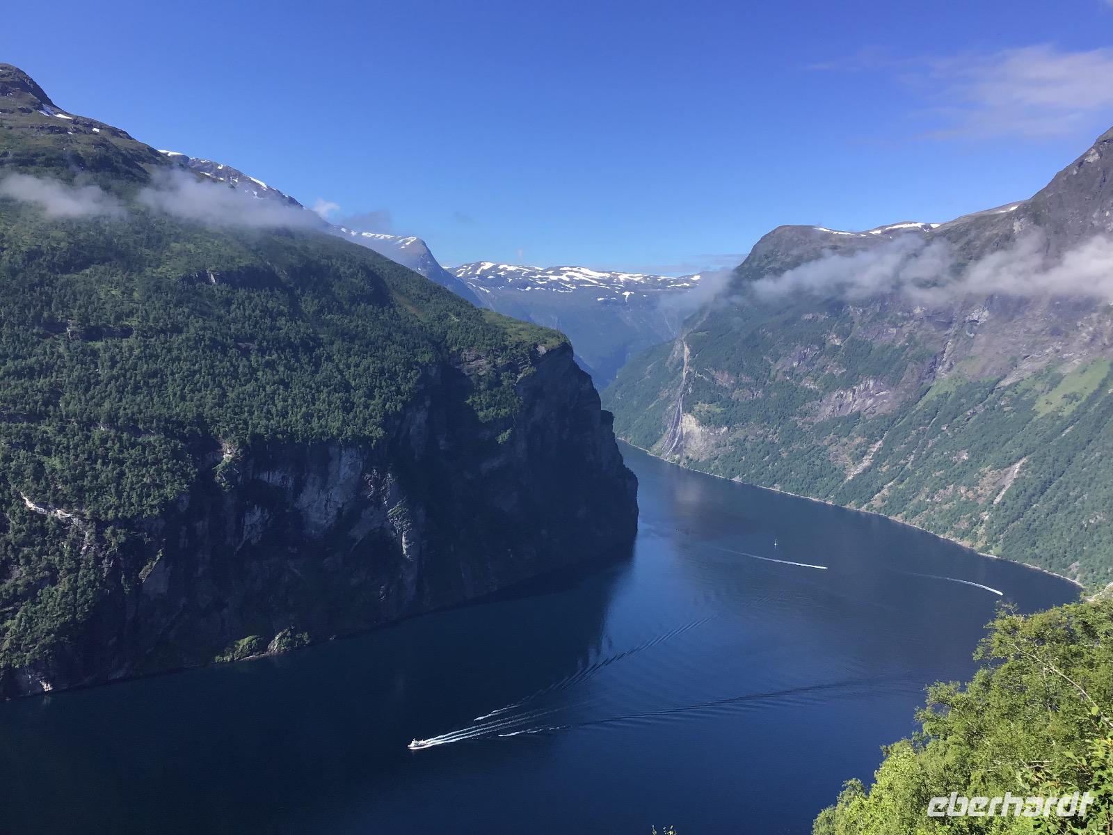 Wir haben in Grotli übernachtet, einem ganz kleinen Ort mit einer interessanten Geschichte. Der Name Grotli stammt von einem alten norwegischen Wort ab, das STEIN bedeutete. Denn hier stand jahrzehntelang ein steinerner Unterstand, der Reisenden Schutz bot. Als später, im 19. Jahrhundert, der Straßenbau begann, wurde die der Unterstand zunächst zu einer Hütte und später zu einem Gasthof ausgebaut. Da alle Straßen durch Grotli führten, entwickelte sich hier ein Verkehrsknotenpunkt und in dem Gasthof hielten sich auch berühmte Persönlichkeiten auf. Seit über einhundert Jahren steht hier nun das Hotel, in dem wir zu Gast waren. Unser Ziel ist jetzt Geiranger, der Hauptort am berühmten Geirangerfjord. Schon der Weg dorthin führt durch die typisch norwegische Landschaft, rechts und links der Straßen ragen hohe Felsen auf, das Wasser im Fjord ist tiefblau. Je näher wir Geiranger kommen, umso tiefer liegen die Wolken. Langsam befürchten wir Schlimmes. Sollte uns diesmal der Wettergott einen Streich spielen und die Aussicht verderben? Doch wir haben weiterhin Glück. Schon am ersten Aussichtspunkt ist die Sicht auf Geiranger und den Fjord frei. Nach einem kurzen Fotostopp fahren wir hinab ins Tal. In Geiranger liegt ein Schiff der Flotte MEIN SCHIFF. Unterwegs sind uns bereits Fahrradfahrer begegnet, die den Berg hinauffuhren und durch ihre Fahrräder eindeutig dem Schiff zuzuordnen waren. Wir schlendern ein wenig am Hafen entlang, hier gibt es ein Souvenirgeschäft, einen Bäcker und zum Glück auch eine saubere, kostenfreie Toilette. Nun geht es für uns wieder bergauf. Zum Glück nicht mit dem Fahrrad, sondern mit dem Bus, den unser Busfahrer Frank sicher die elf Kehren der Adlerstraße hoch bugsiert. In der letzten Kurve, die Örnesvingen heißt, ist eine Aussichtsplattform angelegt, von der wir noch einmal einen traumhaften Blick auf Geiranger und den Geirangerfjord haben.