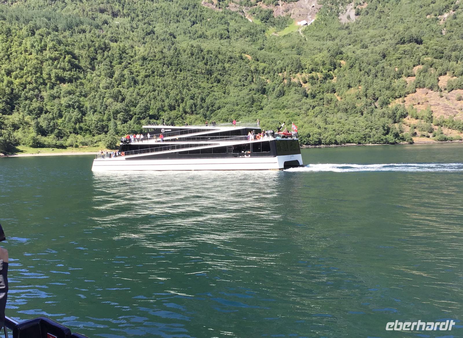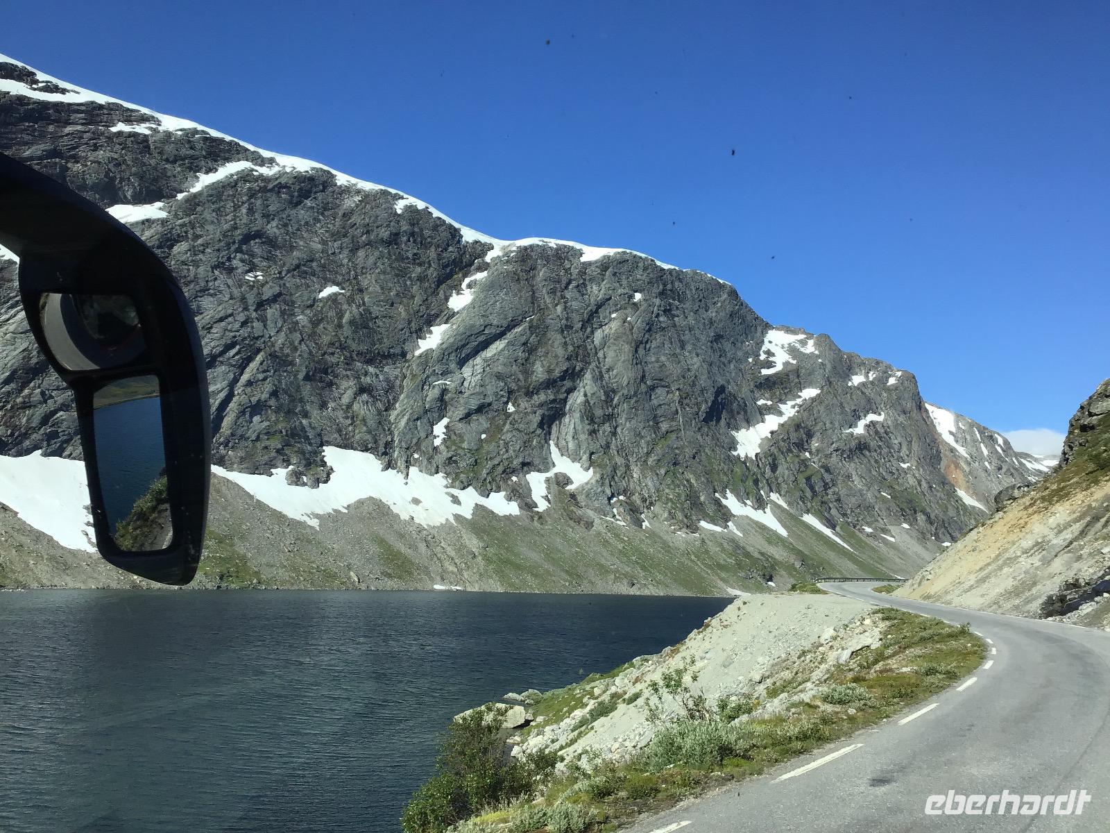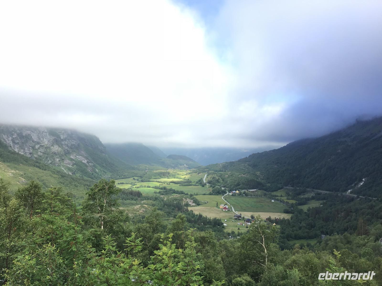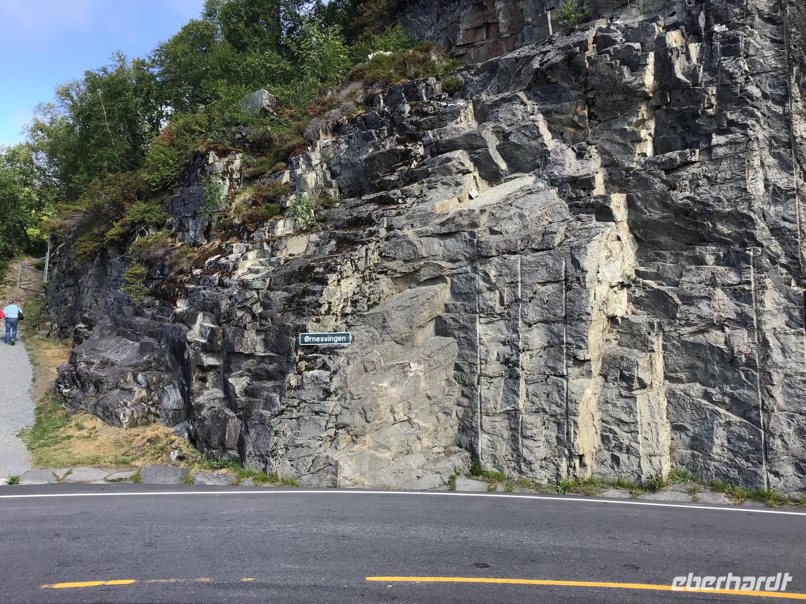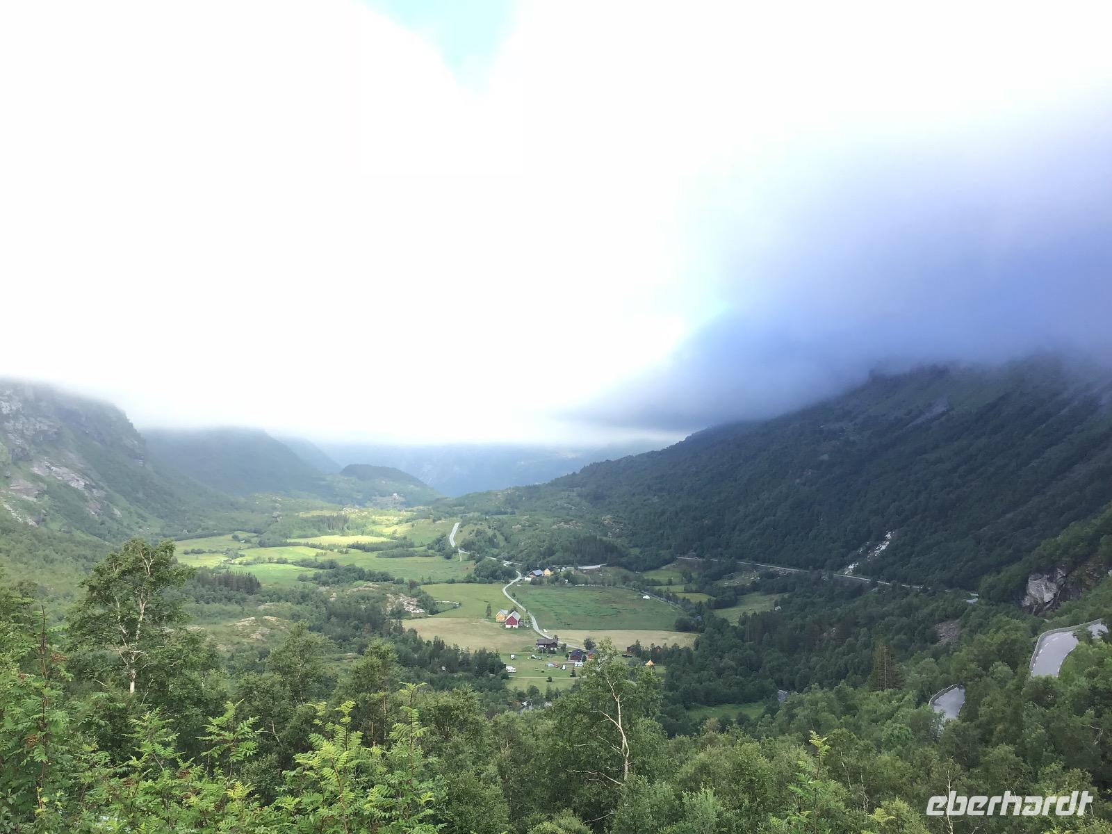 Wir haben in Grotli übernachtet, einem ganz kleinen Ort mit einer interessanten Geschichte. Der Name Grotli stammt von einem alten norwegischen Wort ab, das STEIN bedeutete. Denn hier stand jahrzehntelang ein steinerner Unterstand, der Reisenden Schutz bot. Als später, im 19. Jahrhundert, der Straßenbau begann, wurde die der Unterstand zunächst zu einer Hütte und später zu einem Gasthof ausgebaut. Da alle Straßen durch Grotli führten, entwickelte sich hier ein Verkehrsknotenpunkt und in dem Gasthof hielten sich auch berühmte Persönlichkeiten auf. Seit über einhundert Jahren steht hier nun das Hotel, in dem wir zu Gast waren. Unser Ziel ist jetzt Geiranger, der Hauptort am berühmten Geirangerfjord. Schon der Weg dorthin führt durch die typisch norwegische Landschaft, rechts und links der Straßen ragen hohe Felsen auf, das Wasser im Fjord ist tiefblau. Je näher wir Geiranger kommen, umso tiefer liegen die Wolken. Langsam befürchten wir Schlimmes. Sollte uns diesmal der Wettergott einen Streich spielen und die Aussicht verderben? Doch wir haben weiterhin Glück. Schon am ersten Aussichtspunkt ist die Sicht auf Geiranger und den Fjord frei. Nach einem kurzen Fotostopp fahren wir hinab ins Tal. In Geiranger liegt ein Schiff der Flotte MEIN SCHIFF. Unterwegs sind uns bereits Fahrradfahrer begegnet, die den Berg hinauffuhren und durch ihre Fahrräder eindeutig dem Schiff zuzuordnen waren. Wir schlendern ein wenig am Hafen entlang, hier gibt es ein Souvenirgeschäft, einen Bäcker und zum Glück auch eine saubere, kostenfreie Toilette. Nun geht es für uns wieder bergauf. Zum Glück nicht mit dem Fahrrad, sondern mit dem Bus, den unser Busfahrer Frank sicher die elf Kehren der Adlerstraße hoch bugsiert. In der letzten Kurve, die Örnesvingen heißt, ist eine Aussichtsplattform angelegt, von der wir noch einmal einen traumhaften Blick auf Geiranger und den Geirangerfjord haben.