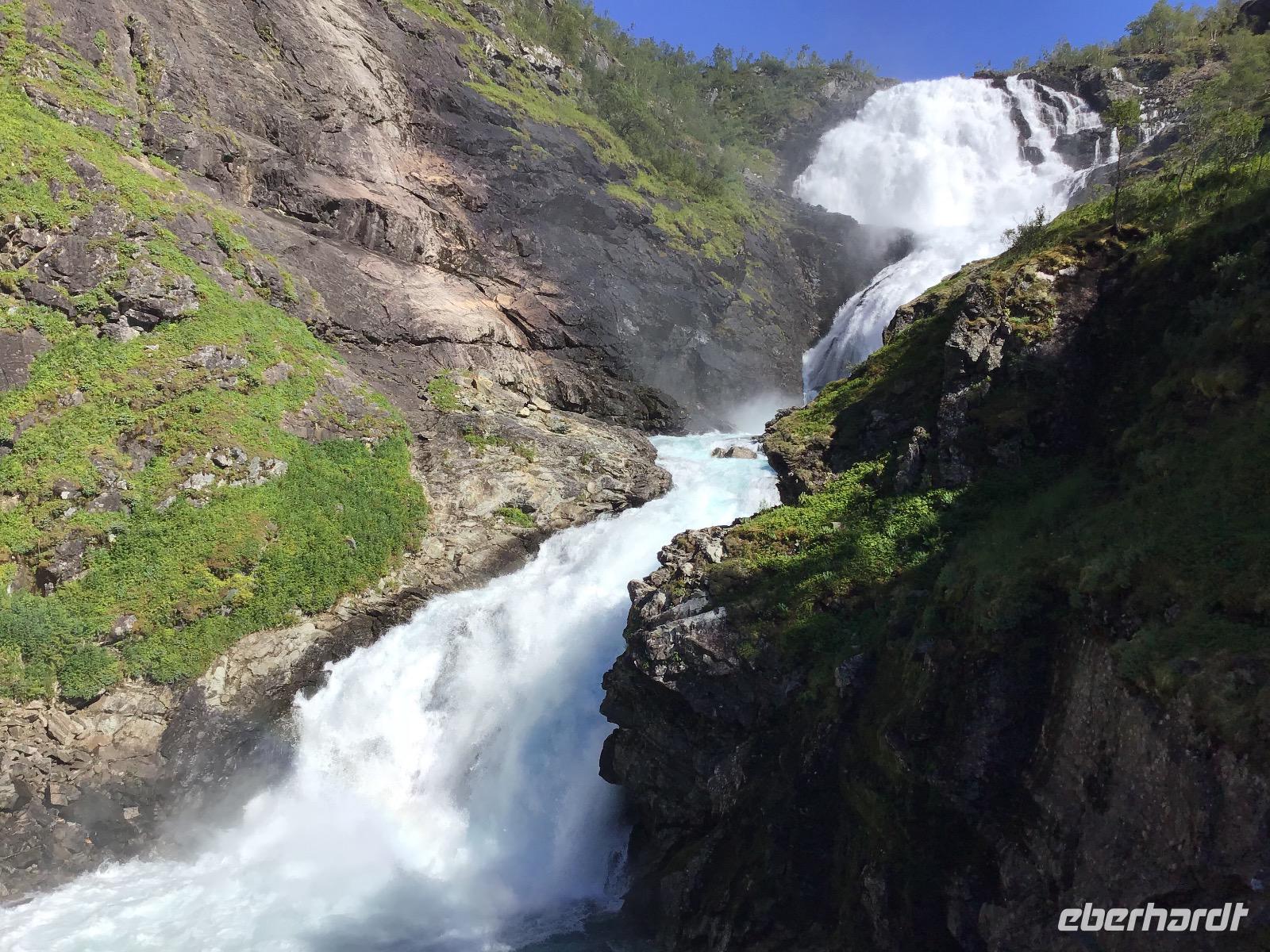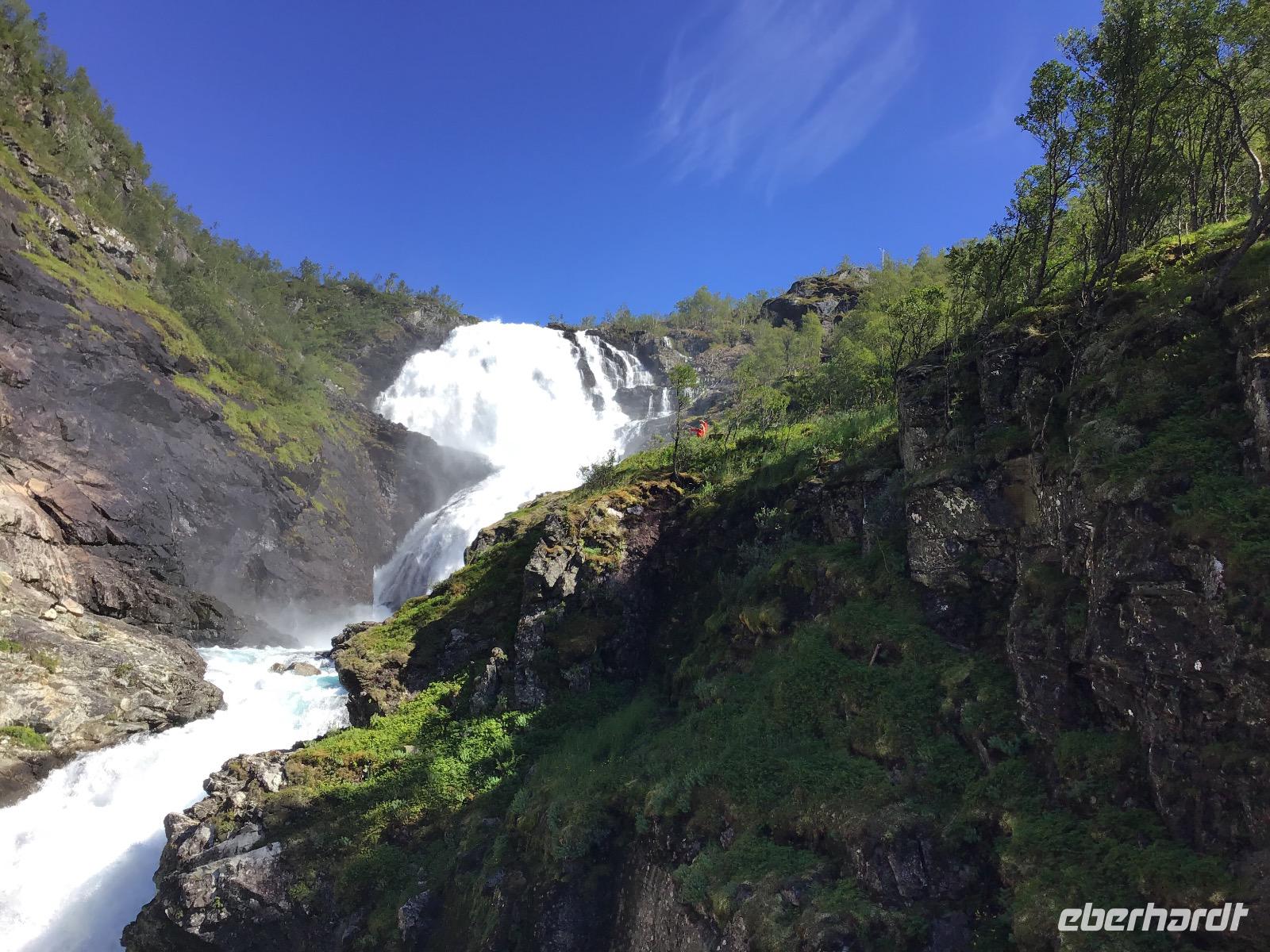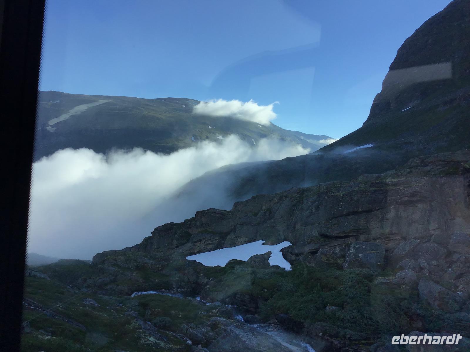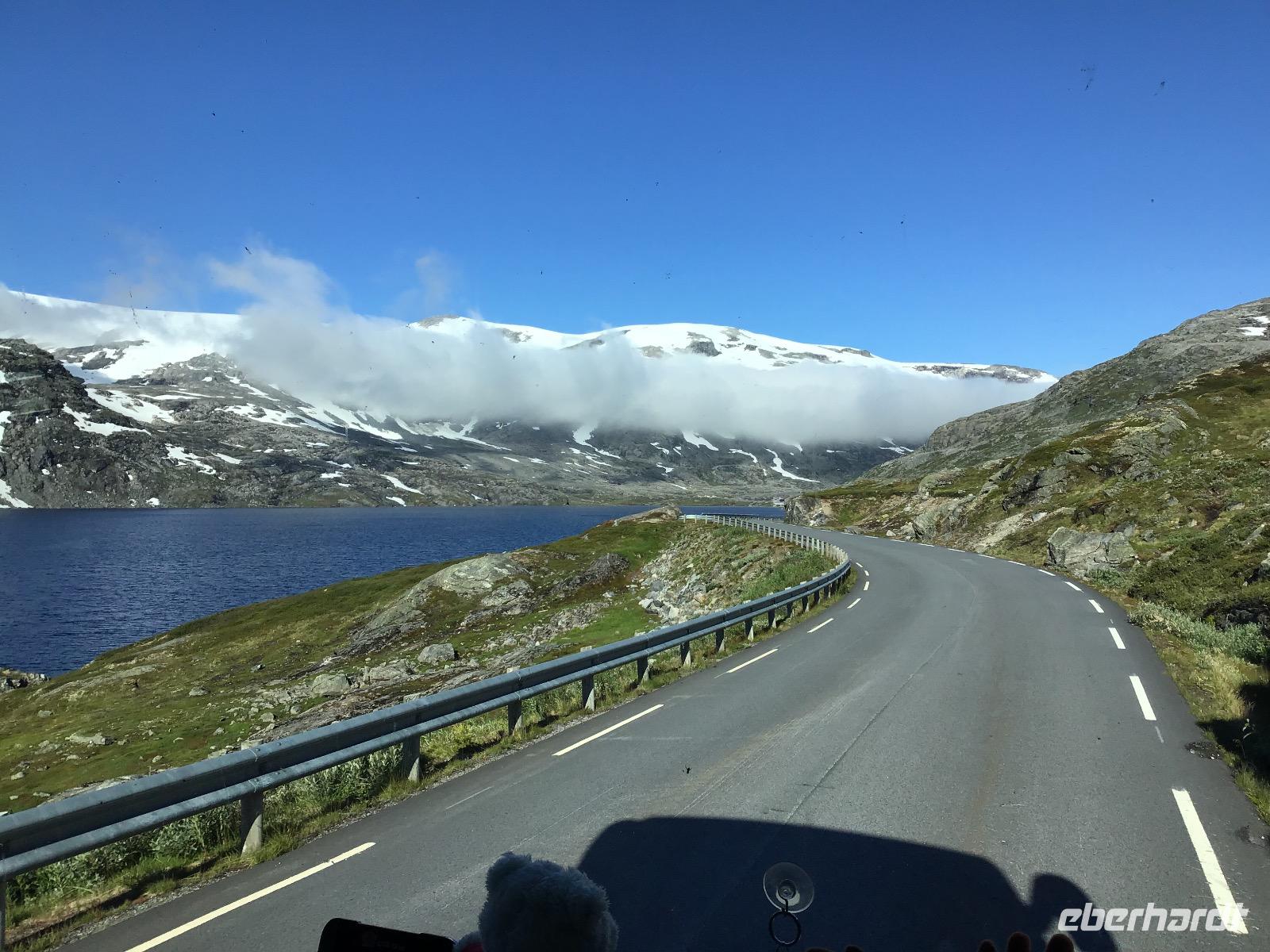 Oijoijoi, 7.45 Uhr Abfahrt! Das klingt nach langem Weg. So ist es auch. Aber: nach wie vor reisen wir durchs Zauberland. Im Wasser der Fjorde, Flüsse und Seen spiegelt sich die Welt. Am Tvindefoss stürzt sich das Wasser einhundertfünfzig Meter in die Tiefe. Das Rauschen ist berauschend. Belustigend hingegen ist der Pulk der Chinesen vor dem einzig vorhandenen WC, in das man nur mit Hilfe einer Kreditkarte gelangt. Und das ist scheinbar nicht so einfach. Von Gudvangen nach Flam fahren wir mit einer Elektrofähre. Diese Schiffe sind erst seit zwei Jahren in Betrieb. Vierhundert Passagiere haben Platz, doch das Boot ist so groß, dass jeder seinen Lieblingsplatz findet. Im schönsten Sonnenschein, bei strahlend blauem Himmel gleiten wir durch steil aufragende Felsen durch den blaugrünen Fjord. Hier und da lugt ein weißes Wölkchen hervor und an den Ufern stehen rotbedachte Häuschen. In Flam bleibt ausreichend Zeit zum Mittagessen und/oder die Souvenirläden leer zu kaufen. Die nächste grandiose Tour erwartet uns - wir fahren mit der Flambahn. Eine der steilsten Strecken überwindet die Bahn und führt uns auf über achthundert Meter nach Myrdal. Unterwegs steigen wir aus und begeistern uns an einem weiteren rauschenden Wasserfall. In der Luft liegt Musik und eine Elfe in rotem Kleid tanzt dazu. Mit der Bergenbahn geht es dann weiter. Allerdings werden unsere Fotografen immer wieder von überraschend auftauchenden Tunneln überrascht. Am Abend treffen wir in Geilo ein, wo wir heute übernachten.