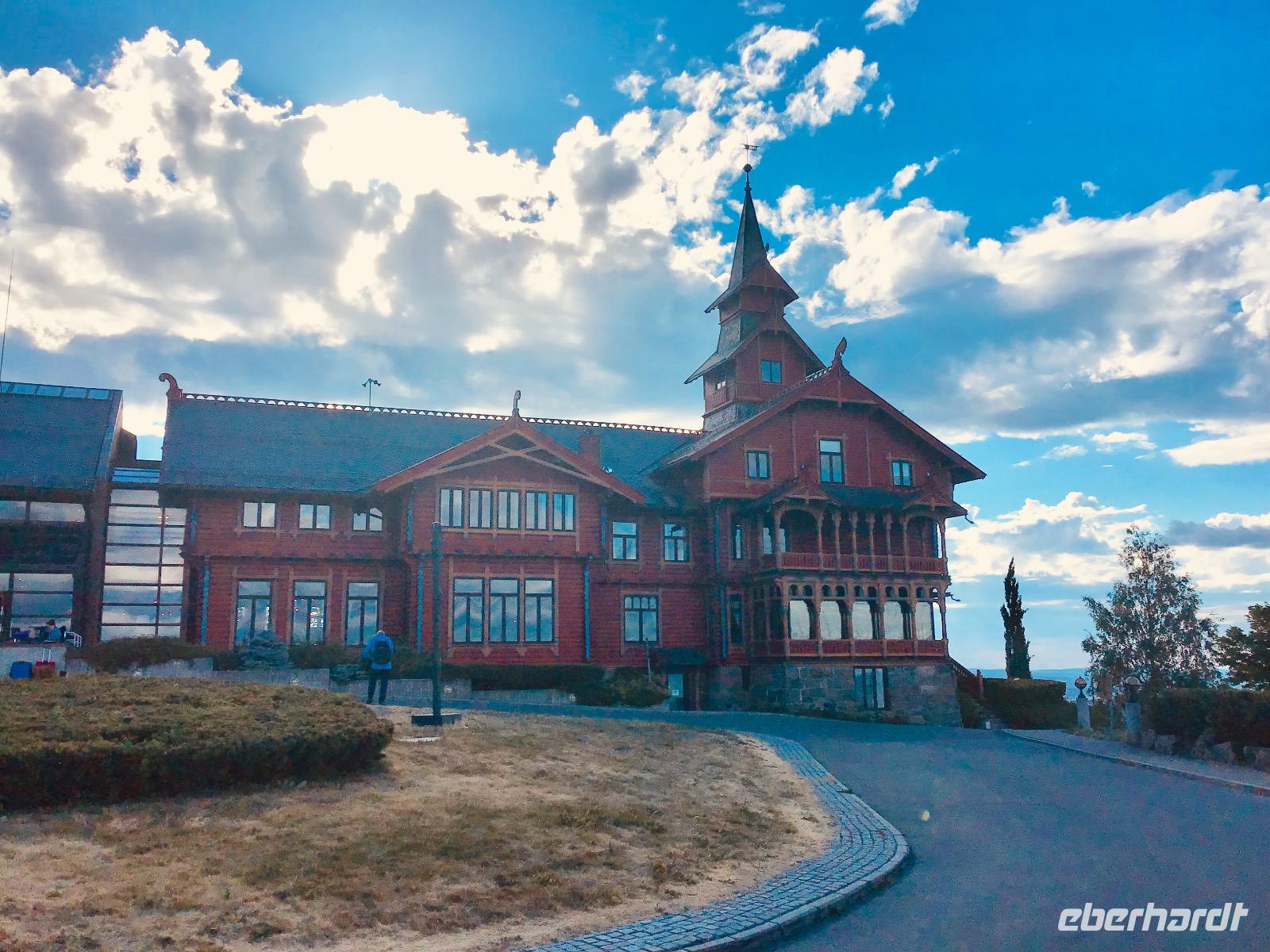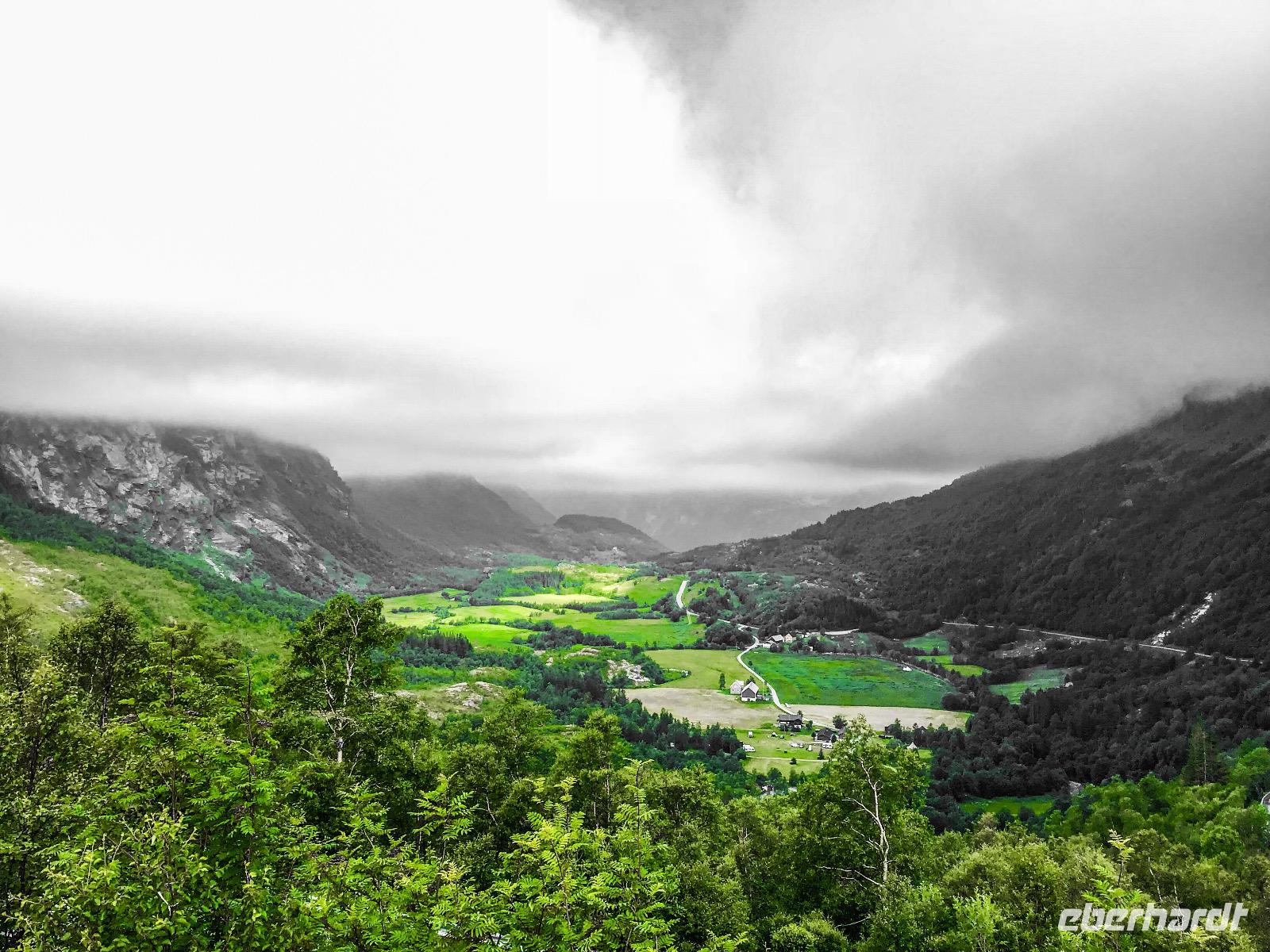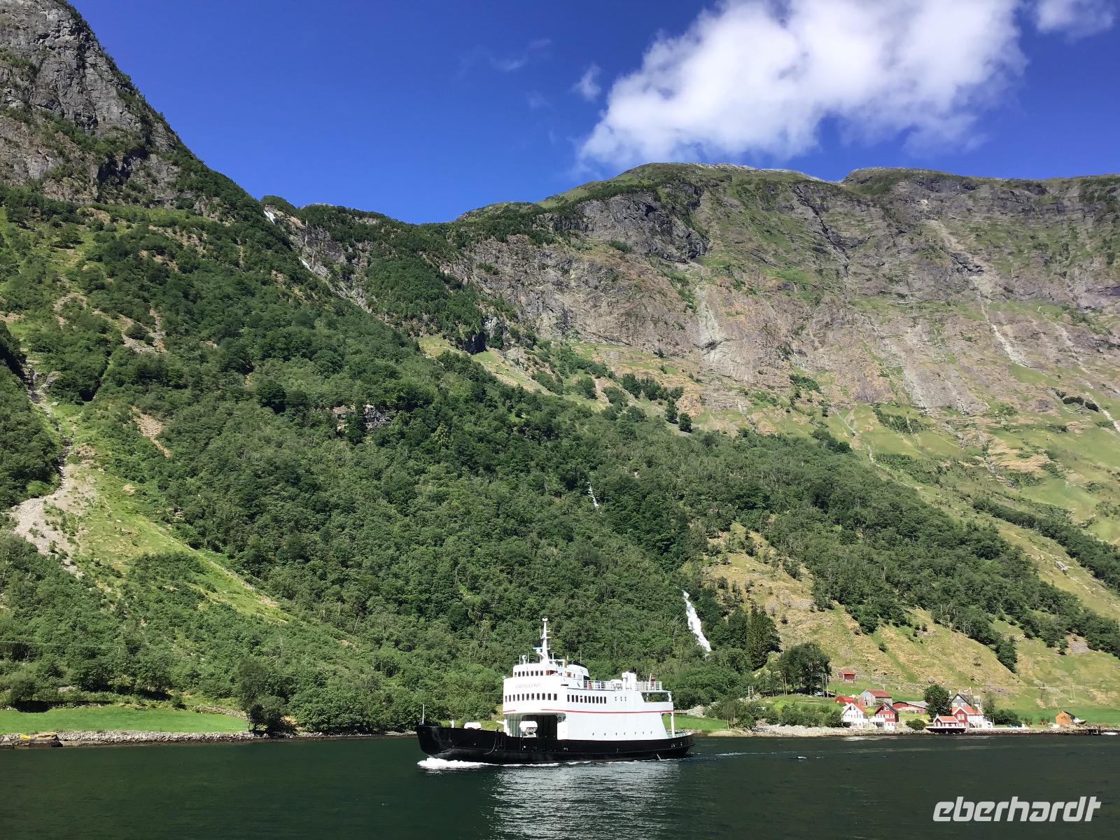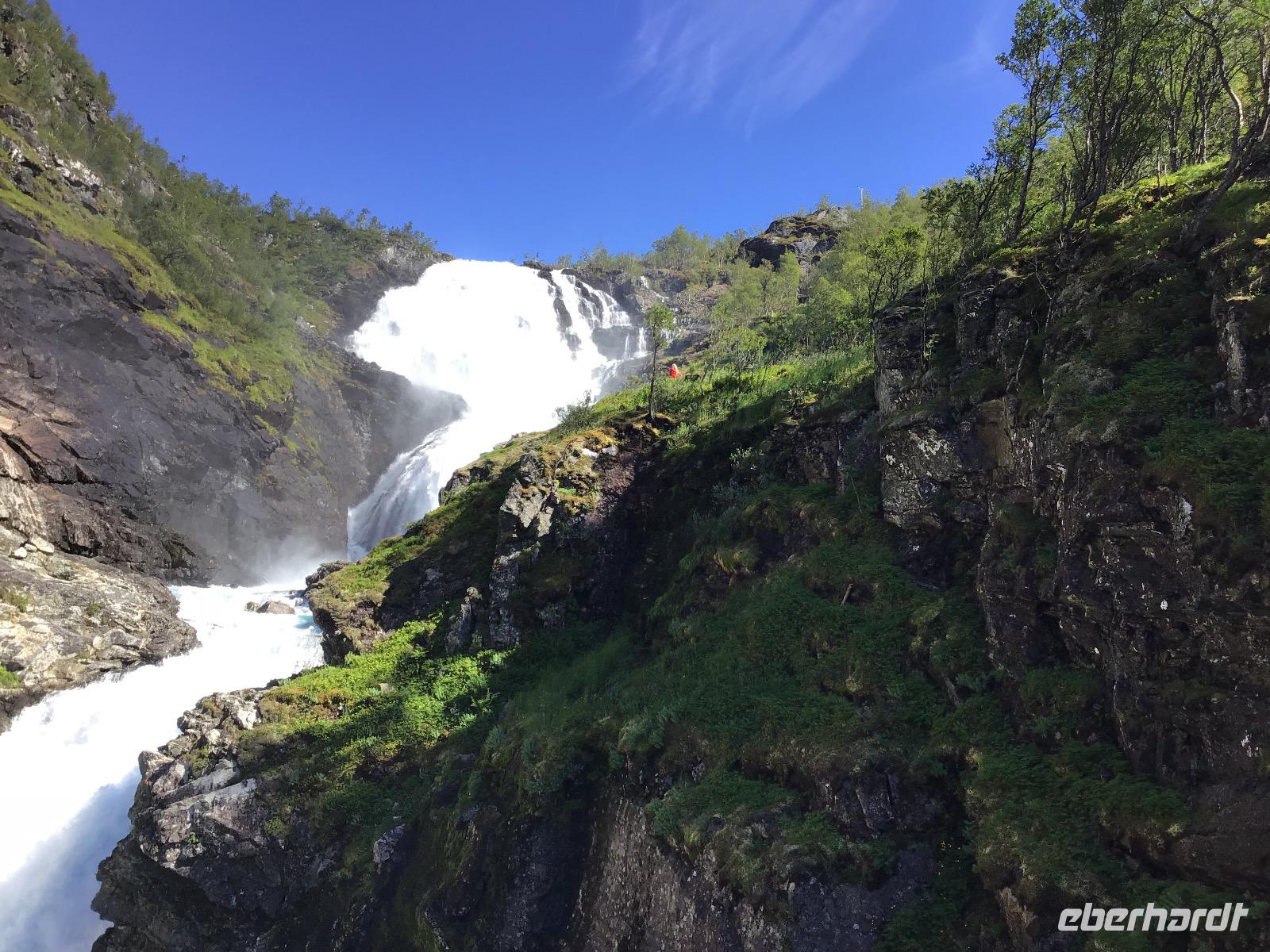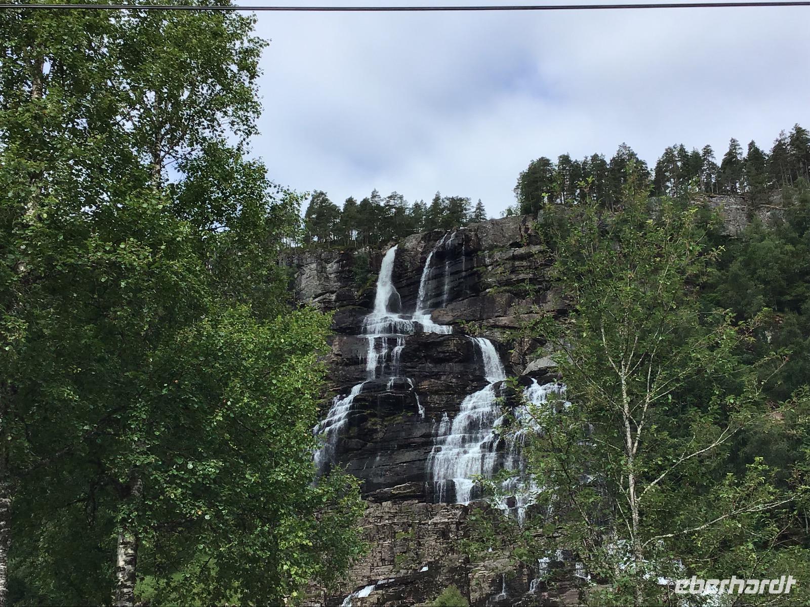 Oijoijoi, 7.45 Uhr Abfahrt! Das klingt nach langem Weg. So ist es auch. Aber: nach wie vor reisen wir durchs Zauberland. Im Wasser der Fjorde, Flüsse und Seen spiegelt sich die Welt. Am Tvindefoss stürzt sich das Wasser einhundertfünfzig Meter in die Tiefe. Das Rauschen ist berauschend. Belustigend hingegen ist der Pulk der Chinesen vor dem einzig vorhandenen WC, in das man nur mit Hilfe einer Kreditkarte gelangt. Und das ist scheinbar nicht so einfach. Von Gudvangen nach Flam fahren wir mit einer Elektrofähre. Diese Schiffe sind erst seit zwei Jahren in Betrieb. Vierhundert Passagiere haben Platz, doch das Boot ist so groß, dass jeder seinen Lieblingsplatz findet. Im schönsten Sonnenschein, bei strahlend blauem Himmel gleiten wir durch steil aufragende Felsen durch den blaugrünen Fjord. Hier und da lugt ein weißes Wölkchen hervor und an den Ufern stehen rotbedachte Häuschen. In Flam bleibt ausreichend Zeit zum Mittagessen und/oder die Souvenirläden leer zu kaufen. Die nächste grandiose Tour erwartet uns - wir fahren mit der Flambahn. Eine der steilsten Strecken überwindet die Bahn und führt uns auf über achthundert Meter nach Myrdal. Unterwegs steigen wir aus und begeistern uns an einem weiteren rauschenden Wasserfall. In der Luft liegt Musik und eine Elfe in rotem Kleid tanzt dazu. Mit der Bergenbahn geht es dann weiter. Allerdings werden unsere Fotografen immer wieder von überraschend auftauchenden Tunneln überrascht. Am Abend treffen wir in Geilo ein, wo wir heute übernachten.