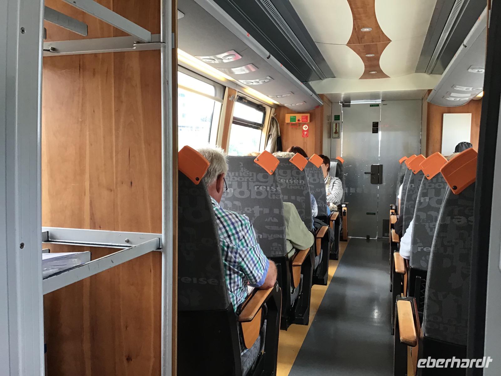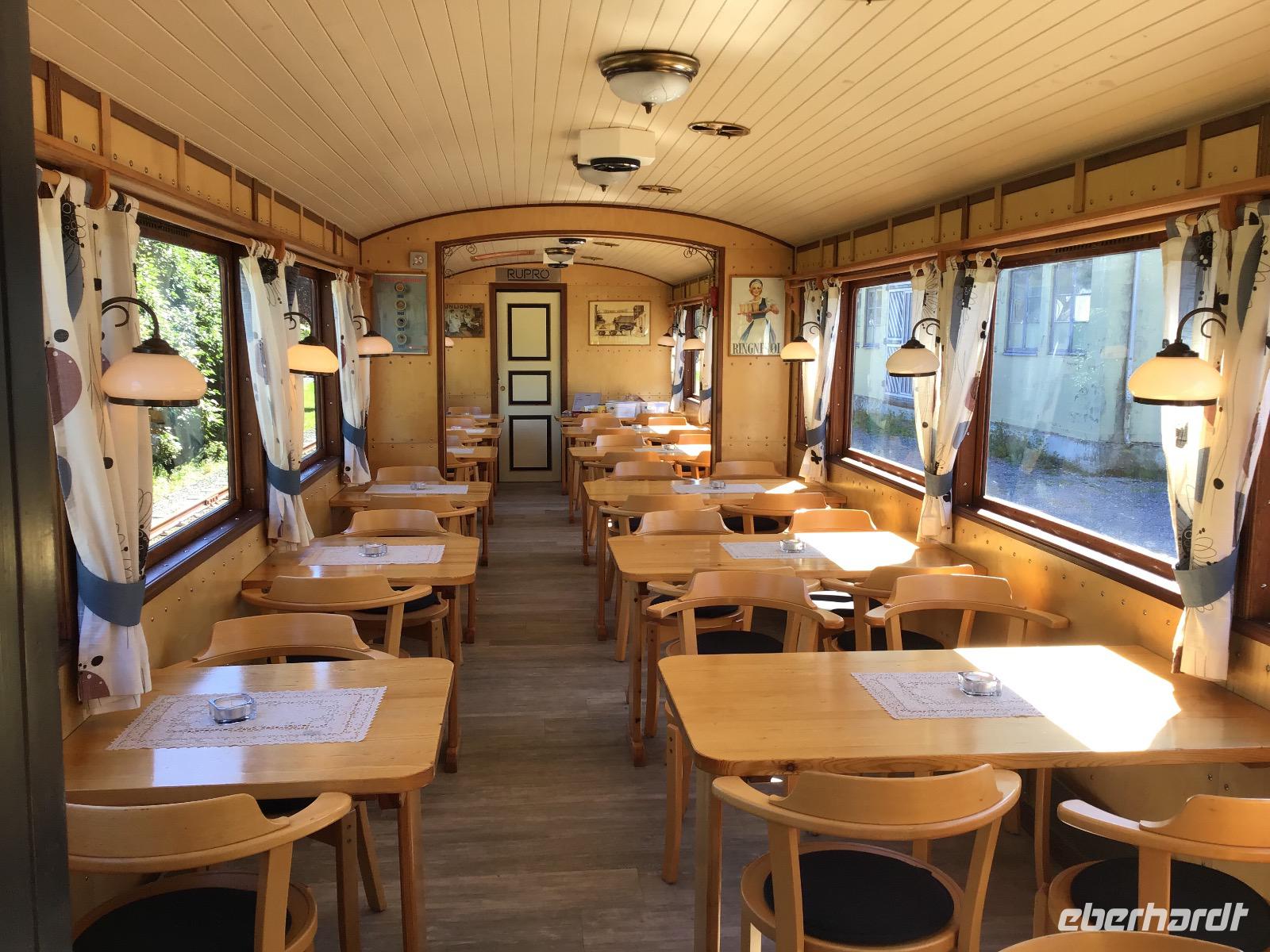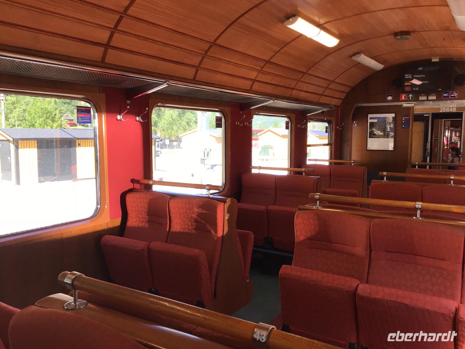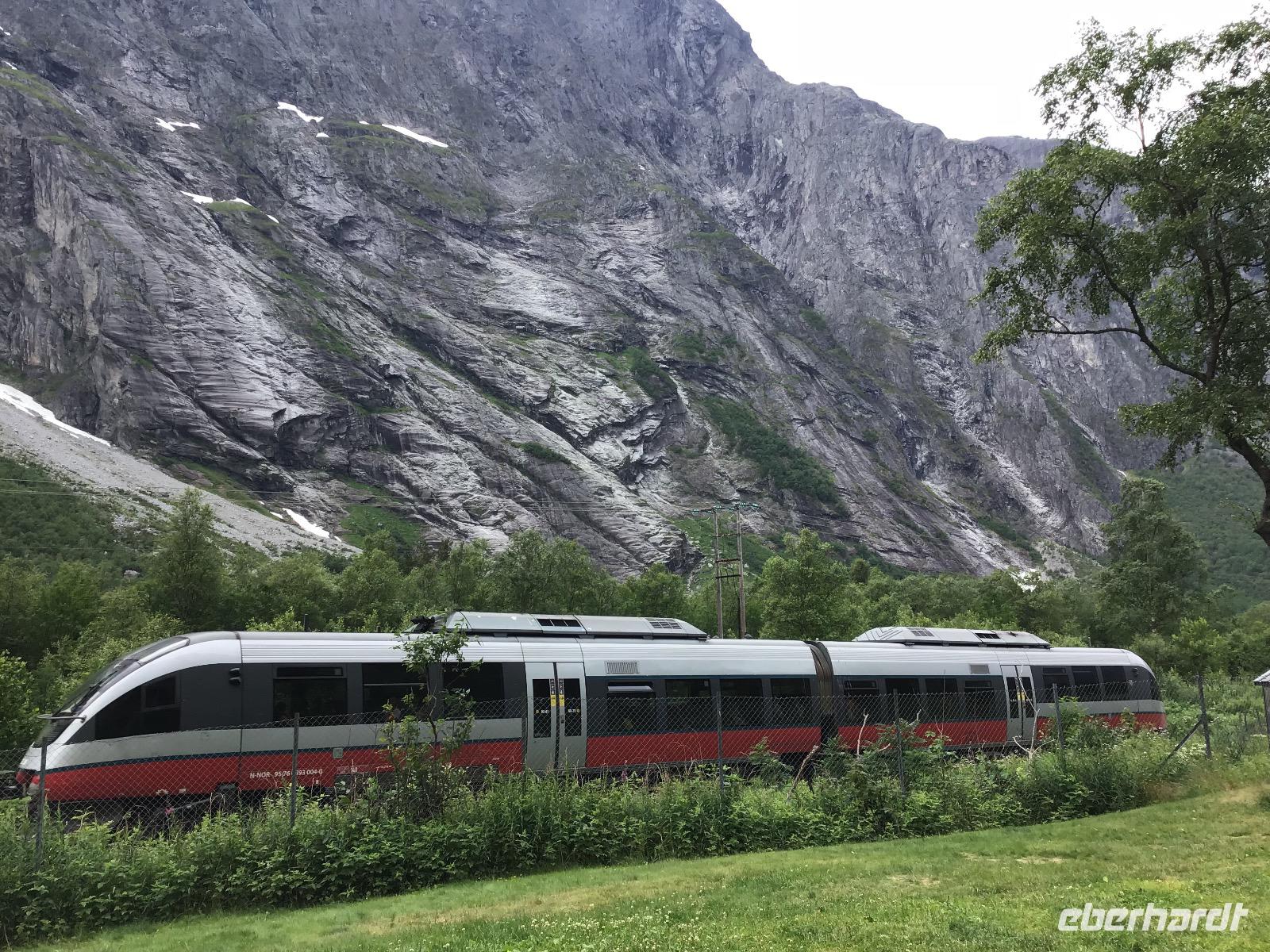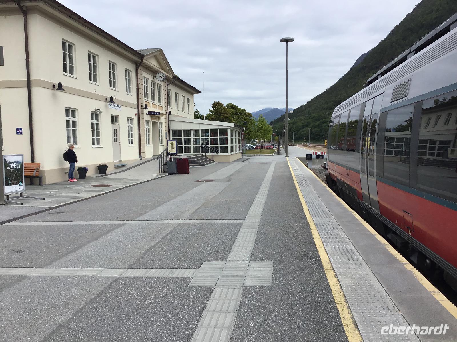 Doch nun wartet das letzte Erlebnis dieses Tages auf uns. Wir fahren mit der Raumabahn. Am Bahnhof Åndalsnes steht bereits der Zug und wartet auf uns. Ganze zwei Wagen gibt es, wovon wir einen belegen. Die Zugschaffnerin hat ihren ersten Arbeitstag heute, gibt sich aber freundlich Mühe, alle anstehenden Fragen zu klären. Einhundertvierzehn Kilometer fahren wir bis Björli, wo uns Frank abholt und uns zum Hotel in Oppdal bringt.