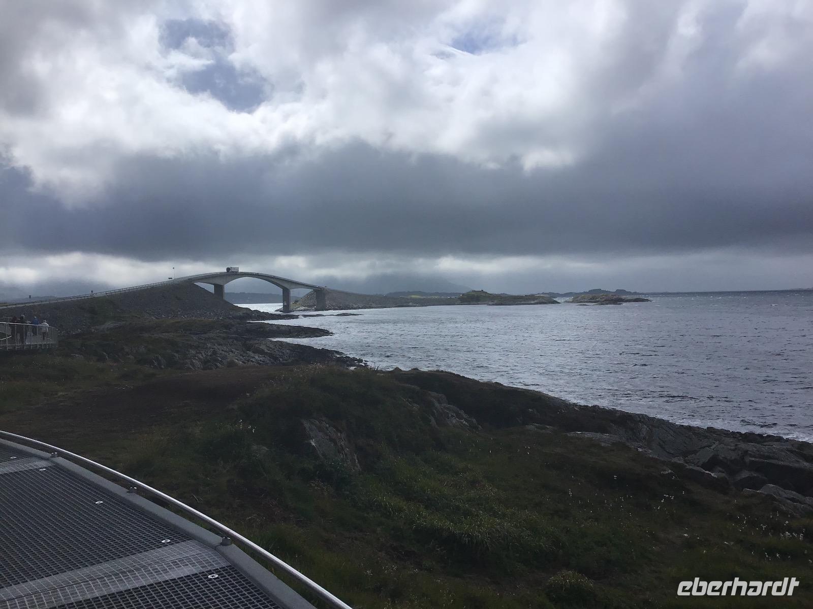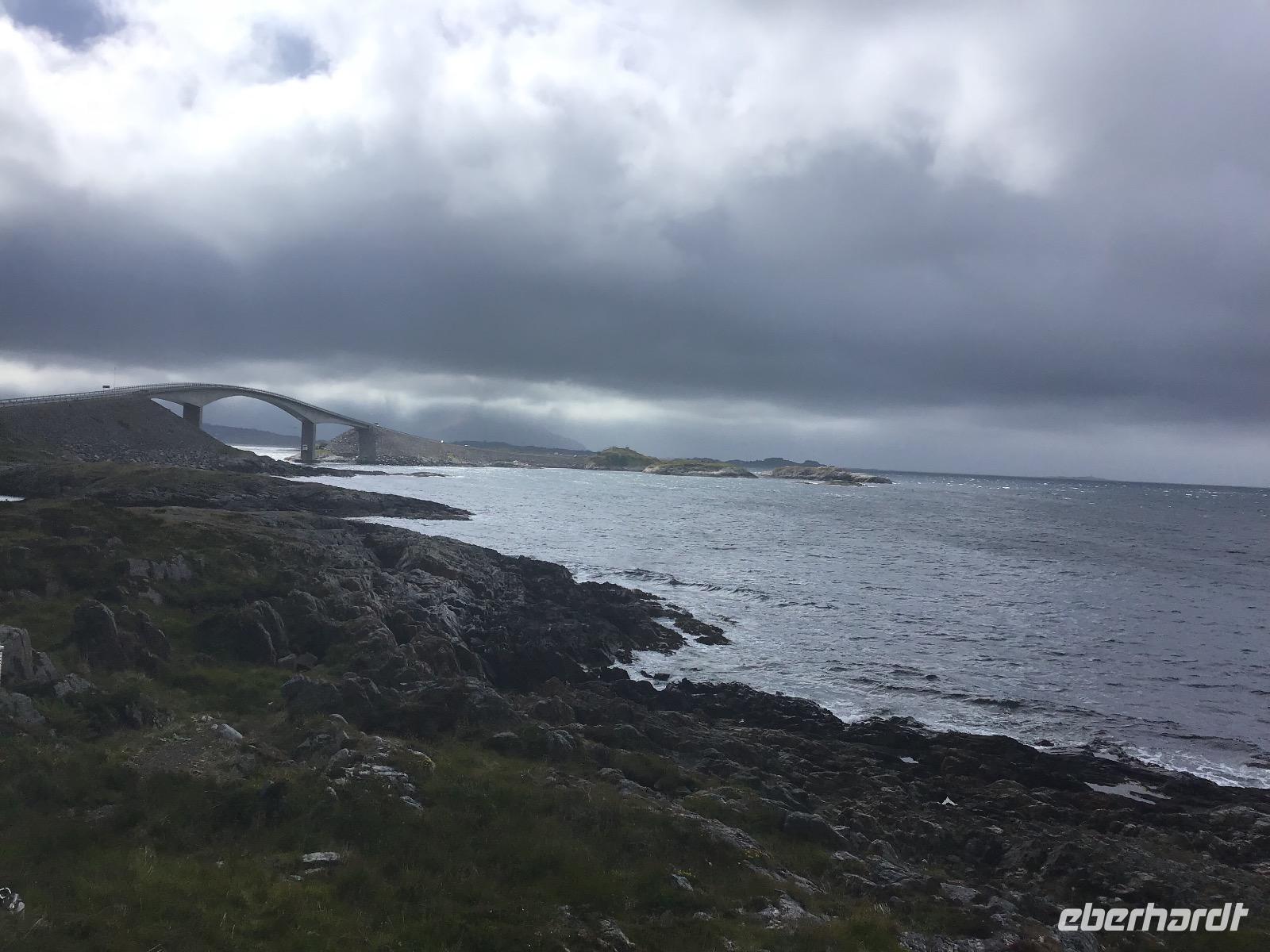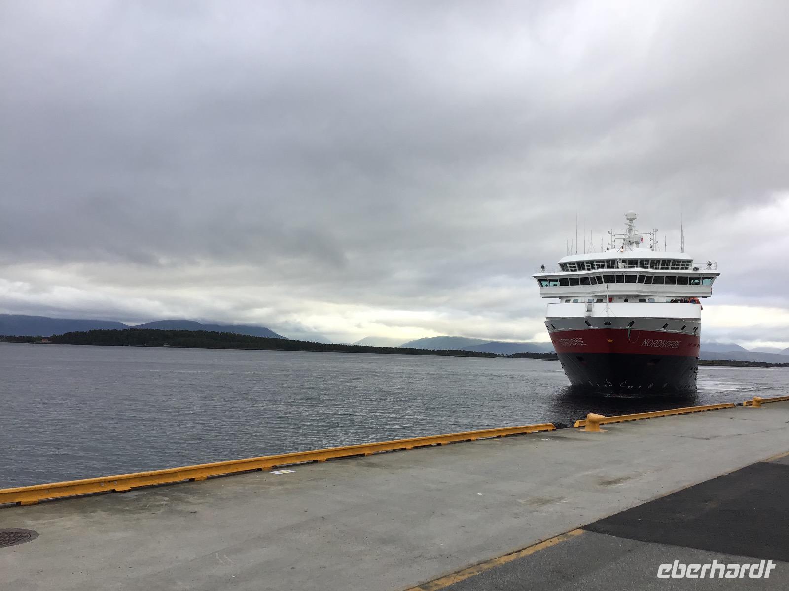 Atlantikstraße fahren wir nach Molde. Die Atlantikstraße verbindet zahlreiche Inselchen miteinander, die bis zum Bau der Straße nur mit dem Schiff erreichbar waren. 8474 Meter lang ist die Straße, die direkt am Meer entlangführt. Zwölf Brücken überqueren wir und genießen das Schauspiel von Wind und Wellen und vor allem dunklen Wolken, die heute über dem Atlantik liegen. Vom Stadtberg Varden haben wir einen traumhaften Ausblick auf Molde, allerdings pfeift der Wind hier ordentlich. Zurück in Molde speisen wir im Restaurant von Egon Olsen, bevor wir uns auf unser Hurtigruten-Schiff die MS Nordnorge begeben. Das Warten auf das Schiff der Hurtigruten ist ein wenig spannend, denn der Kai ist so unspektakulär, dass man kaum glauben kann, dass hier ein Schiff anlegen soll.
