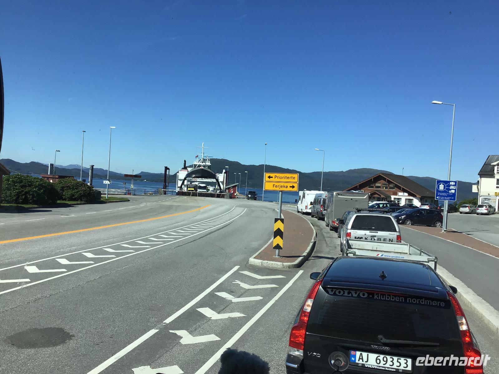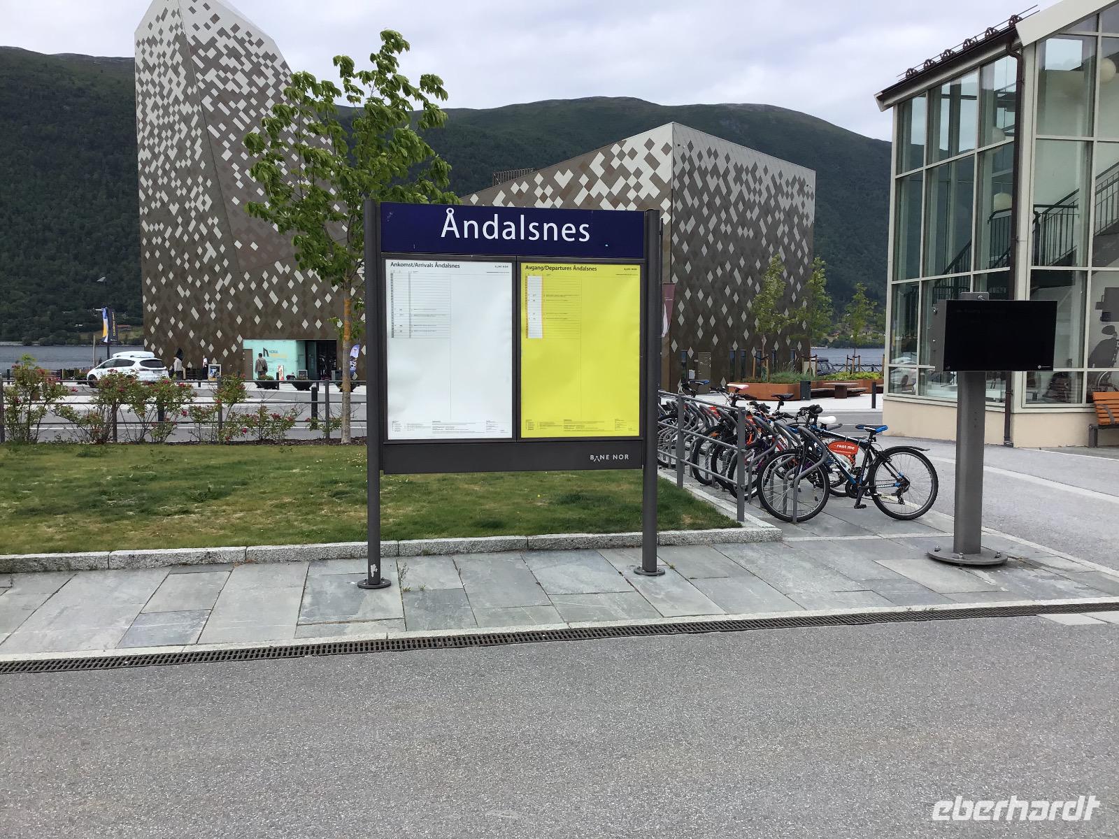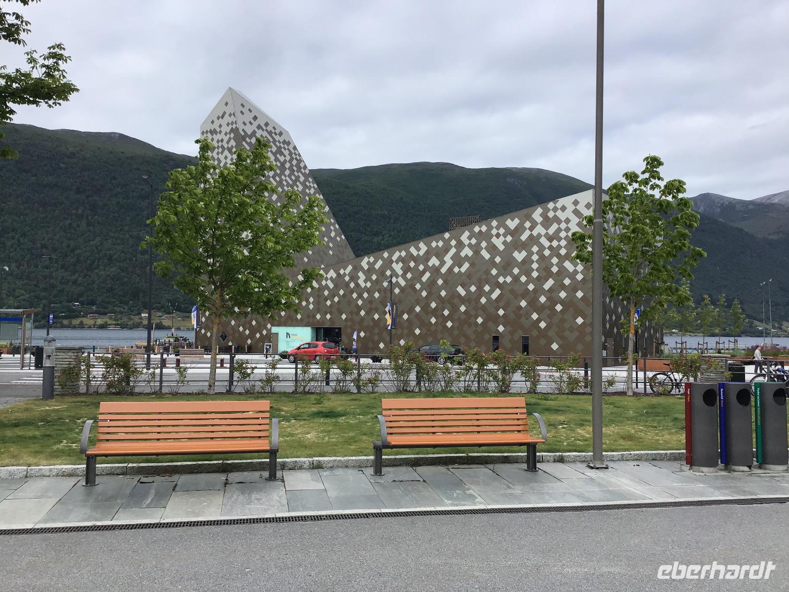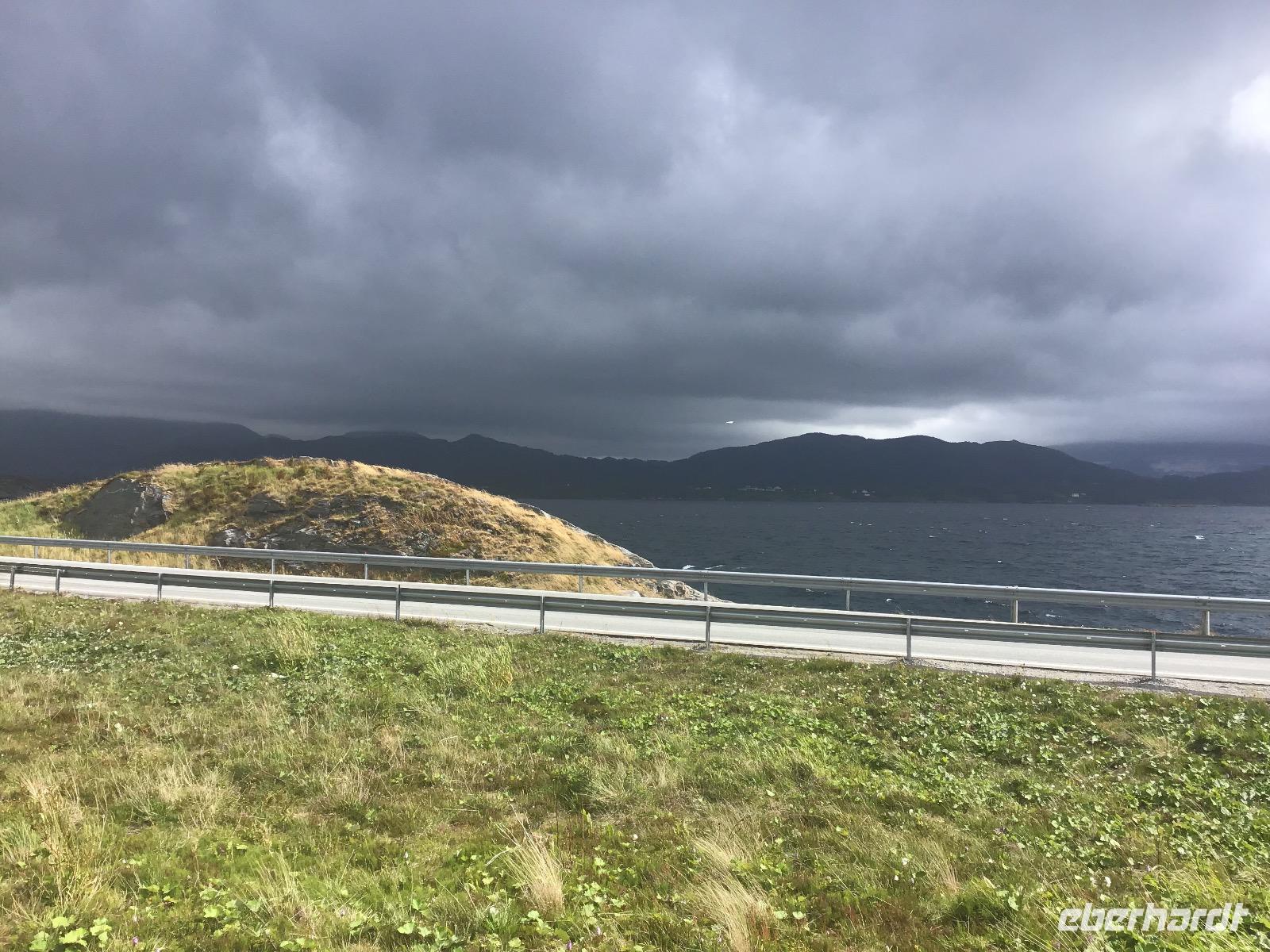 Atlantikstraße fahren wir nach Molde. Die Atlantikstraße verbindet zahlreiche Inselchen miteinander, die bis zum Bau der Straße nur mit dem Schiff erreichbar waren. 8474 Meter lang ist die Straße, die direkt am Meer entlangführt. Zwölf Brücken überqueren wir und genießen das Schauspiel von Wind und Wellen und vor allem dunklen Wolken, die heute über dem Atlantik liegen. Vom Stadtberg Varden haben wir einen traumhaften Ausblick auf Molde, allerdings pfeift der Wind hier ordentlich. Zurück in Molde speisen wir im Restaurant von Egon Olsen, bevor wir uns auf unser Hurtigruten-Schiff die MS Nordnorge begeben. Das Warten auf das Schiff der Hurtigruten ist ein wenig spannend, denn der Kai ist so unspektakulär, dass man kaum glauben kann, dass hier ein Schiff anlegen soll.