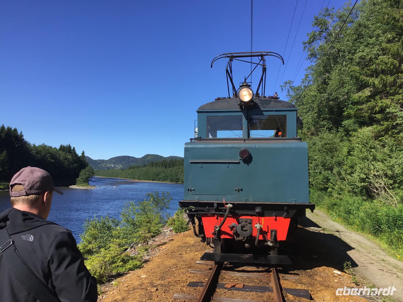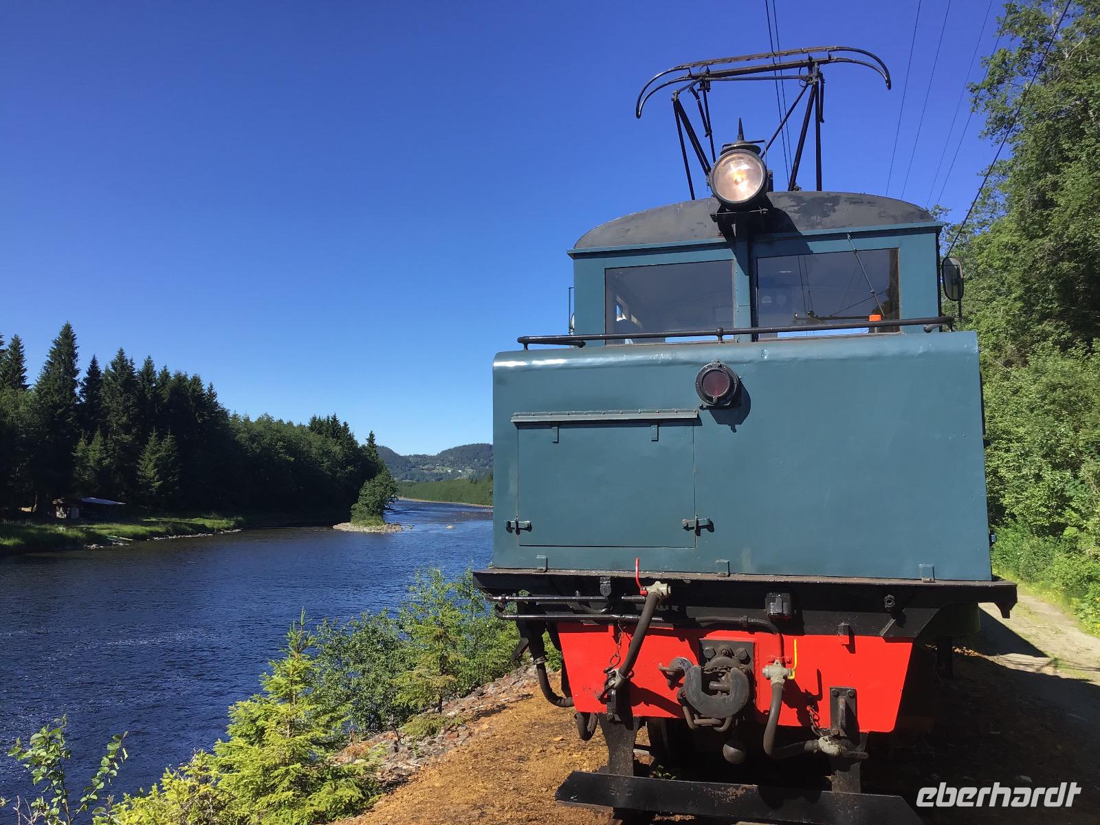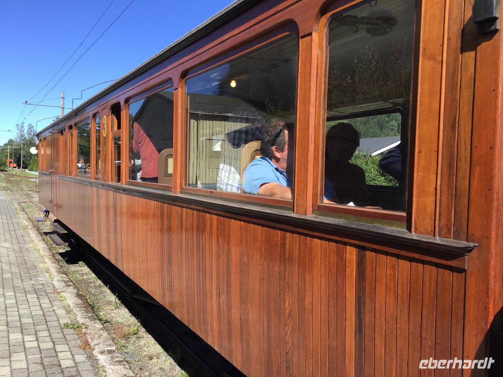 europäischem Vorbild zu errichten. Zweihundertfünfzig Jahre baute man an dem Dom und in den hunderten Jahren danach brannte er immer wieder ab. Bis heute ist der Bau nicht vollendet - denn: eine Sage besagt, dass, wenn der letzte Stein des Doms gesetzt wird, der Bau mitsamt der Stadt und allen ihren Einwohnern im Fjord versinkt. Am Nachmittag fahren wir mit der Thamshavnbanen von Bardshaug nach Løkken. Die Thamshavnbanen ist eine Museumsbahn, sie hat heute zwei Wagen, einen Personenwagen und einen Speisewagen, welcher aber heute nicht in Betrieb ist, sondern nur Dekorationszwecken dient. Wir haben das Züglein fast für uns allein. Der junge Guide gibt sich alle Mühe, uns in deutscher Sprache über Sehenswertes zu informieren. Mit lautem Zugpfeifen durchqueren wir die Dörfer, die an der Strecke liegen, immer wieder stehen Kinder an der Strecke, die uns fröhlich zuwinken. Unterwegs legen wir einen Stopp ein, an dem wir den Zug verlassen und nach Herzenslust fotografieren dürfen.