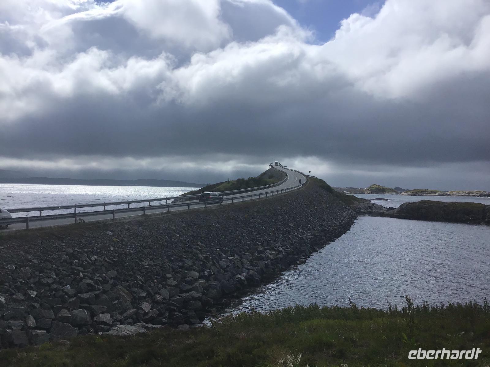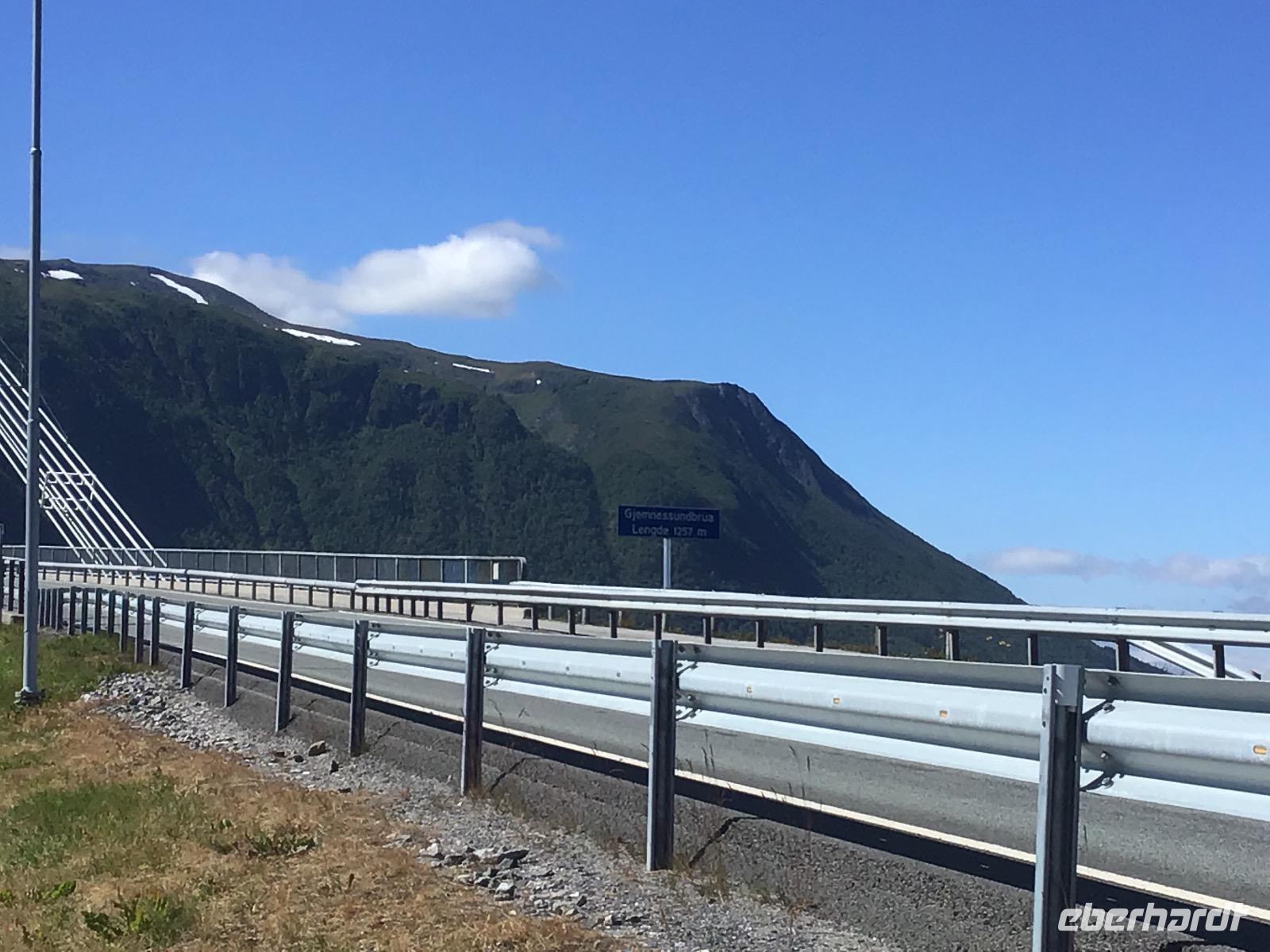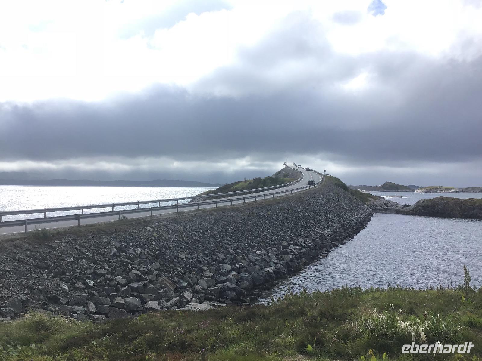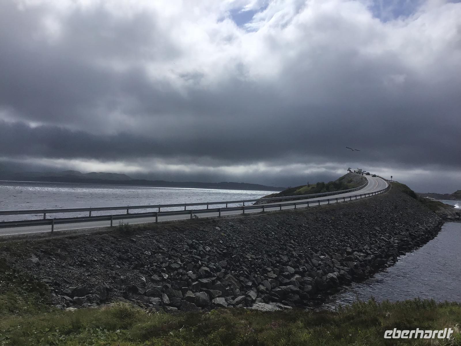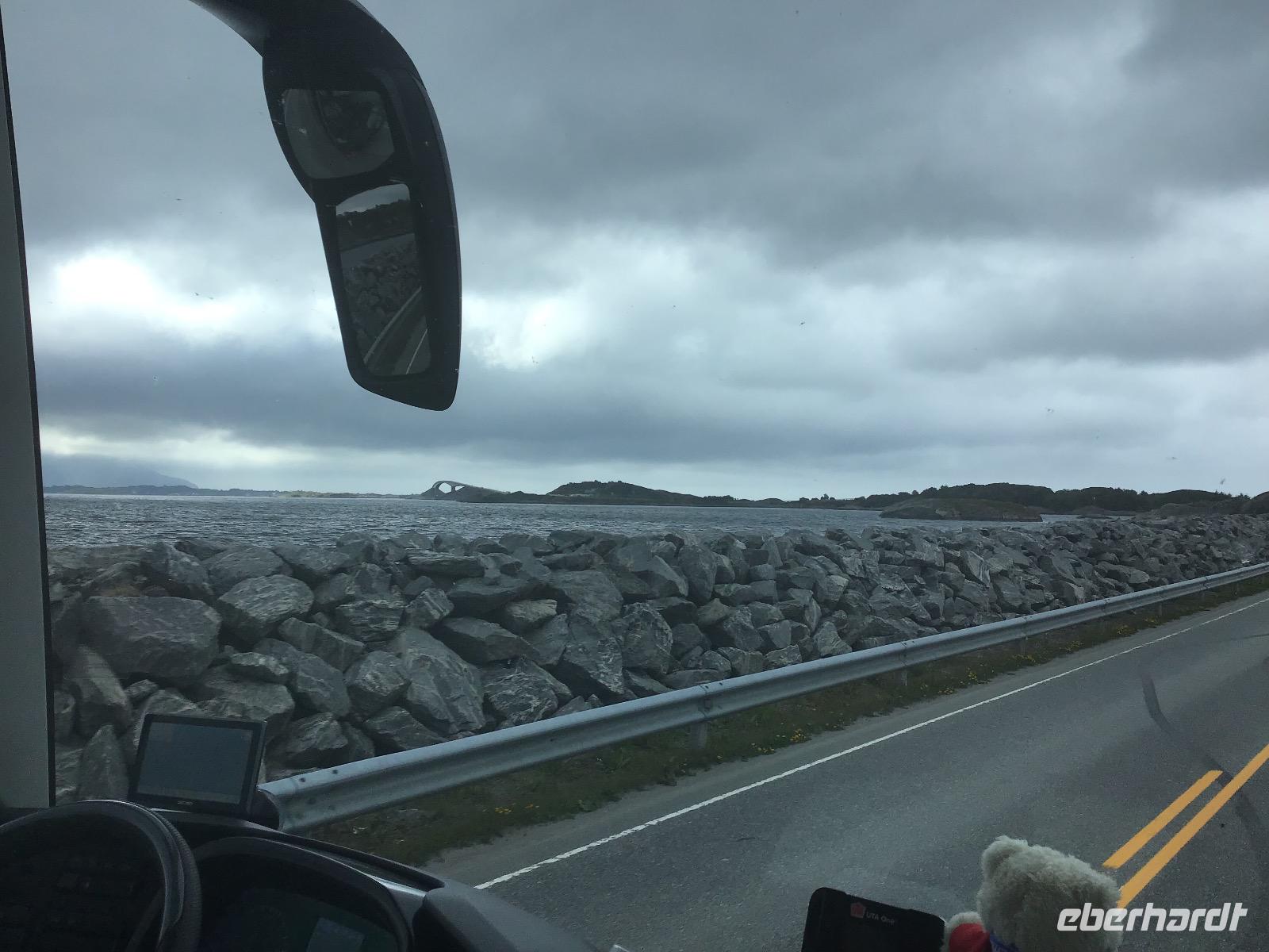 Zwei spektakuläre Brücken erwarten uns am Vormittag. Nach einer knappen halben Stunde Fahrt erreichen wir die Bersoysundbrücke, die mit 930 Metern einen Fjord überspannt, kurze Zeit später die Gjemnesundhängebrücke, die mit 1275 Metern beeindruckt. Mittagspause legen wir in Kristiansund ein. Am Hafen verkaufen Fischer frisch zubereitete Garnelen, ansonsten sind ein Kaufhaus und das Klippfischweib die größten Sehenswürdigkeiten der Stadt. Über die