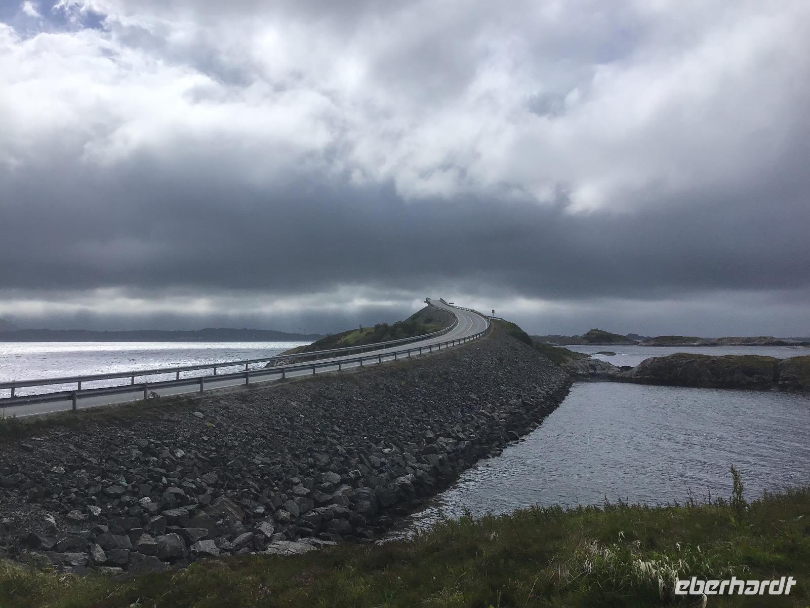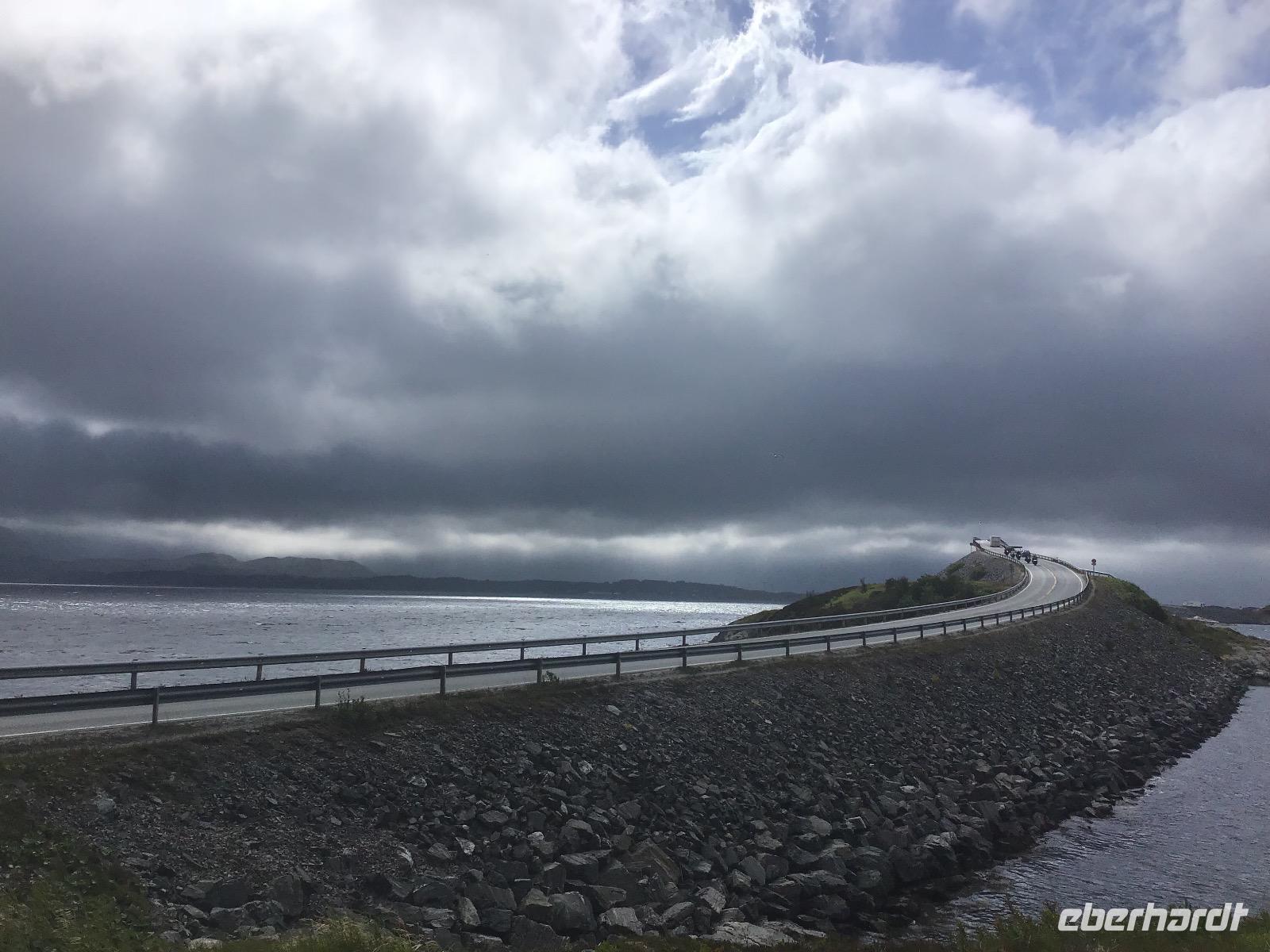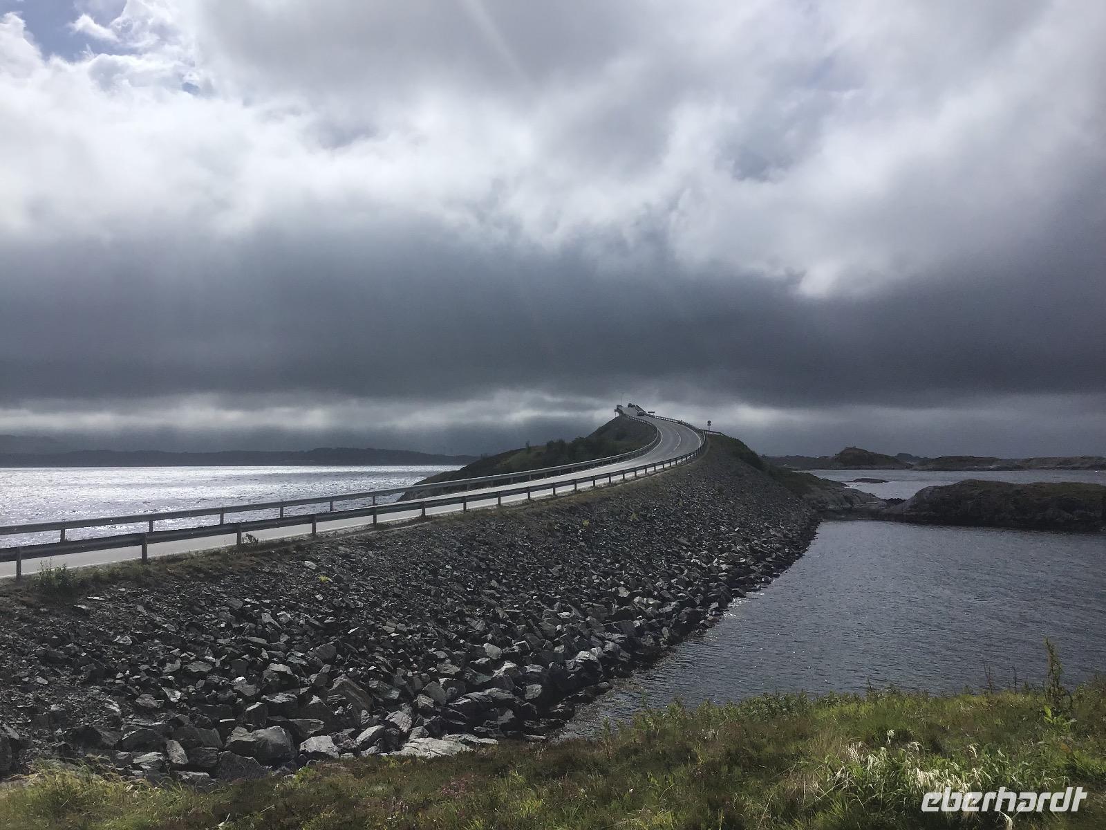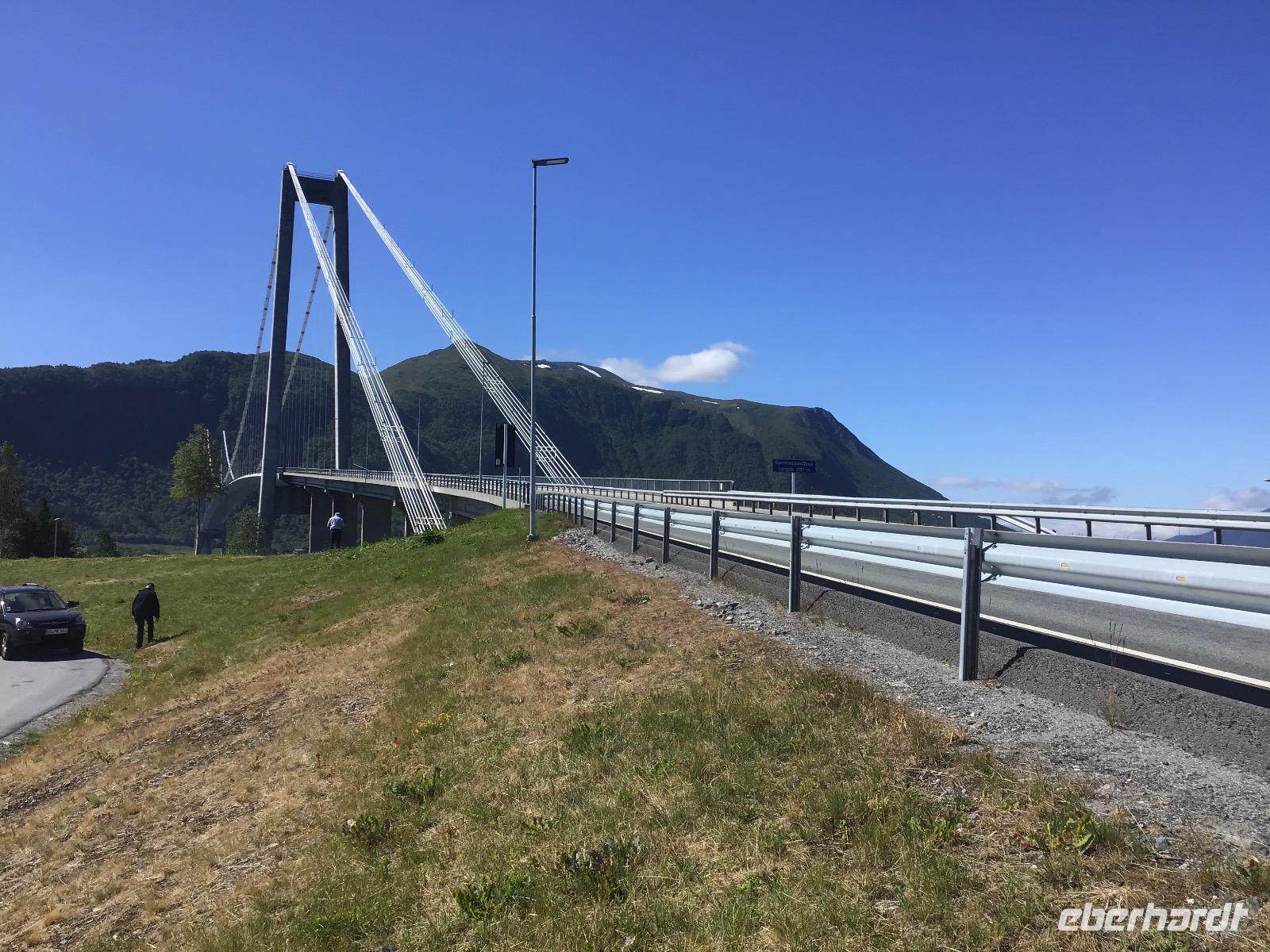 Zwei spektakuläre Brücken erwarten uns am Vormittag. Nach einer knappen halben Stunde Fahrt erreichen wir die Bersoysundbrücke, die mit 930 Metern einen Fjord überspannt, kurze Zeit später die Gjemnesundhängebrücke, die mit 1275 Metern beeindruckt. Mittagspause legen wir in Kristiansund ein. Am Hafen verkaufen Fischer frisch zubereitete Garnelen, ansonsten sind ein Kaufhaus und das Klippfischweib die größten Sehenswürdigkeiten der Stadt. Über die