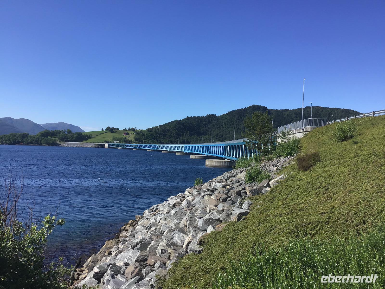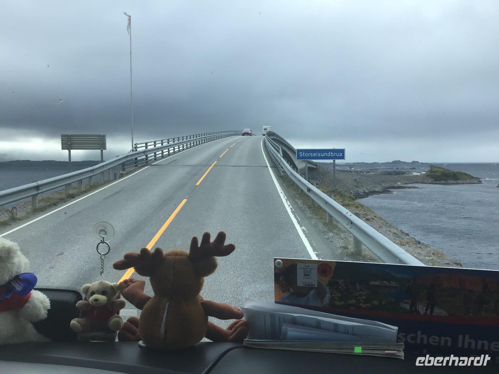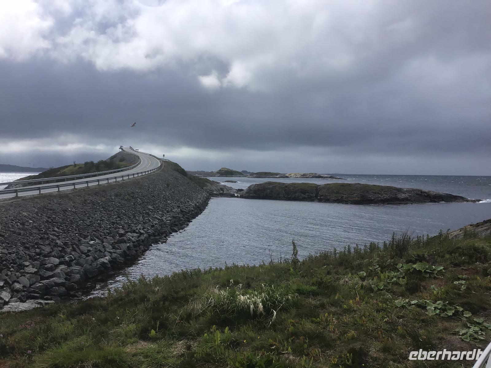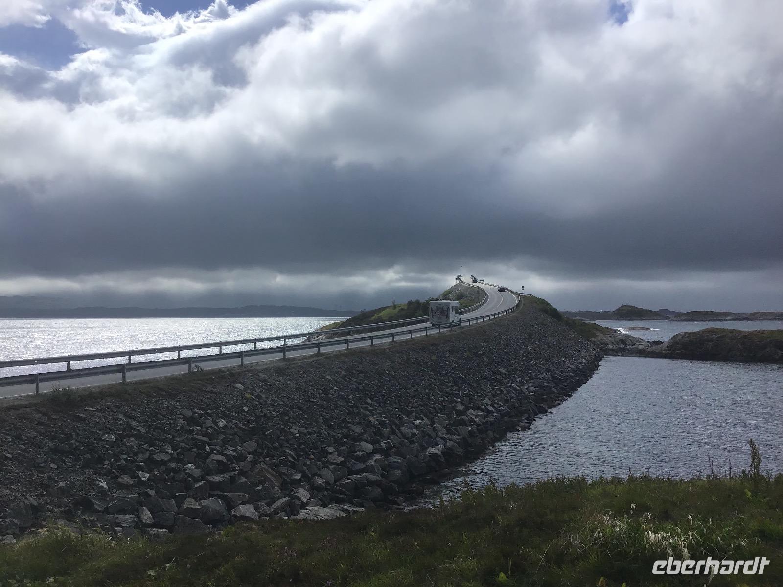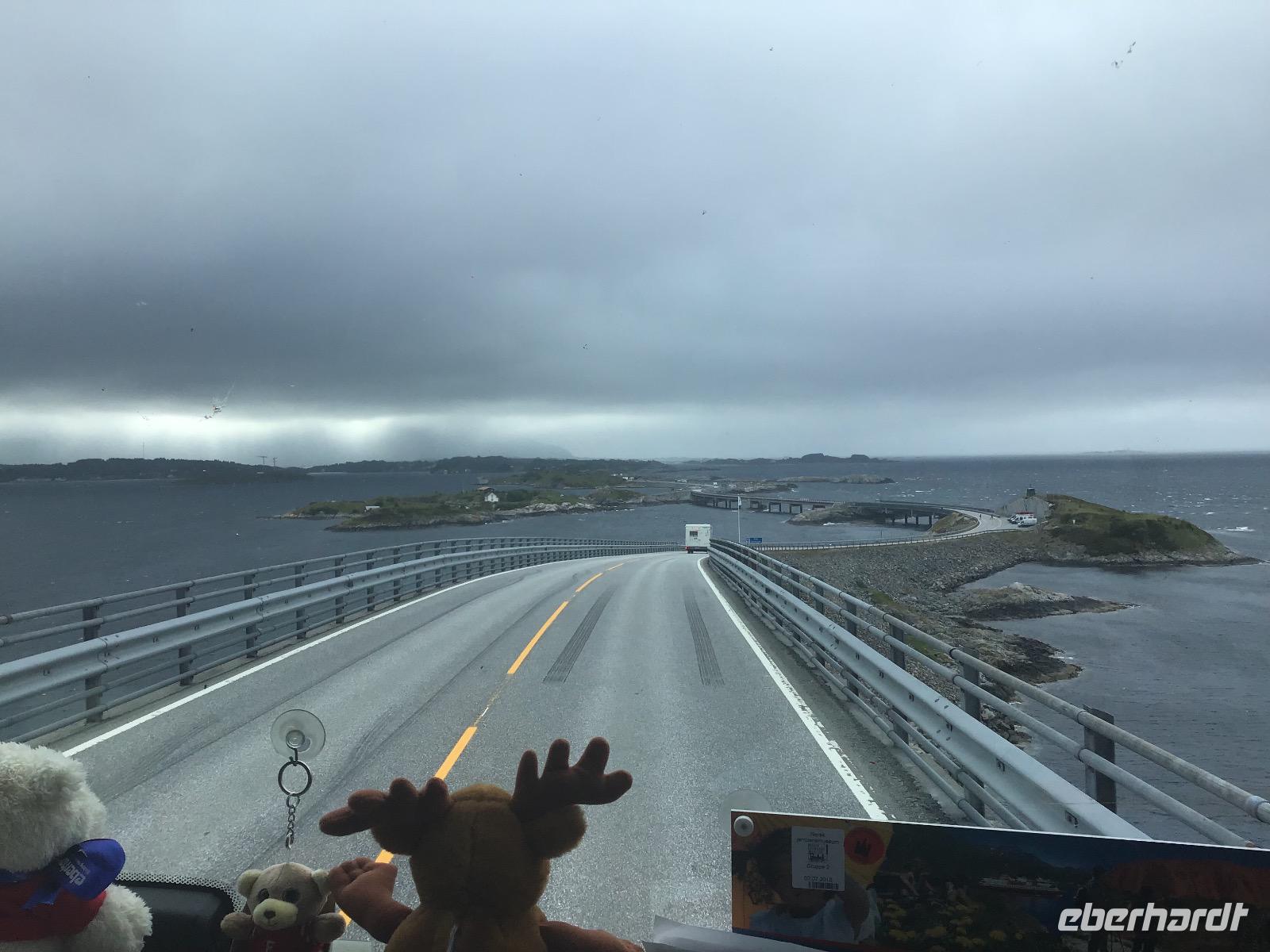 Zwei spektakuläre Brücken erwarten uns am Vormittag. Nach einer knappen halben Stunde Fahrt erreichen wir die Bersoysundbrücke, die mit 930 Metern einen Fjord überspannt, kurze Zeit später die Gjemnesundhängebrücke, die mit 1275 Metern beeindruckt. Mittagspause legen wir in Kristiansund ein. Am Hafen verkaufen Fischer frisch zubereitete Garnelen, ansonsten sind ein Kaufhaus und das Klippfischweib die größten Sehenswürdigkeiten der Stadt. Über die