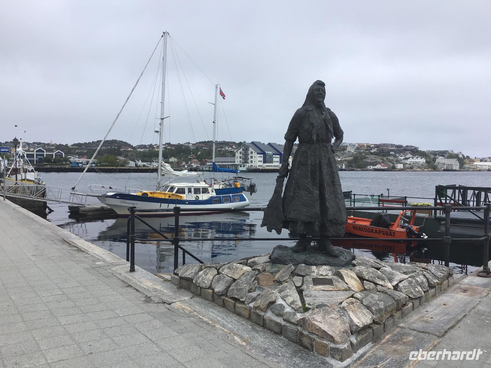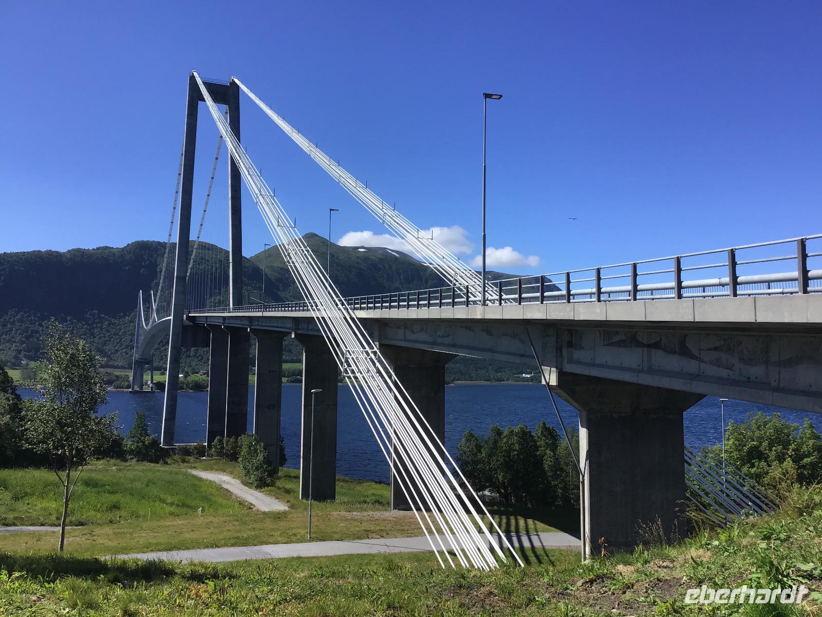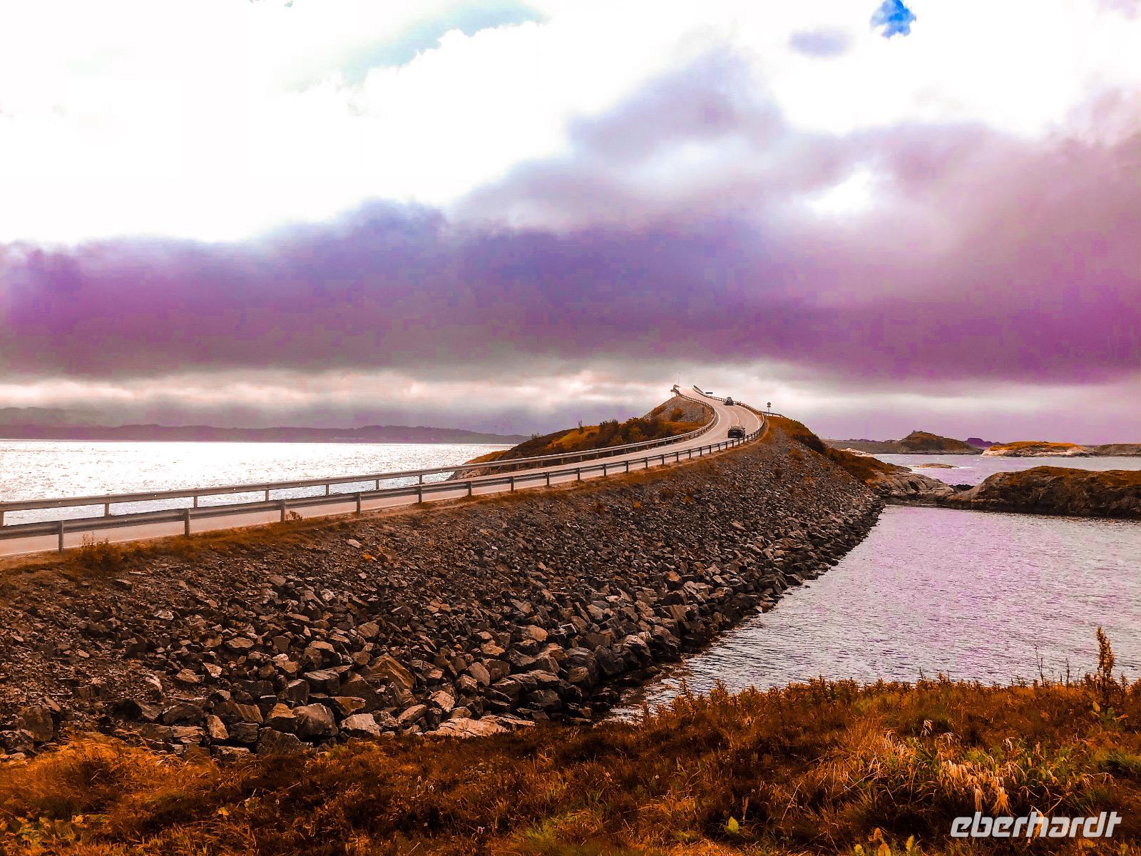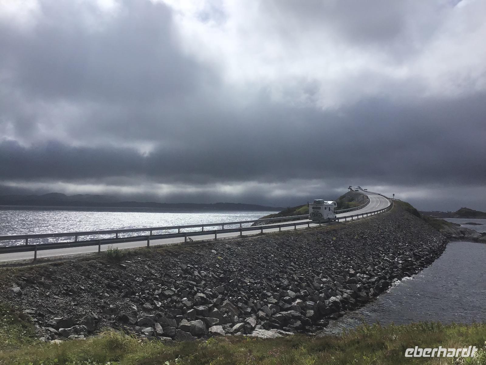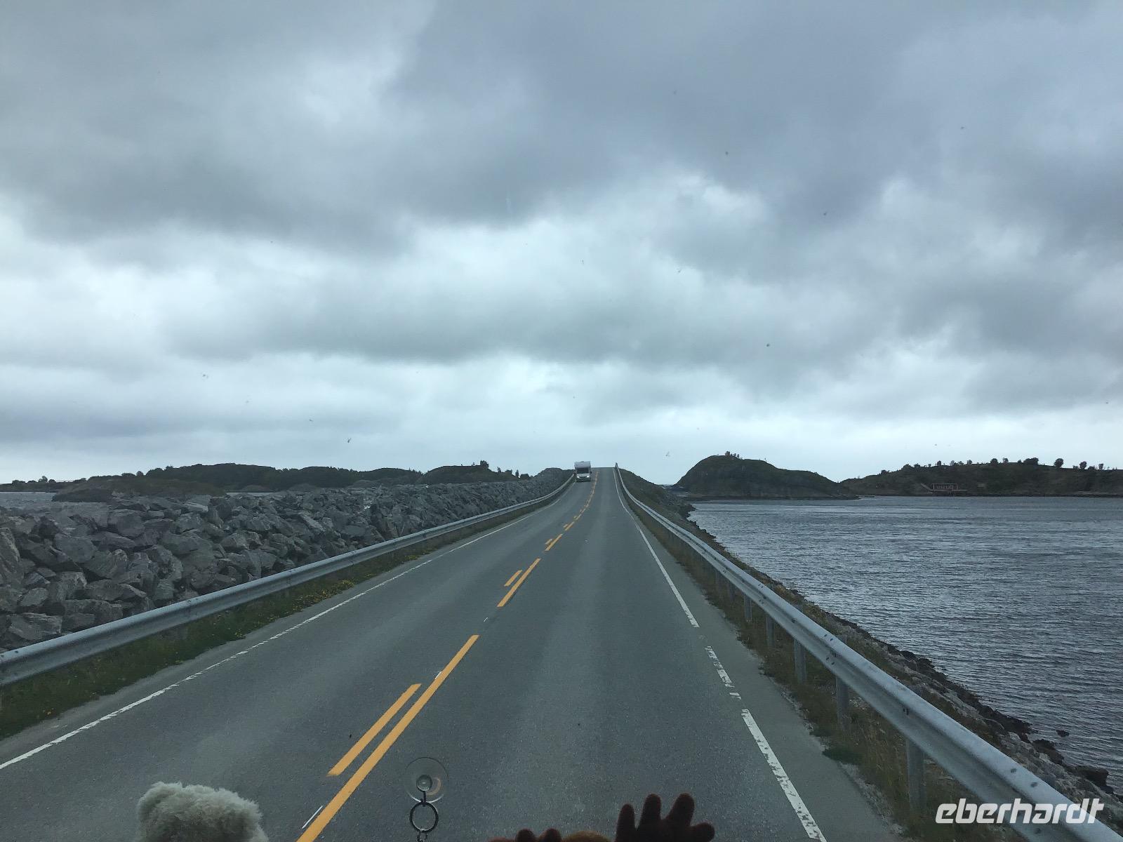 Zwei spektakuläre Brücken erwarten uns am Vormittag. Nach einer knappen halben Stunde Fahrt erreichen wir die Bersoysundbrücke, die mit 930 Metern einen Fjord überspannt, kurze Zeit später die Gjemnesundhängebrücke, die mit 1275 Metern beeindruckt. Mittagspause legen wir in Kristiansund ein. Am Hafen verkaufen Fischer frisch zubereitete Garnelen, ansonsten sind ein Kaufhaus und das Klippfischweib die größten Sehenswürdigkeiten der Stadt. Über die