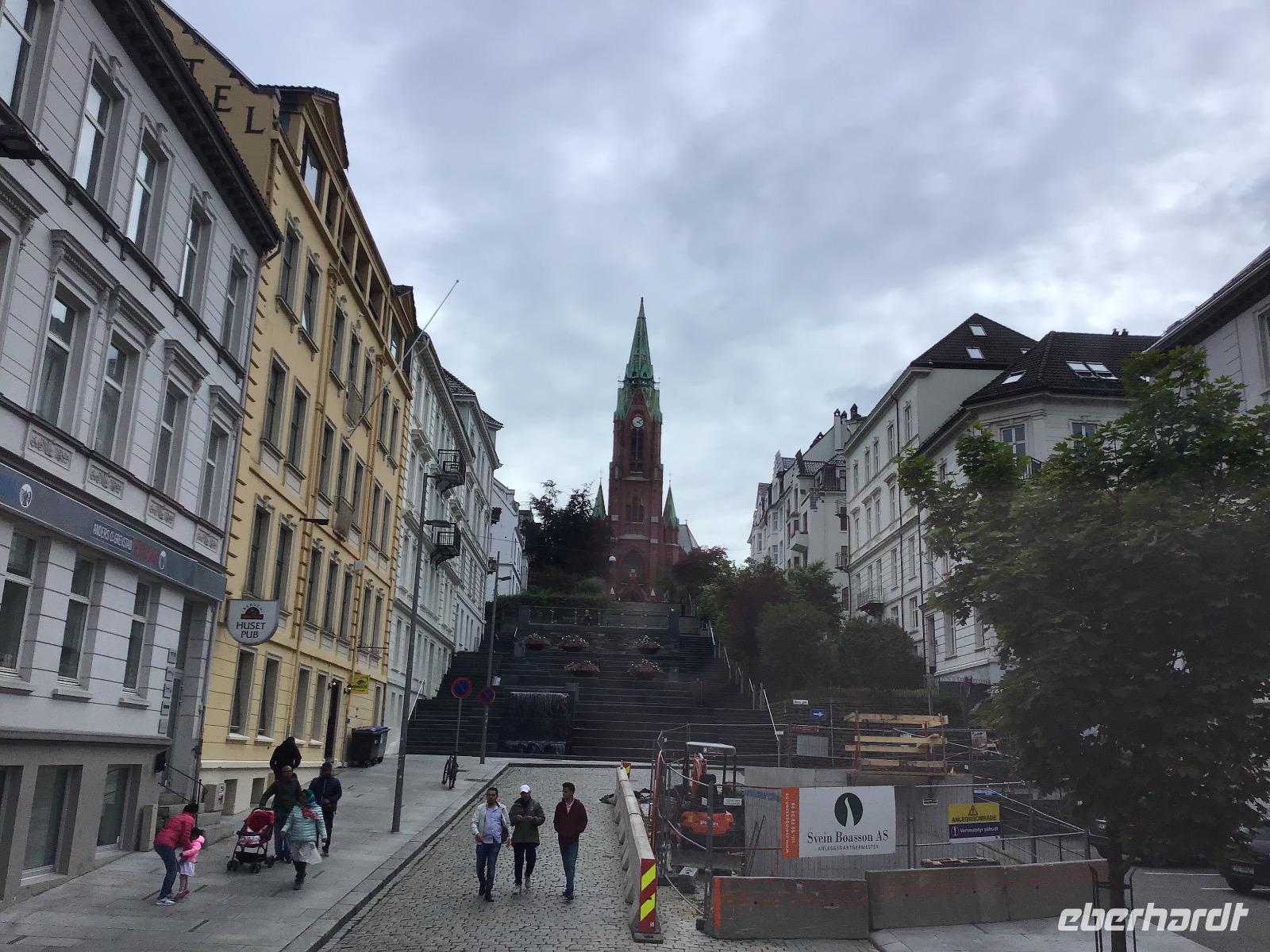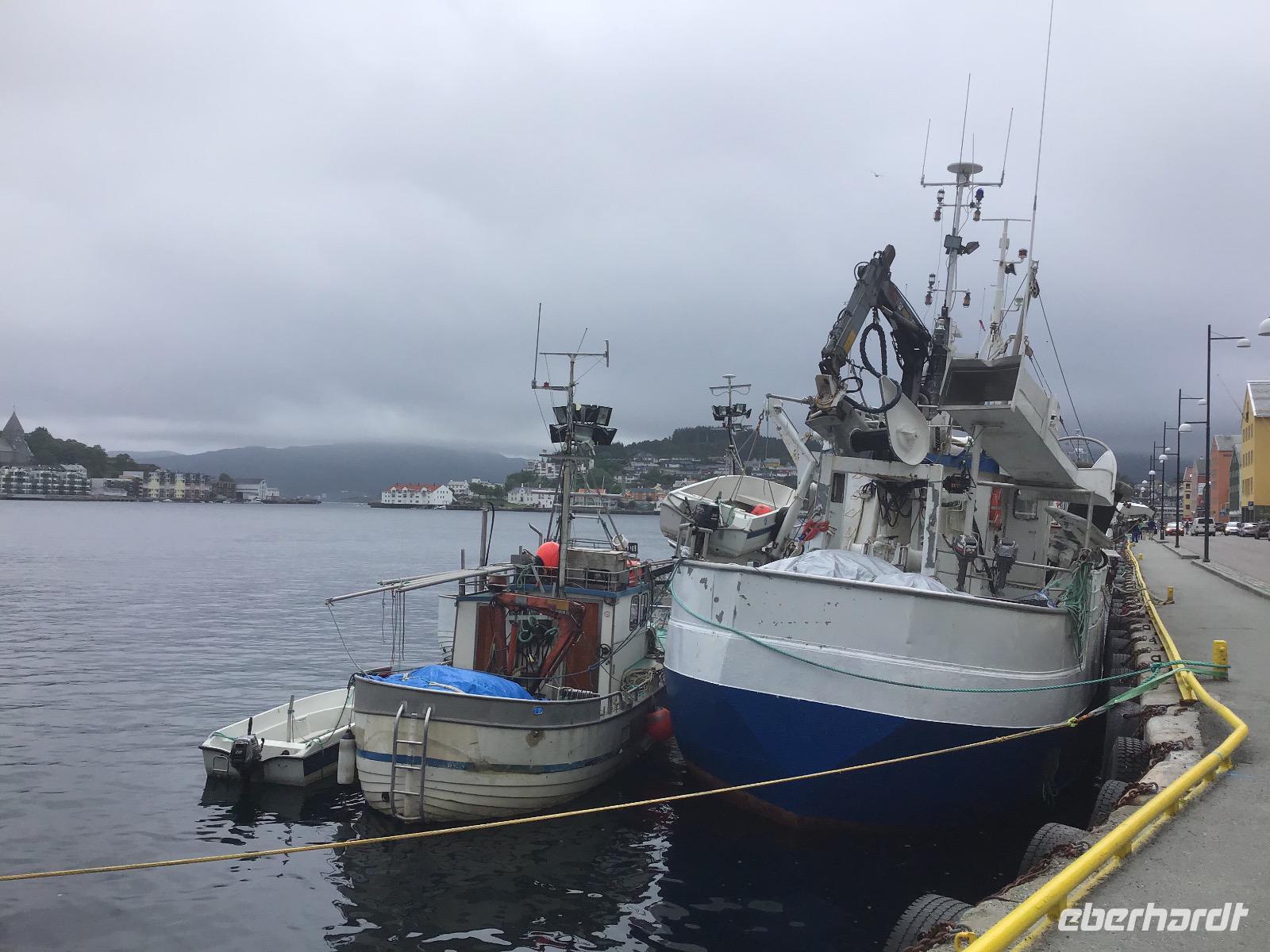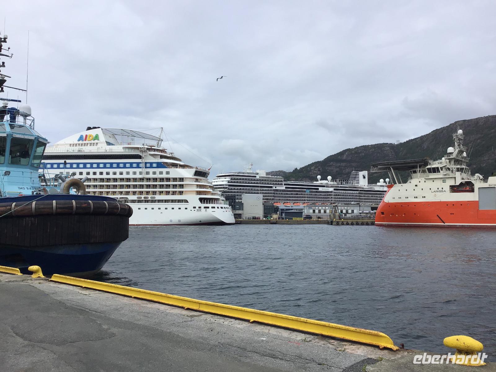 Oh oh, da sind aber einige ein bisschen weiß um die Nase. Das hat aber auch ordentlich geschaukelt, unser Hurtigrutenschiff. Mehrmals in der Nacht haben wir an- und abgelegt, am Morgen gab es ein üppiges Frühstücksbuffet und bis zum Nachmittag genießen wir (mehr oder weniger) unsere Kreuzfahrt. In Bergen angekommen, ist unsere Stadtführerin bald da, auf den Bus müssen wir ein paar Minuten warten - oh, diese norwegischen Baustellen! Zwei Stunden fahren und laufen wir dann durch Bergen, die pittoreske alte Hansestadt. Vom Floien, den wir mit der Floienbahn erreichen, können wir über die ganze Stadt schauen. Der Fischmarkt hat bis 23 Uhr geöffnet und kann auch noch nach dem Abendessen ausgiebig erkundet werden. Jeder kann sich die Zeit nach eigener Wahl einteilen. Unser Scandic Hotel Neptun liegt so zentral, dass alles zu Fuß erreichbar ist.