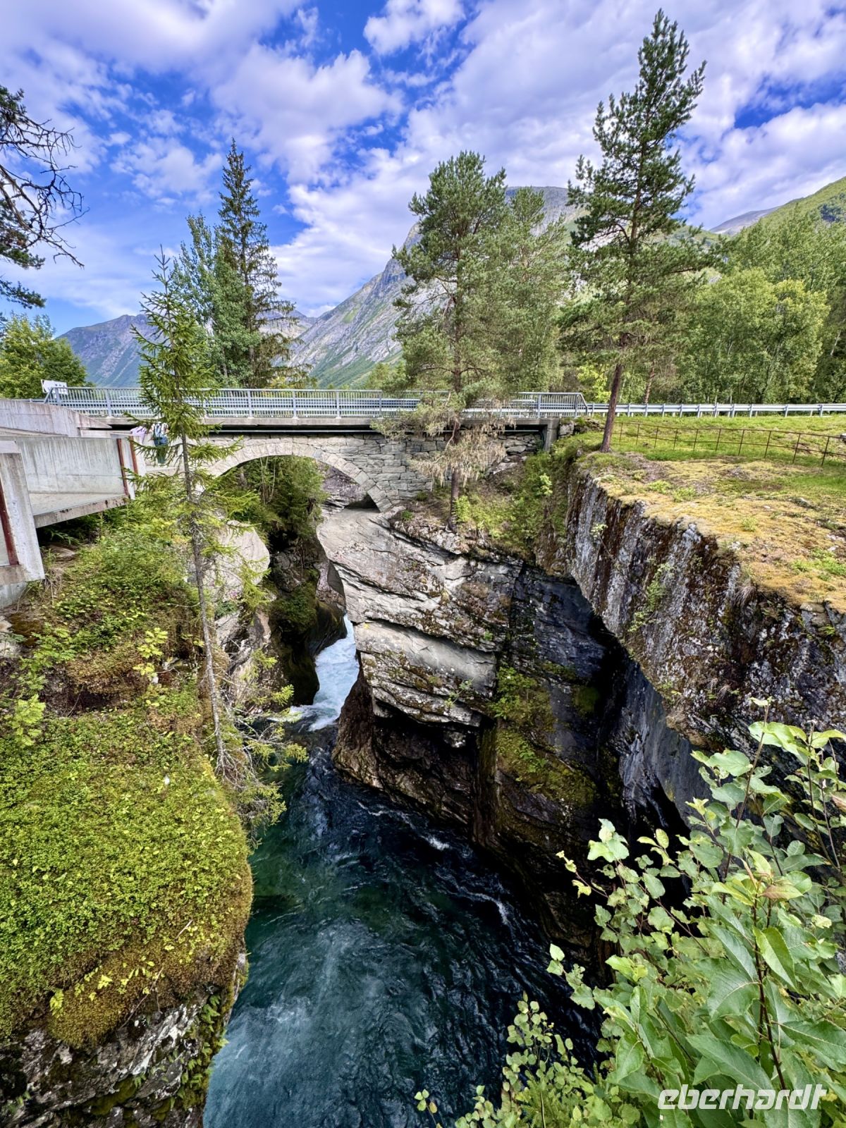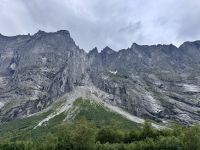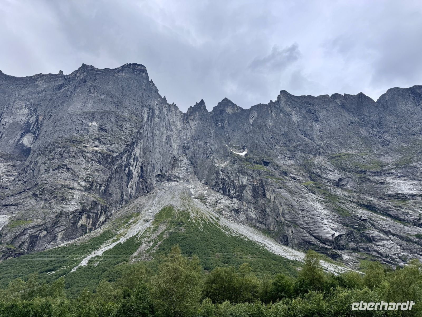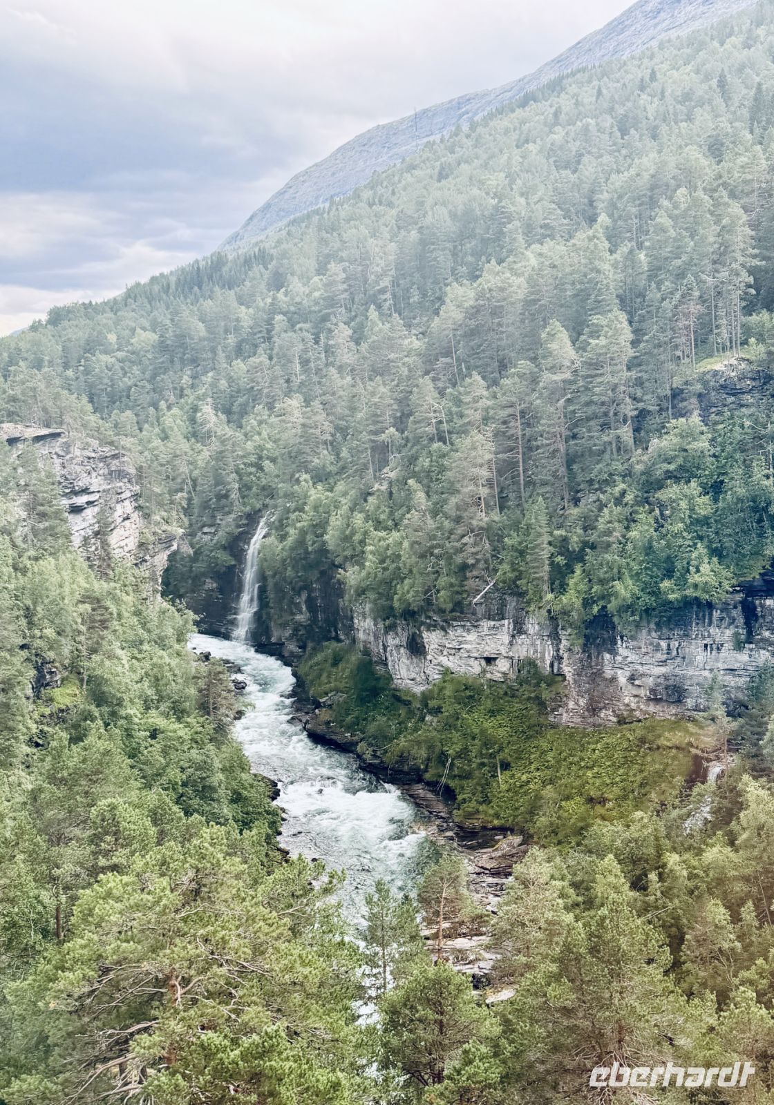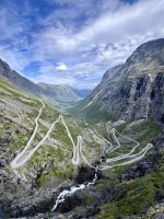 Nach einem gemütlichen Frühstück brechen wir am Morgen auf zu einem weiteren spannenden Tag in Norwegen. Vorbei am Geirangerfjord, in dem bereits in den frühen Morgenstunden 2 große Kreuzfahrtschiffe angelegt haben, geht es für uns zur bekannten Adlerstraße. Unser Busfahrer Uwe bringt uns sicher die elf Haarnadelkurven hinauf. In der letzten Kurve, die Örnesvingen heißt, ist eine Aussichtsplattform angelegt, von der wir noch einmal einen letzten traumhaften Blick auf den Geirangerfjord genießen. Weiter geht es durch das fruchtbare Valldal, in dem die verschiedensten Obstsorten angebaut werden, bis zur Gudbrands-Schlucht. Das Wasser sprudelt hier aus den Felsen und stürzt sich mit lautem Getöse auf der anderen Seite wieder hinab. Für staunende Touristen sind Wege darüber angelegt, sodass wir mit fasziniertem Blick den Naturgewalten folgen können ohne uns jeglicher Gefahr auszusetzen. Weiter und weiter fahren wir durch ein Wunderland in Richtung Trollstigen. Nach jeder Kurve öffnet sich ein neuer fantastischer Blick. Oberhalb des Trollstigen legen wir eine lange Pause ein. Leider bleibt uns die Fahrt über die berühmte Serpentine in diesem Jahr aus Sicherheitsgründen leider verwehrt. Doch oberhalb der Straße wurde speziell für Touristen eine Aussichtsplattform angelegt, die sich über mehrere Ebenen erstreckt. Von hier aus haben wir heute bei perfektem Wetter und klarer Sicht einen faszinierenden Blick über den Trollstigen und das dahinterliegende Tal. Mit diesen tollen Eindrücken brechen wir am frühen Nachmittag in Richtung Åndalsnes auf. Aufgrund der Sperrung des Trollstigen müssen wir nun einen etwas längeren Umweg in Kauf nehmen, eine gute Möglichkeit für uns die Eindrücke der letzten Tage zur verarbeiten und ein kleines Mittagsschläfchen zu halten. Wir kommen gut durch und haben sogar noch etwas Zeit und so entschließen wir uns, bevor wir zum Bahnhof nach Åndalsnes fahren, die Trollwand in Augenschein zu nehmen. Unterhalb der höchsten, senkrecht abfallenden Felswand bekommt man eine Vorstellung von der Größe dieser bis zu 1800 Meter hohen Bergformation. Zwischen den Gipfeln ragen kleinere Zinnen wie zerbrechliche Nadelspitzen in den Himmel. Wie Trolle, die dafür sorgen, dass kein menschliches Wesen die Gipfel der über 1000 Meter senkrecht aufsteigenden und 50 Meter überhängenden Felswand erreichen kann. Und tatsächlich schien es lange Zeit unmöglich Trollveggen zu durchklettern. Erst im Jahr 1965 gelang es einer norwegischen und einer englischen Seilschaft die Wand zu bezwingen. Mit tollen Aufnahmen setzen wir dann unseren Weg nach Åndalsnes fort, wo das letzte Erlebnis dieses Tages auf uns wartet. Wir fahren mit der Raumabahn, durch das schöne Raumatal, genießen die Aussicht aus dem Zug und erreichen am späten Nachmittag den Bahnhof von Bjorli. Hier wartet unser Busfahrer Uwe schon und bringt uns anschließend über die karge Landschaft des Dovrefjells, bevor wir unser gemütliches Hotel in Oppdal erreichen.