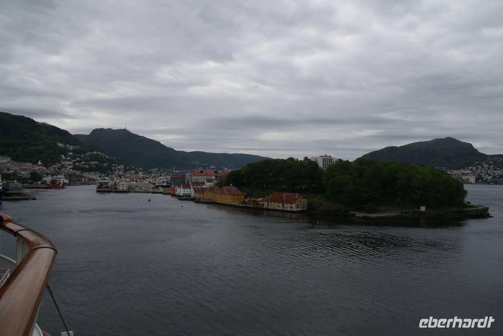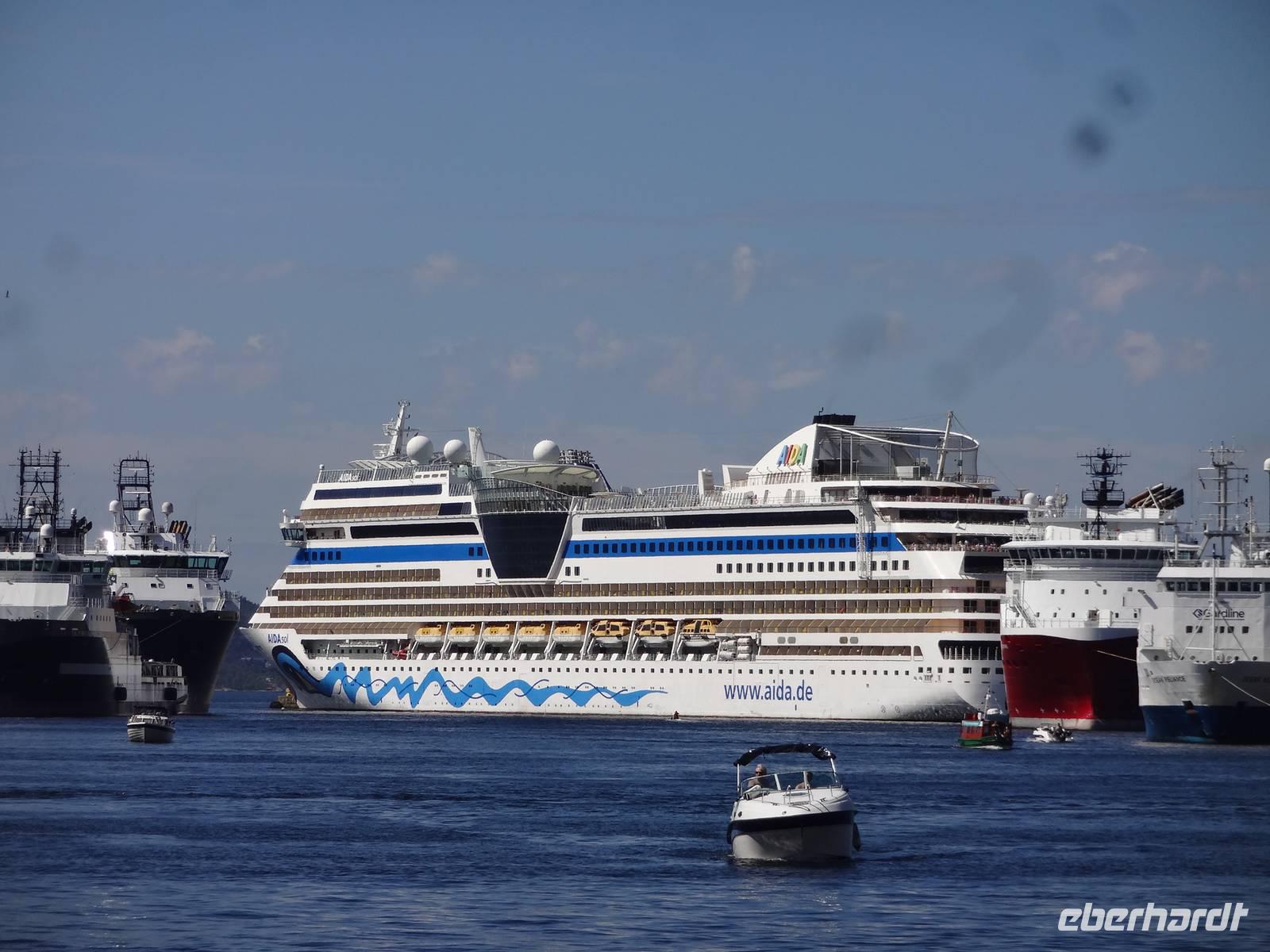 Nachdem das Schiff seit den frühen Morgenstunden bereits in die Fjordlandschaft eingetaucht war, legten wir mit leichter Verspätung gegen halb 10 in der zweitgrößten Stadt Norwegens an. Unsere Reiseleiterin Katrin begrüßte uns direkt vor dem Schiff und begann mit uns den halbtätigen Spaziergang durch Ihre Wahlheimat - Bergen. Zunächst führte uns der Weg zur Hakonshalle, der Festhalle, und dem Rosenkranz-Turm. Weiter ging es in Richtung Bryggen - dem Kaufmannsviertel der Hanse und UNESCO-Weltkulturerbe. Nach einer kleinen Verschnaufpause ging es weiter zum Hanseatischen Museum, das uns in die vergangene Zeit eintauchen ließ. Pünktlich zur Mittagszeit, nachdem die Sonne bereits den Weg durch die anfänglich dichten Wolken gefunden hatte, sollten wir zum Hausberg, dem Floyen, auffahren. Nach etwas Wartezeit, weil bei dem wunderbaren „Kaiser-Wetter" so ziemlich jeder Tourist den Berg mit der Floibahn erklimmen wollte, belohnten wir uns mit einem fantastischen Ausblick auf die Stadt und die sie umgebende Natur. Wieder unten angekommen, ließen wir die Tour beim berühmten Fischmarkt ausklingen. Den Nachmittag vertrieben sich alle Gäste ganz individuell - bei bestem Wetter an Deck von AIDAsol - dem Sonnenschiff - oder bei einem weiteren Spaziergang durch die 260.000 Einwohner-Stadt. Ein weiterer Höhepunkt des Tages war sicher das abendliche Auslaufen aus Bergen. Alle fünf Schiffe, die am Tag in der Stadt festgemacht hatten, legten nach und nach ab und verließen die Hafenstadt.