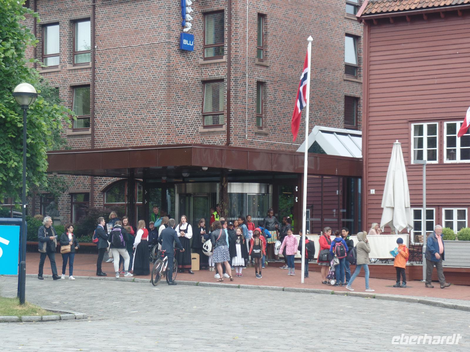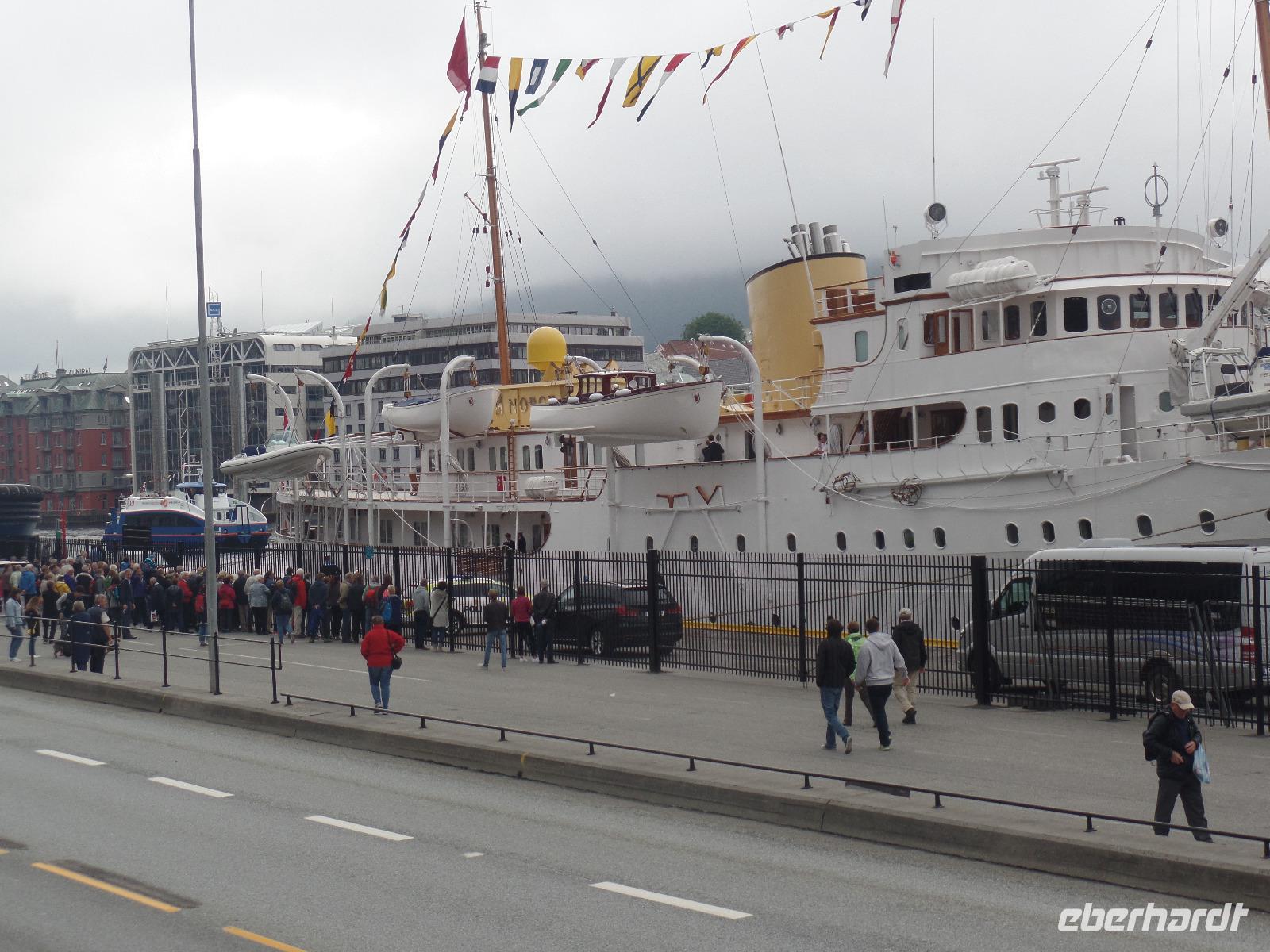 Mit einem kleinen Lied stimmt sie uns auf das Land Norwegen und das Königspaar von Norwegen ein. Denn auch das ist ein weiteres Highlight unserer Schiffsreise entlang der Fjordwelt Norwegens. Der König von Norwegen ist an diesem Tag mit seiner Fami8lie auch in Bergen zu Besuch und wir haben die Gelegenheit diesen zu sehen.