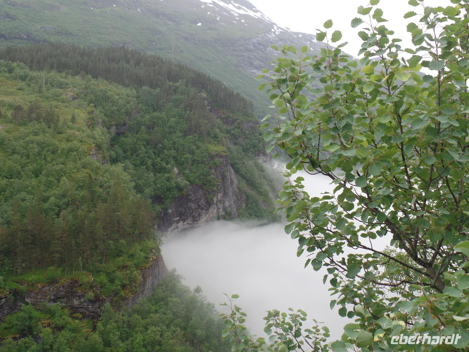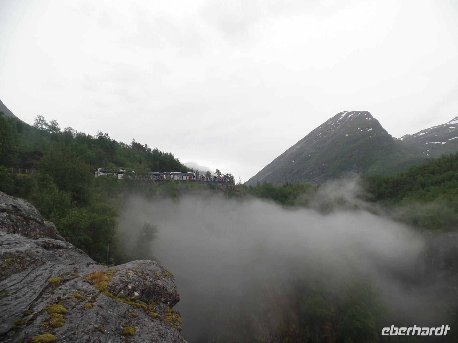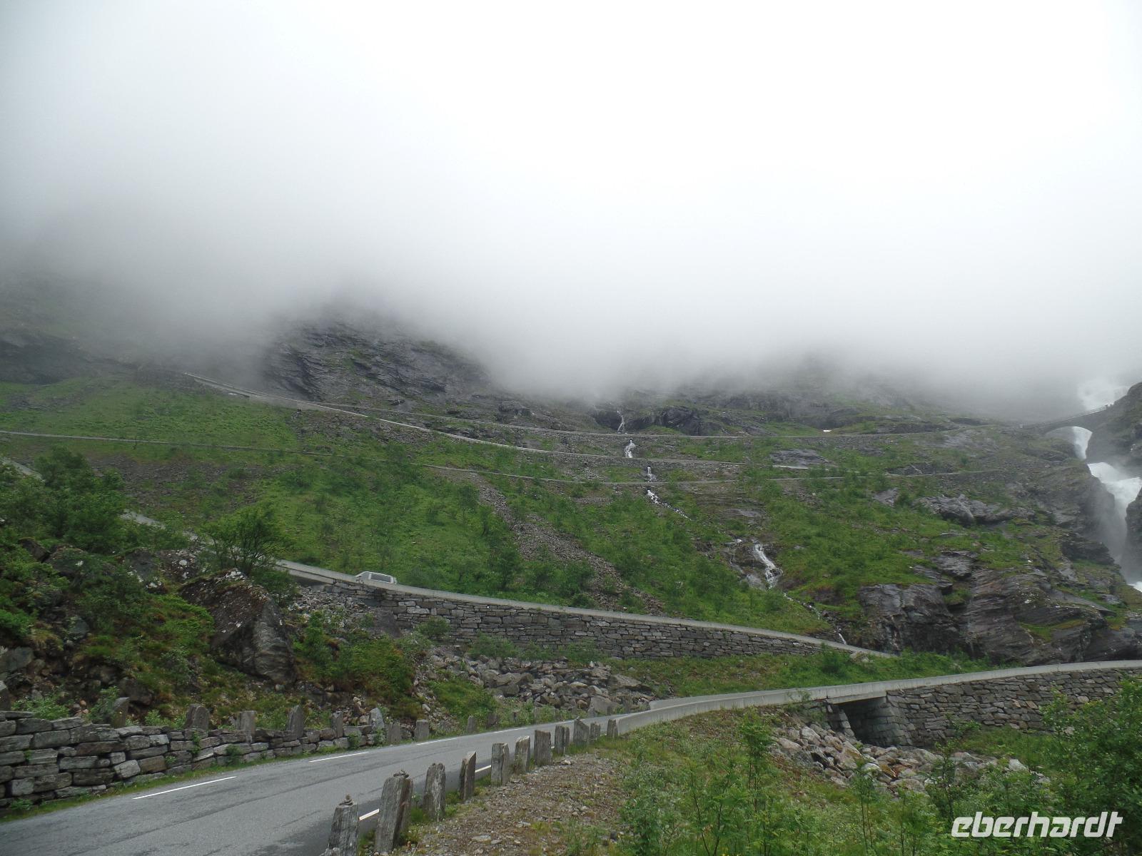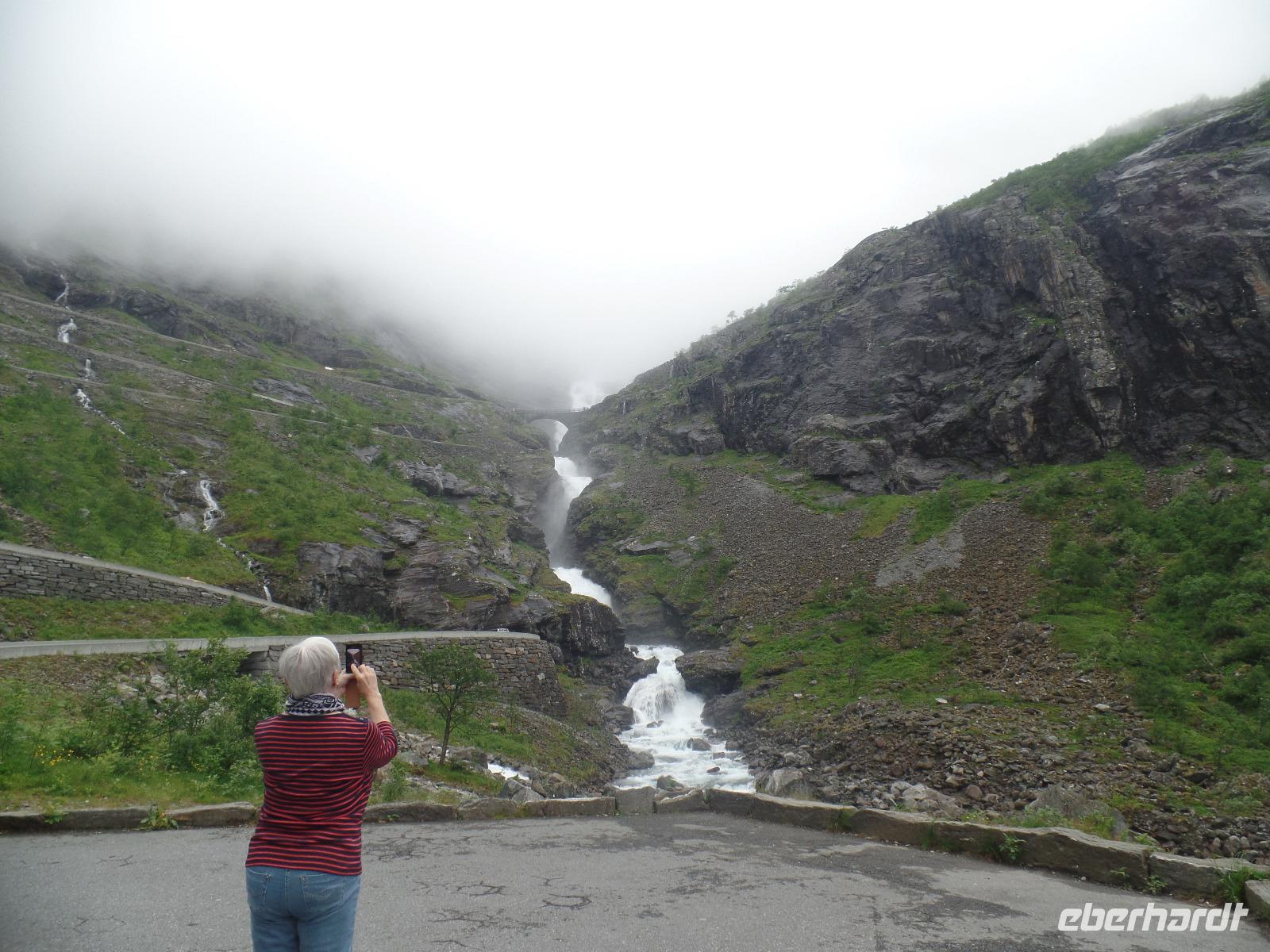 Am Morgen erwartet uns Hans-Werner, unser Reiseleiter, und Paul, unser Busfahrer. Es geht los und wir beginnen unsere Fahrt zur Trollwand. Dort legen wir einen kurzen Stopp ein. Leider zeigt sich das Wetter heute nicht von seiner besten Seite. Wir haben typischen skandinavischen Nebel, der durch die tief hängenden Wolken auftritt. Doch auch dies trübt nicht die Stimmung und somit fahren wir weiter. Unterwegs sehen wir komische Gestalten auf Verkehrsschildern...Trolle haben eine besondere Bedeutung in Norwegen. Die Gegend um die Trollstigen spiegeln diese Besonderheit wider und somit gibt es Verkehrschilder mit einem putzigen Trollkerlchen.