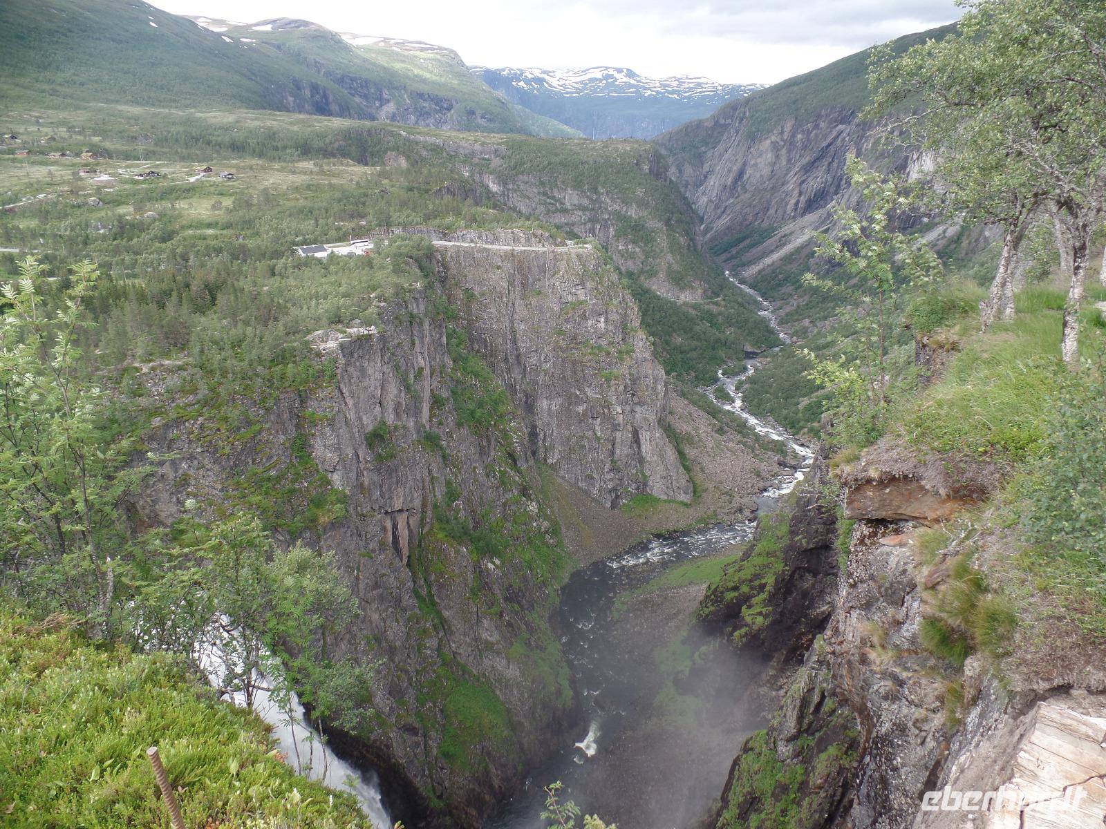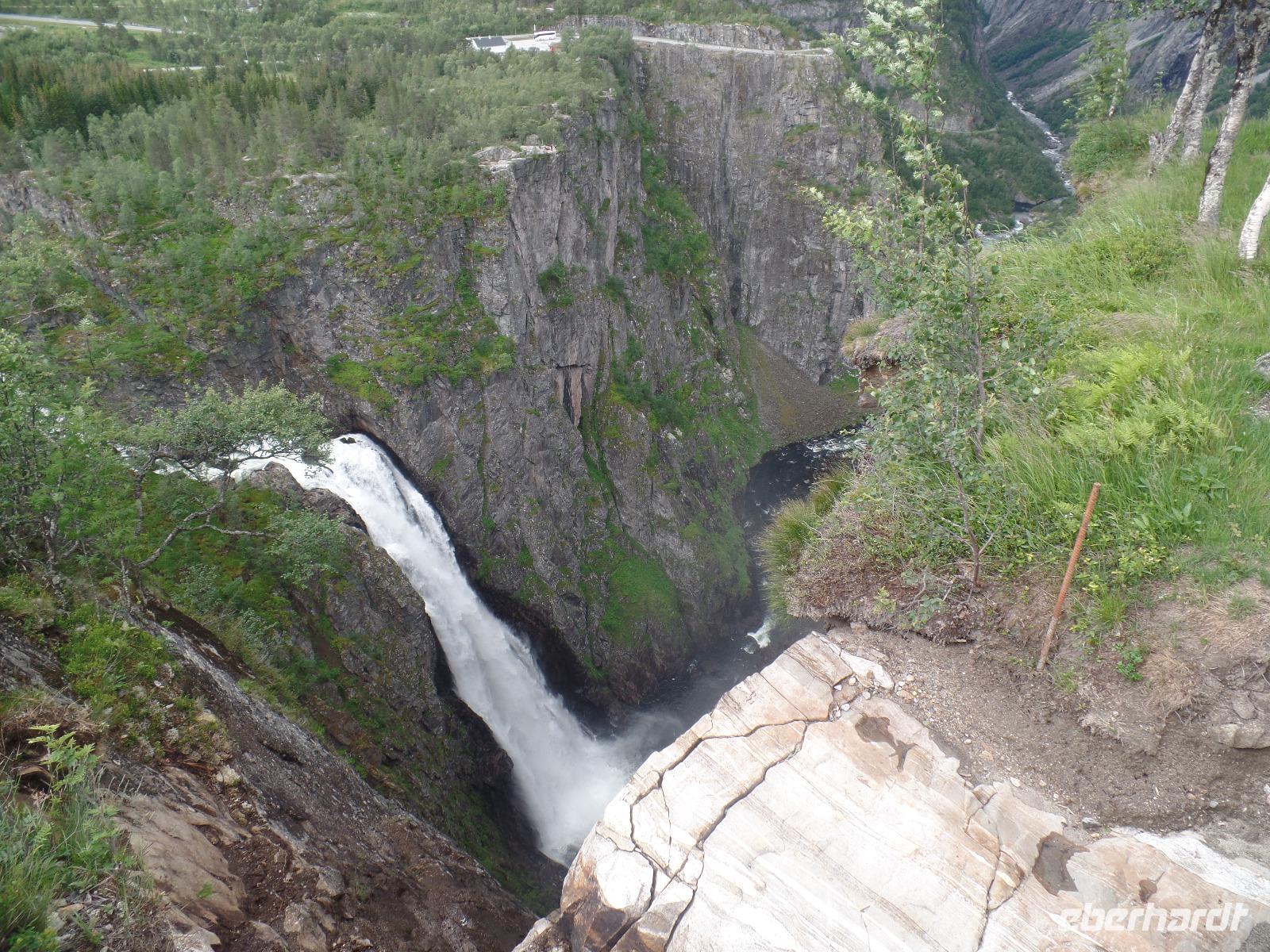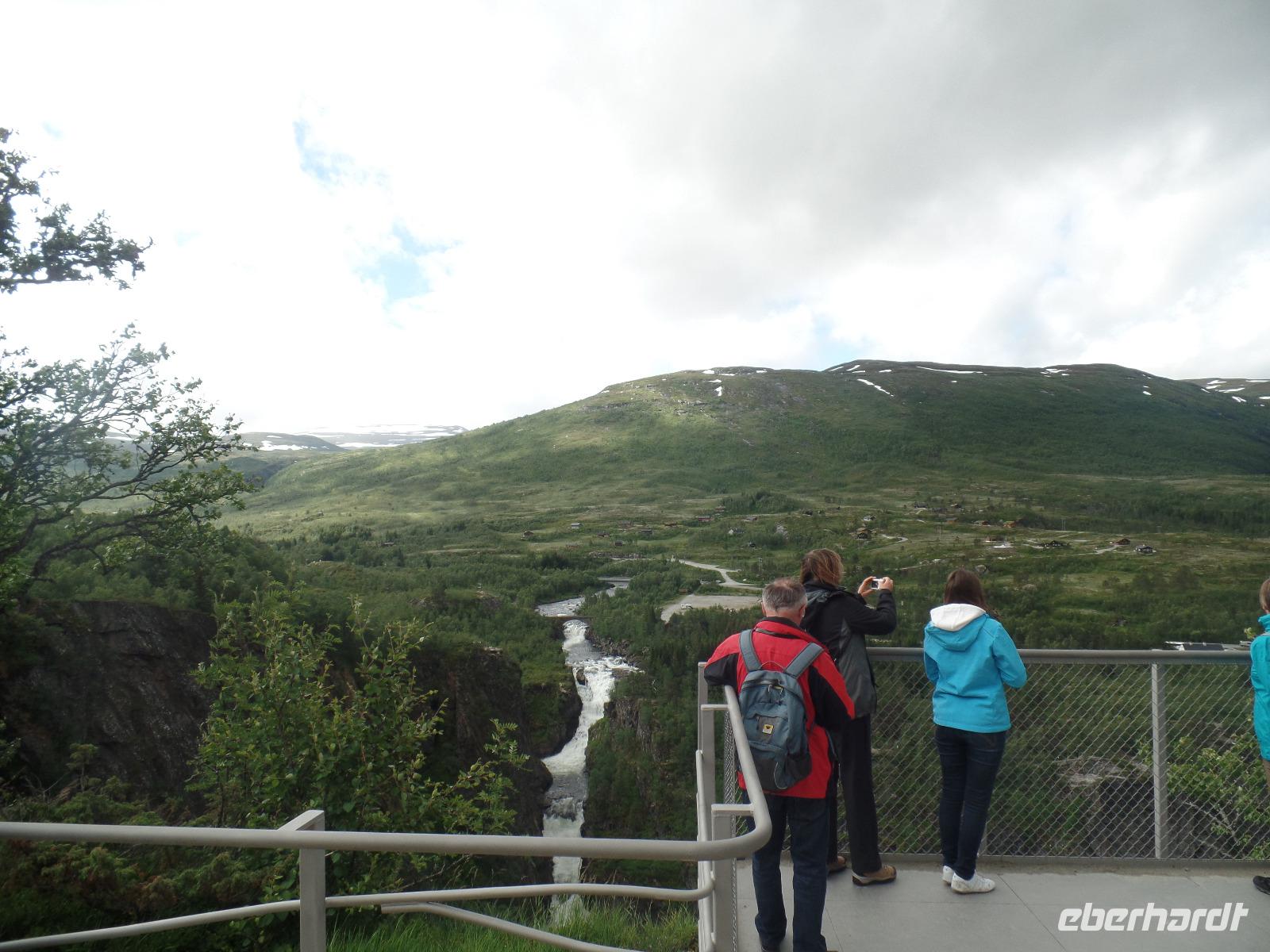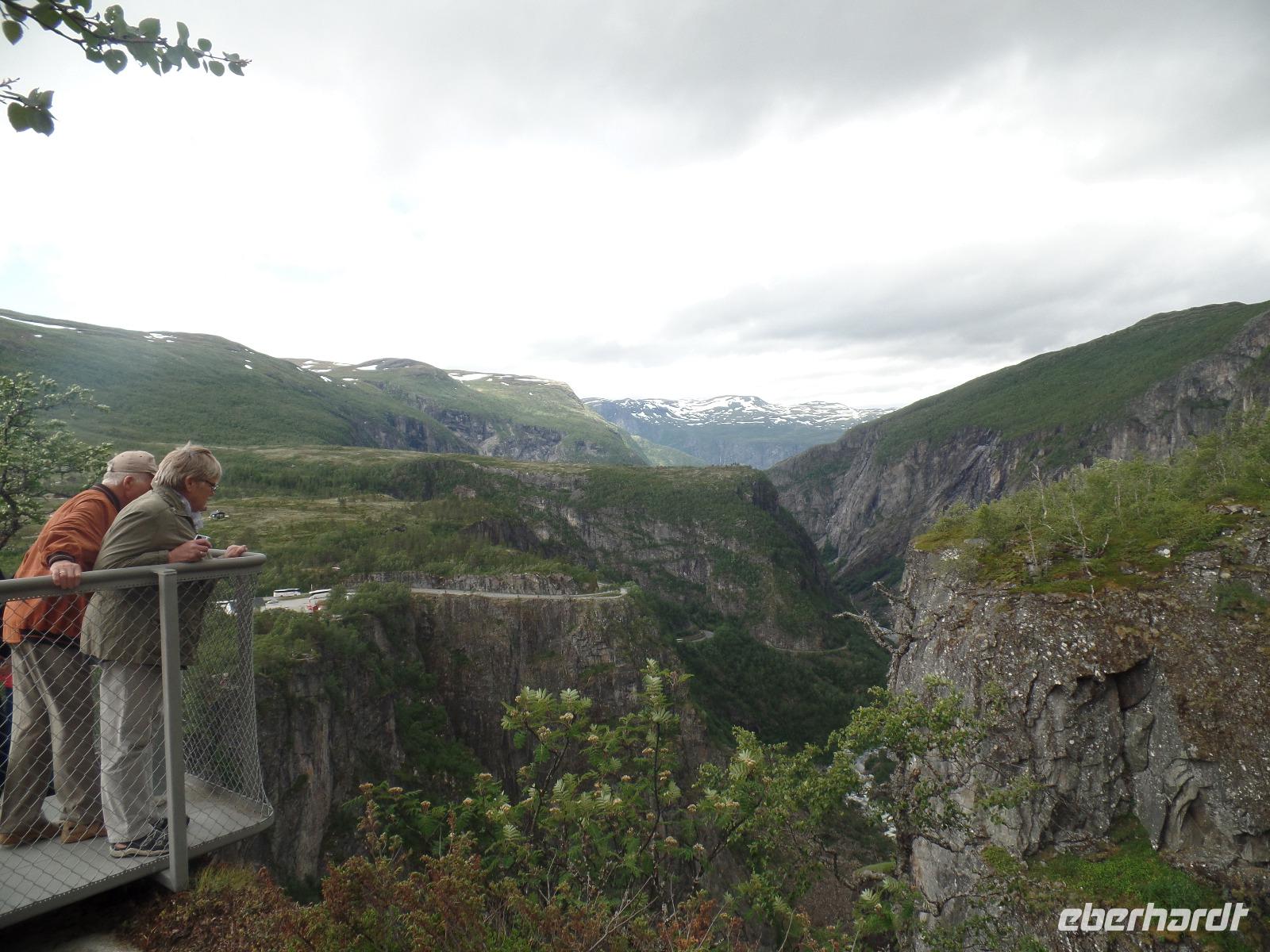 Den heutigen Tag verbringen wir gemeinsam in unserer Gruppe. Am Morgen brechen wir auf zu einer Fahrt über die Hardangervidda. Ernst und unser norwegischer Busfahrer warten schon im Hafen Eidfjors auf uns und schon kann es losgehen. Es geht bergauf durch eine herrliche Landschaft, die mit stark abfallenden Felswenden besticht. Den ersten Stopp unserer Fahrt legen wir am Aussichtspunkt Vöringsfossen ein. Dies ist ein Wasserfall, der 183 Meter ins Tal hinabstürzt. - Fantastisch!