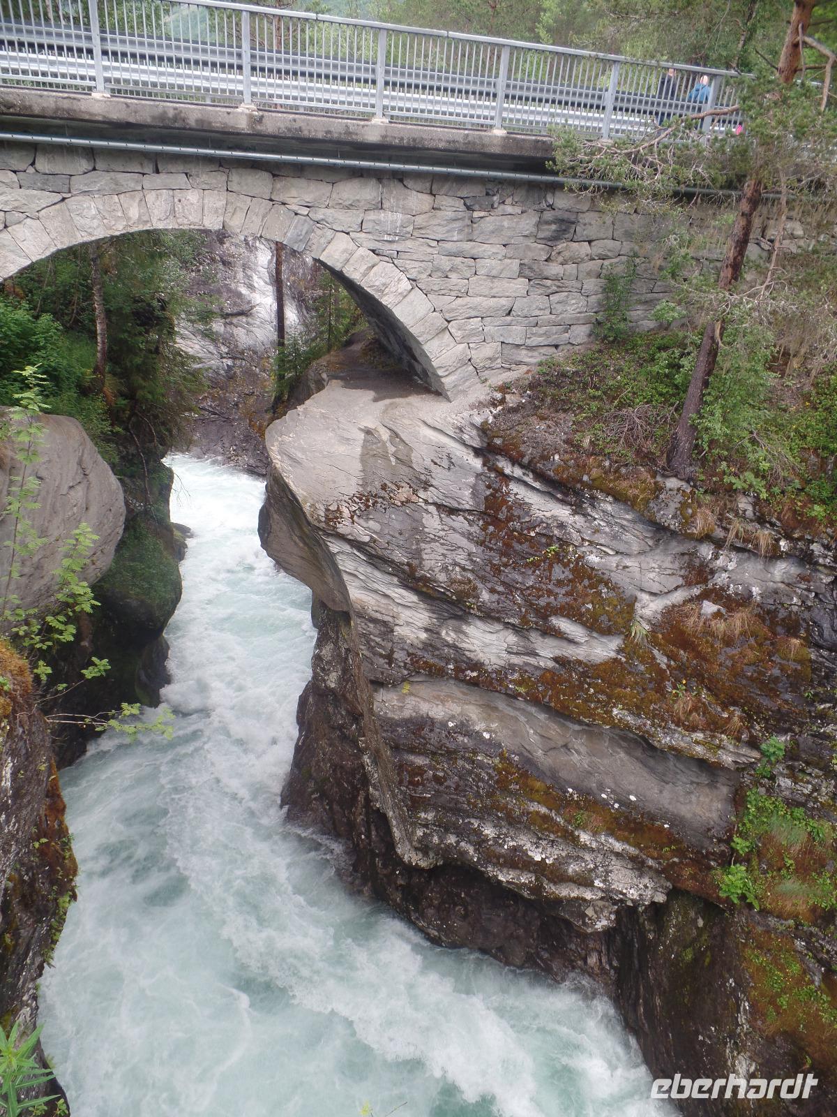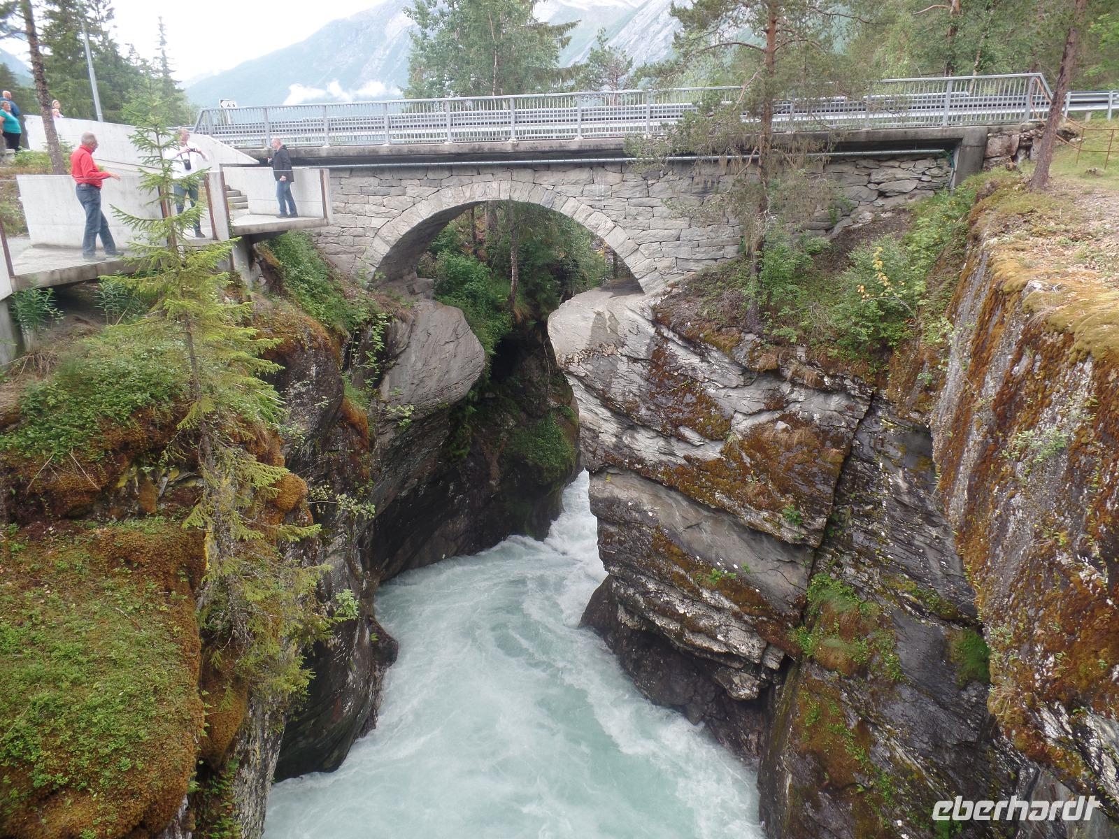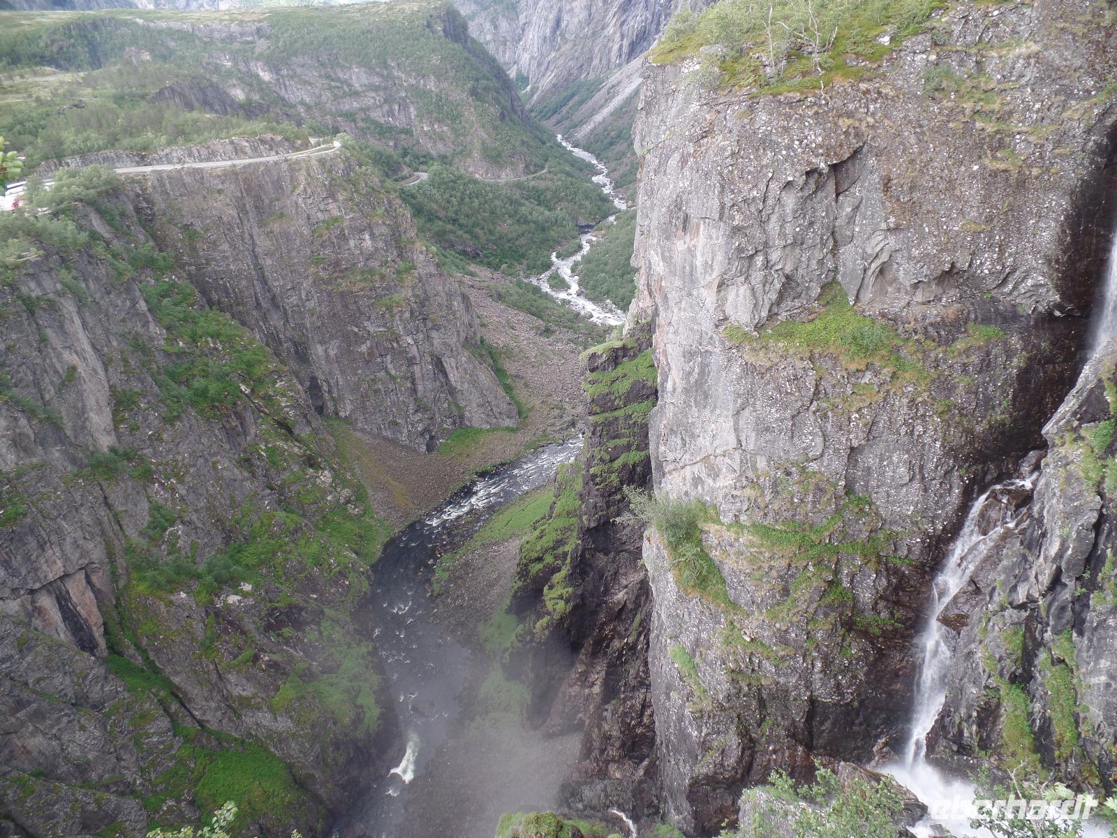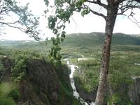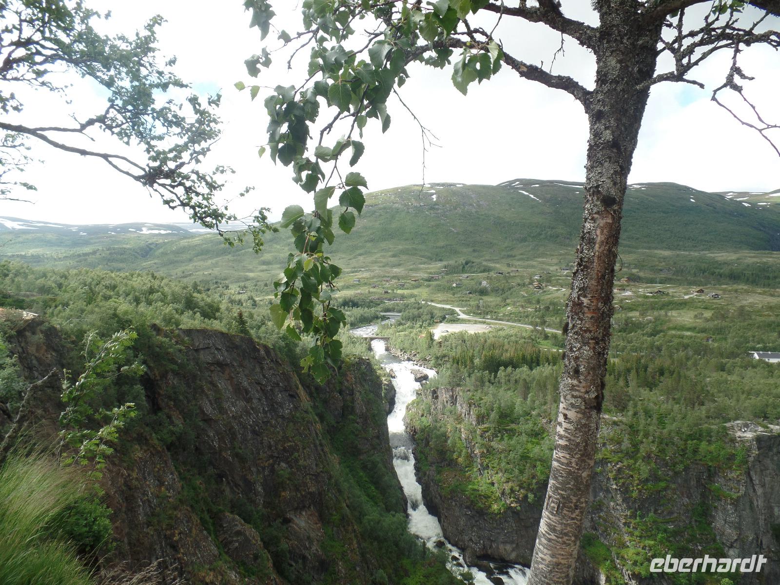 Den heutigen Tag verbringen wir gemeinsam in unserer Gruppe. Am Morgen brechen wir auf zu einer Fahrt über die Hardangervidda. Ernst und unser norwegischer Busfahrer warten schon im Hafen Eidfjors auf uns und schon kann es losgehen. Es geht bergauf durch eine herrliche Landschaft, die mit stark abfallenden Felswenden besticht. Den ersten Stopp unserer Fahrt legen wir am Aussichtspunkt Vöringsfossen ein. Dies ist ein Wasserfall, der 183 Meter ins Tal hinabstürzt. - Fantastisch!