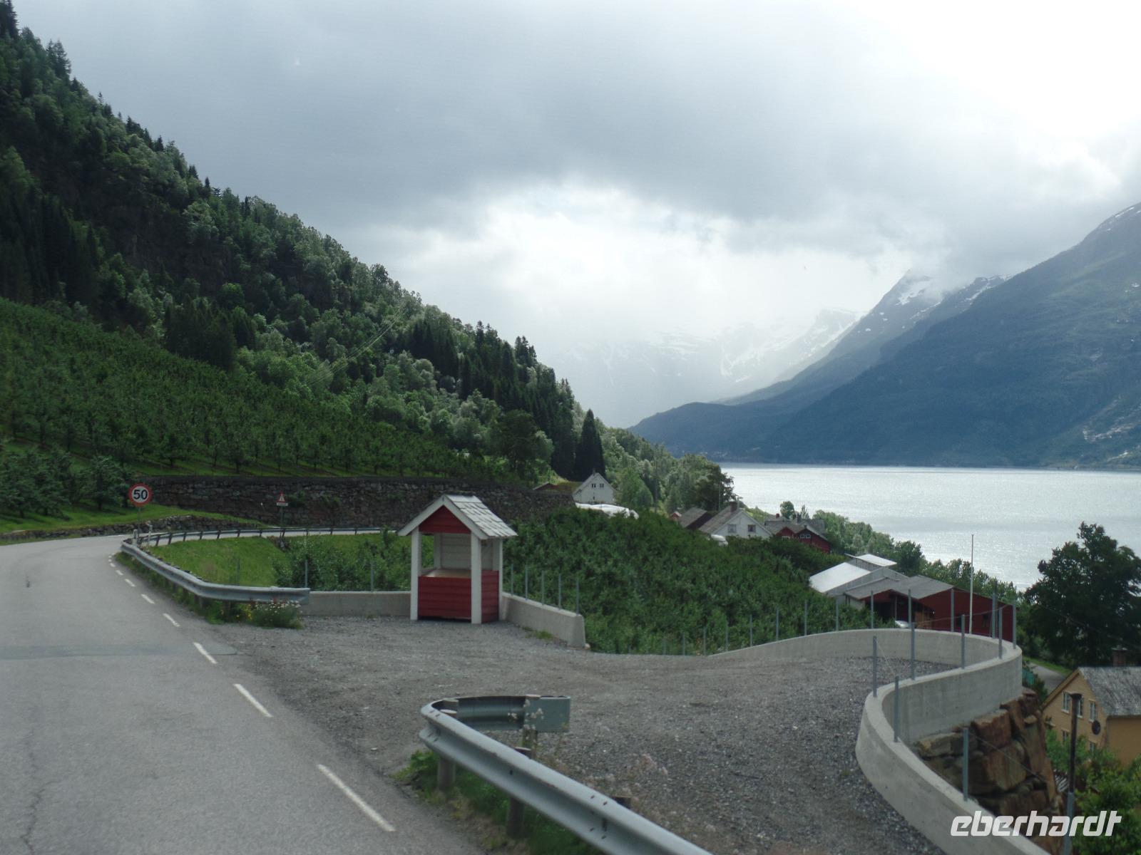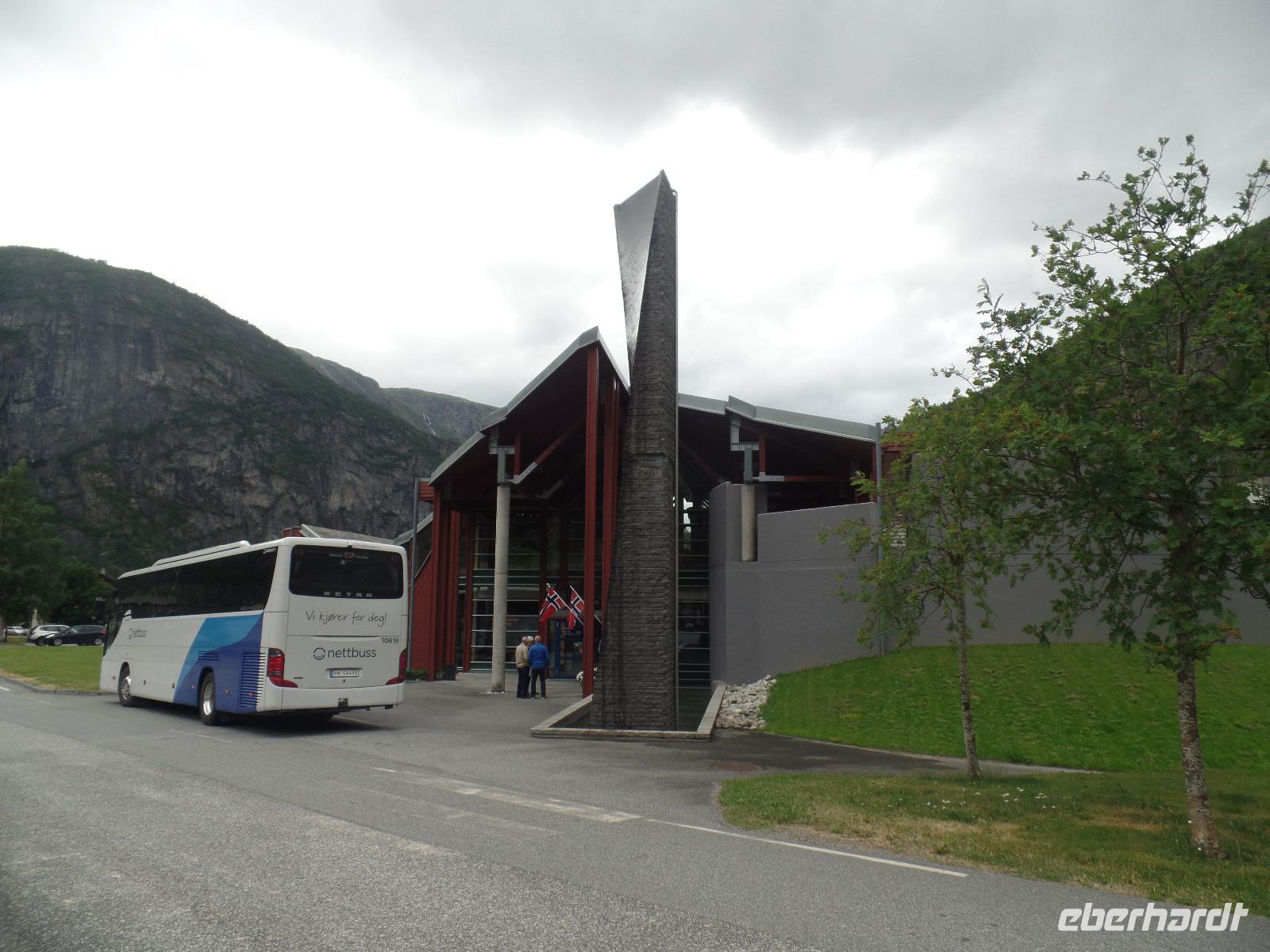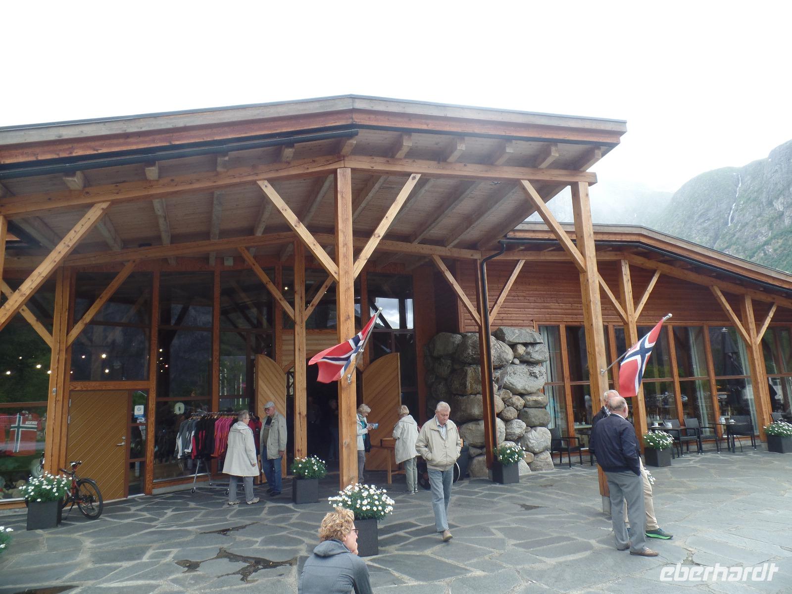 Am Mittag sind wir im Naturcenter Hardangervidda. Nach einem herrlichen Film über die Landschaft Norwegens und ihre Tierwelt stärken wir uns bei einem Lunch. Heute gibt es Waffeln mit der bekannten Romme. Alle haben die Gelegenheit diese zu probieren. Nach dieser Stärkung fahren wir entlang des Eidfjords in Richtung Süden. Es geht nach Lofthus. Dieser Ort ist bekannt für seinen Obstanbau. Die Gegend um den Hardangerfjord steht für den Obstgarten Norwegens.