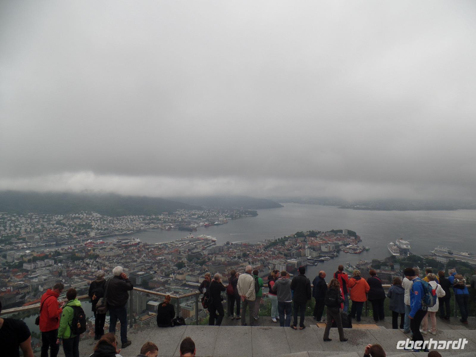 Bei einem Rundgang durch die Stadt können wir alles Sehenswerte erkunden. Im Hanseatischen Museum bringt uns Gudrun das Leben in der Hanse näher. Über die Bryggen, die bekannten bunten Häuschen entlang des Hafens, gelangen wir in das Stadtzentrum und schauen dem regen Treiben auf dem wohl bekanntesten Fischmarkt Norwegens zu. Einige probieren dort auch Walfleisch oder andere leckere Fischgerichte. Zum krönenden Abschluss geht es für uns hoch hinauf. Wir fahren mit der bekannten Floibahn auf den Hausberg Bergens. Dort oben haben wir eine tolle Sicht auf die Stadt. Doch dies erfordert etwas Geduld, denn Nebel unterbricht immer wieder unser Sichtfeld. Doch wir haben Glück und dieser verzieht sich doch recht schnell. Da wir erst am Abend in Bergen ablegen haben wir noch die Gelegenheit Bergen auf eigene Faust zu erkunden und diese Gelegenheit nutzt der ein oder andere, um das Königspaar von Nahem zu sehen. Am Abend sind wir alle wieder auf dem Schiff und lassen bei leckerem Abendessen und Wein den Tag gemütlich ausklingen.