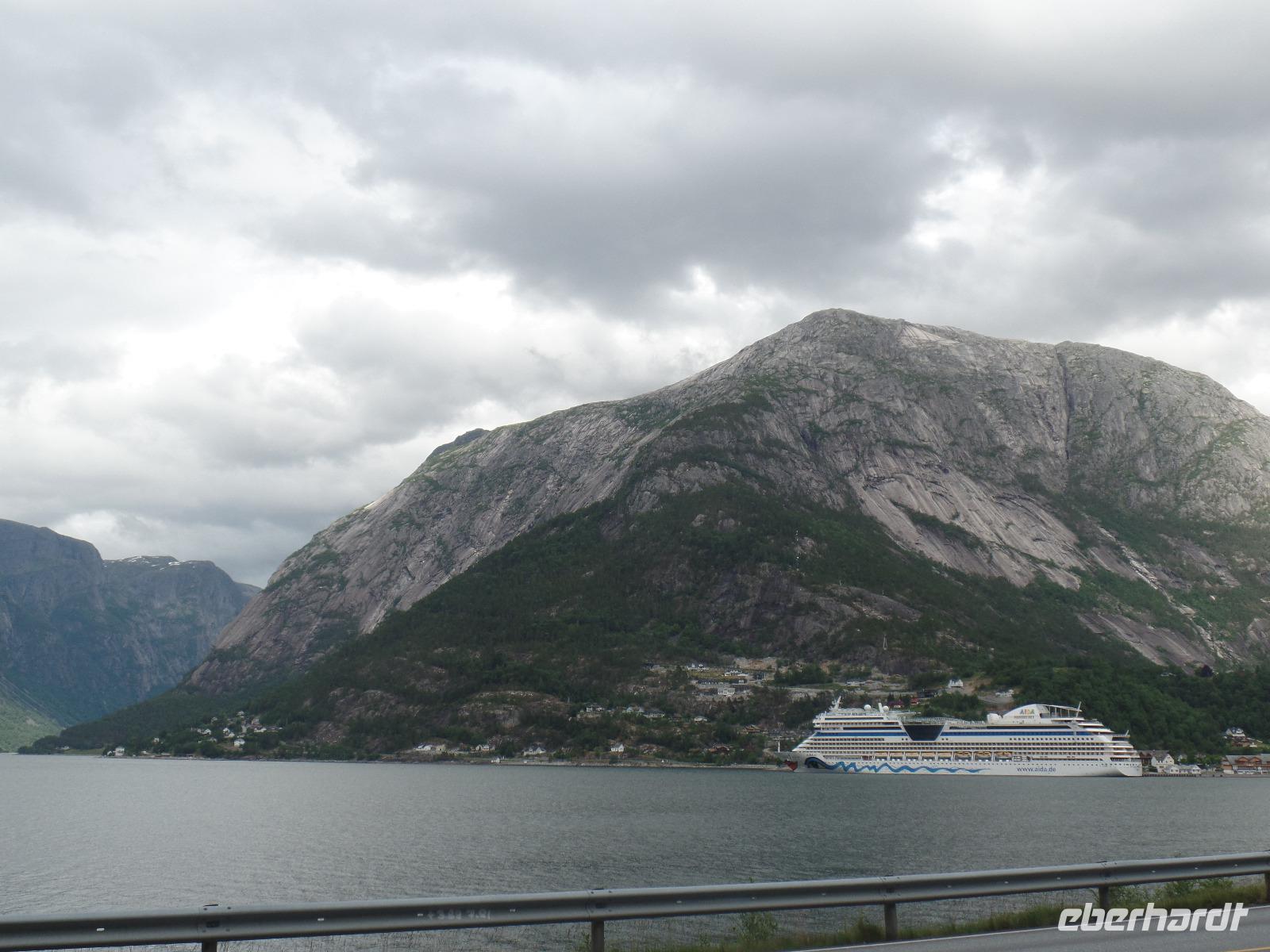 Nach einem Besuch auf einer Apfelplantage in Lofthus geht es langsam zurück Richtung Aida Sol. Die Ausfahrt der Aida aus dem Fjord ist heute wieder atemberaubend. DerHardangerfjord gehört zu einem der schönsten Fjorde Norwegens.