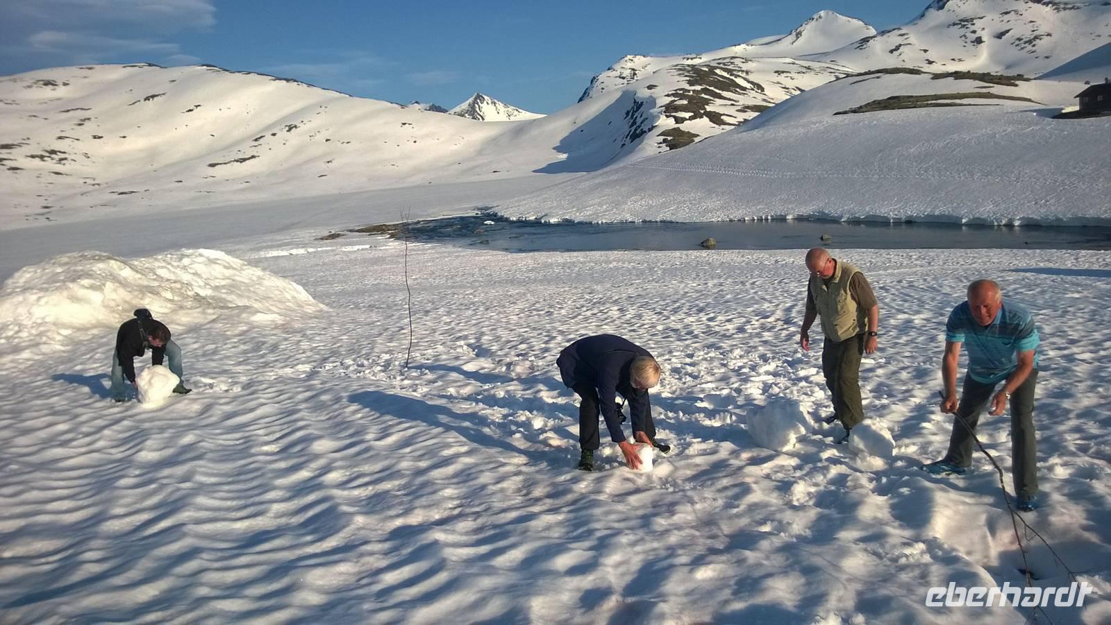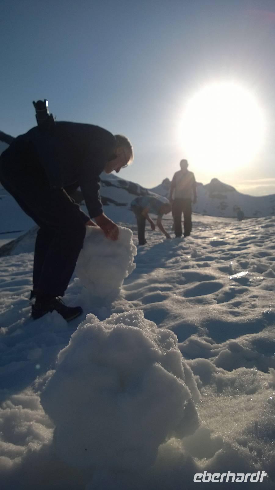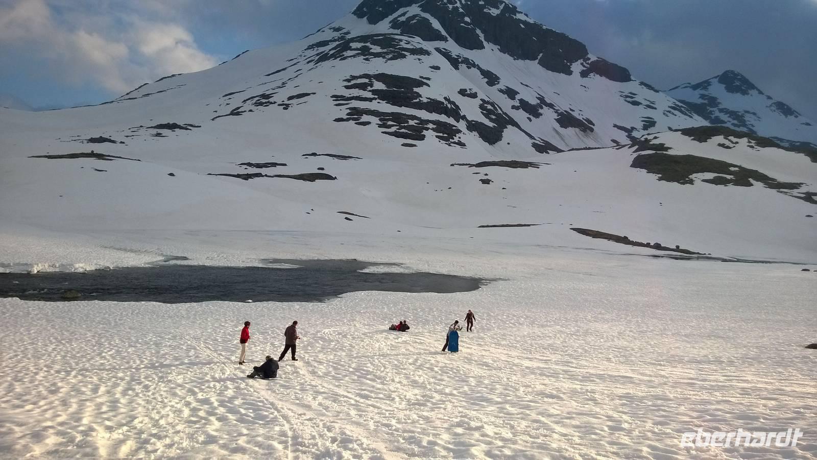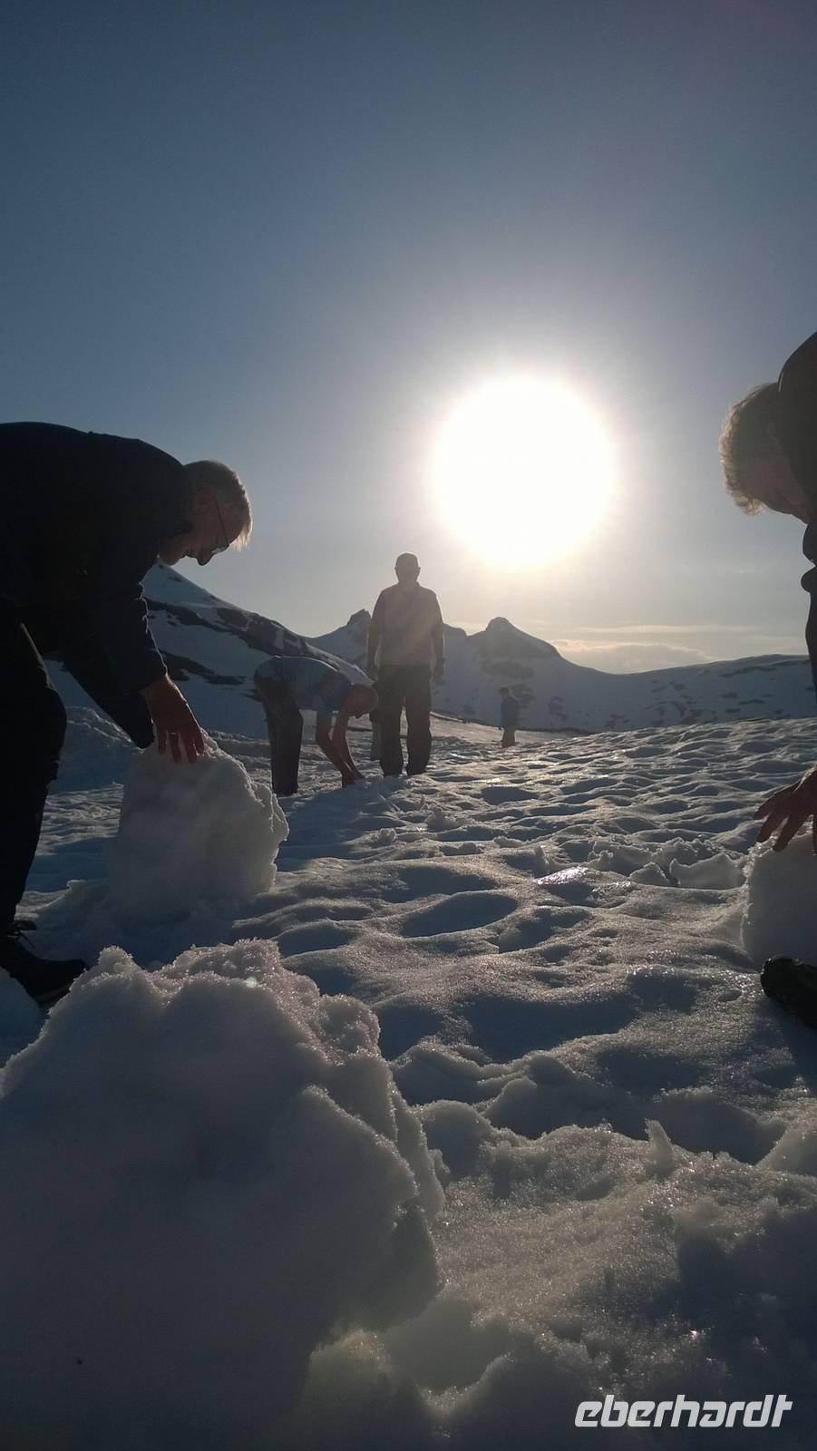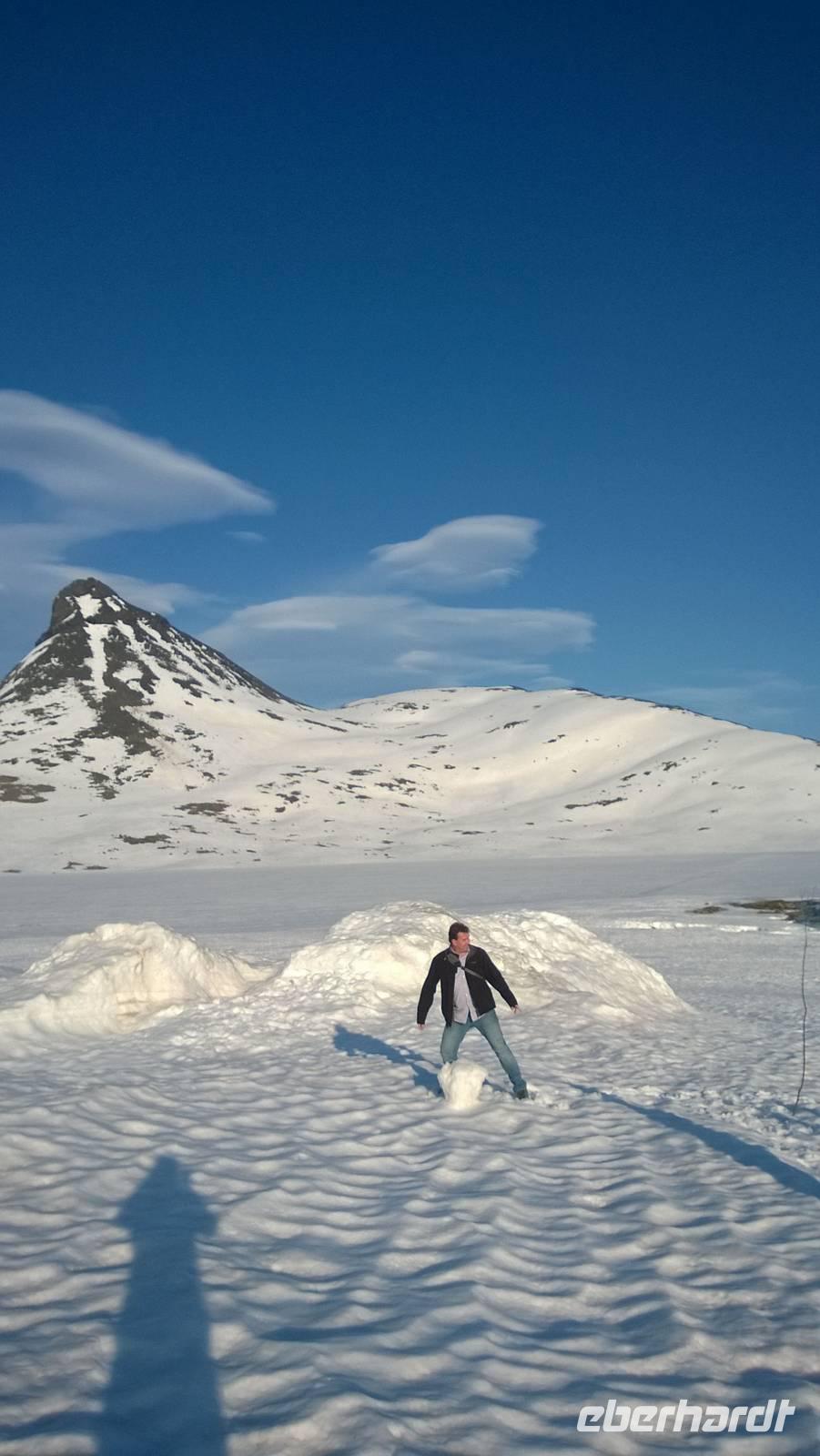 Am Morgen brüten wir unter der Sonne und hüten uns, einen Sonnenstich zu riskieren, am Abend stapfen wir durch Schnee und bauen Schneetrolle. Der Winter liegt nur 220km nördlich vom Hochsommer - und natürlich mehr als 1000 Meter höher.