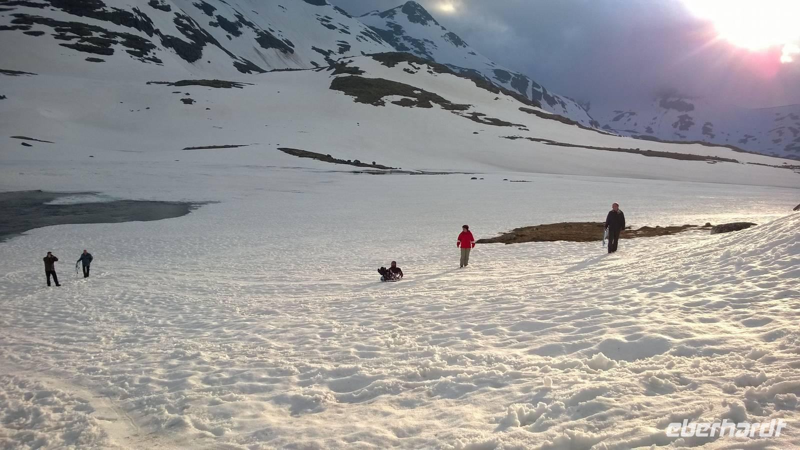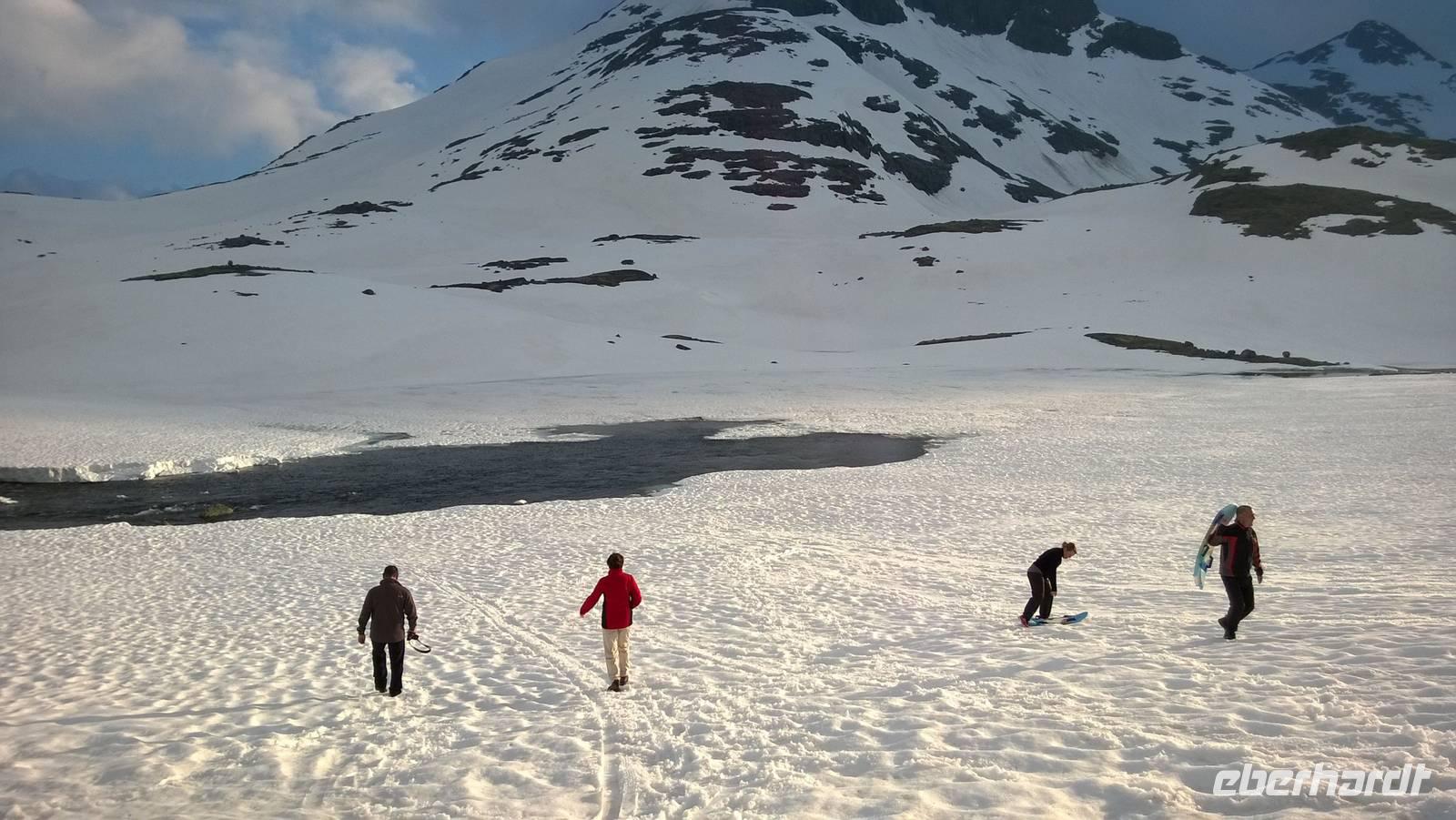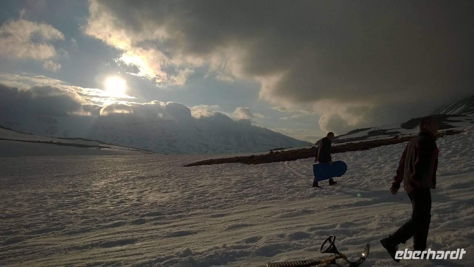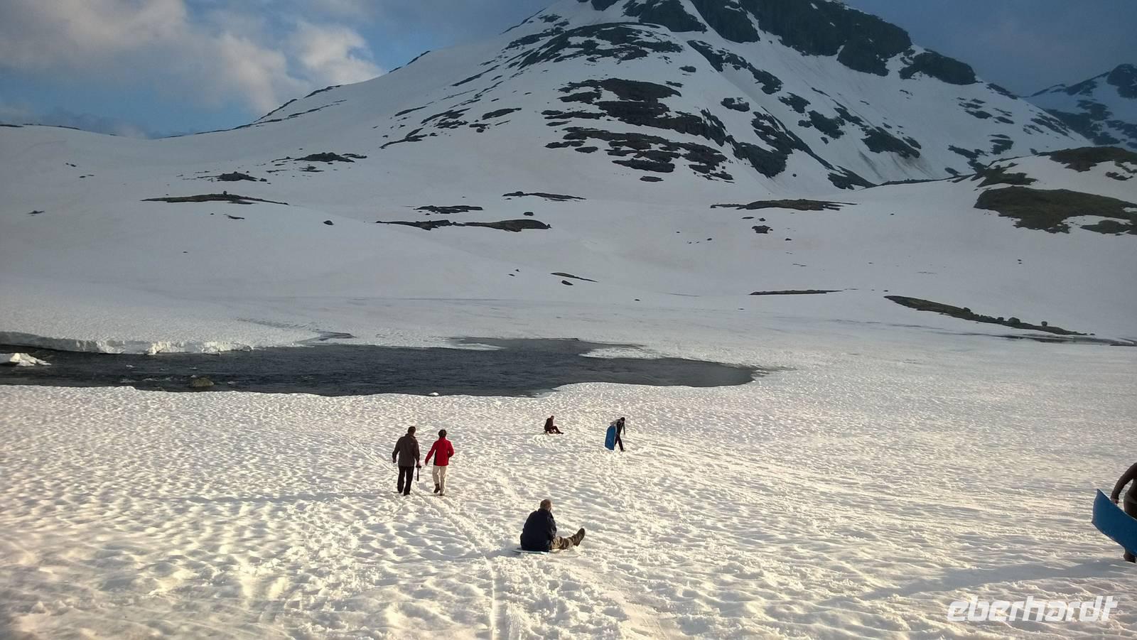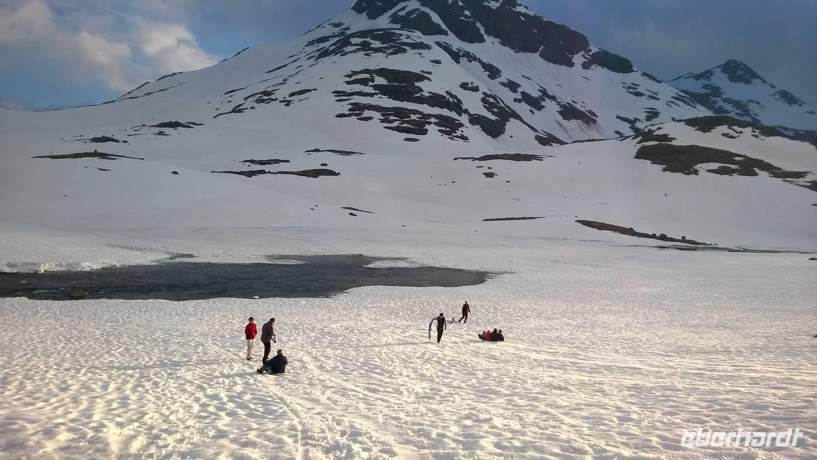 Am Morgen brüten wir unter der Sonne und hüten uns, einen Sonnenstich zu riskieren, am Abend stapfen wir durch Schnee und bauen Schneetrolle. Der Winter liegt nur 220km nördlich vom Hochsommer - und natürlich mehr als 1000 Meter höher.