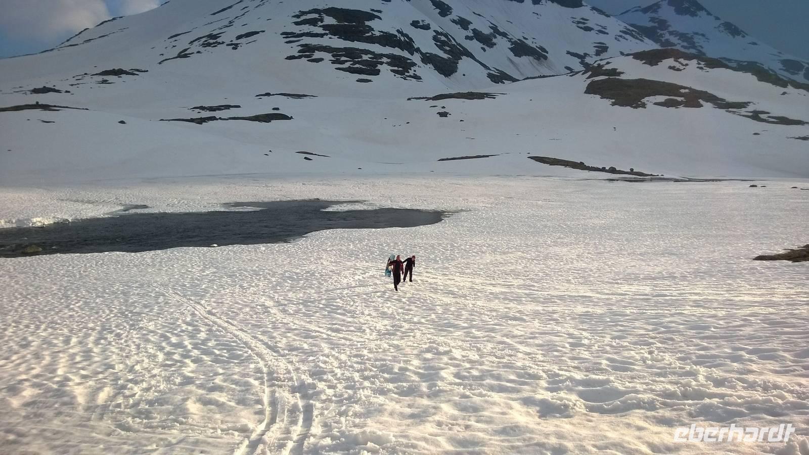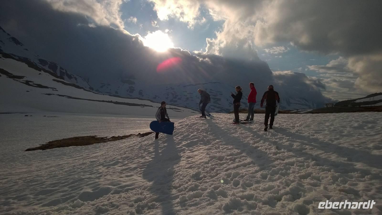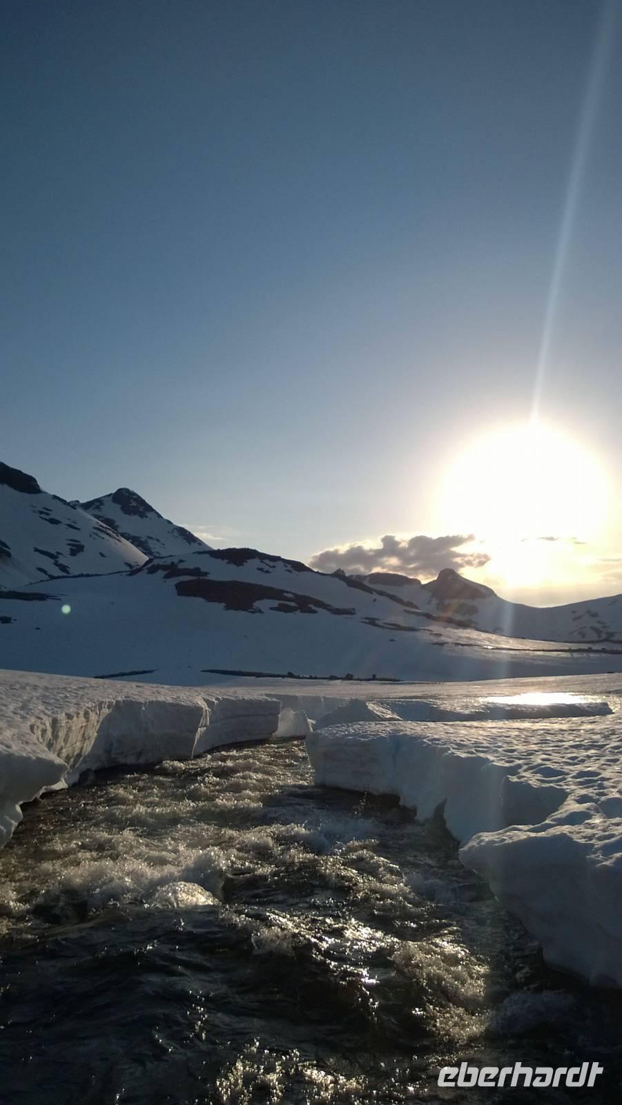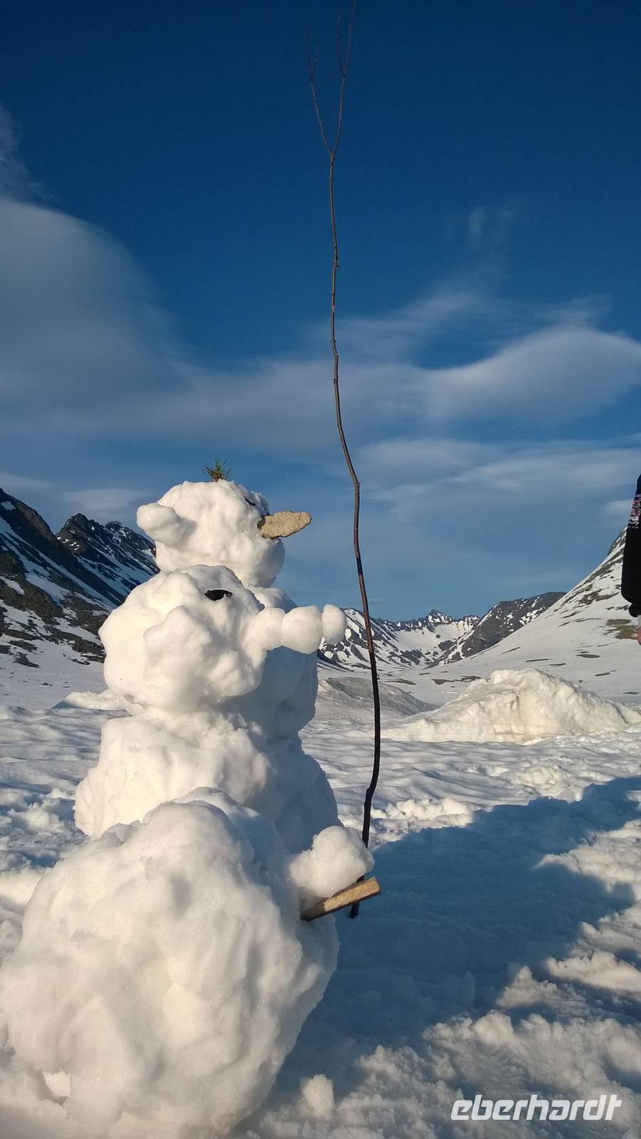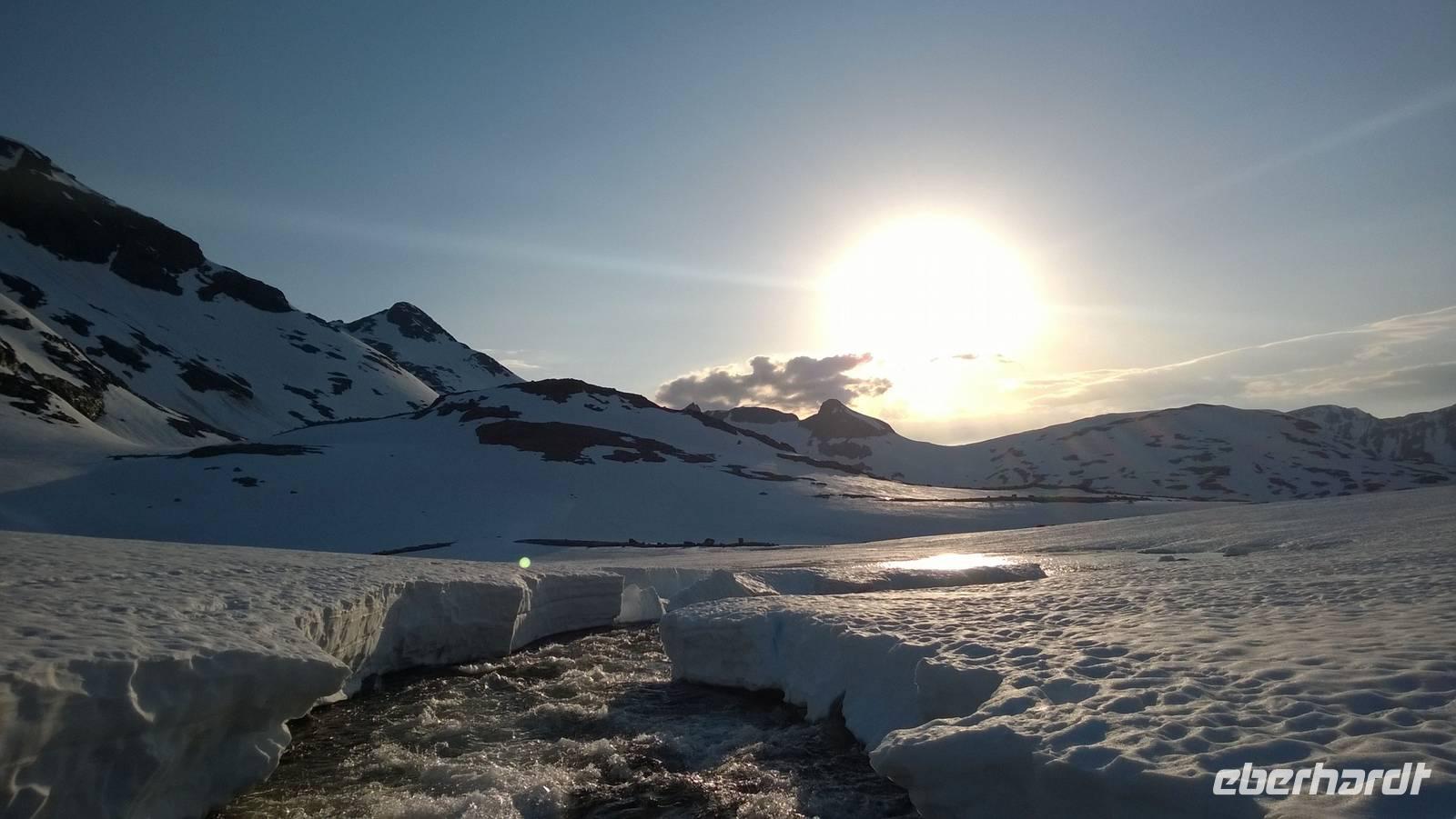 Am Morgen brüten wir unter der Sonne und hüten uns, einen Sonnenstich zu riskieren, am Abend stapfen wir durch Schnee und bauen Schneetrolle. Der Winter liegt nur 220km nördlich vom Hochsommer - und natürlich mehr als 1000 Meter höher.
