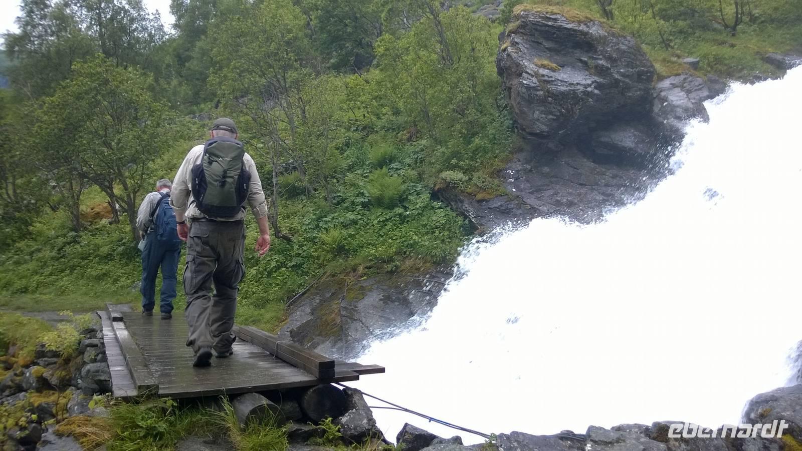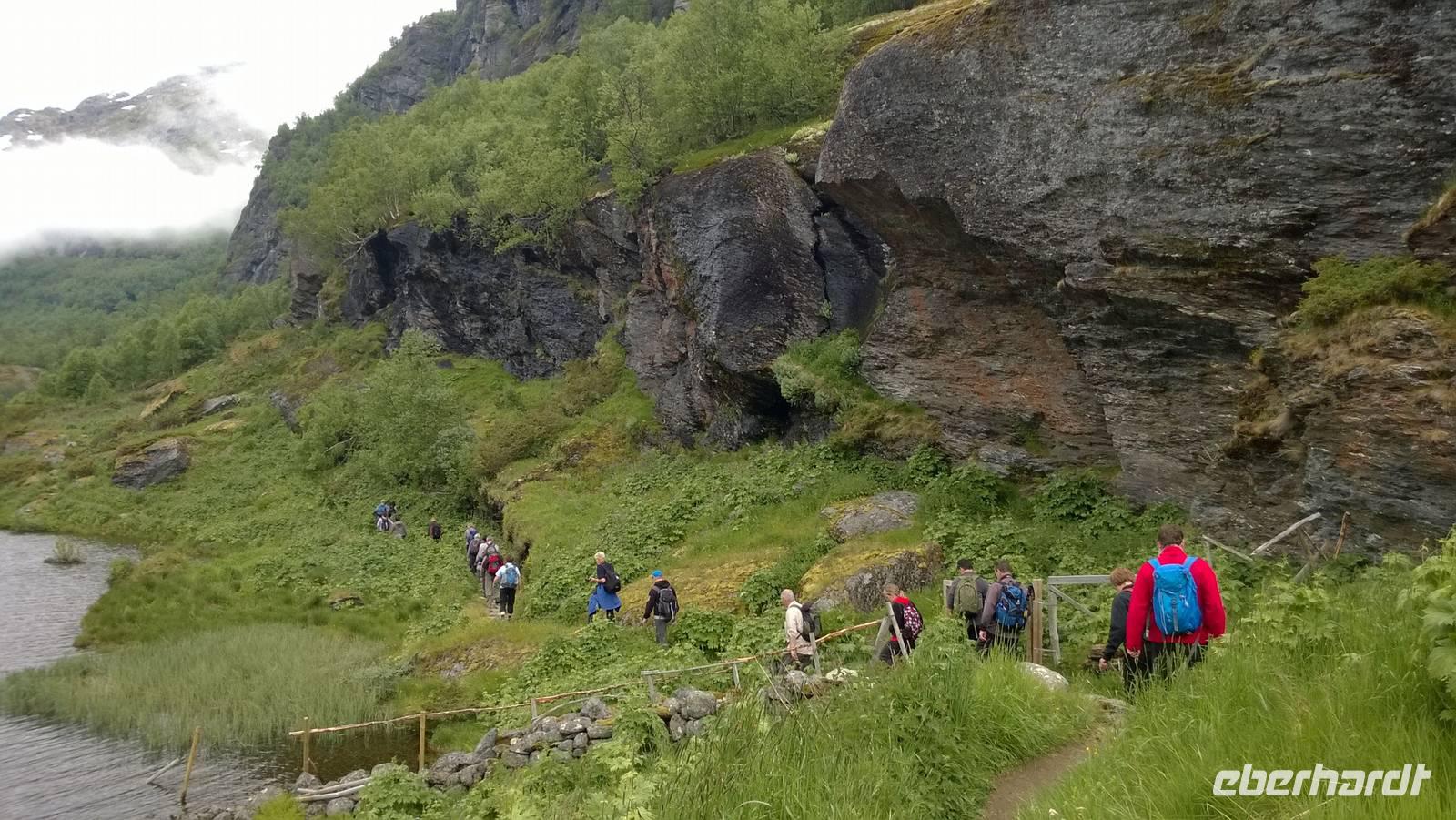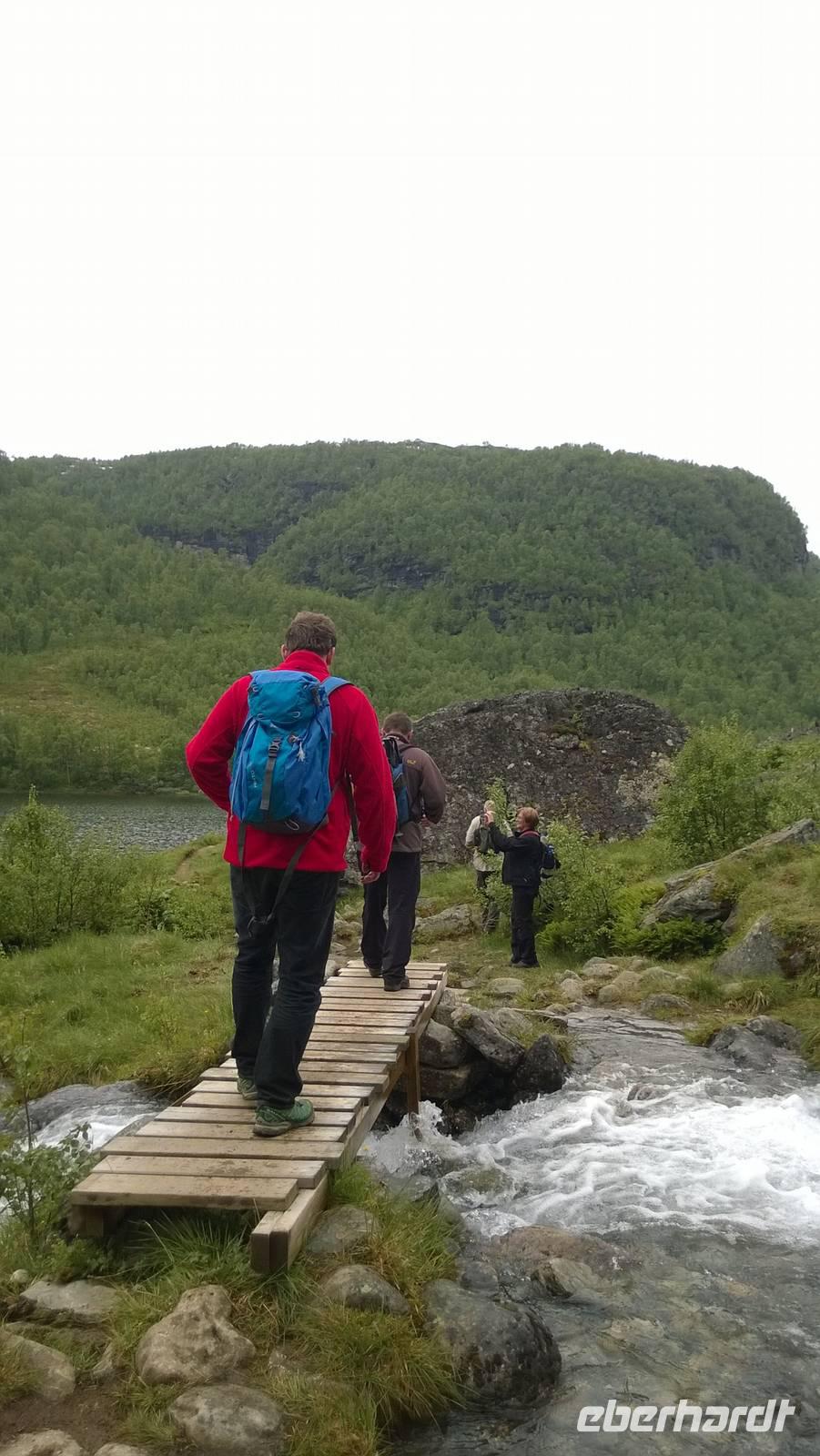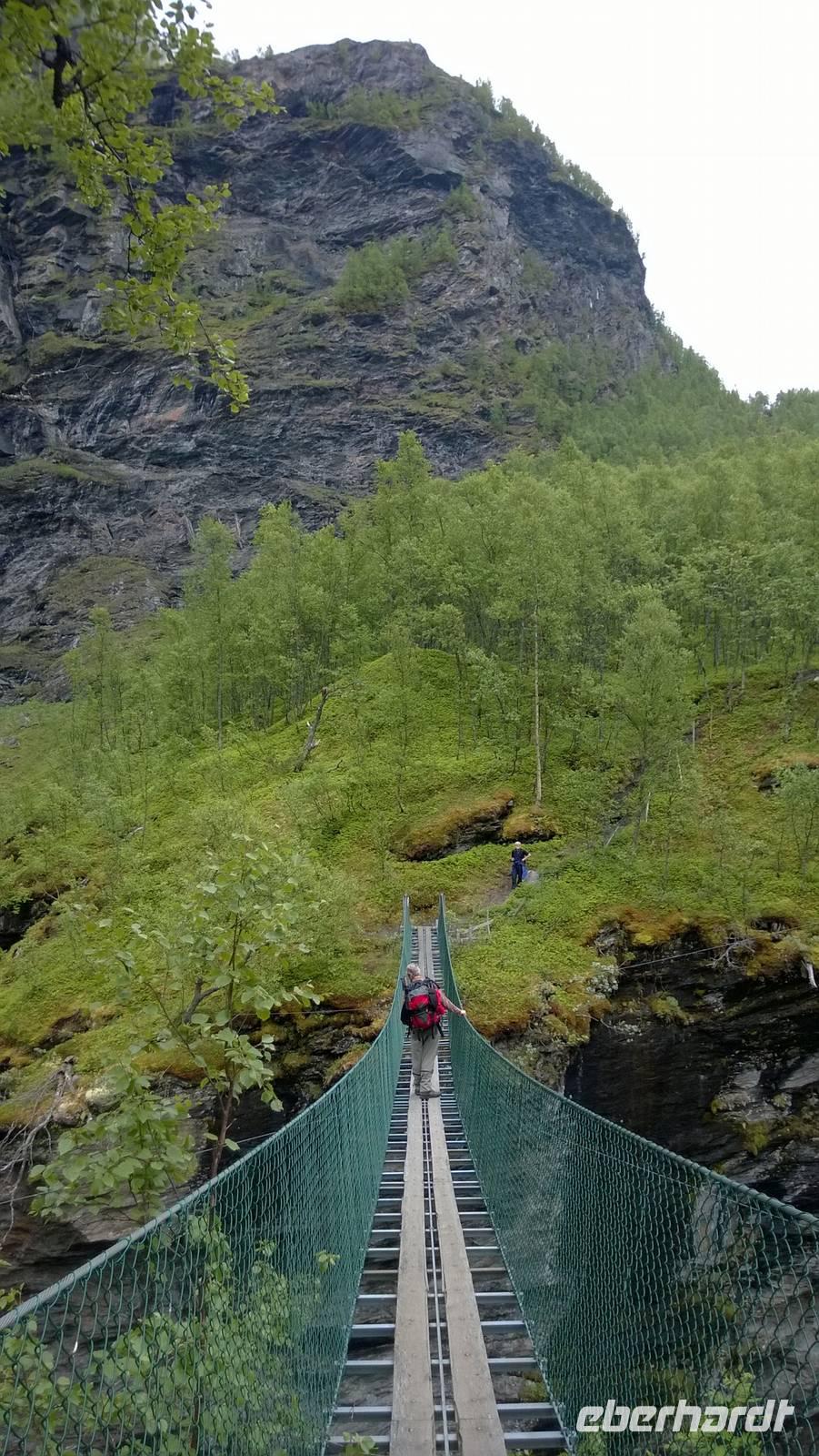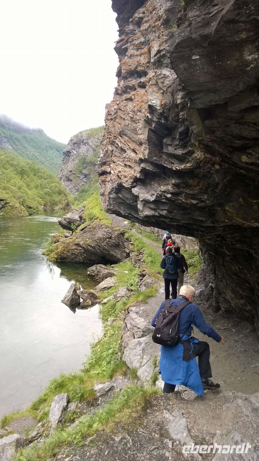Zunächst wandern wir in atemberaumbend schöner Berglandschaft auf halber Höhe zwischen Fluss und Bergkuppen. Theoretisch müssen wir immer nur bergab gehen, schließlich sollen wir heute von 900 m.o.h. auf quasi Meereshöhe kommen. Doch soviel wir auch hinuntersteigen, gleich um die Ecke findet sich immer wieder eine Anhöhe, die wir bergauf wandern. Hoch und runter, runter und hoch, an steilen Felswänden entlang, über Wasserströme, auf eine Bergkuppe und durch den Wald. Abstecher machen wir zu einer Hängebrücke, wo man seinen Mut für ein Foto mal beweisen kann und zu einer imposanten Höhle. Doch weiter geht's, die 19km ziehen sich hin. Es sind viele kleine Überraschungen, die uns auf diesem Wanderweg herausfordern. Die größte Herausforderung ist sicherlich der Wasserfall, der noch so viel Schmelzwasser führt, dass wir nicht mit trockener Haut daran vorbei kommen. Regensachen an, Zähne zusammen beißen und zügig durchwaten heißt es dort. Ob unsere Outdoor-Kleidung auch für Wasserfälle präpariert ist? Der Bürgermeister von Aurland begleitet uns für die letzten 2 Stunden und hat sicherheitshalber auch gleich ein neues Seil zum Entlanghangeln gespannt.