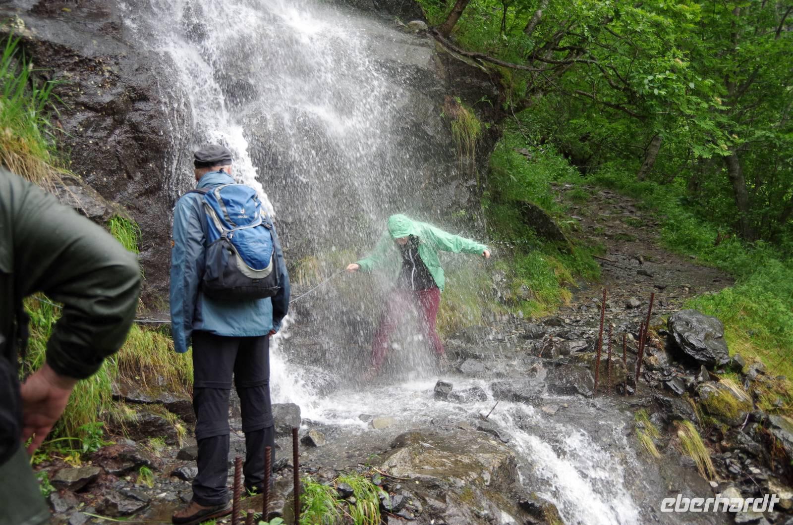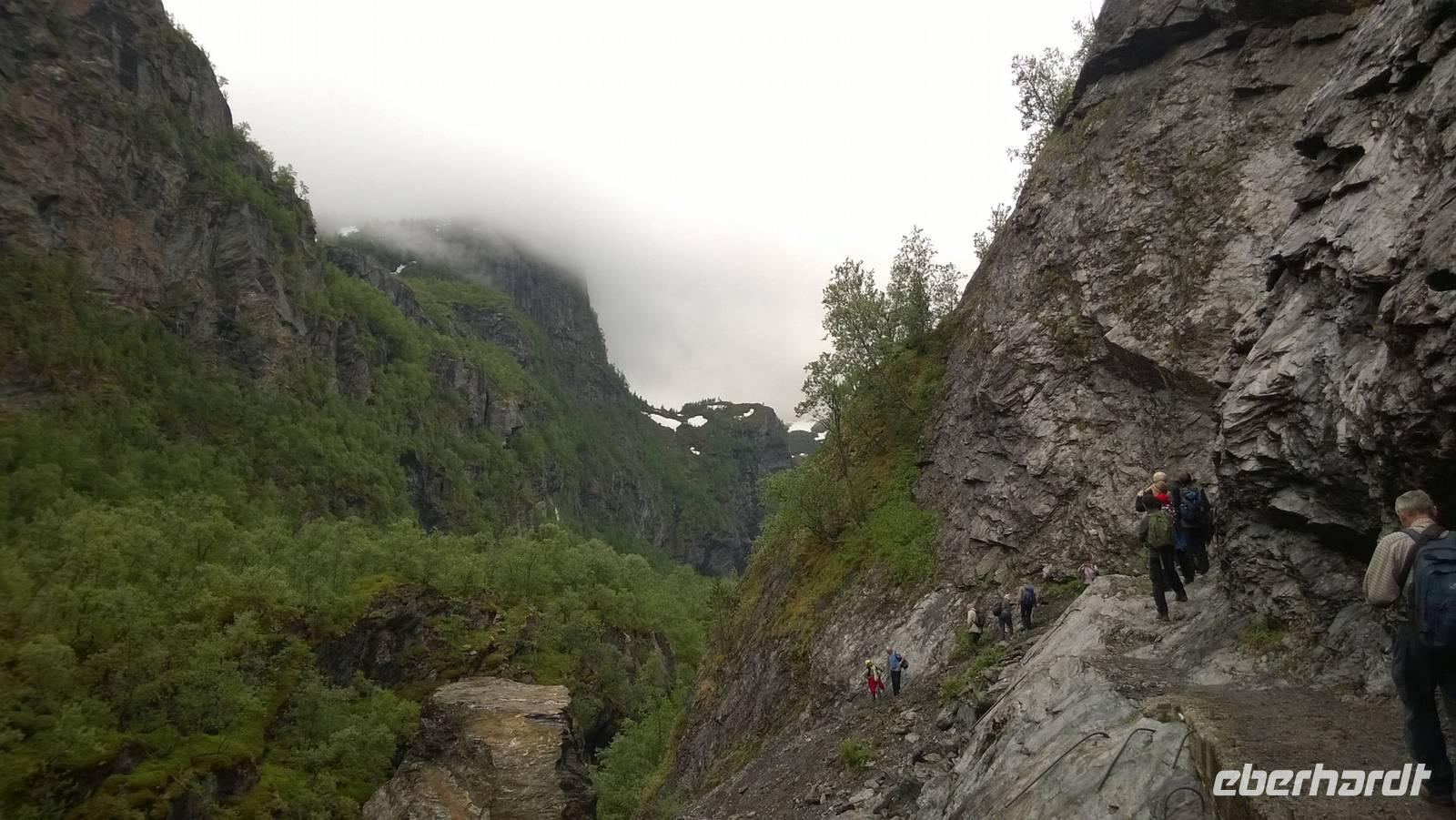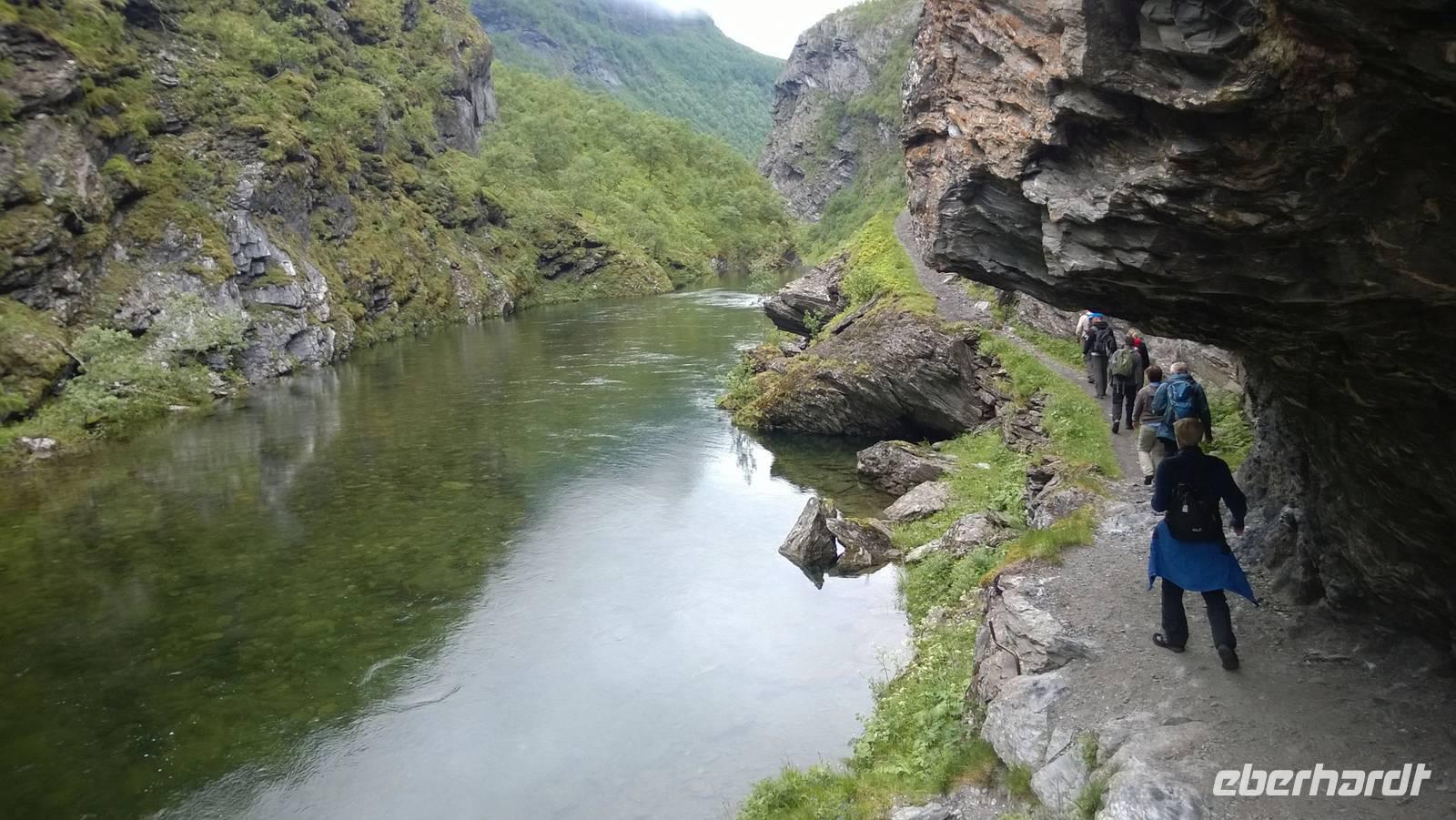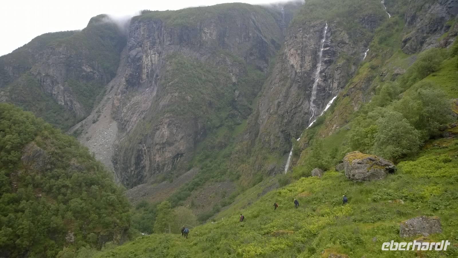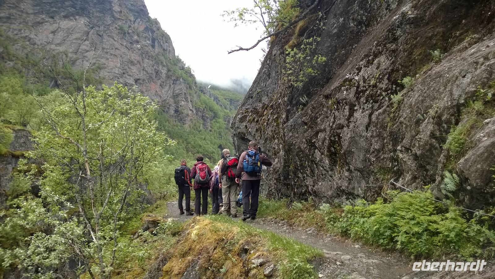Zunächst wandern wir in atemberaumbend schöner Berglandschaft auf halber Höhe zwischen Fluss und Bergkuppen. Theoretisch müssen wir immer nur bergab gehen, schließlich sollen wir heute von 900 m.o.h. auf quasi Meereshöhe kommen. Doch soviel wir auch hinuntersteigen, gleich um die Ecke findet sich immer wieder eine Anhöhe, die wir bergauf wandern. Hoch und runter, runter und hoch, an steilen Felswänden entlang, über Wasserströme, auf eine Bergkuppe und durch den Wald. Abstecher machen wir zu einer Hängebrücke, wo man seinen Mut für ein Foto mal beweisen kann und zu einer imposanten Höhle. Doch weiter geht's, die 19km ziehen sich hin. Es sind viele kleine Überraschungen, die uns auf diesem Wanderweg herausfordern. Die größte Herausforderung ist sicherlich der Wasserfall, der noch so viel Schmelzwasser führt, dass wir nicht mit trockener Haut daran vorbei kommen. Regensachen an, Zähne zusammen beißen und zügig durchwaten heißt es dort. Ob unsere Outdoor-Kleidung auch für Wasserfälle präpariert ist? Der Bürgermeister von Aurland begleitet uns für die letzten 2 Stunden und hat sicherheitshalber auch gleich ein neues Seil zum Entlanghangeln gespannt.