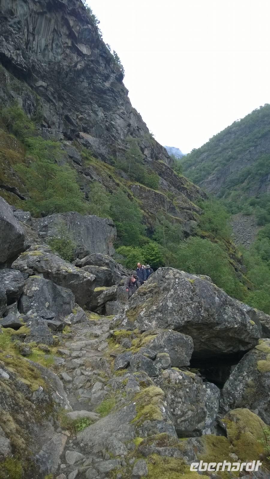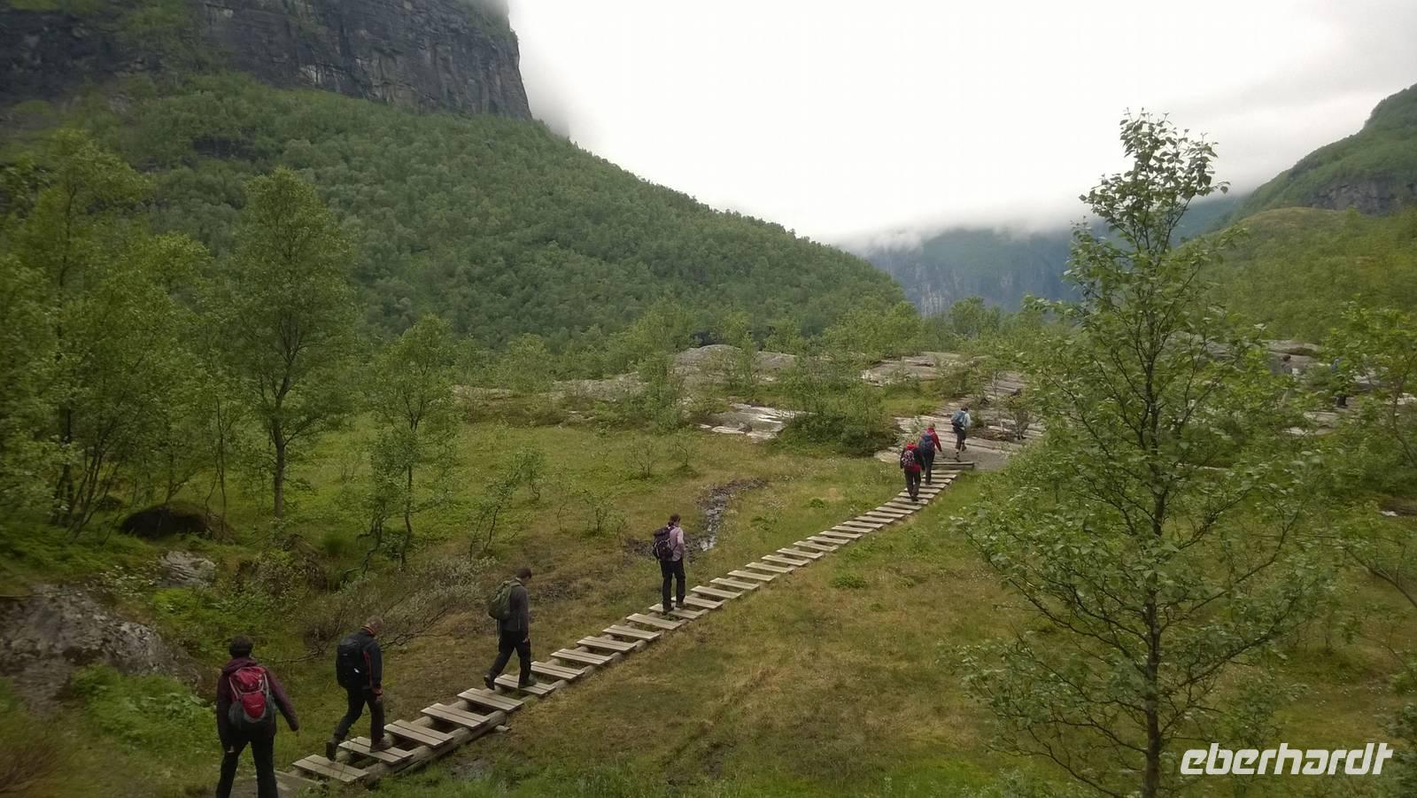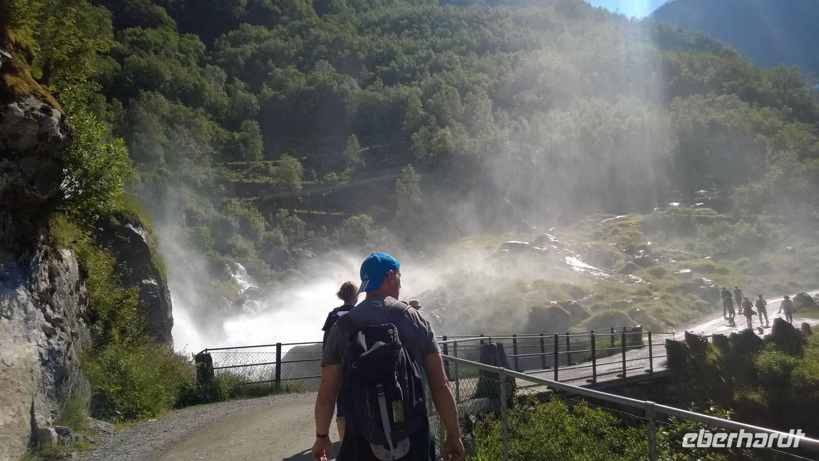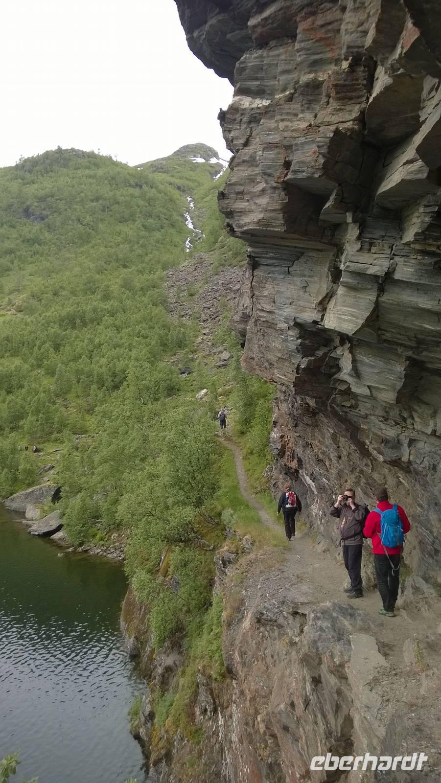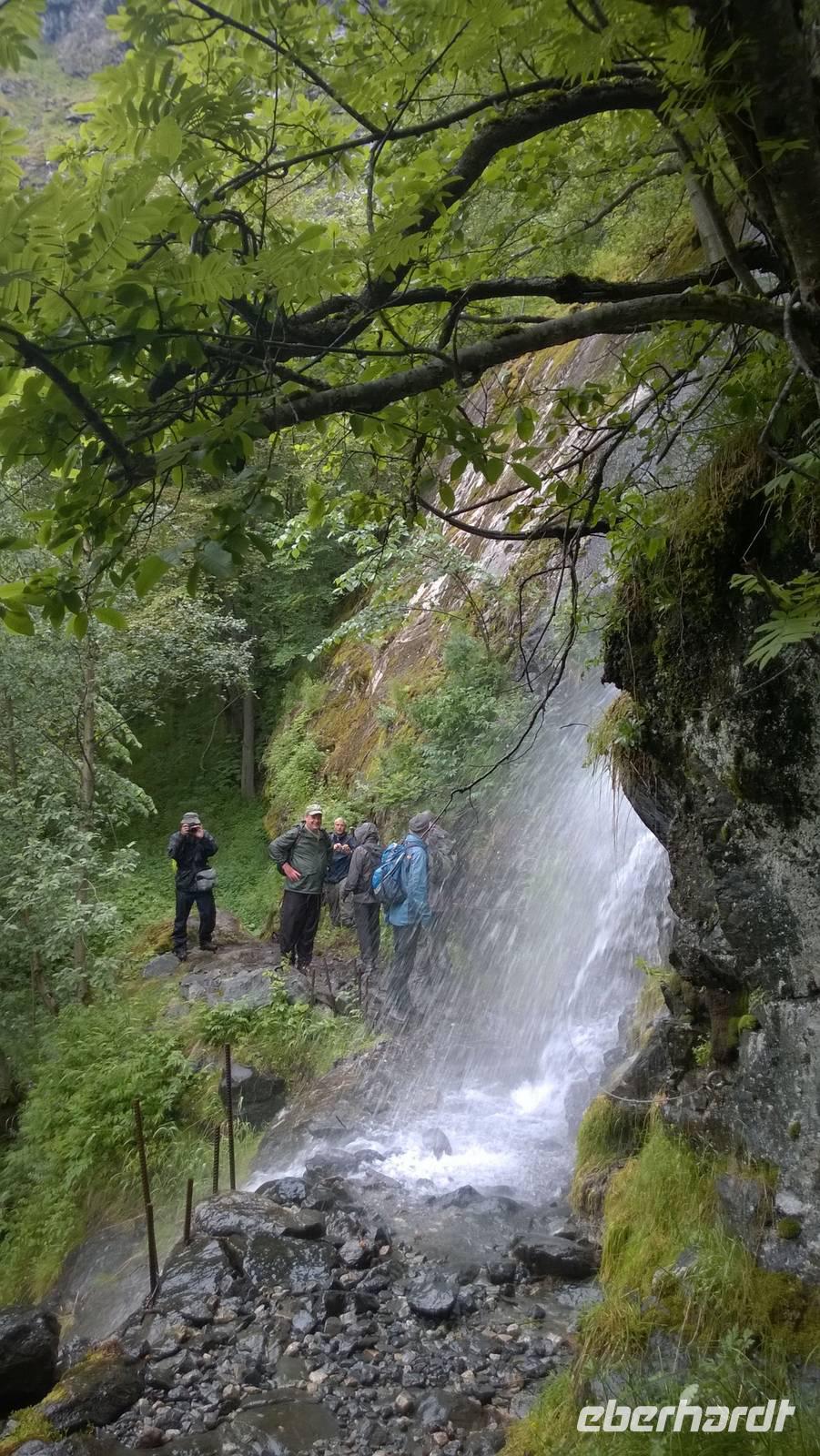 Zunächst wandern wir in atemberaumbend schöner Berglandschaft auf halber Höhe zwischen Fluss und Bergkuppen. Theoretisch müssen wir immer nur bergab gehen, schließlich sollen wir heute von 900 m.o.h. auf quasi Meereshöhe kommen. Doch soviel wir auch hinuntersteigen, gleich um die Ecke findet sich immer wieder eine Anhöhe, die wir bergauf wandern. Hoch und runter, runter und hoch, an steilen Felswänden entlang, über Wasserströme, auf eine Bergkuppe und durch den Wald. Abstecher machen wir zu einer Hängebrücke, wo man seinen Mut für ein Foto mal beweisen kann und zu einer imposanten Höhle. Doch weiter geht's, die 19km ziehen sich hin. Es sind viele kleine Überraschungen, die uns auf diesem Wanderweg herausfordern. Die größte Herausforderung ist sicherlich der Wasserfall, der noch so viel Schmelzwasser führt, dass wir nicht mit trockener Haut daran vorbei kommen. Regensachen an, Zähne zusammen beißen und zügig durchwaten heißt es dort. Ob unsere Outdoor-Kleidung auch für Wasserfälle präpariert ist? Der Bürgermeister von Aurland begleitet uns für die letzten 2 Stunden und hat sicherheitshalber auch gleich ein neues Seil zum Entlanghangeln gespannt.
