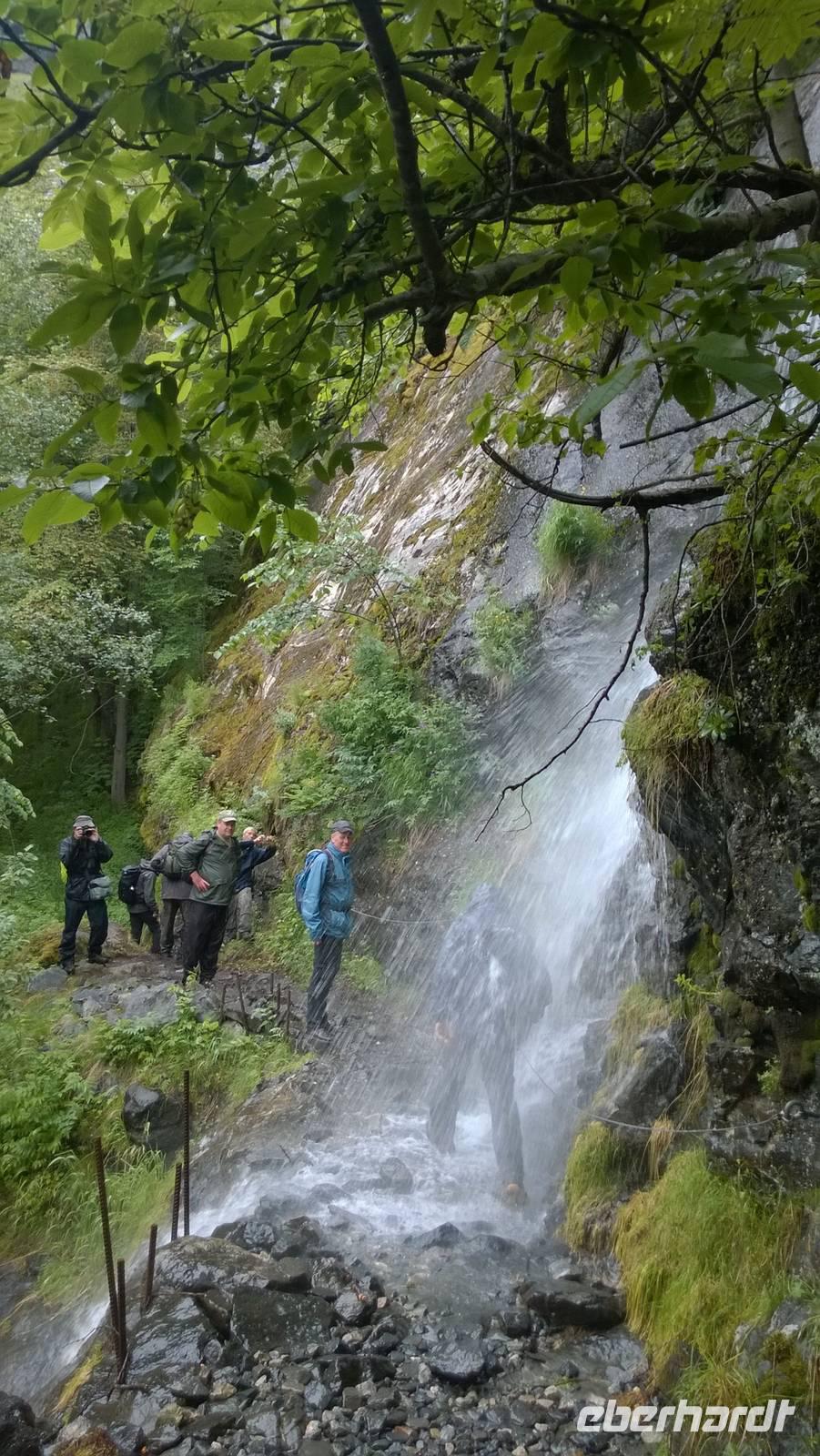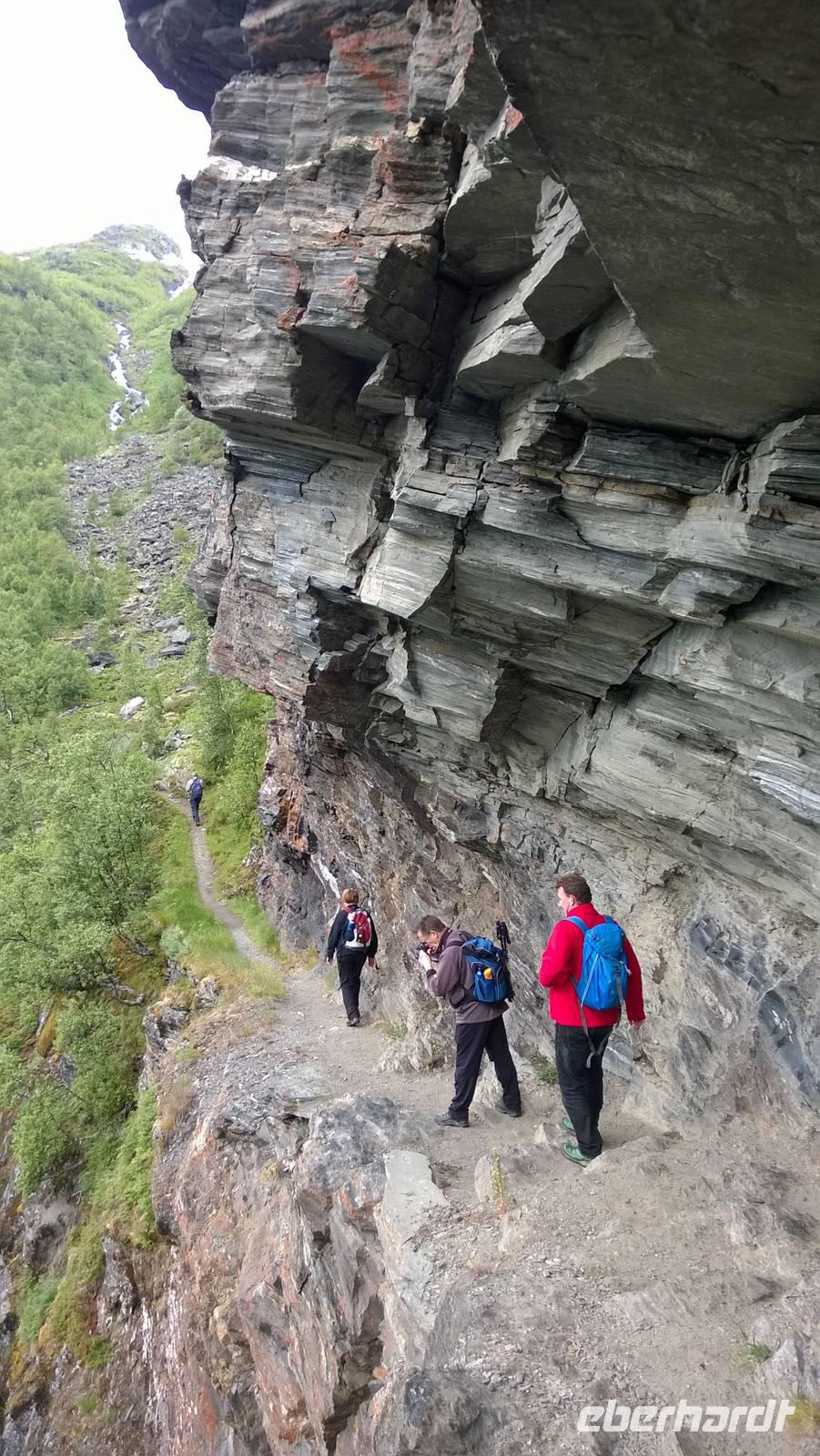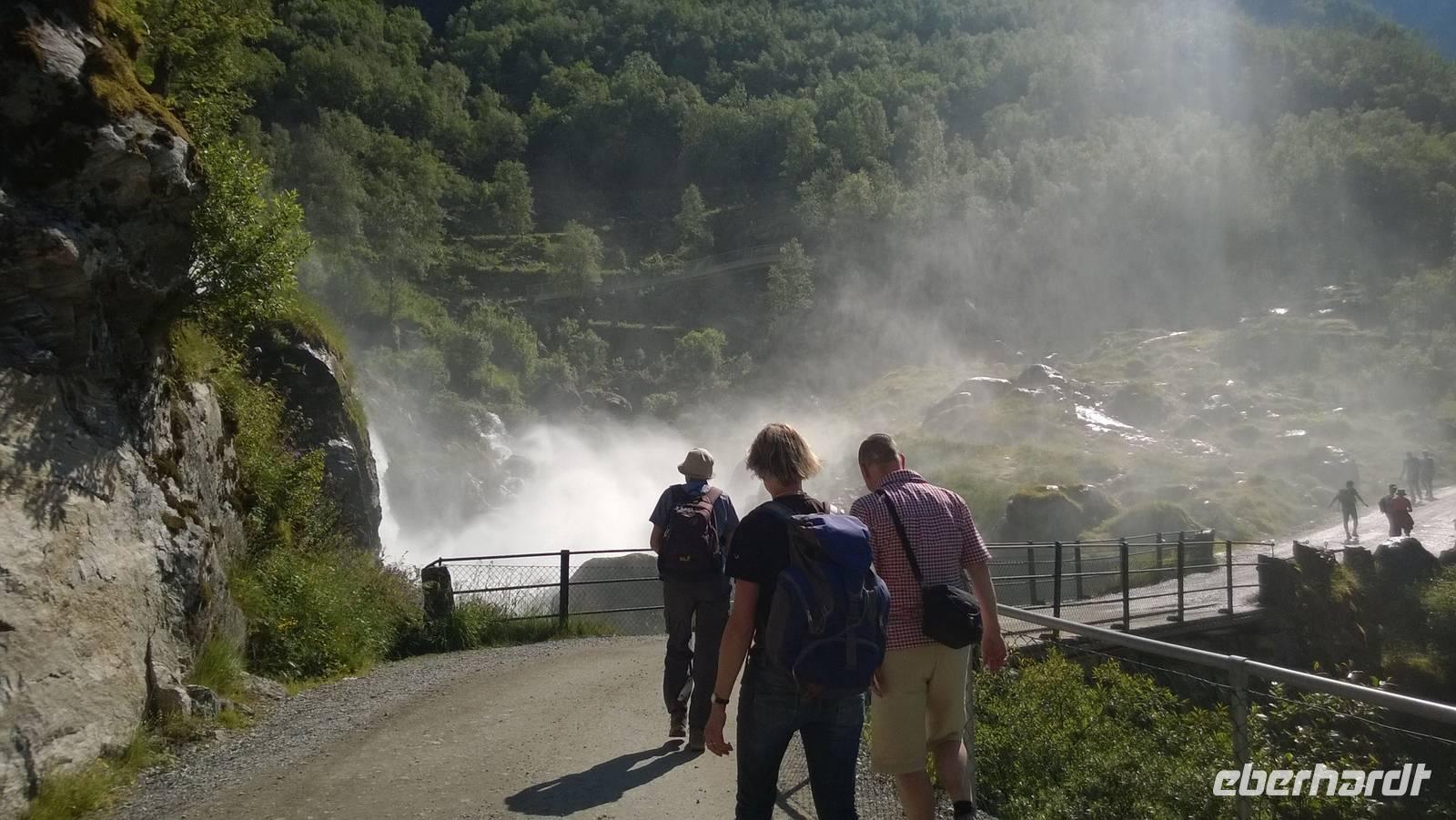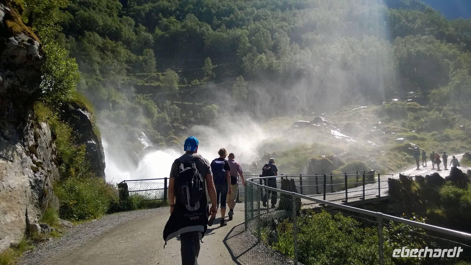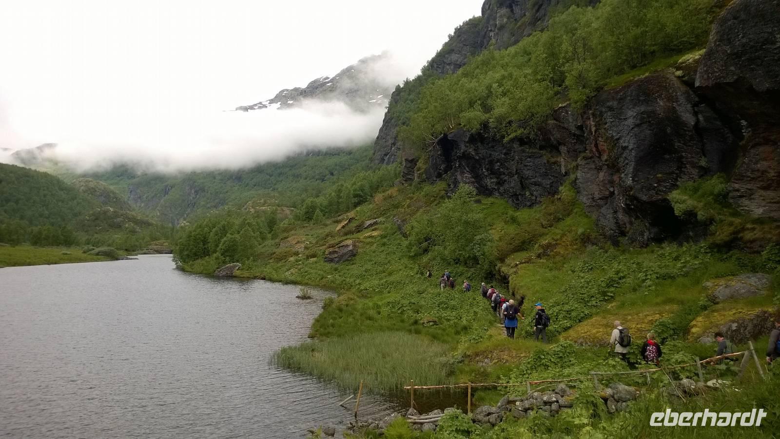 Zunächst wandern wir in atemberaumbend schöner Berglandschaft auf halber Höhe zwischen Fluss und Bergkuppen. Theoretisch müssen wir immer nur bergab gehen, schließlich sollen wir heute von 900 m.o.h. auf quasi Meereshöhe kommen. Doch soviel wir auch hinuntersteigen, gleich um die Ecke findet sich immer wieder eine Anhöhe, die wir bergauf wandern. Hoch und runter, runter und hoch, an steilen Felswänden entlang, über Wasserströme, auf eine Bergkuppe und durch den Wald. Abstecher machen wir zu einer Hängebrücke, wo man seinen Mut für ein Foto mal beweisen kann und zu einer imposanten Höhle. Doch weiter geht's, die 19km ziehen sich hin. Es sind viele kleine Überraschungen, die uns auf diesem Wanderweg herausfordern. Die größte Herausforderung ist sicherlich der Wasserfall, der noch so viel Schmelzwasser führt, dass wir nicht mit trockener Haut daran vorbei kommen. Regensachen an, Zähne zusammen beißen und zügig durchwaten heißt es dort. Ob unsere Outdoor-Kleidung auch für Wasserfälle präpariert ist? Der Bürgermeister von Aurland begleitet uns für die letzten 2 Stunden und hat sicherheitshalber auch gleich ein neues Seil zum Entlanghangeln gespannt.