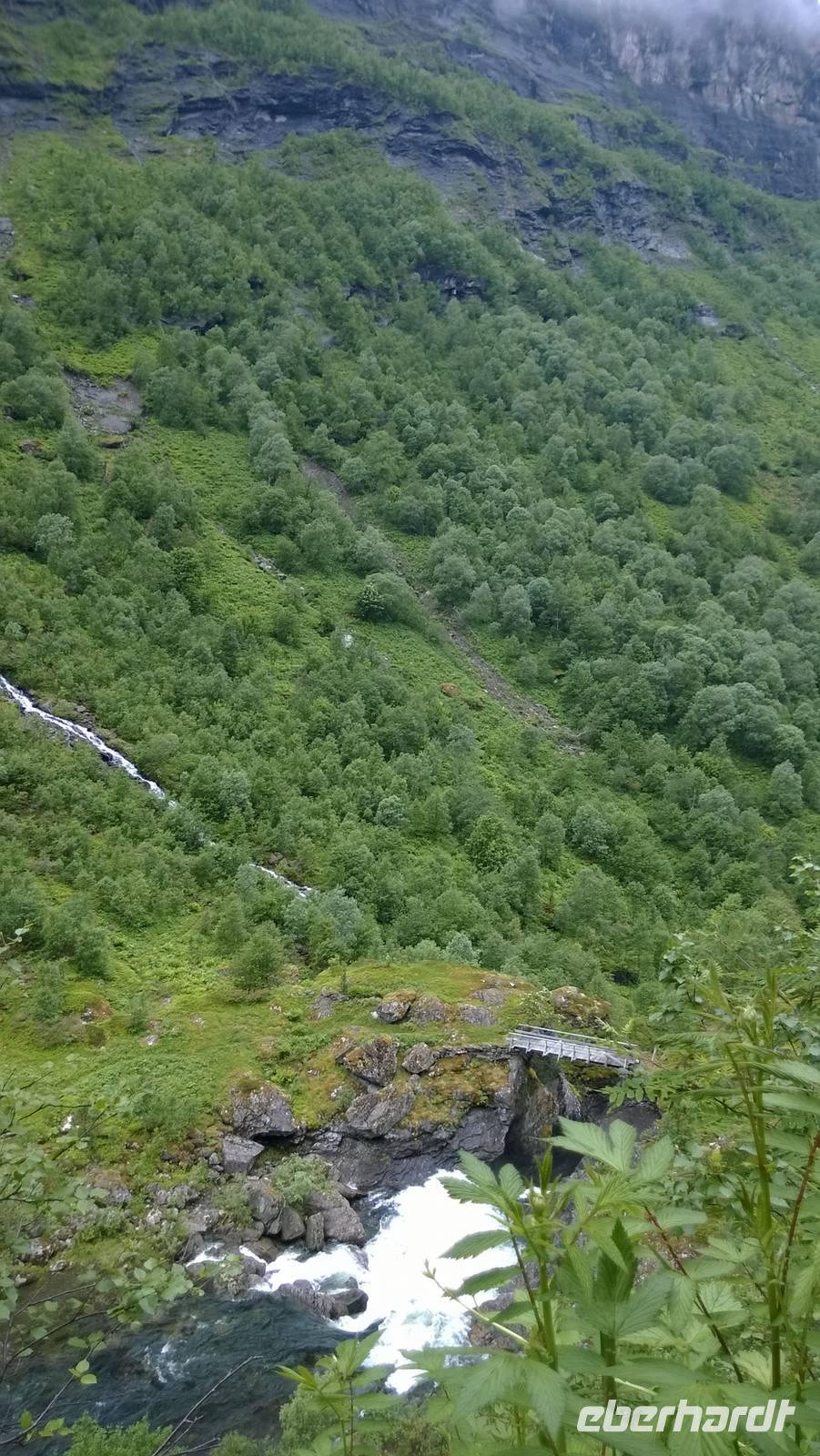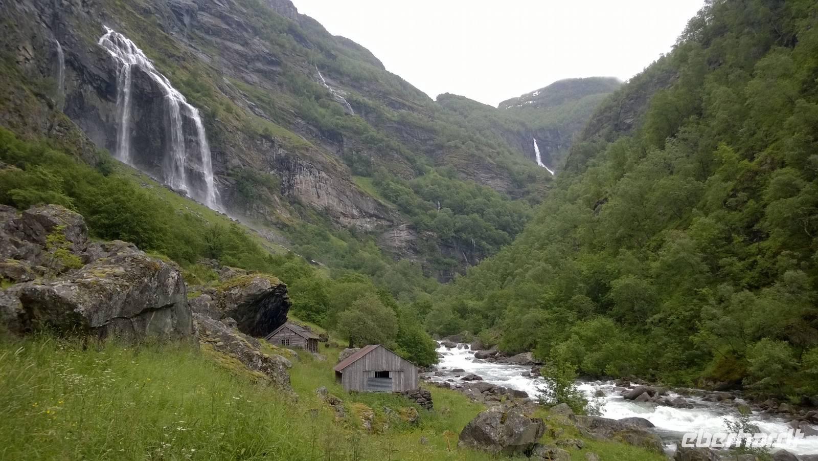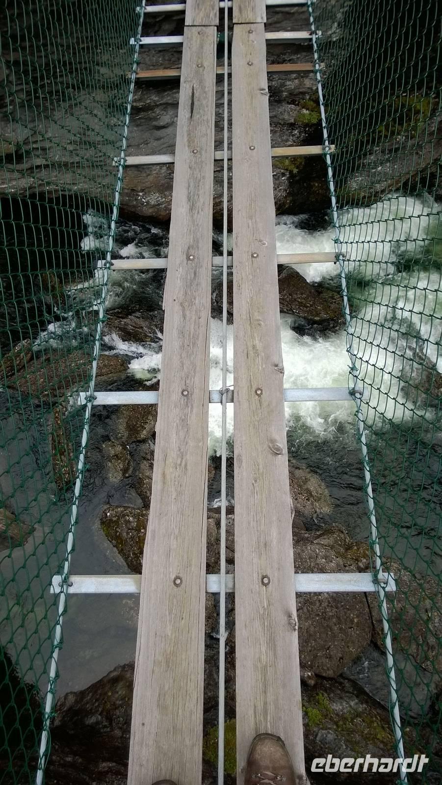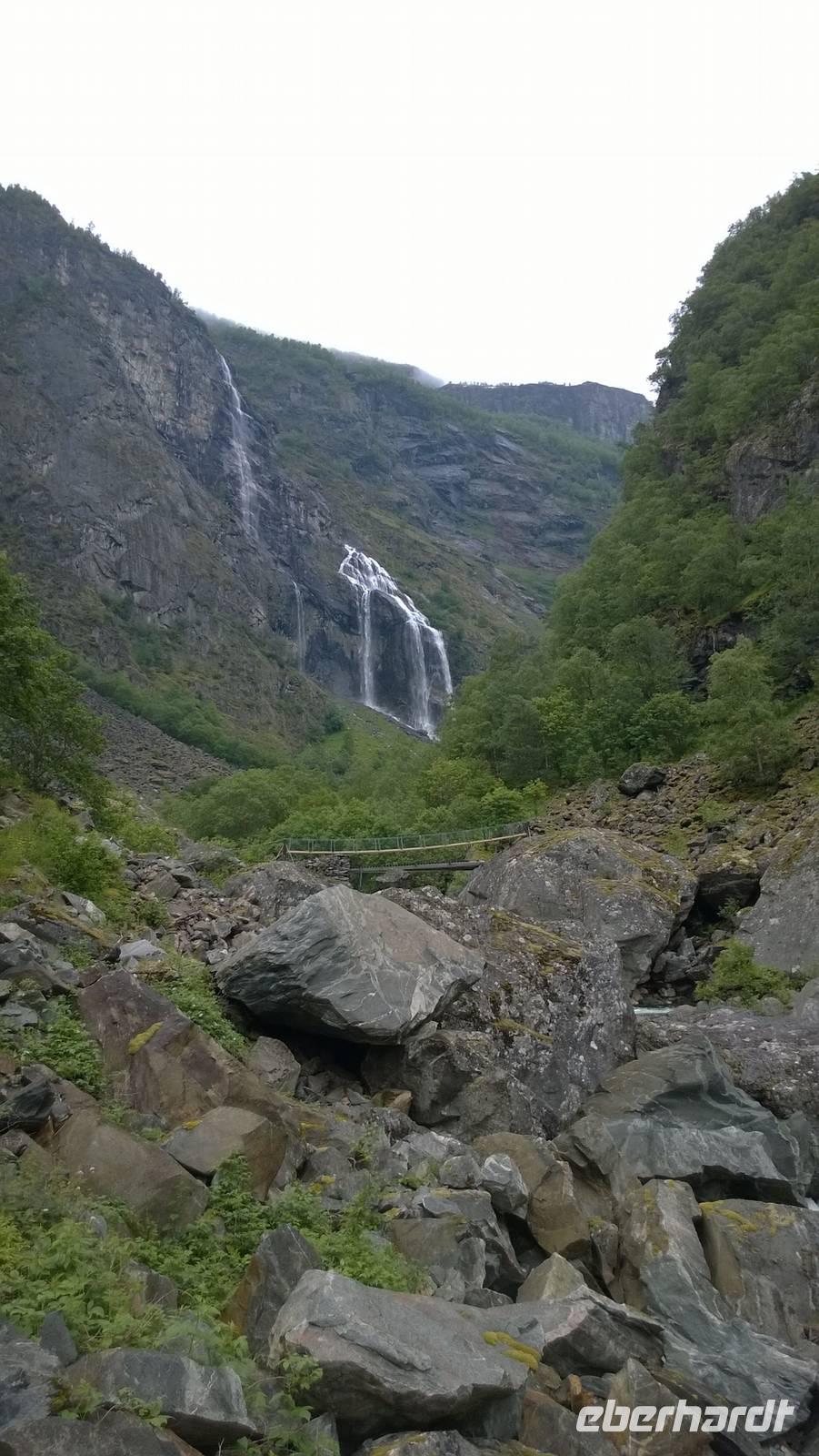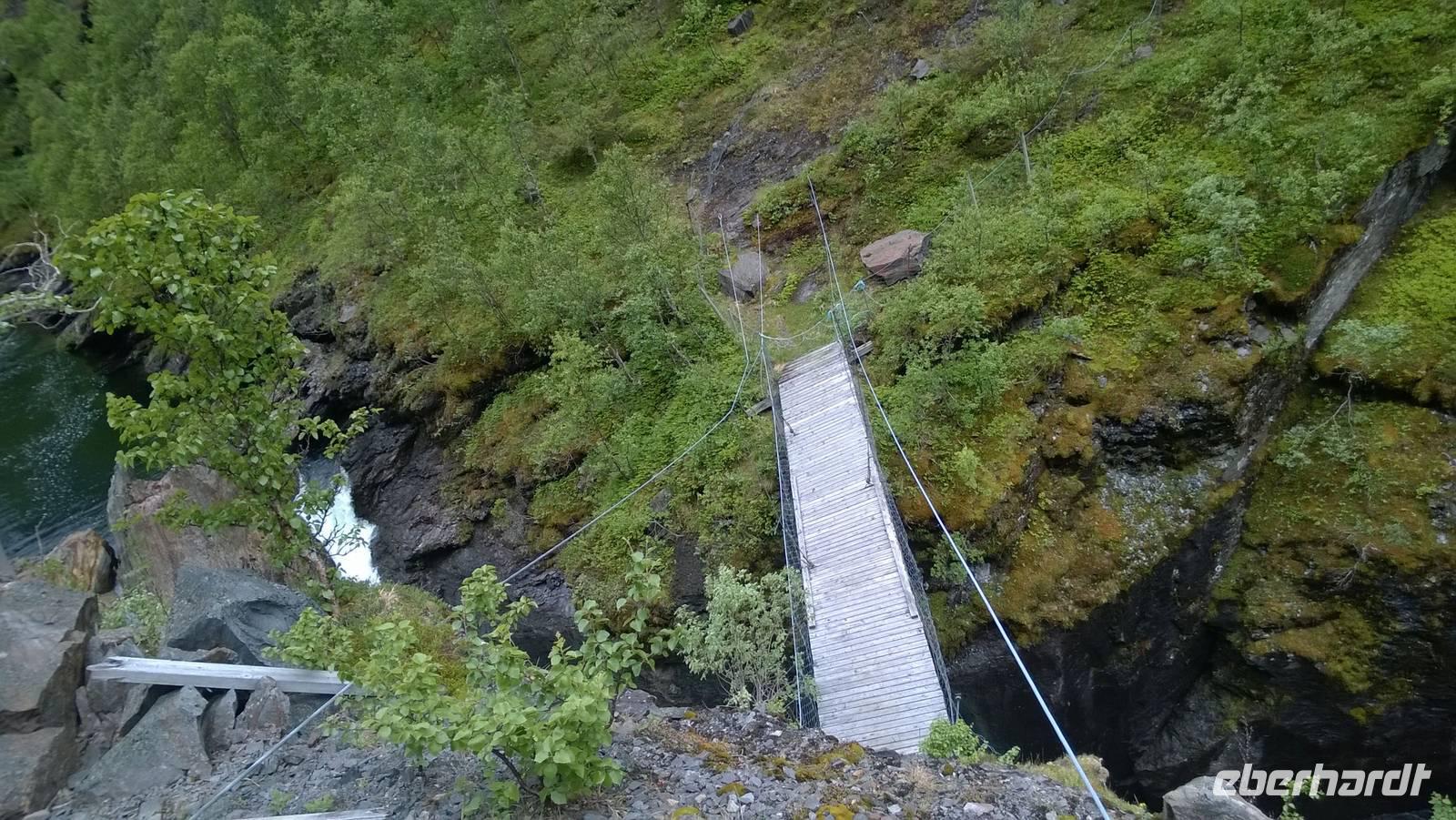 Zunächst wandern wir in atemberaumbend schöner Berglandschaft auf halber Höhe zwischen Fluss und Bergkuppen. Theoretisch müssen wir immer nur bergab gehen, schließlich sollen wir heute von 900 m.o.h. auf quasi Meereshöhe kommen. Doch soviel wir auch hinuntersteigen, gleich um die Ecke findet sich immer wieder eine Anhöhe, die wir bergauf wandern. Hoch und runter, runter und hoch, an steilen Felswänden entlang, über Wasserströme, auf eine Bergkuppe und durch den Wald. Abstecher machen wir zu einer Hängebrücke, wo man seinen Mut für ein Foto mal beweisen kann und zu einer imposanten Höhle. Doch weiter geht's, die 19km ziehen sich hin. Es sind viele kleine Überraschungen, die uns auf diesem Wanderweg herausfordern. Die größte Herausforderung ist sicherlich der Wasserfall, der noch so viel Schmelzwasser führt, dass wir nicht mit trockener Haut daran vorbei kommen. Regensachen an, Zähne zusammen beißen und zügig durchwaten heißt es dort. Ob unsere Outdoor-Kleidung auch für Wasserfälle präpariert ist? Der Bürgermeister von Aurland begleitet uns für die letzten 2 Stunden und hat sicherheitshalber auch gleich ein neues Seil zum Entlanghangeln gespannt.